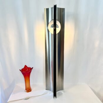 Les tiges fuselées en métal chromé, surmontées de globes hémisphériques, créent un jeu de proportions harmonieux et une silhouette sculpturale. La lumière est diffuse, douce et enveloppante.
