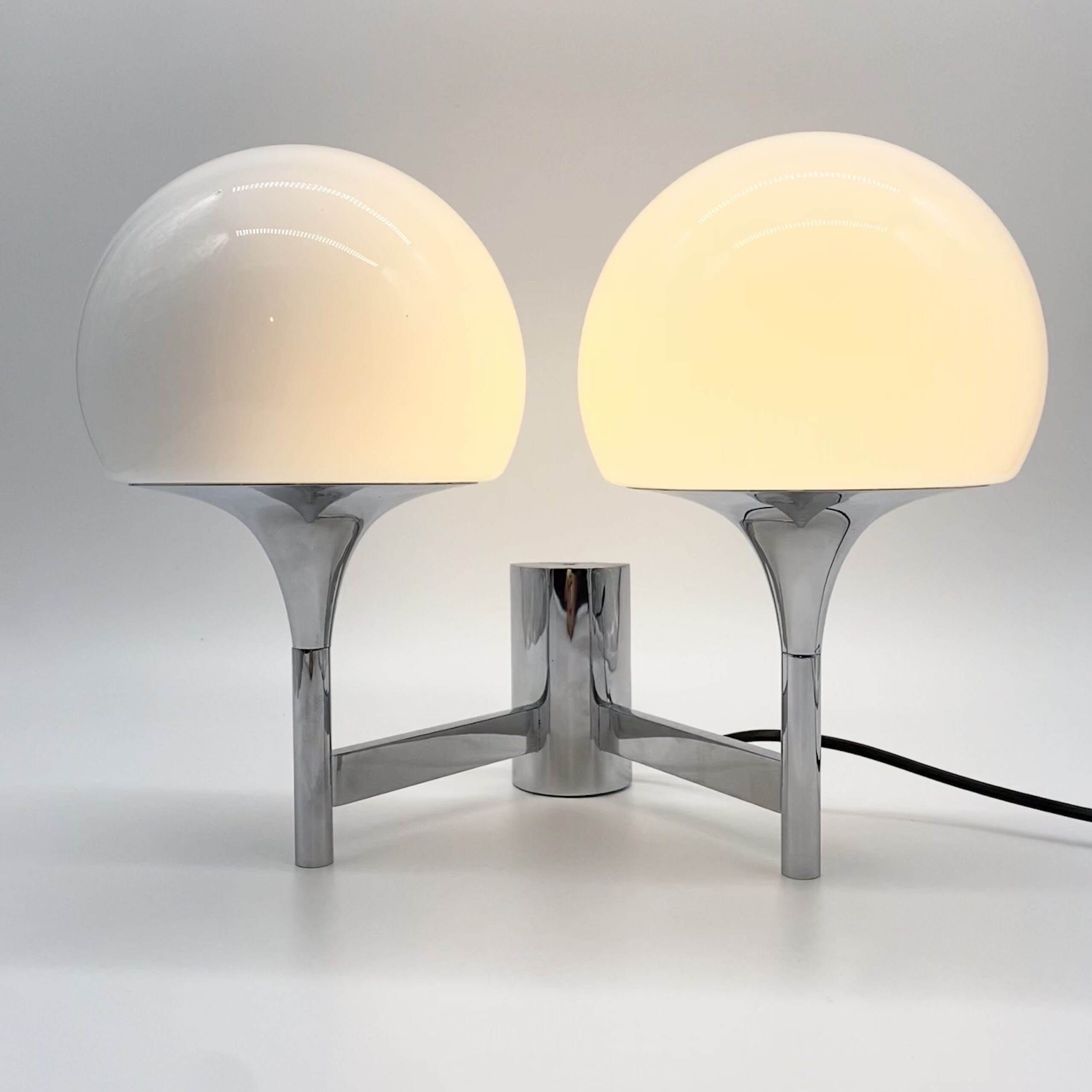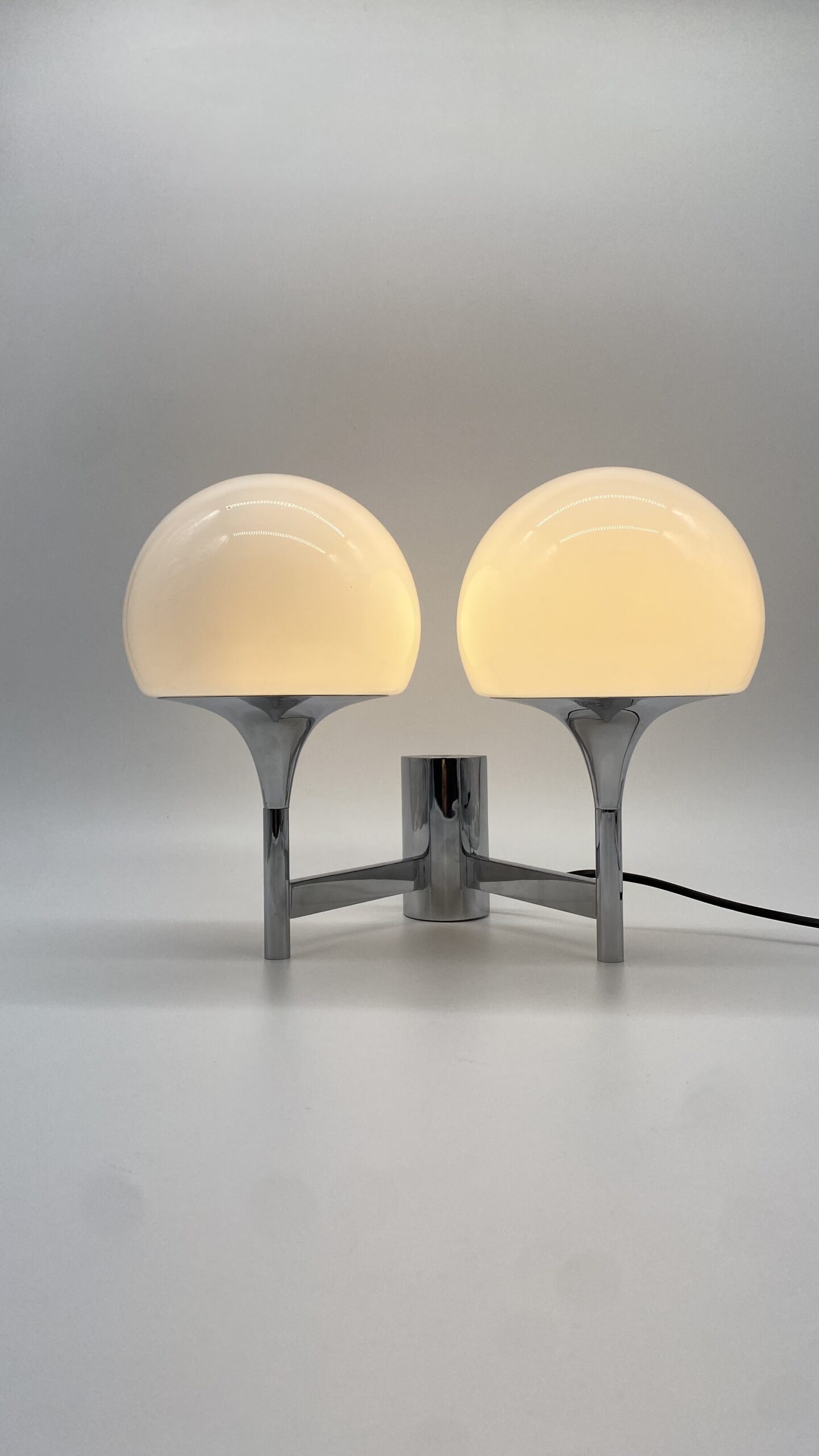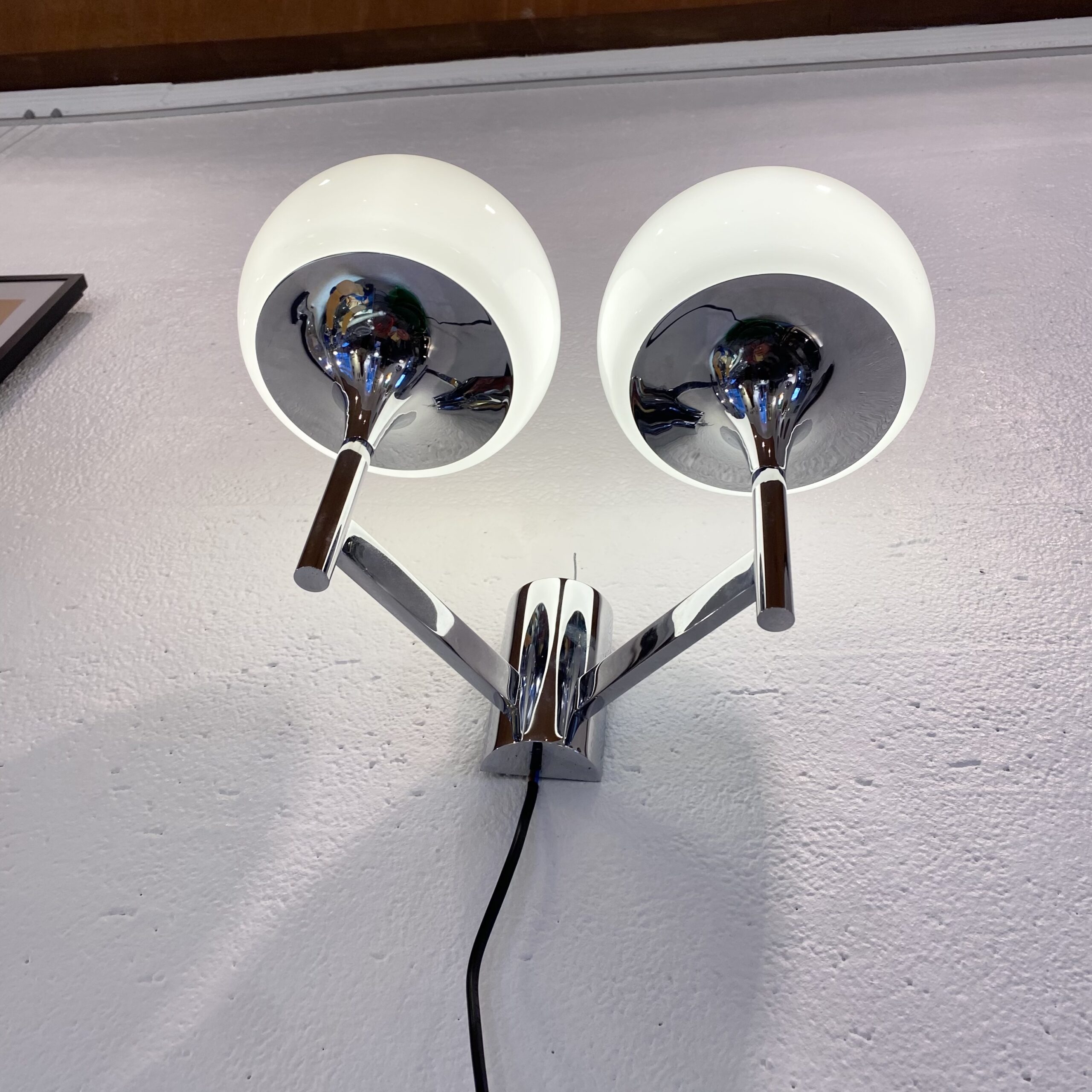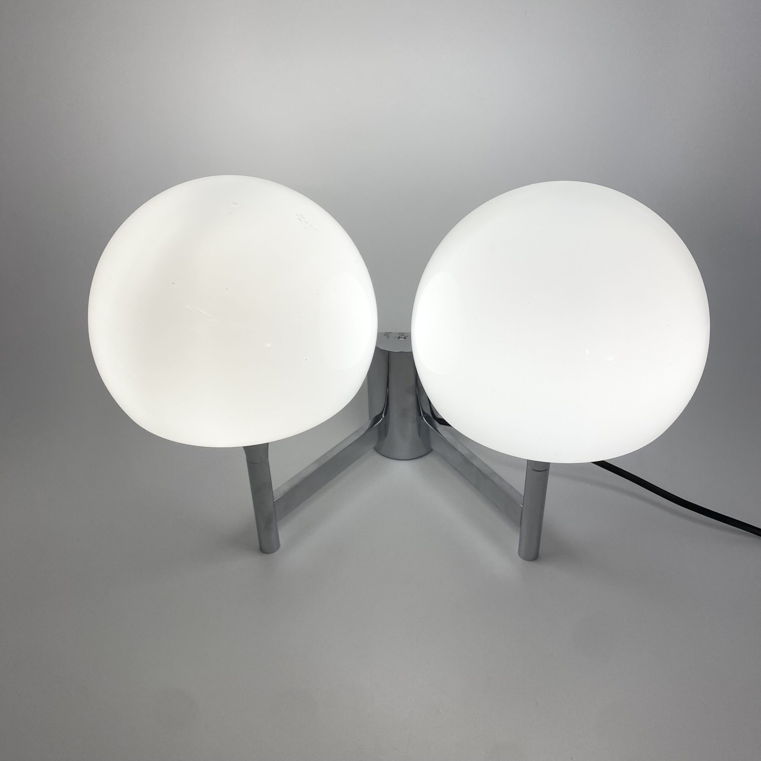 La pièce associe une structure en métal chromé à deux globes en verre opalin blanc, offrant une esthétique raffinée et lumineuse typique du designer.