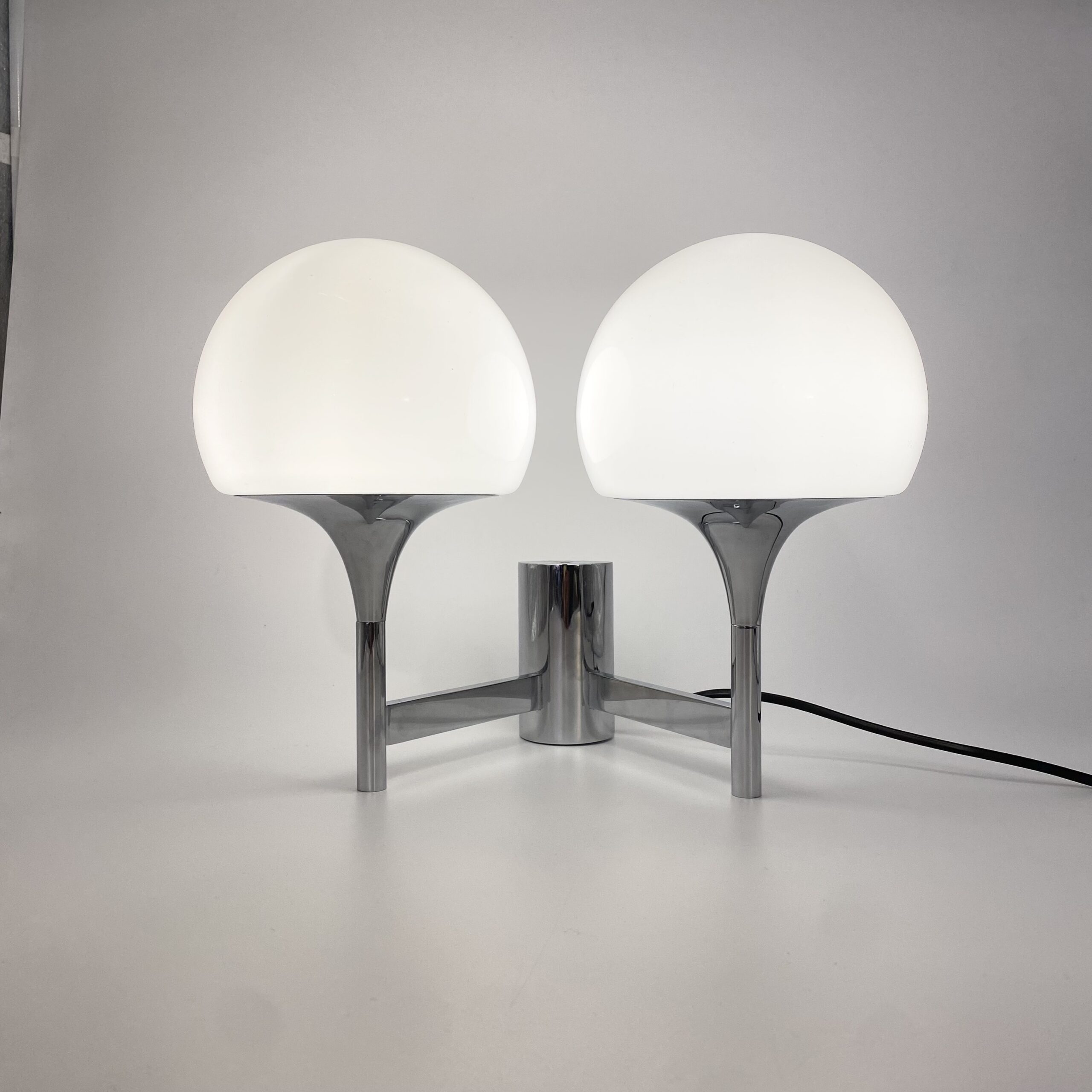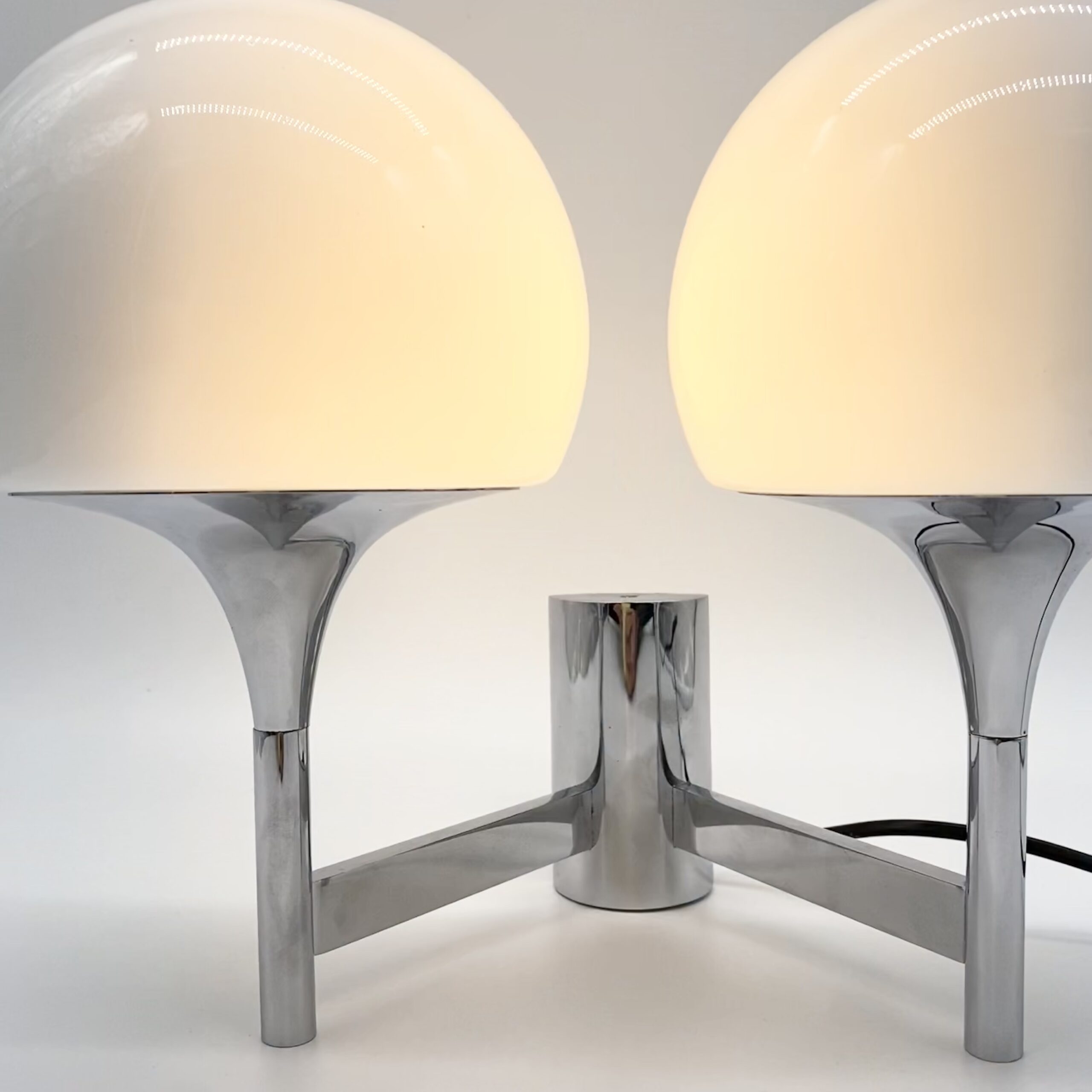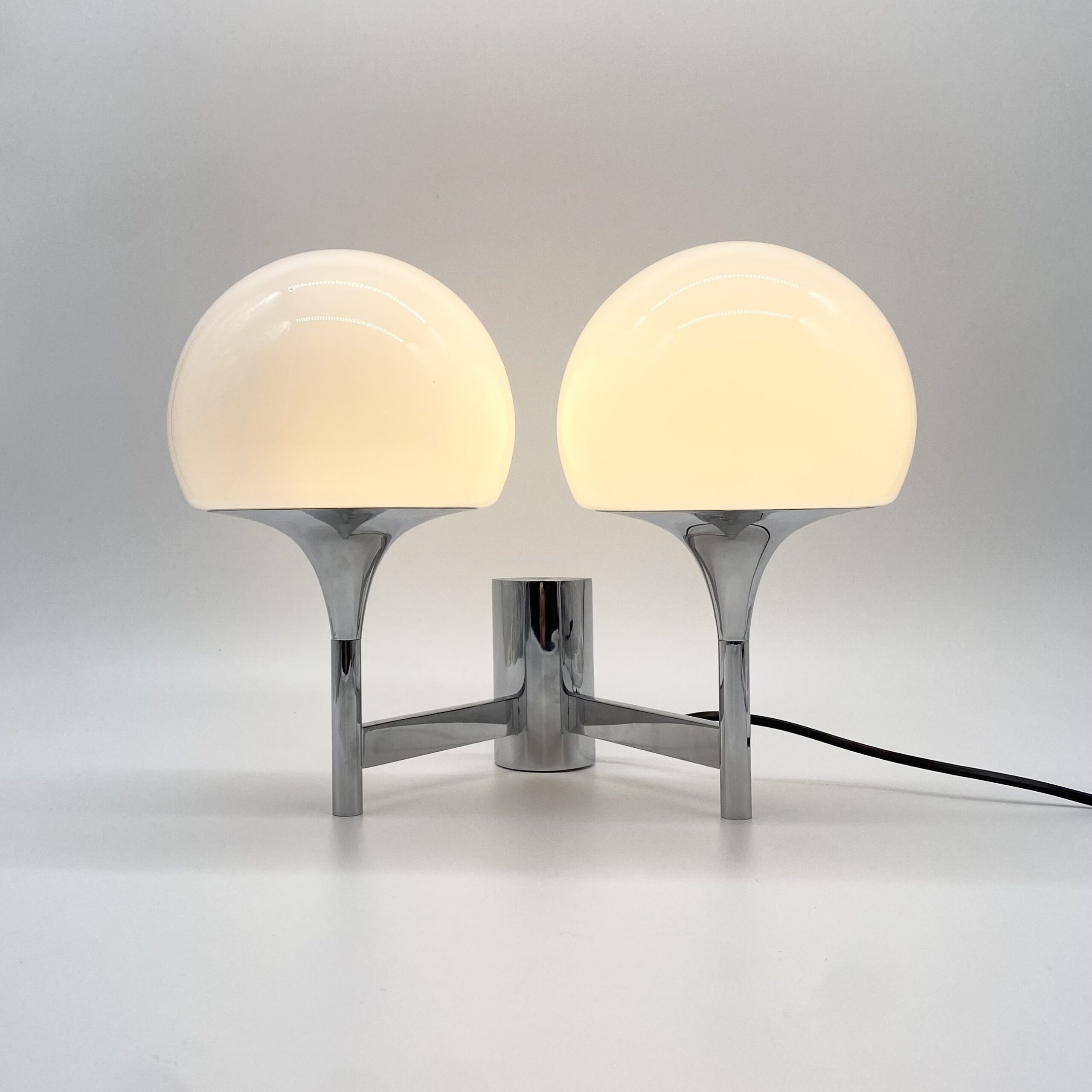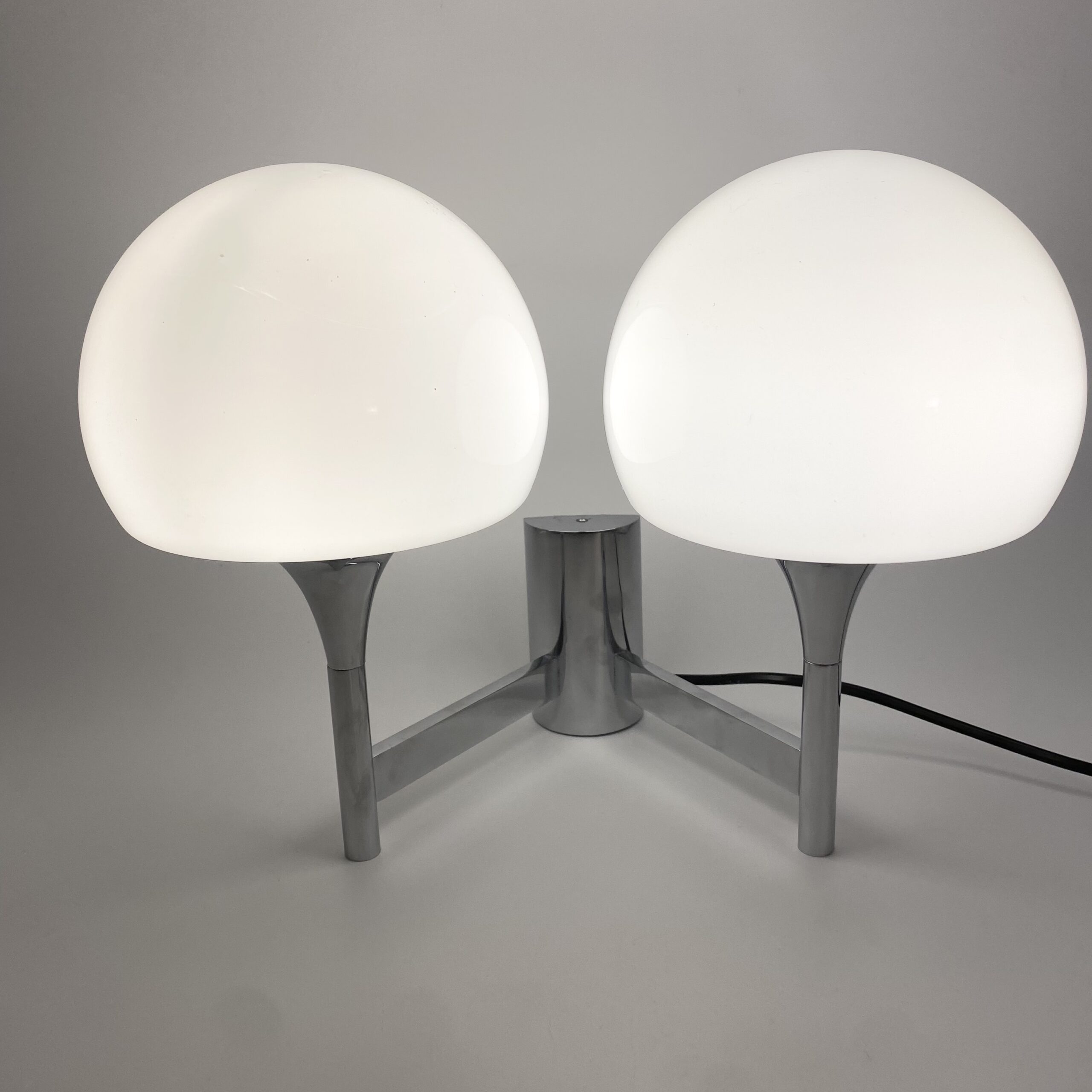La pièce associe une structure en métal chromé à deux globes en verre opalin blanc, offrant une esthétique raffinée et lumineuse typique du designer.