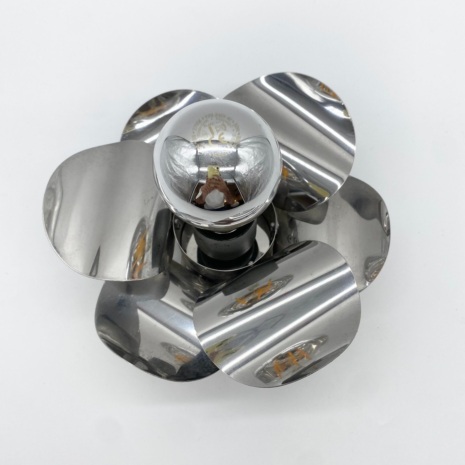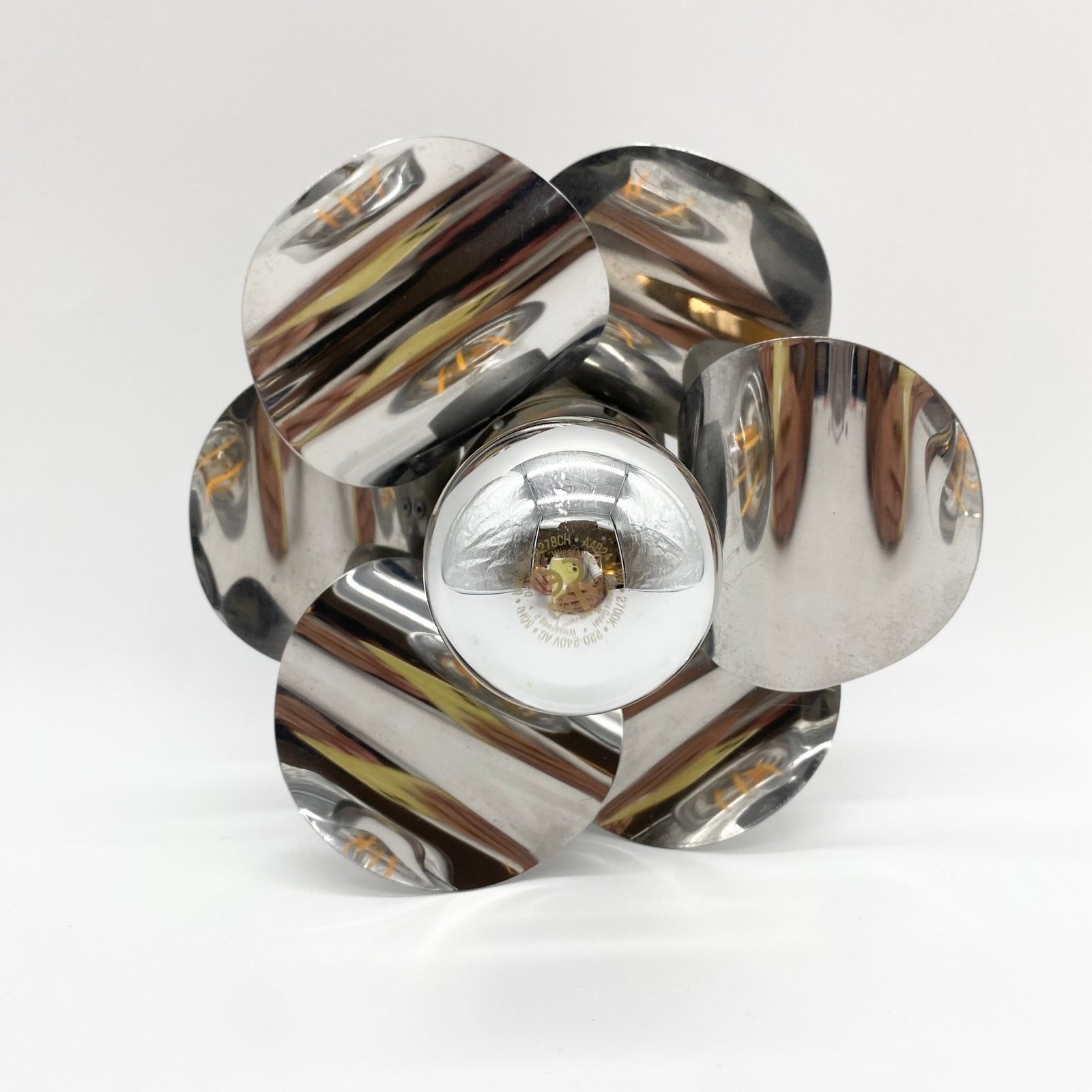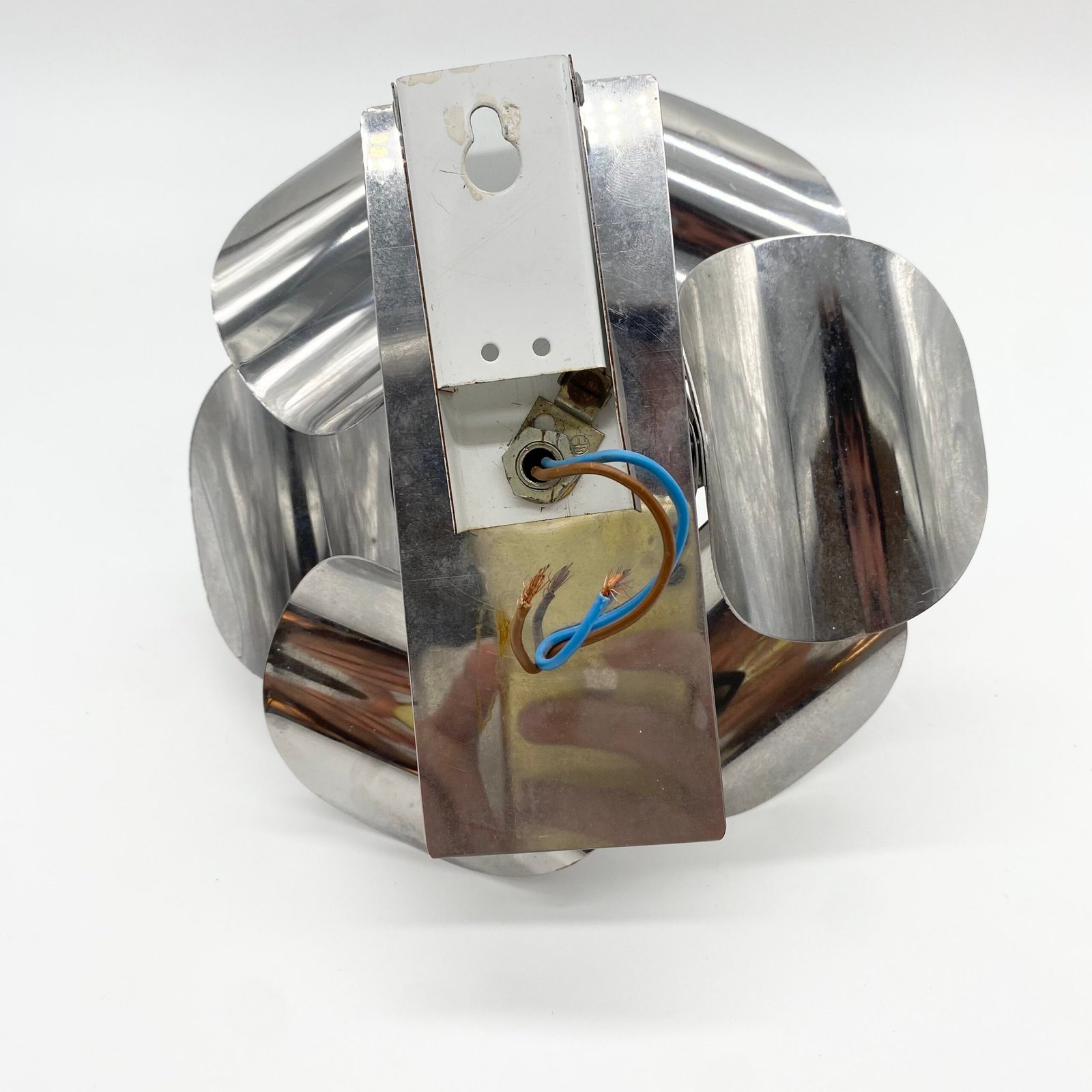 Spectaculaire applique murale en métal chromé, composée de six pétales bombés disposés autour de l’ampoule centrale, évoquant une fleur stylisée au charme futuriste.