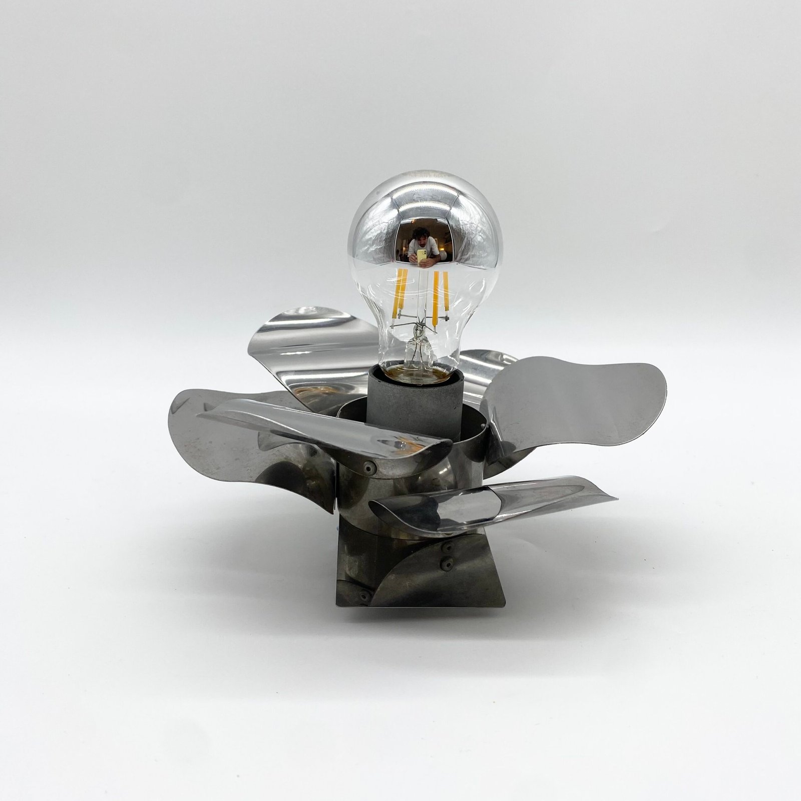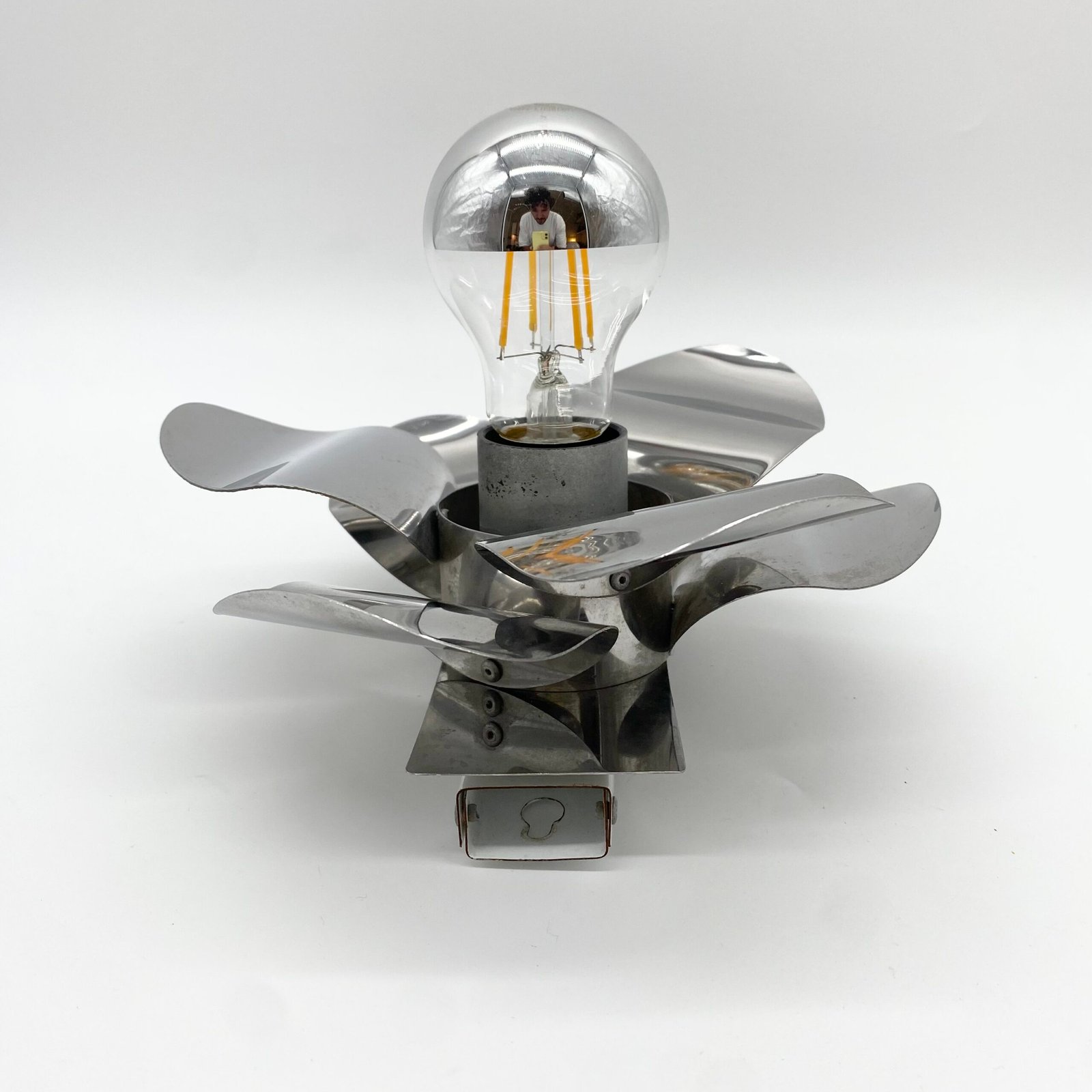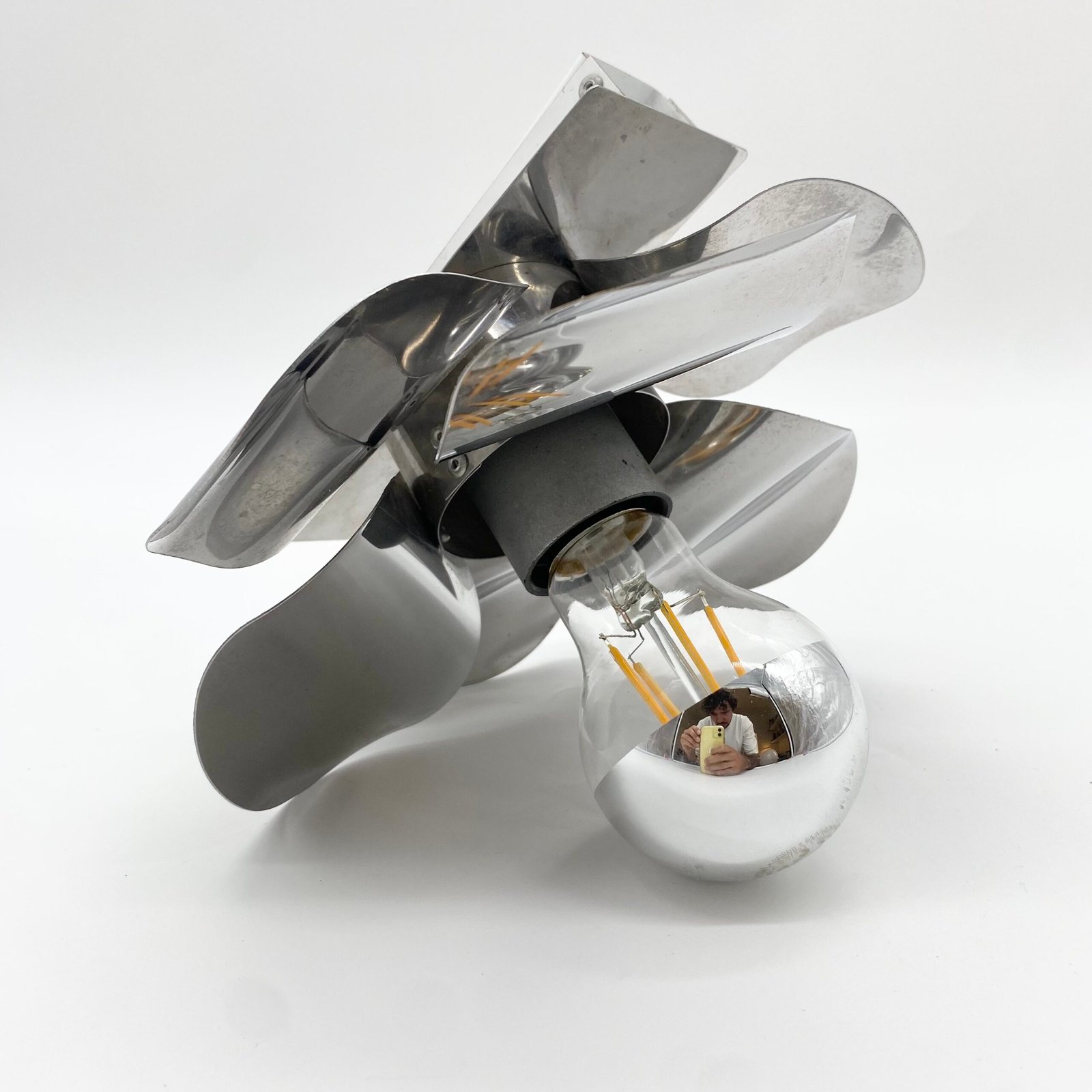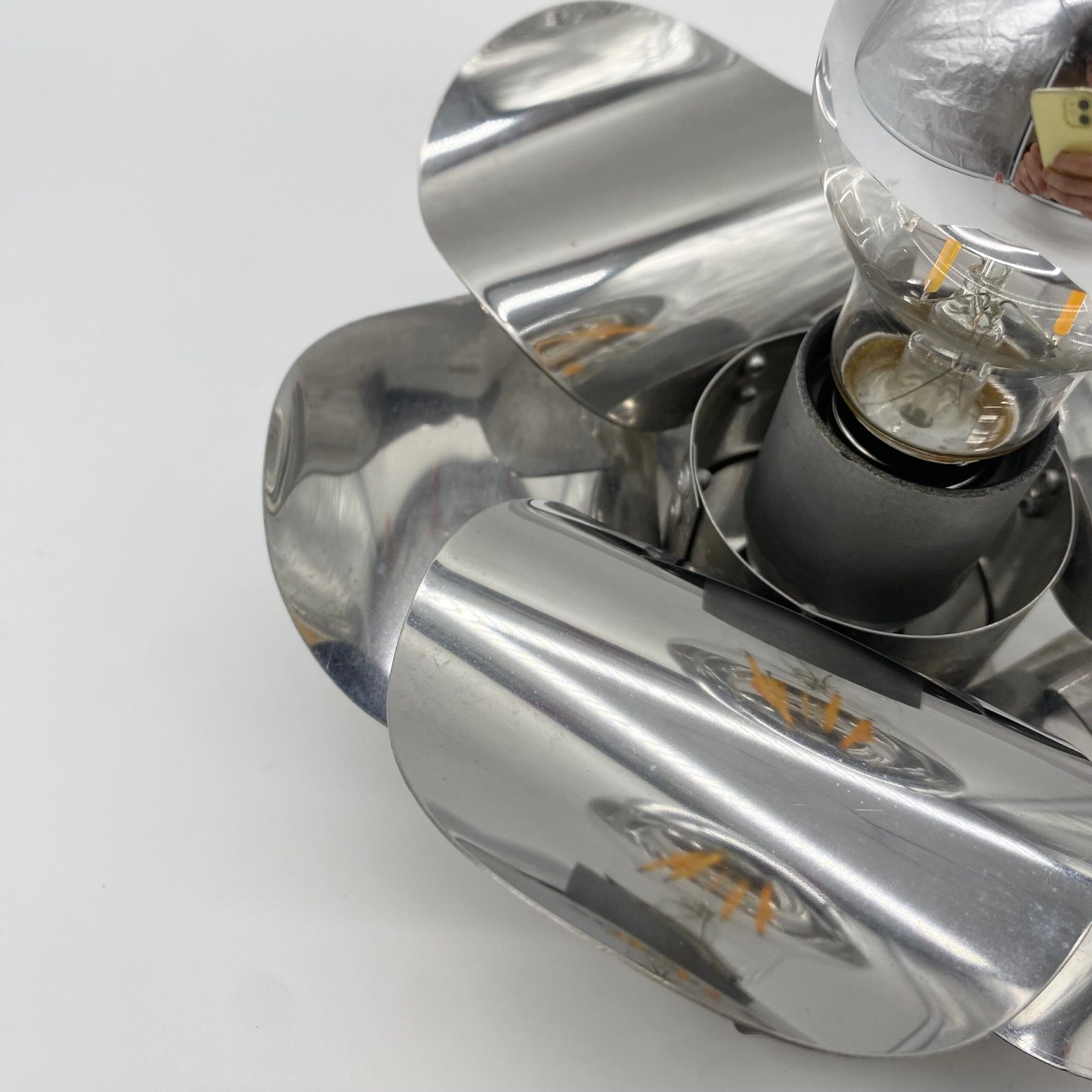 Spectaculaire applique murale en métal chromé, composée de six pétales bombés disposés autour de l’ampoule centrale, évoquant une fleur stylisée au charme futuriste.
