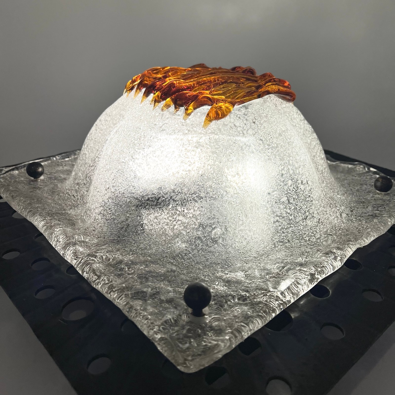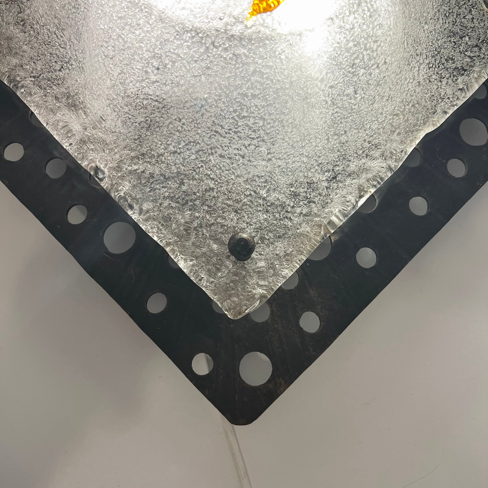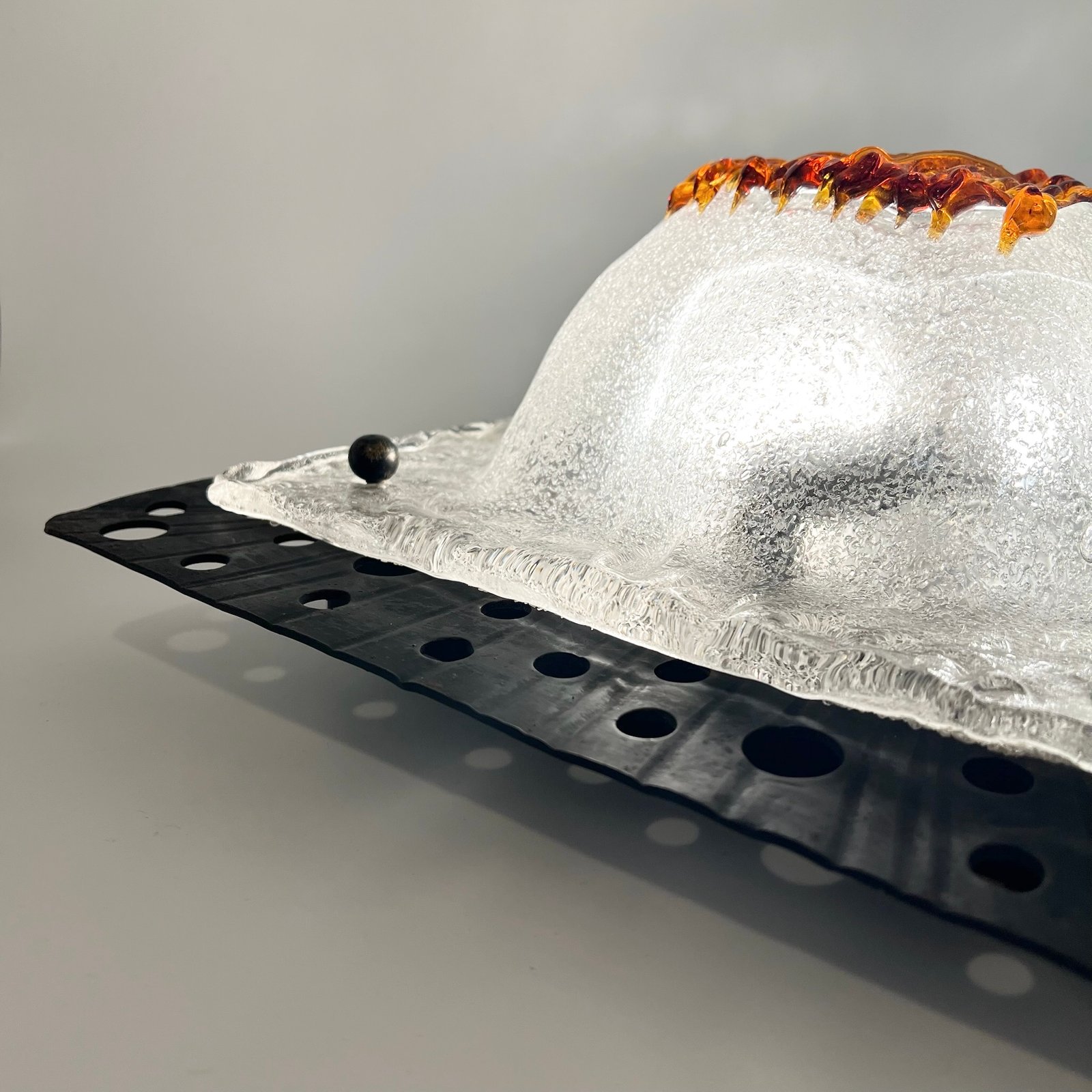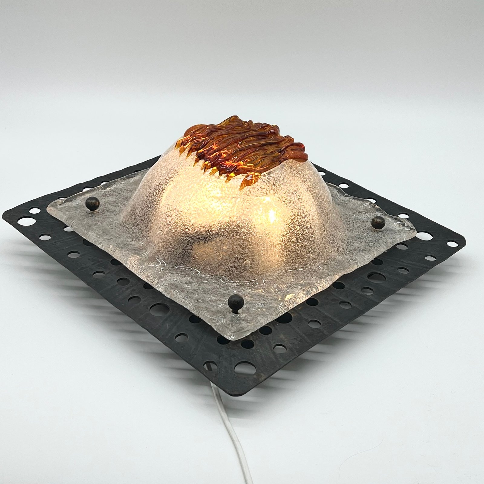 Le verre soufflé, au décor organique typique de la maison italienne, diffuse une lumière chaleureuse et met en valeur la texture brute du métal.