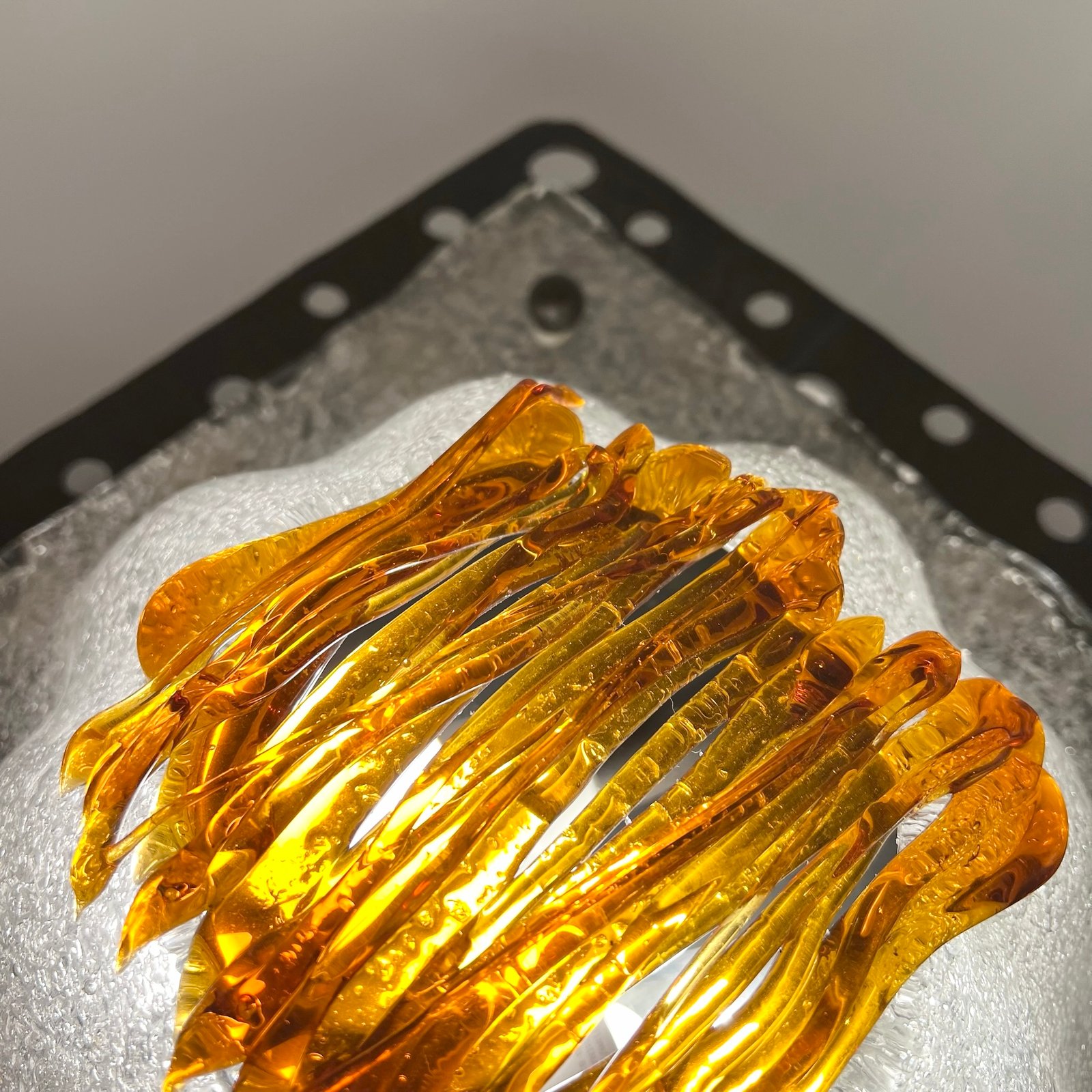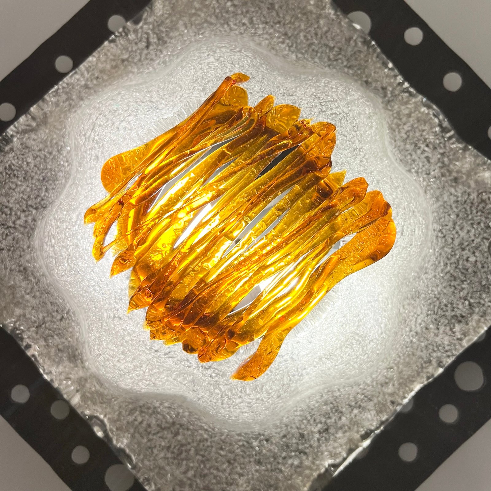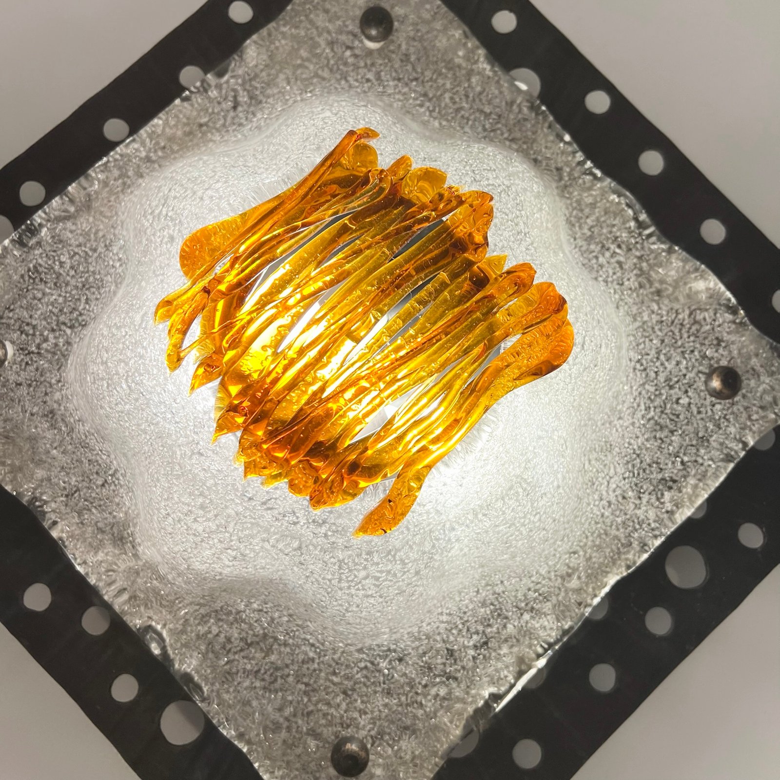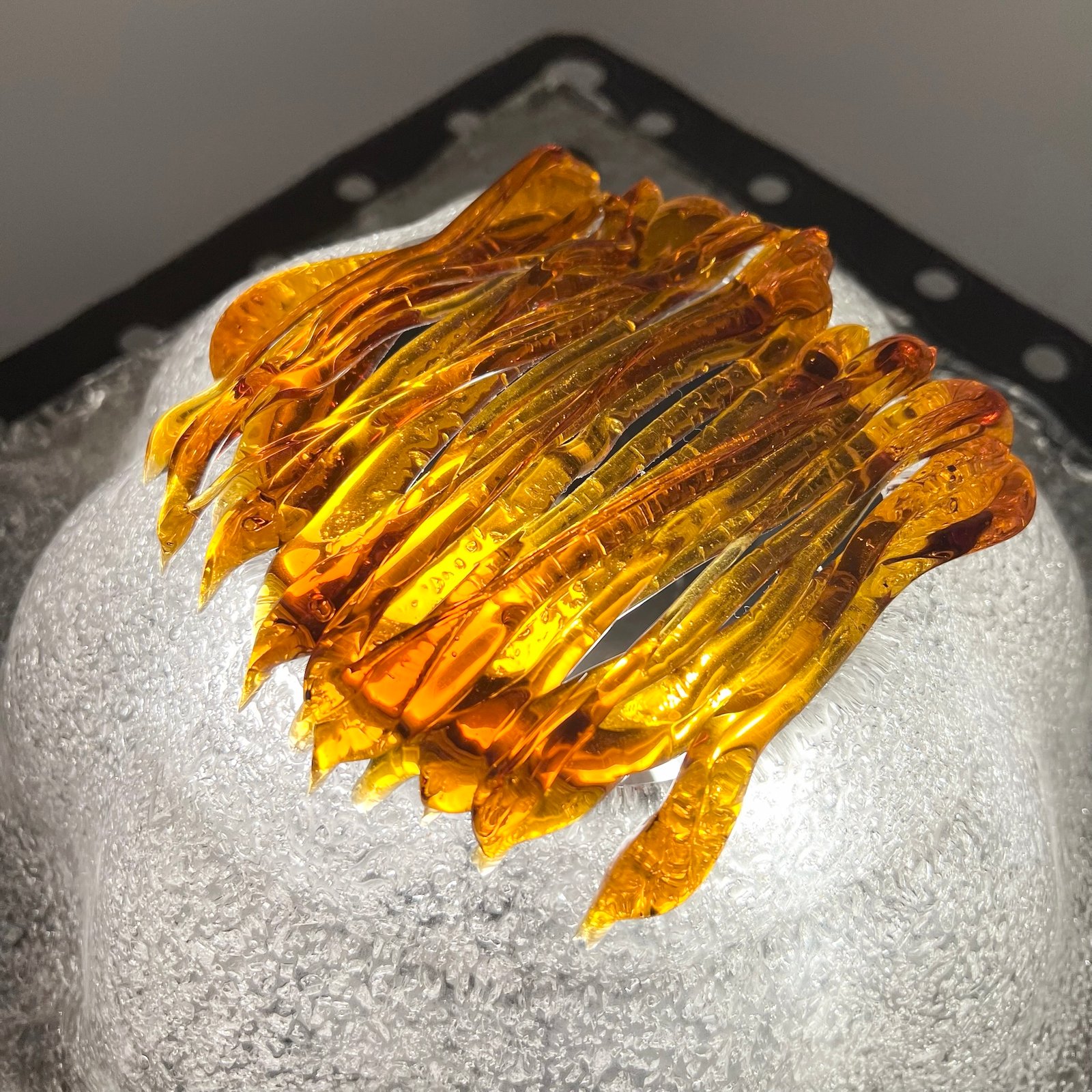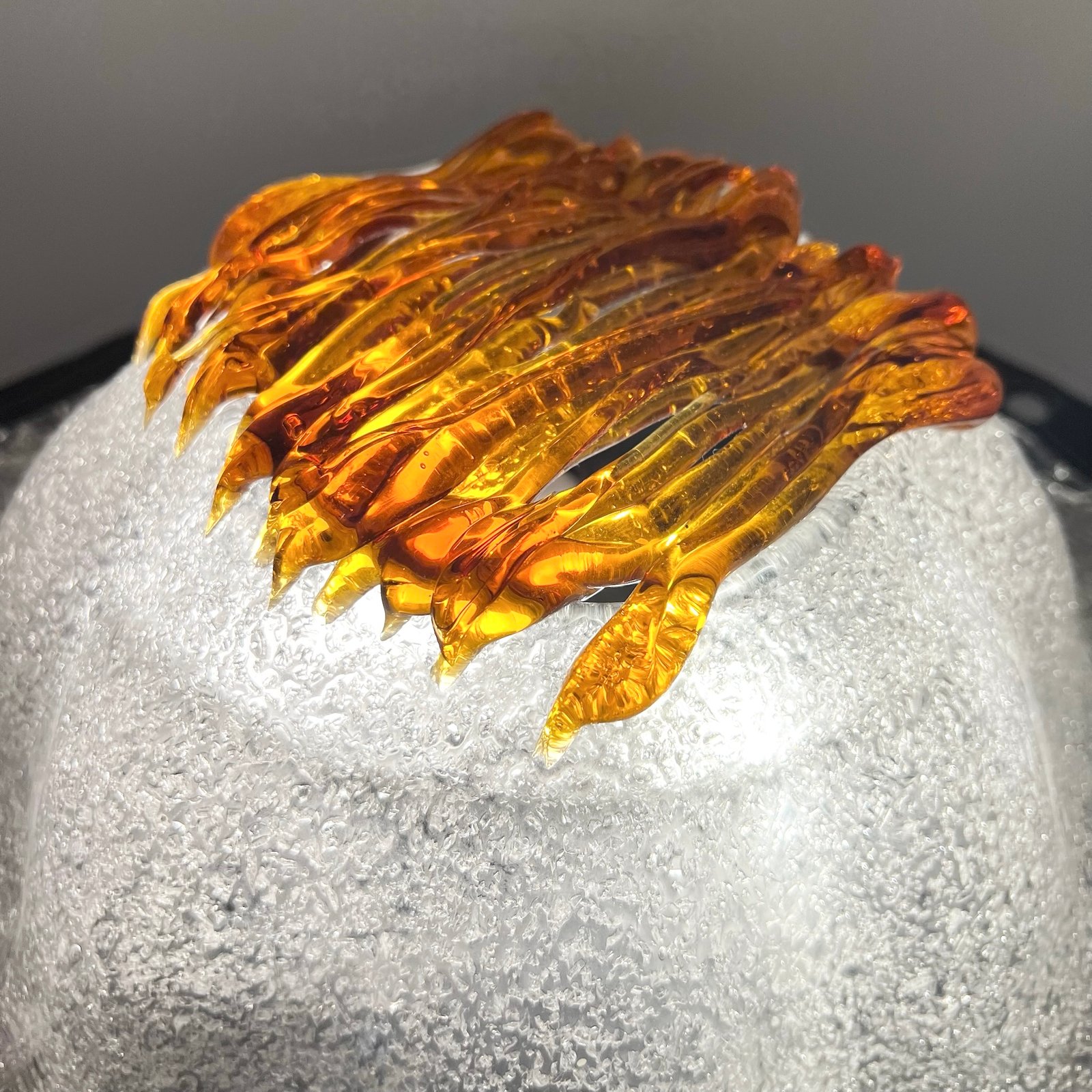 Le verre soufflé, au décor organique typique de la maison italienne, diffuse une lumière chaleureuse et met en valeur la texture brute du métal.