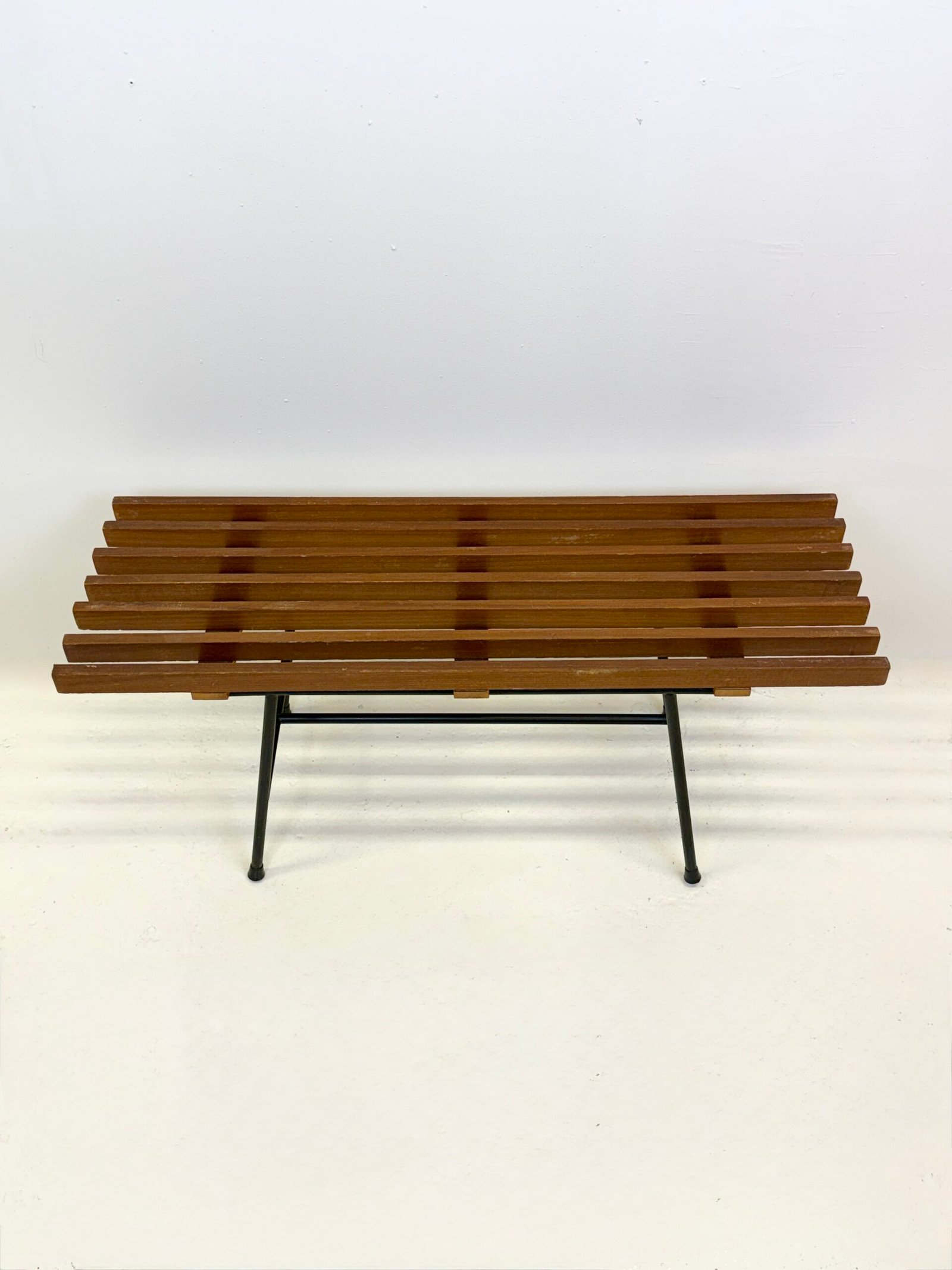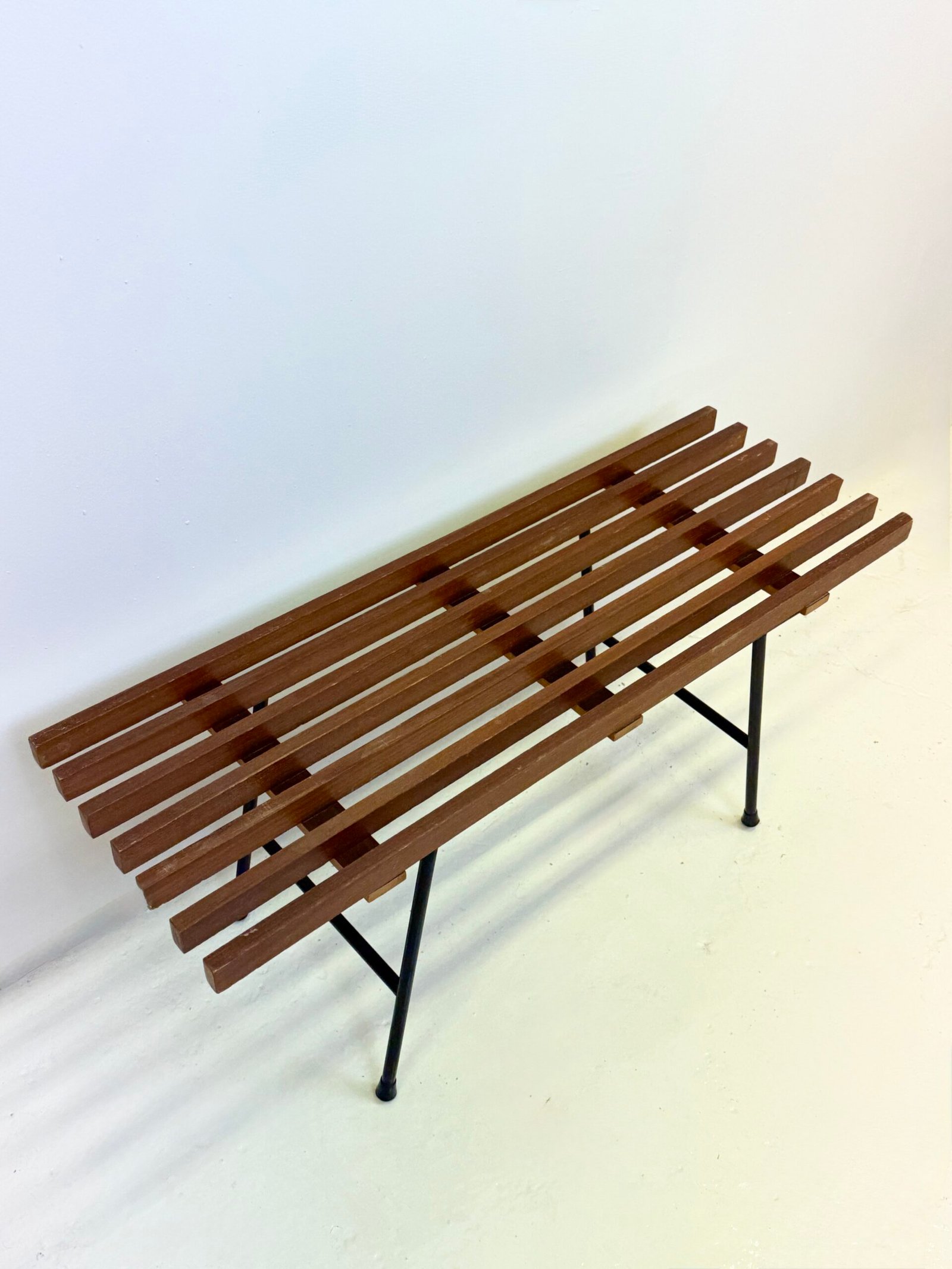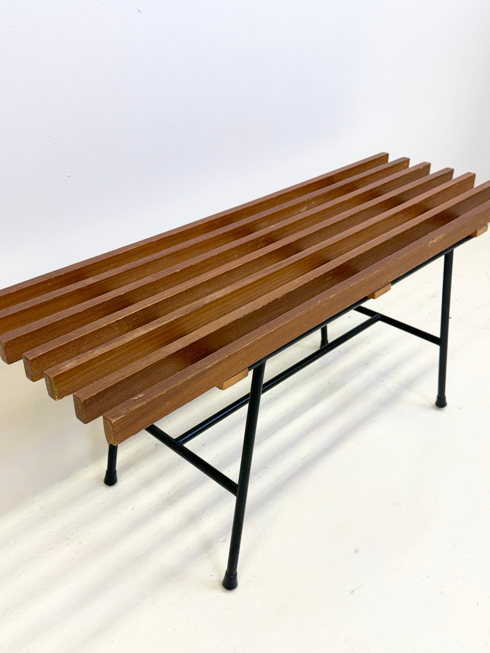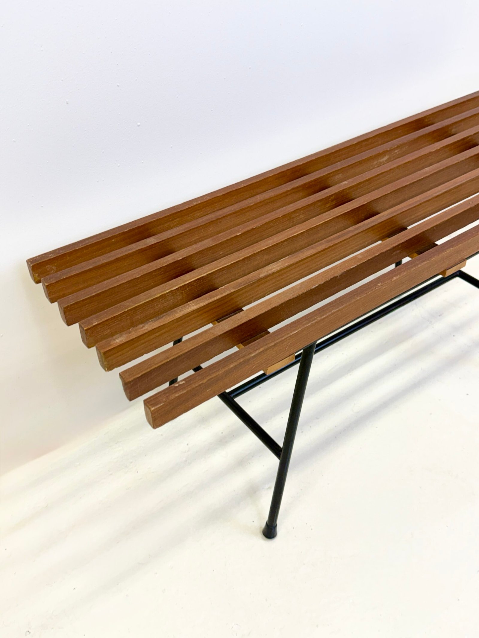 Élégant banc italien des années 1960/70, composé d’une assise à lattes en bois massif reposant sur une fine structure en métal noir. Sa ligne sobre et graphique illustre parfaitement l’esthétique minimaliste du design moderniste italien de l’époque.