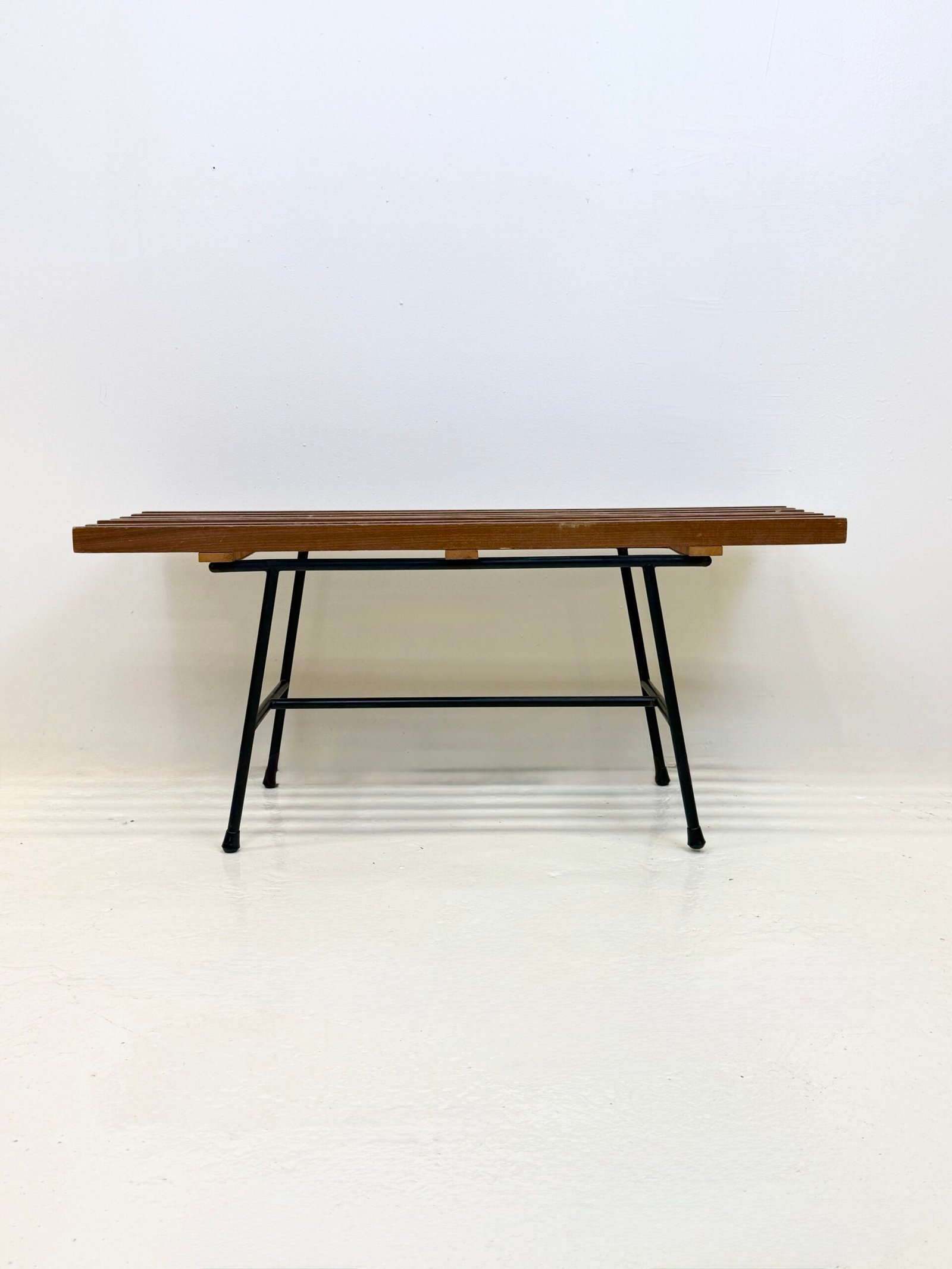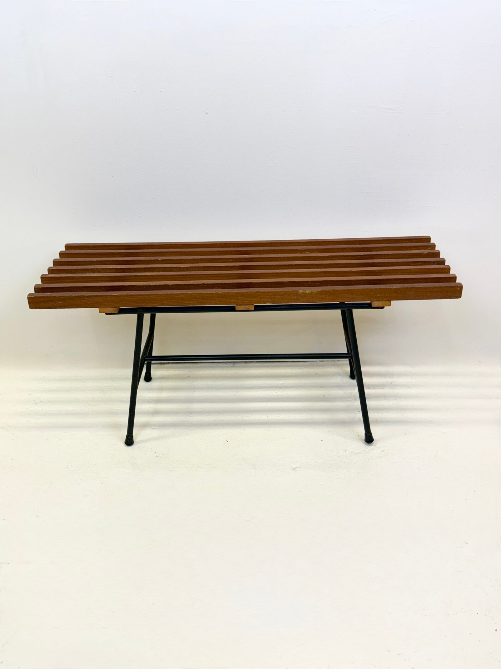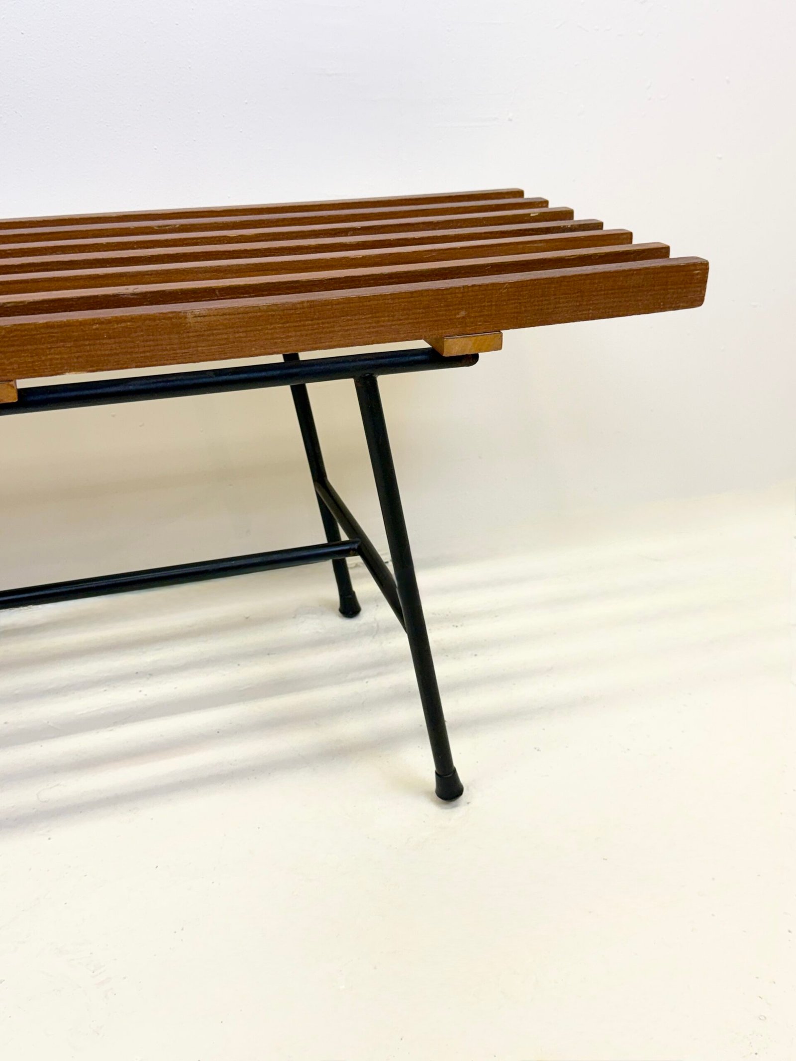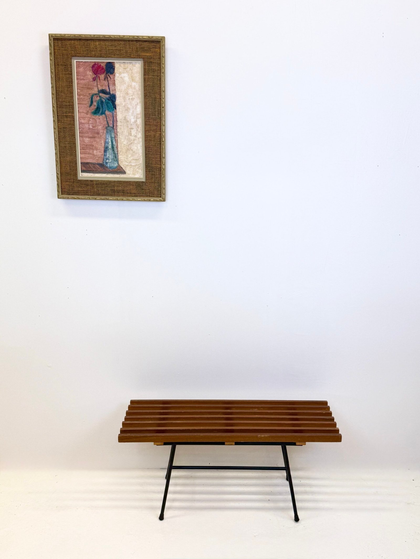 Élégant banc italien des années 1960/70, composé d’une assise à lattes en bois massif reposant sur une fine structure en métal noir. Sa ligne sobre et graphique illustre parfaitement l’esthétique minimaliste du design moderniste italien de l’époque.