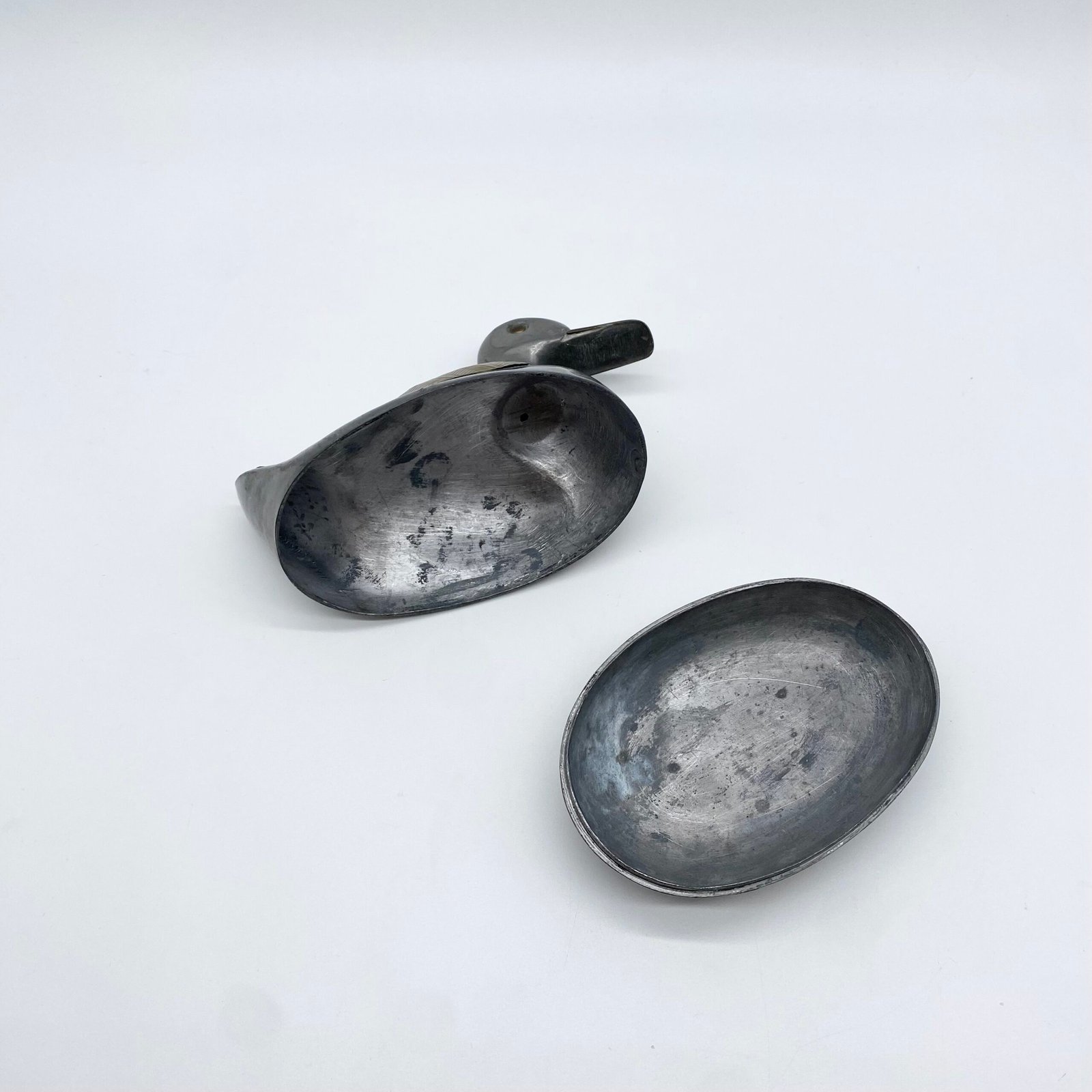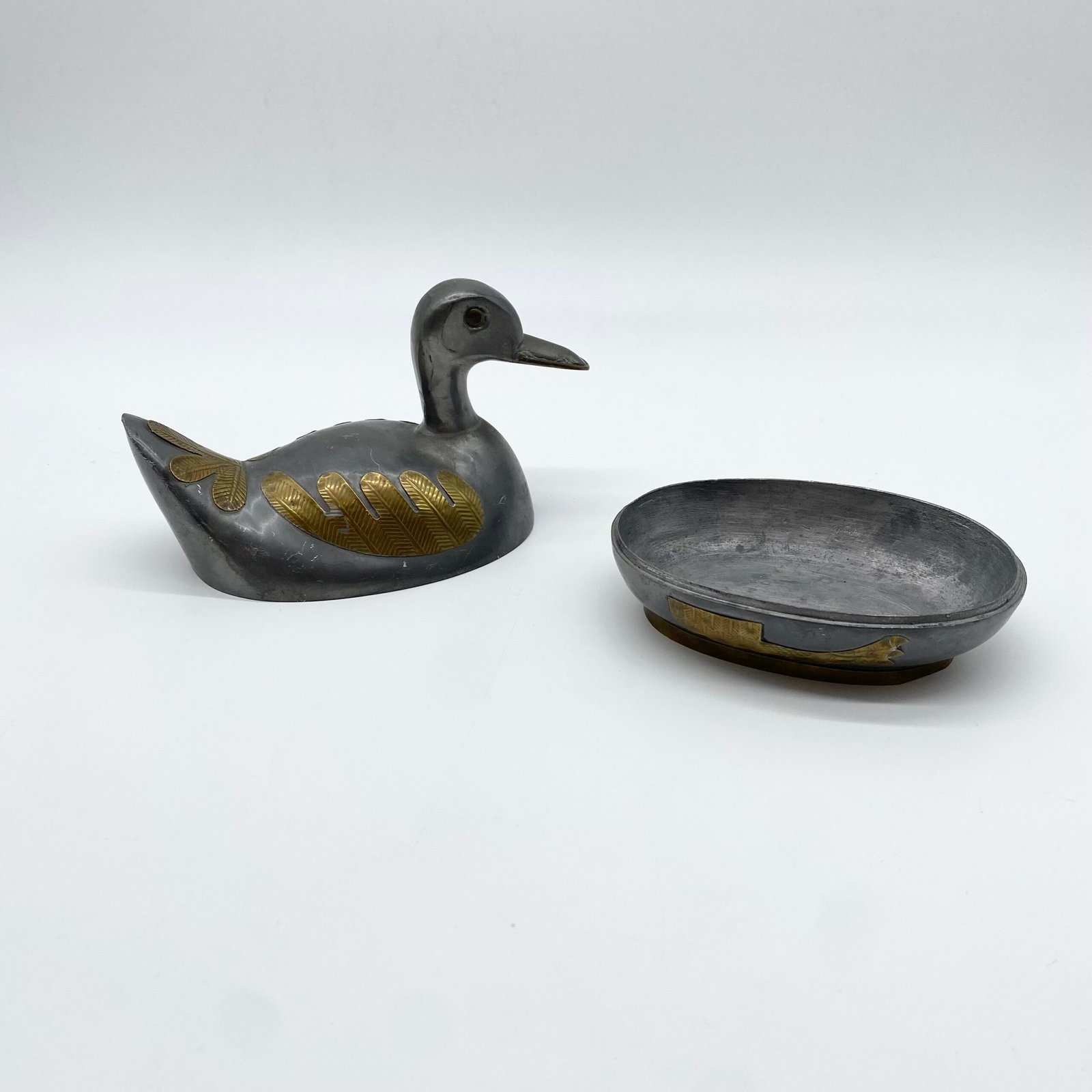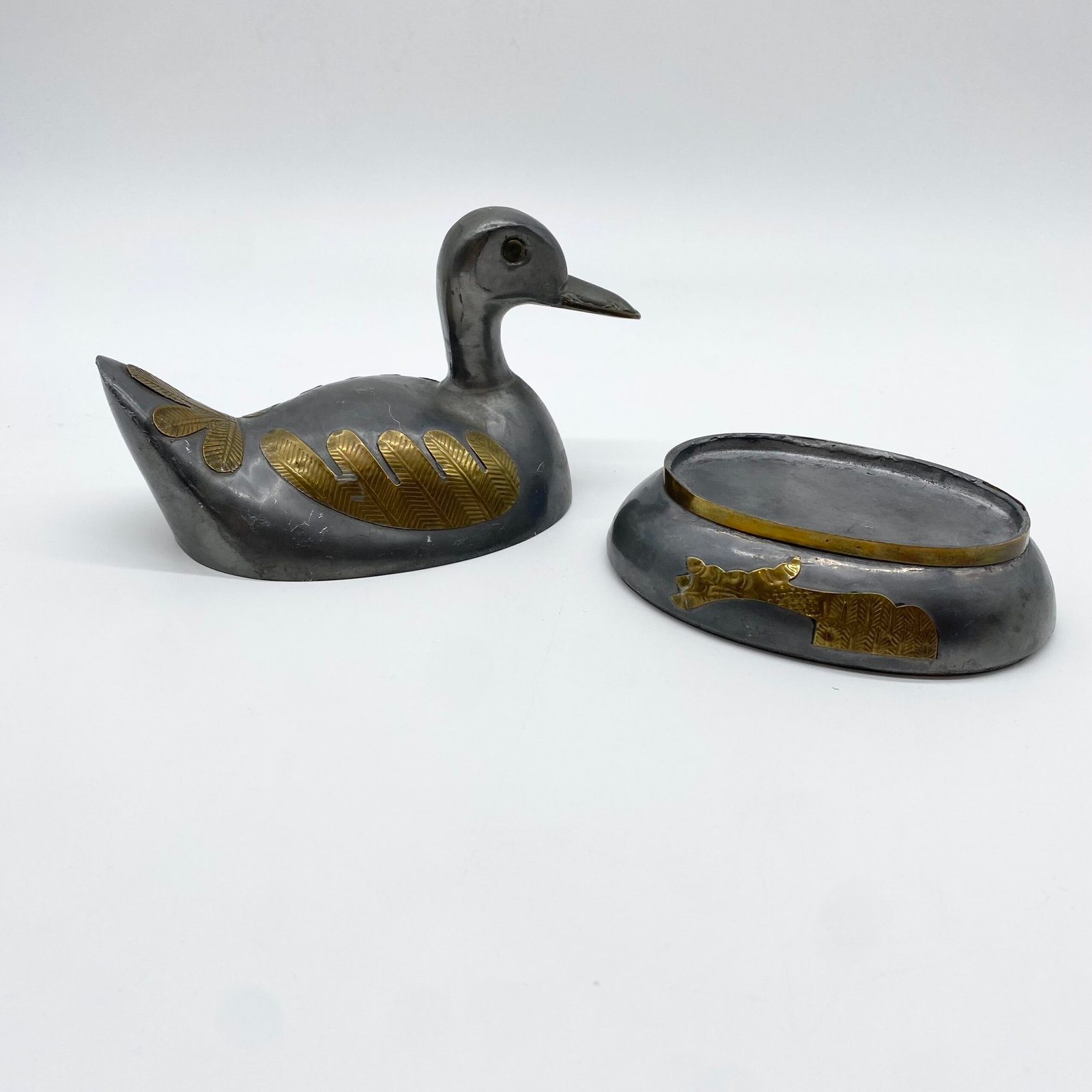 Charmante boîte figurative en forme de canard, réalisée en étain martelé et laiton doré gravé. Les incrustations de laiton dessinent avec finesse les plumes et détails des ailes, offrant un contraste élégant entre les deux métaux.