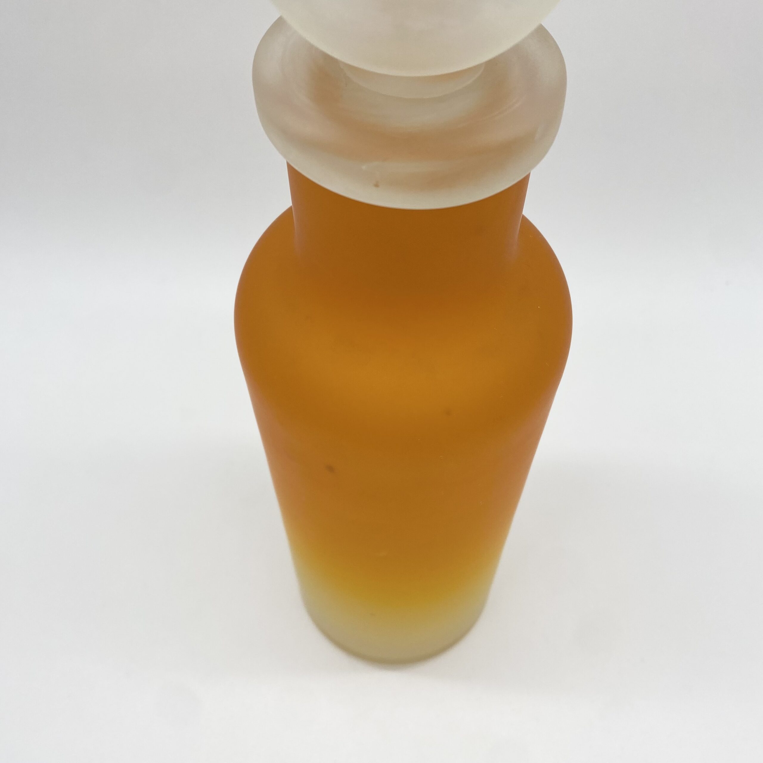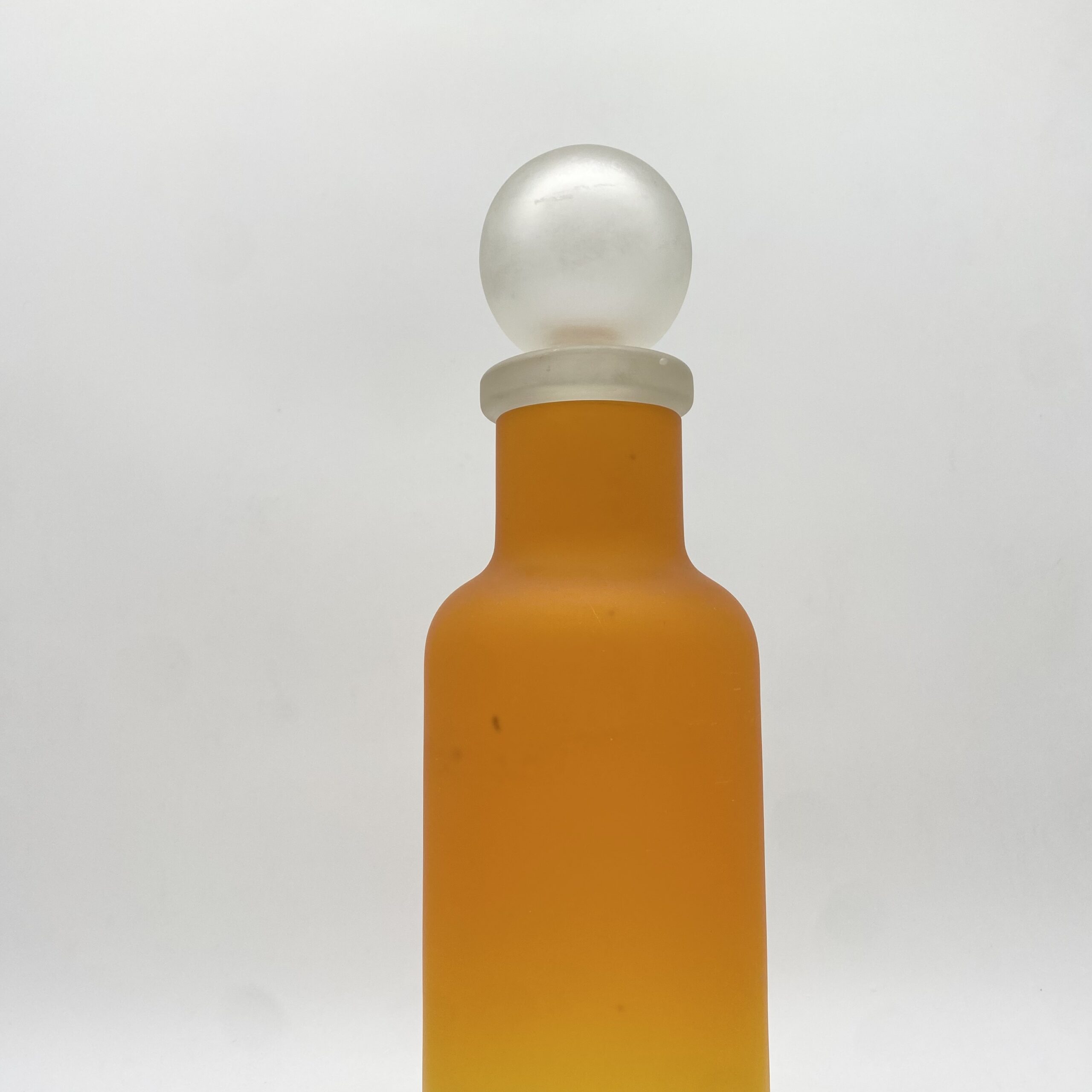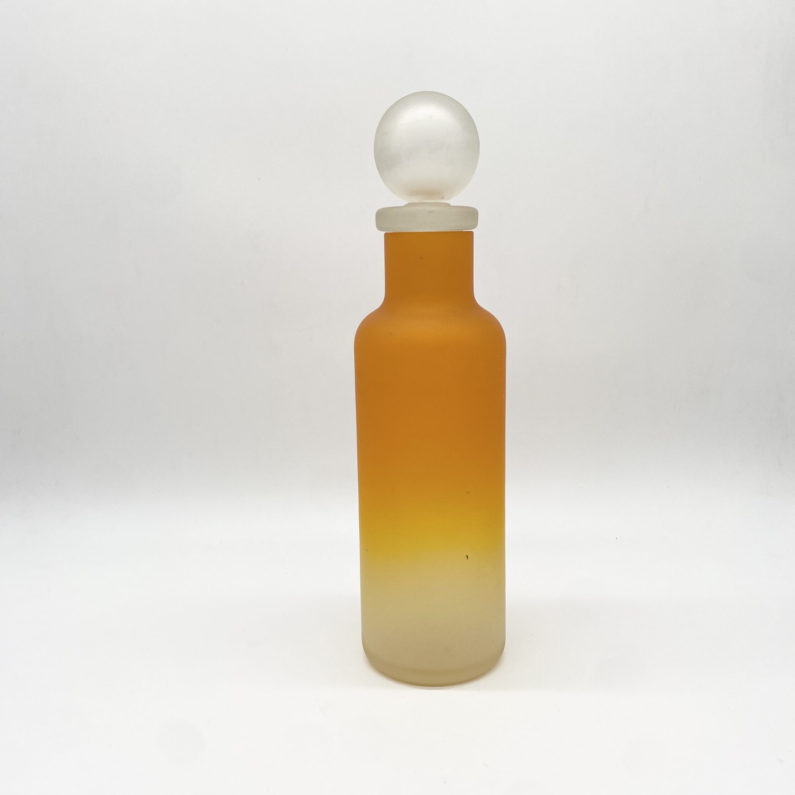 Grande bouteille décorative en verre de Murano, réalisée en verre dépoli avec un élégant dégradé allant d’un blanc laiteux en partie basse vers un ambre orangé profond dans la partie supérieure.