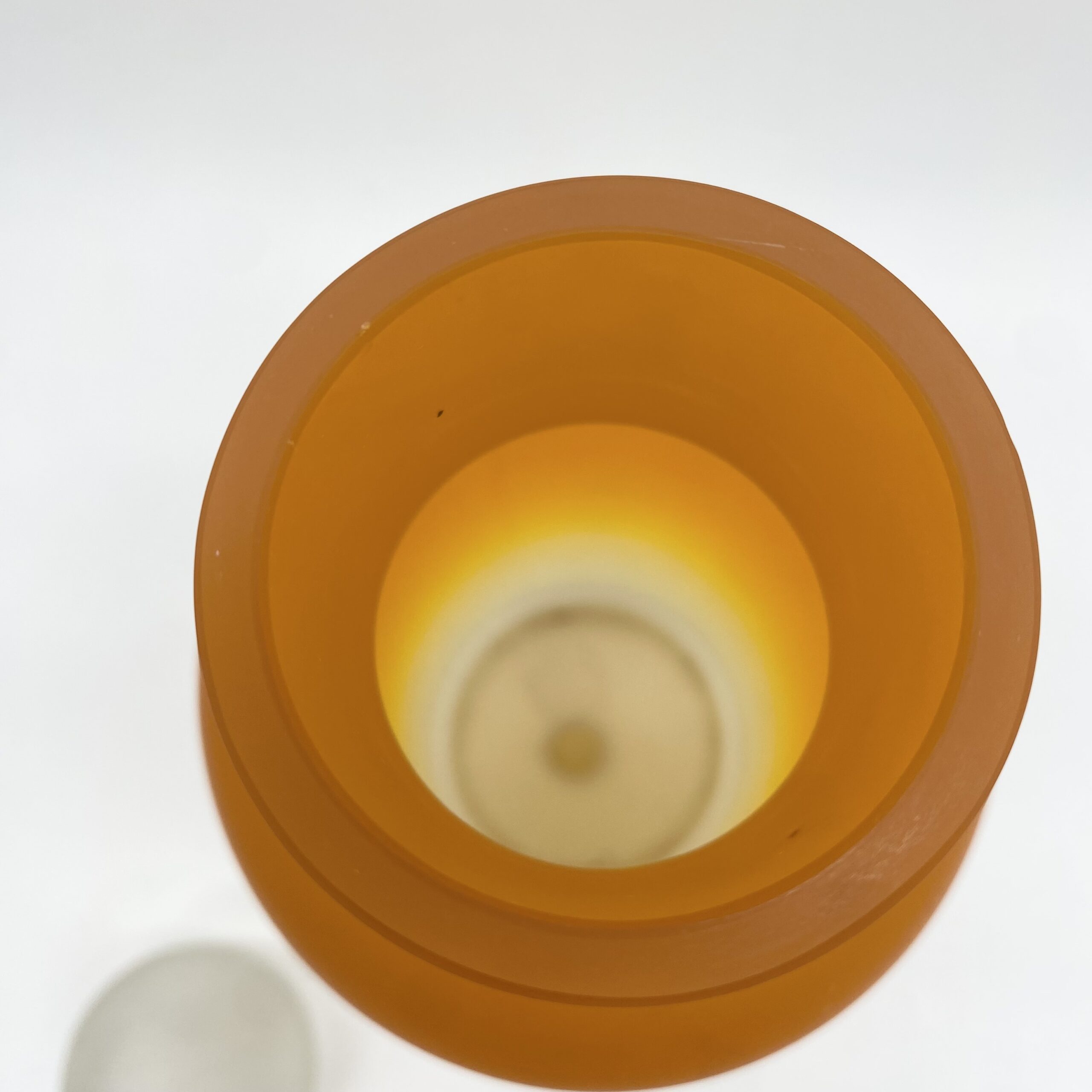 La surface satinée diffuse subtilement la lumière et met en valeur les nuances chaudes du verre.