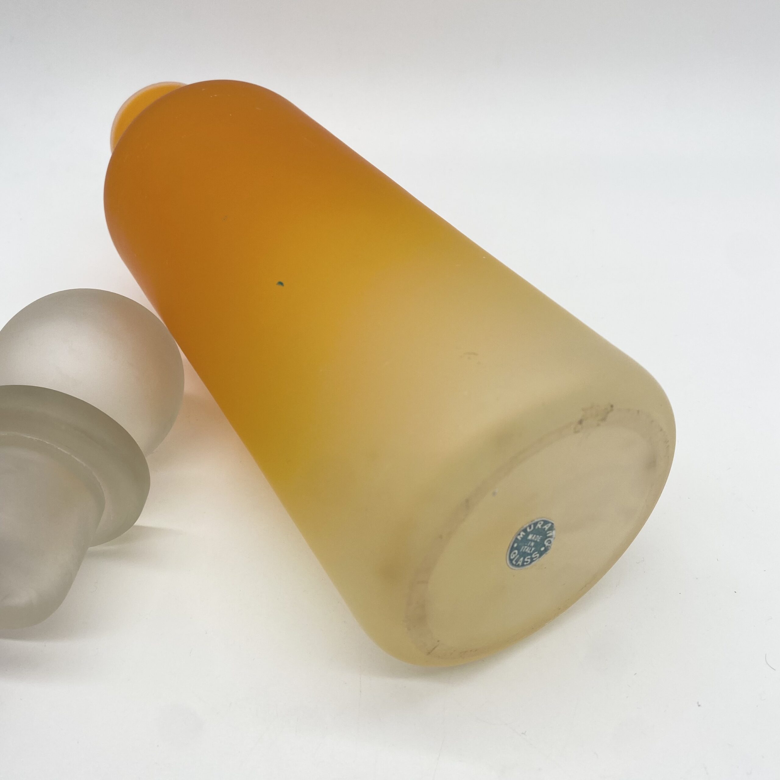 La forme élancée est soulignée par un col resserré et un bouchon sphérique en verre translucide, typique des productions décoratives muranaises de la seconde moitié du XXᵉ siècle.