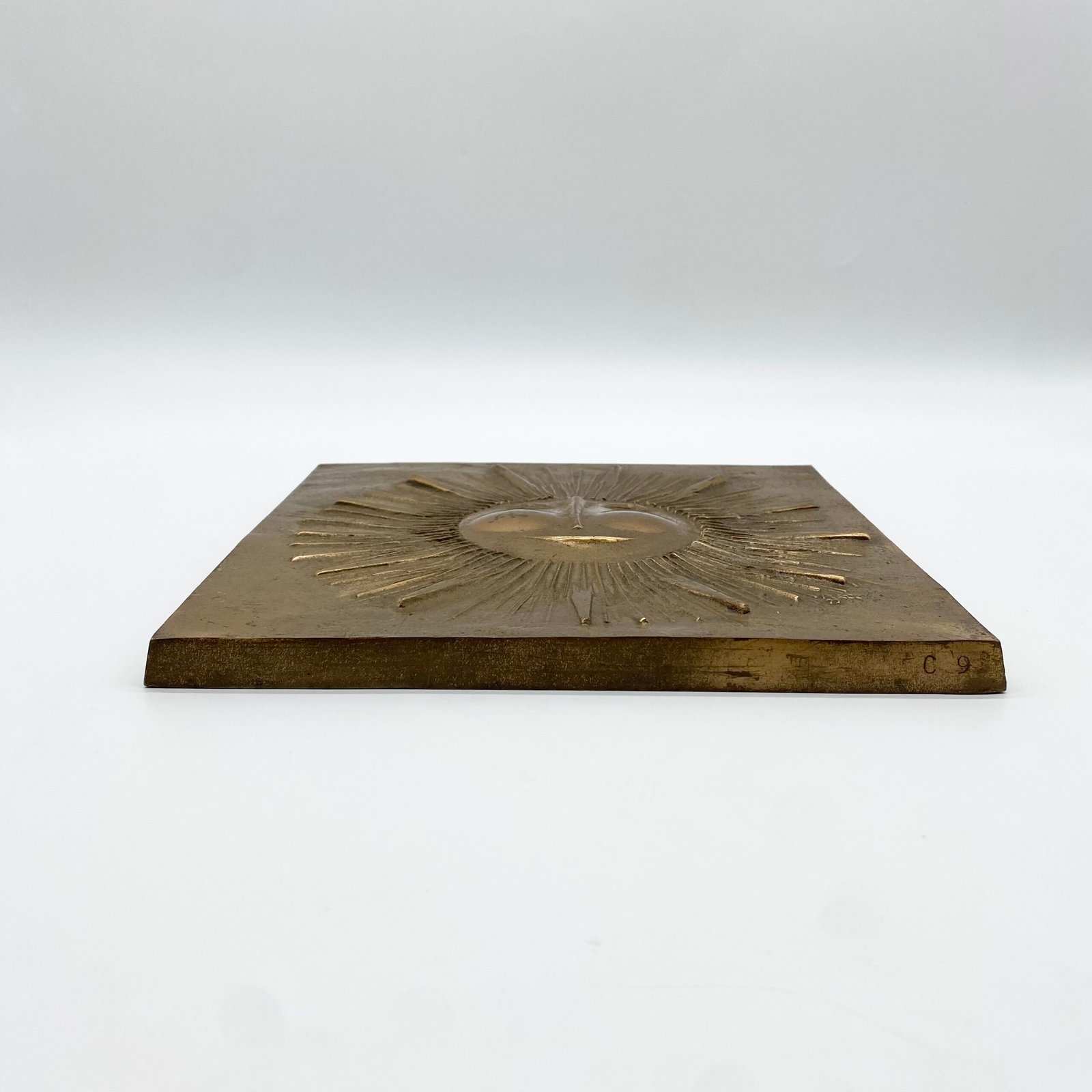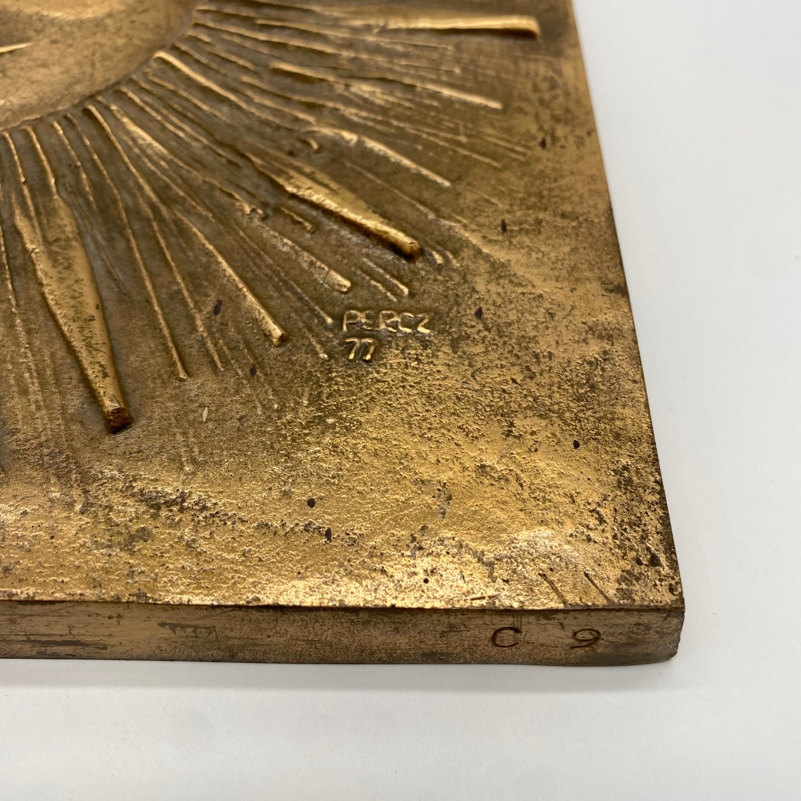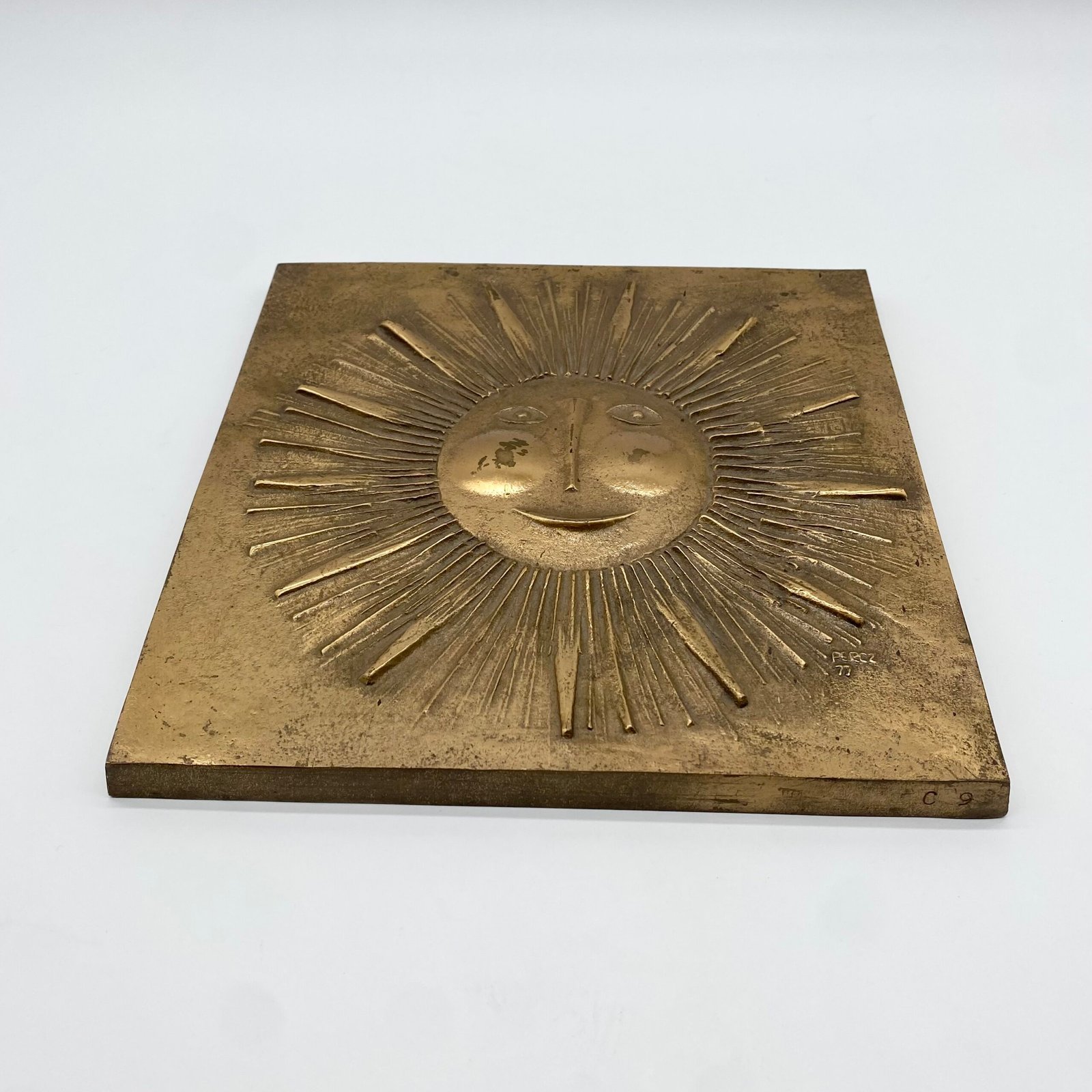 Plaque murale en bronze doré représentant un soleil rayonnant au visage stylisé, créée par l’artiste hongrois János Percz (1920–2000).