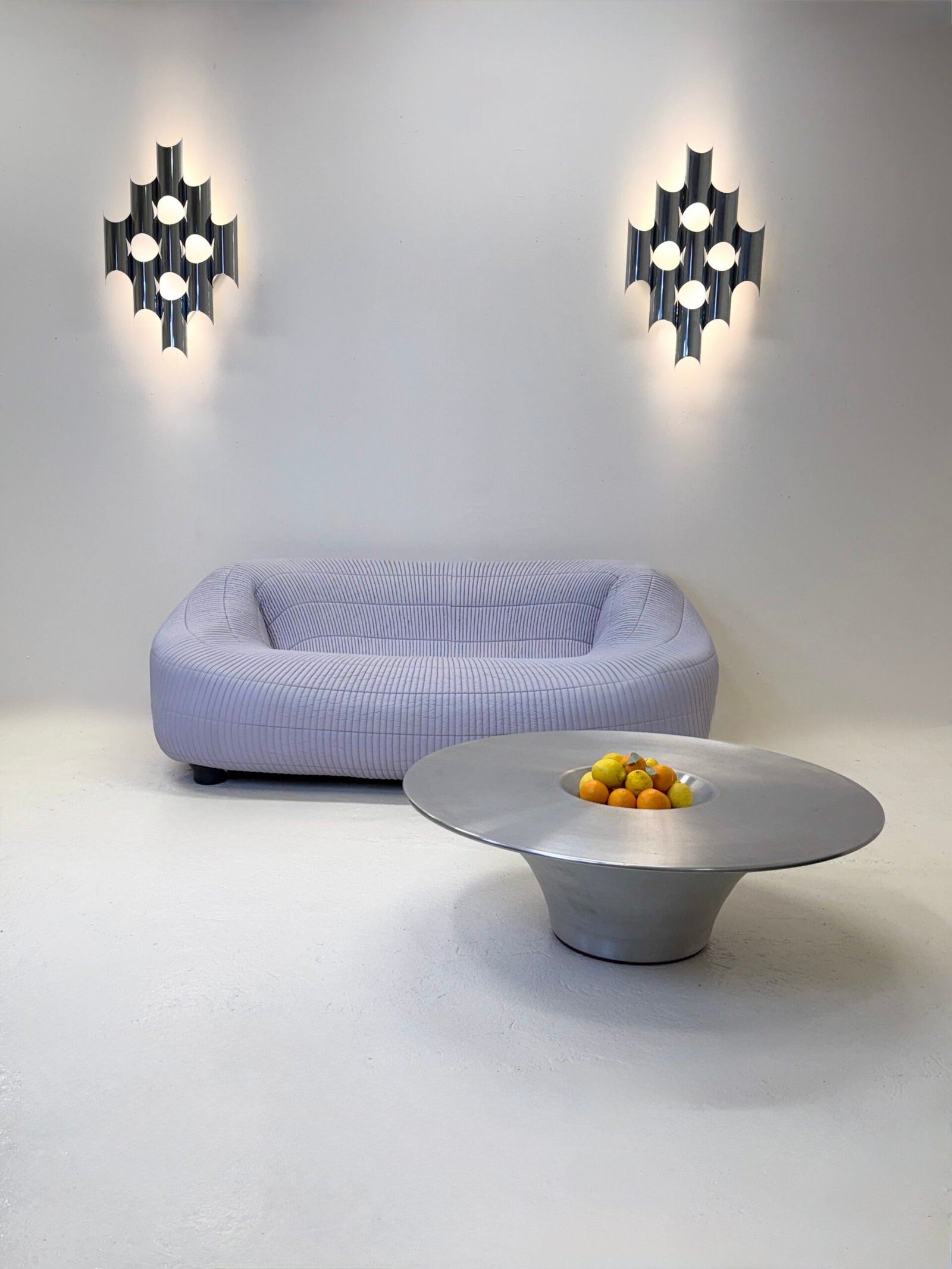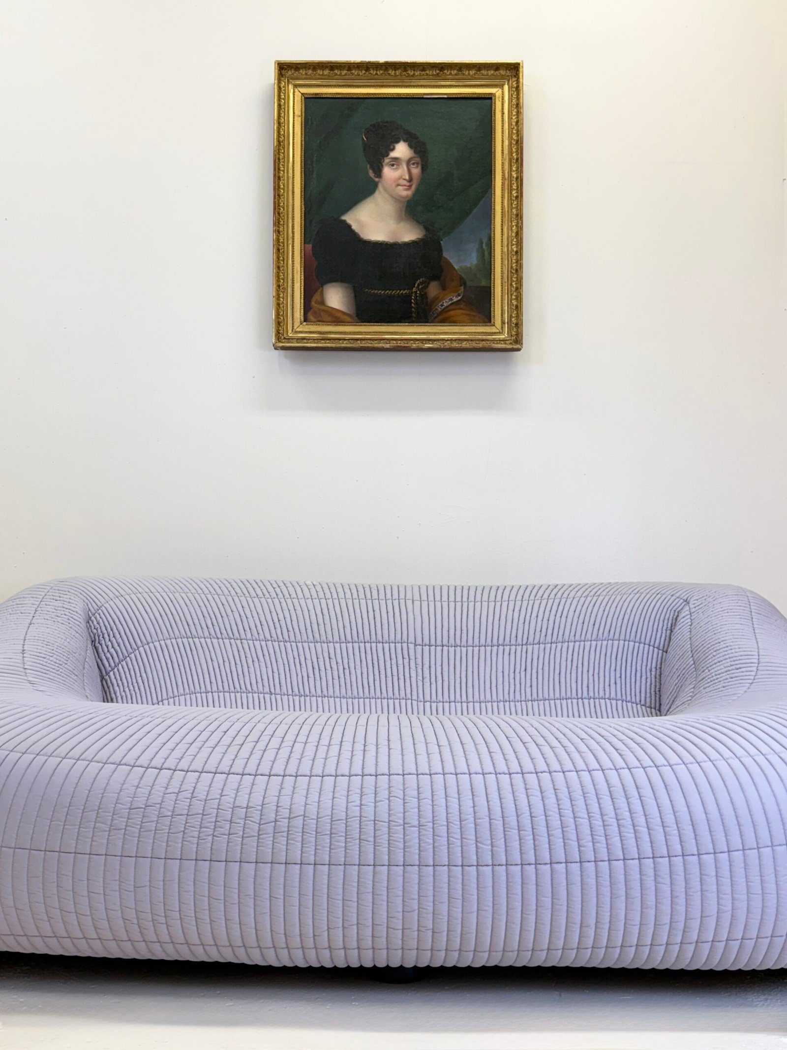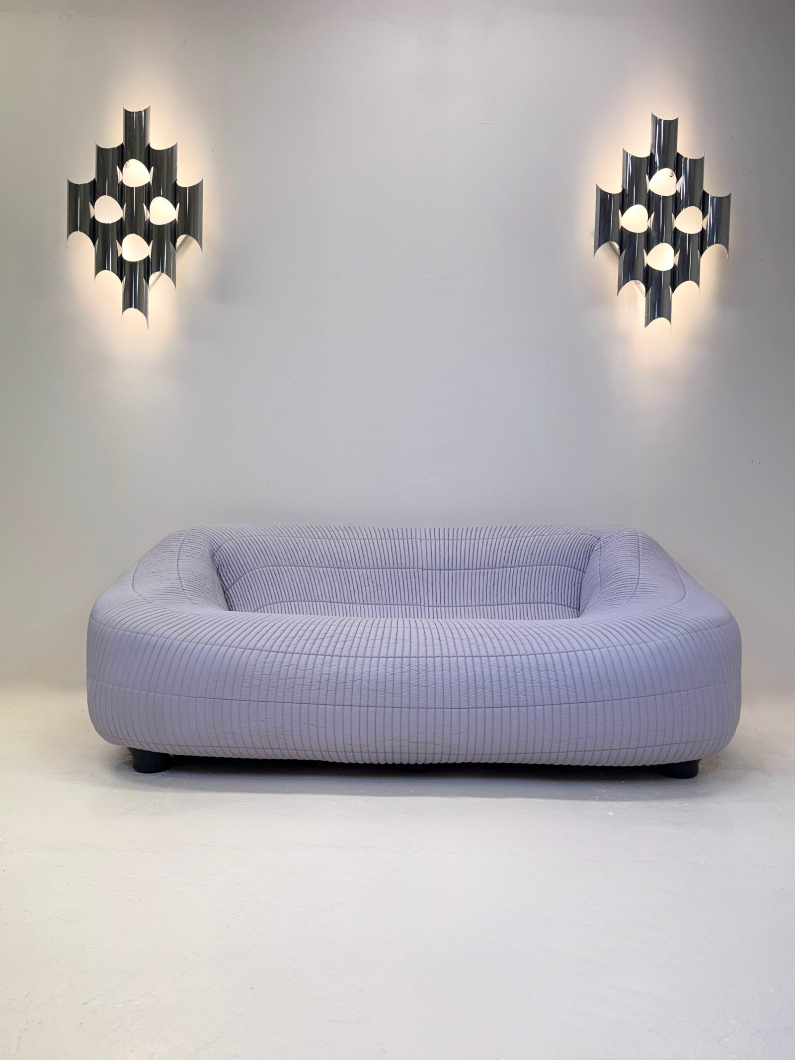 Le canapé est intégralement recouvert d’un tissu type anorak texturé, dans des tons de gris subtilement nuancés de violet. Cette matière singulière accentue son caractère expérimental et son identité unique.