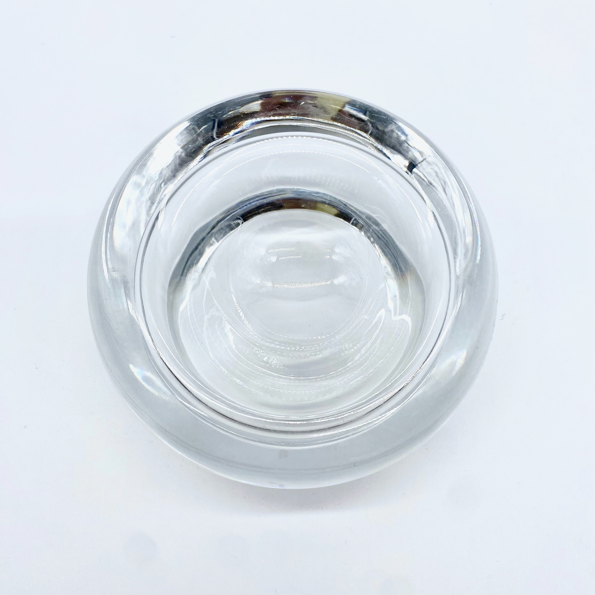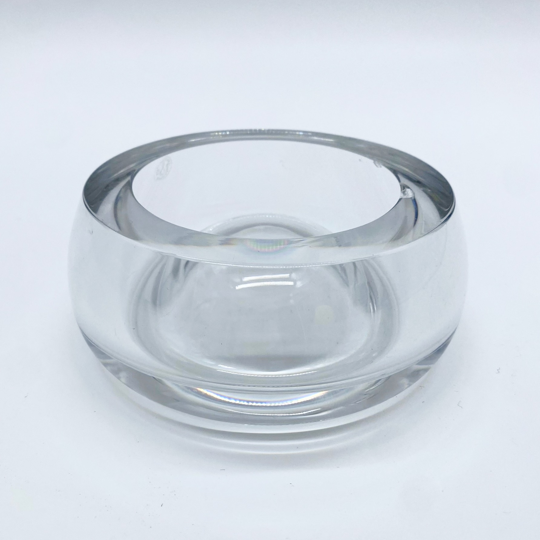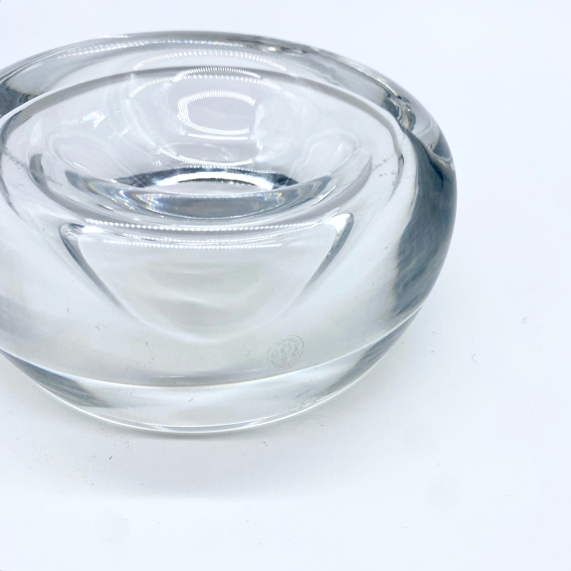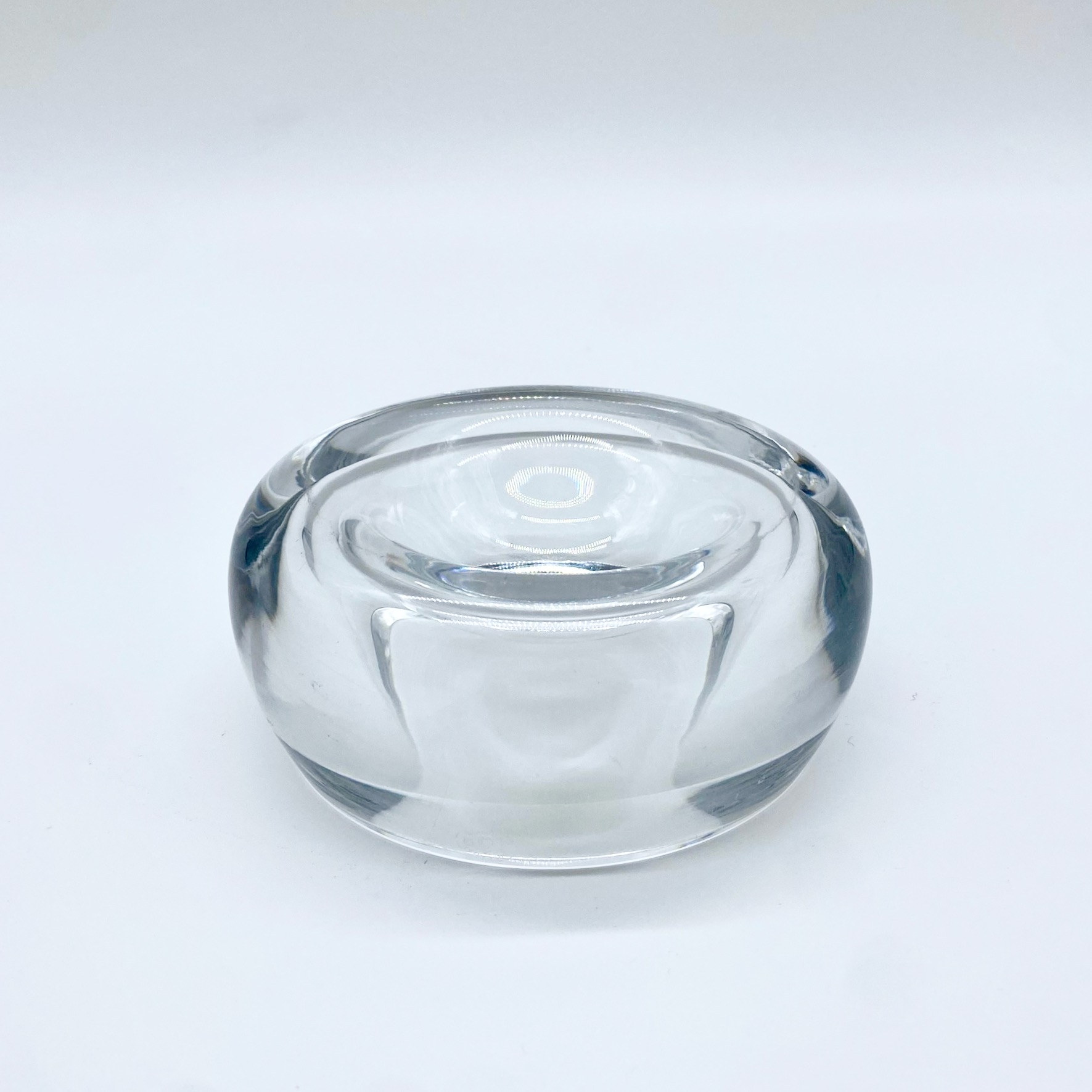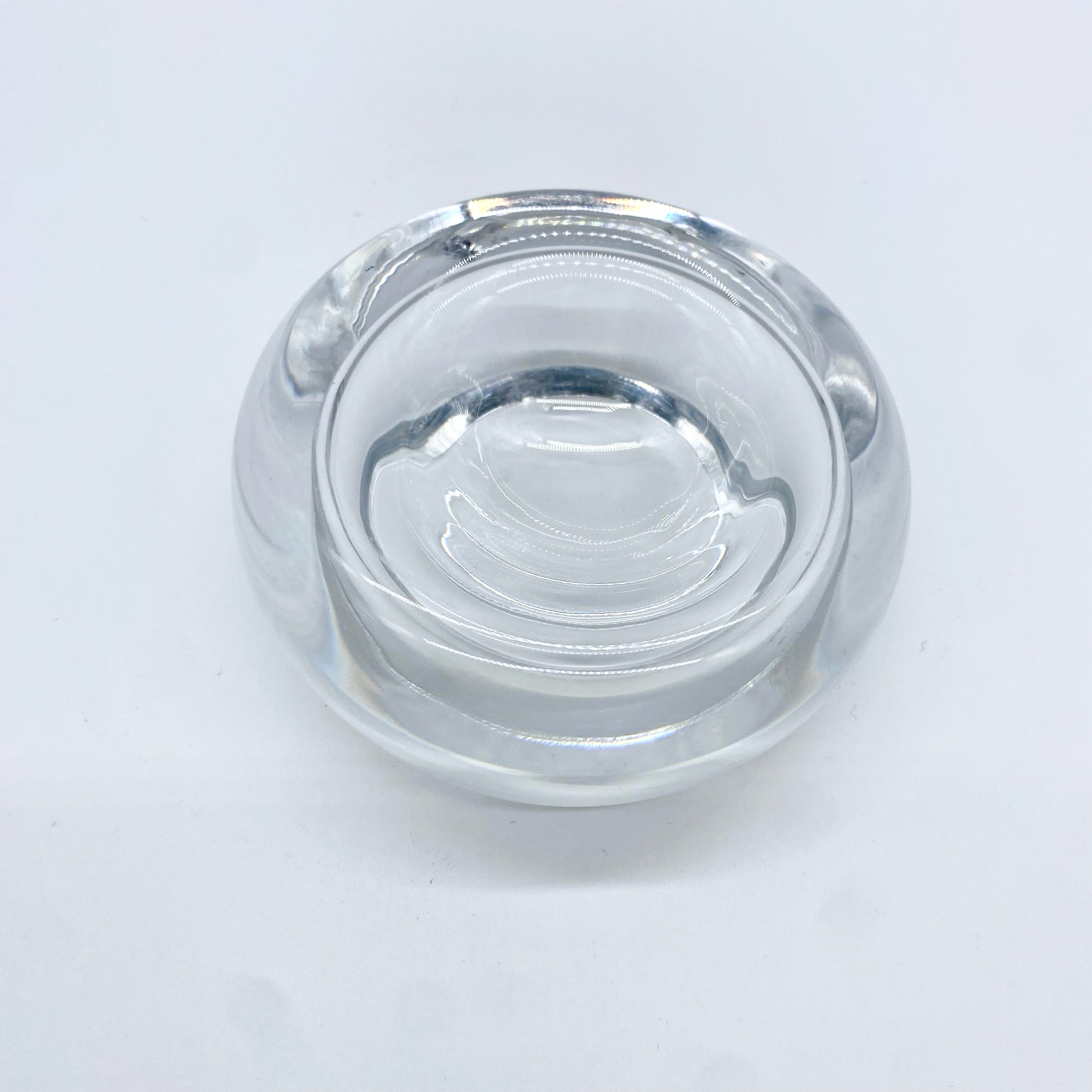 Élégant cendrier en cristal clair signé Baccarat, au design sobre et organique. Sa forme arrondie, lourde et parfaitement polie, capte la lumière avec brillance et pureté.