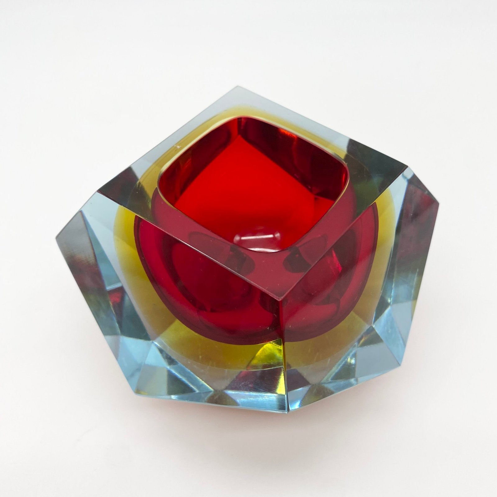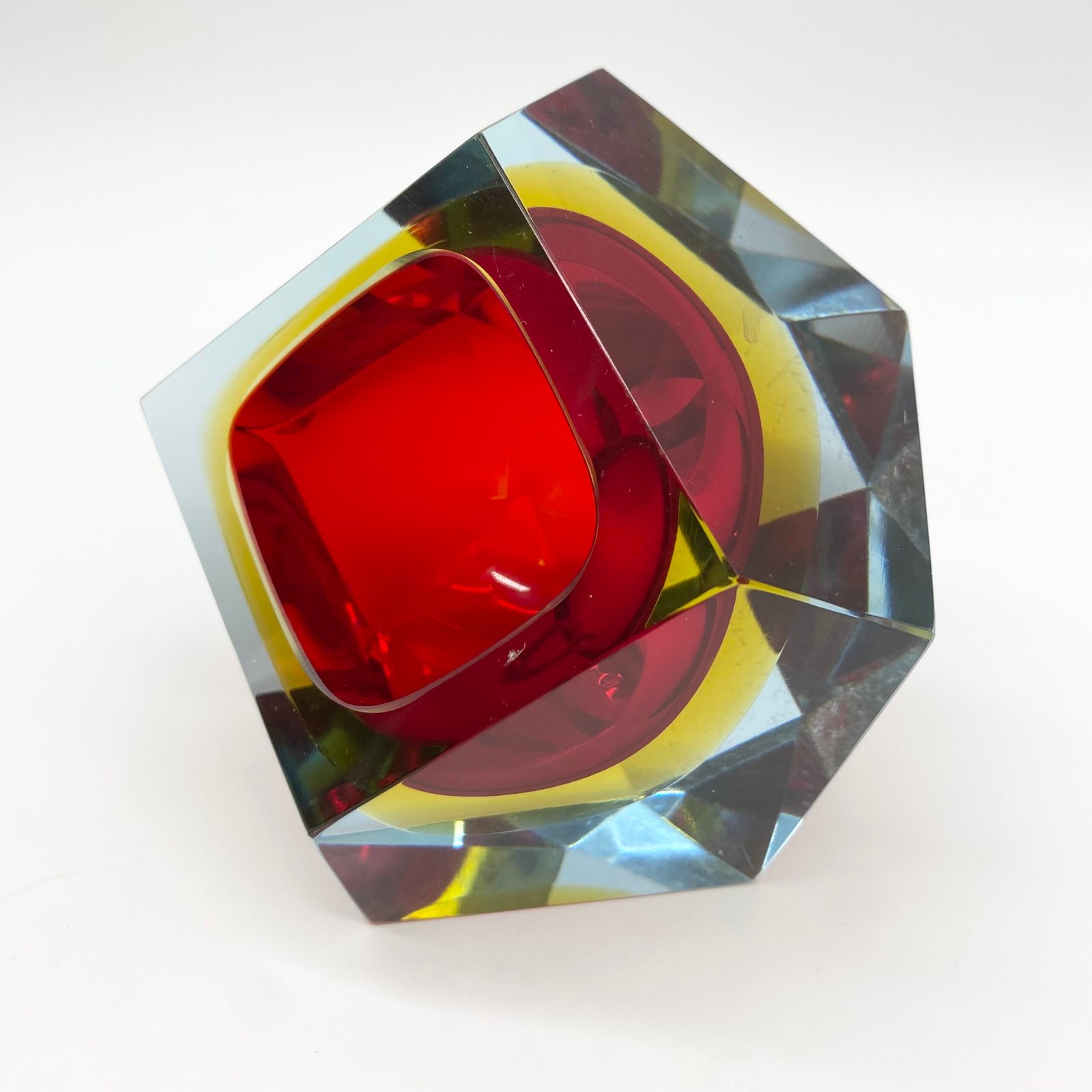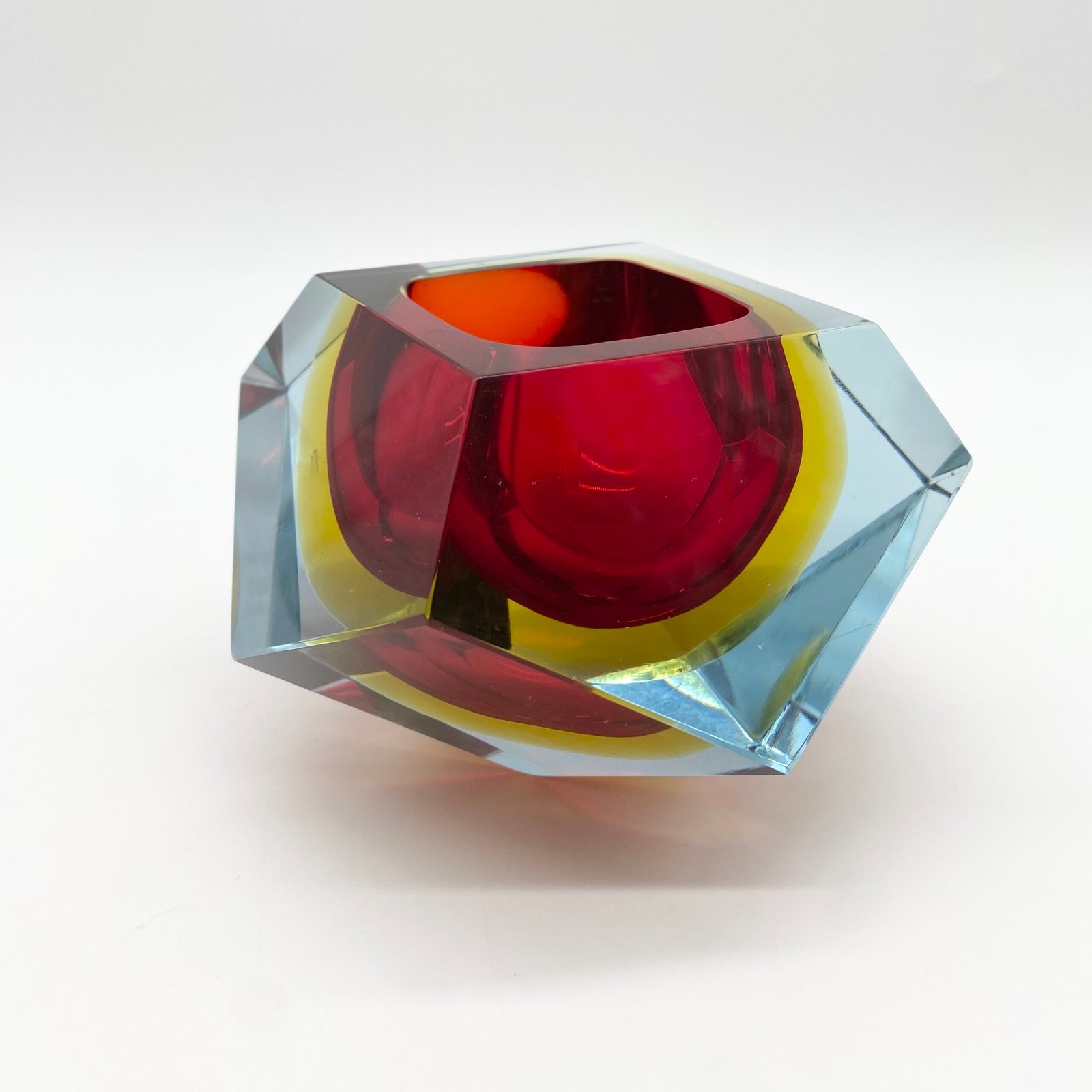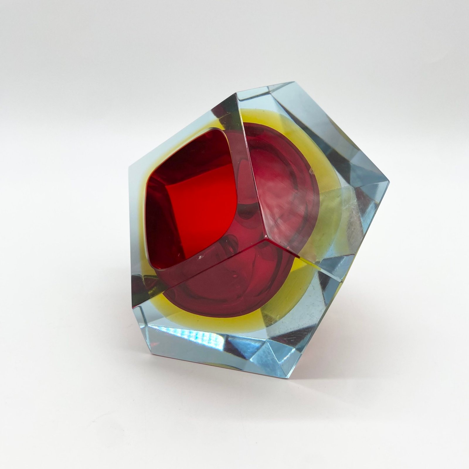 Ce modèle présente un cœur rouge intense, cerclé d’un jaune lumineux, le tout encapsulé dans une épaisse couche de verre bleu clair. Sa forme facettée, taillée à la main, accentue les jeux de lumière et donne à l’objet une dimension sculpturale.