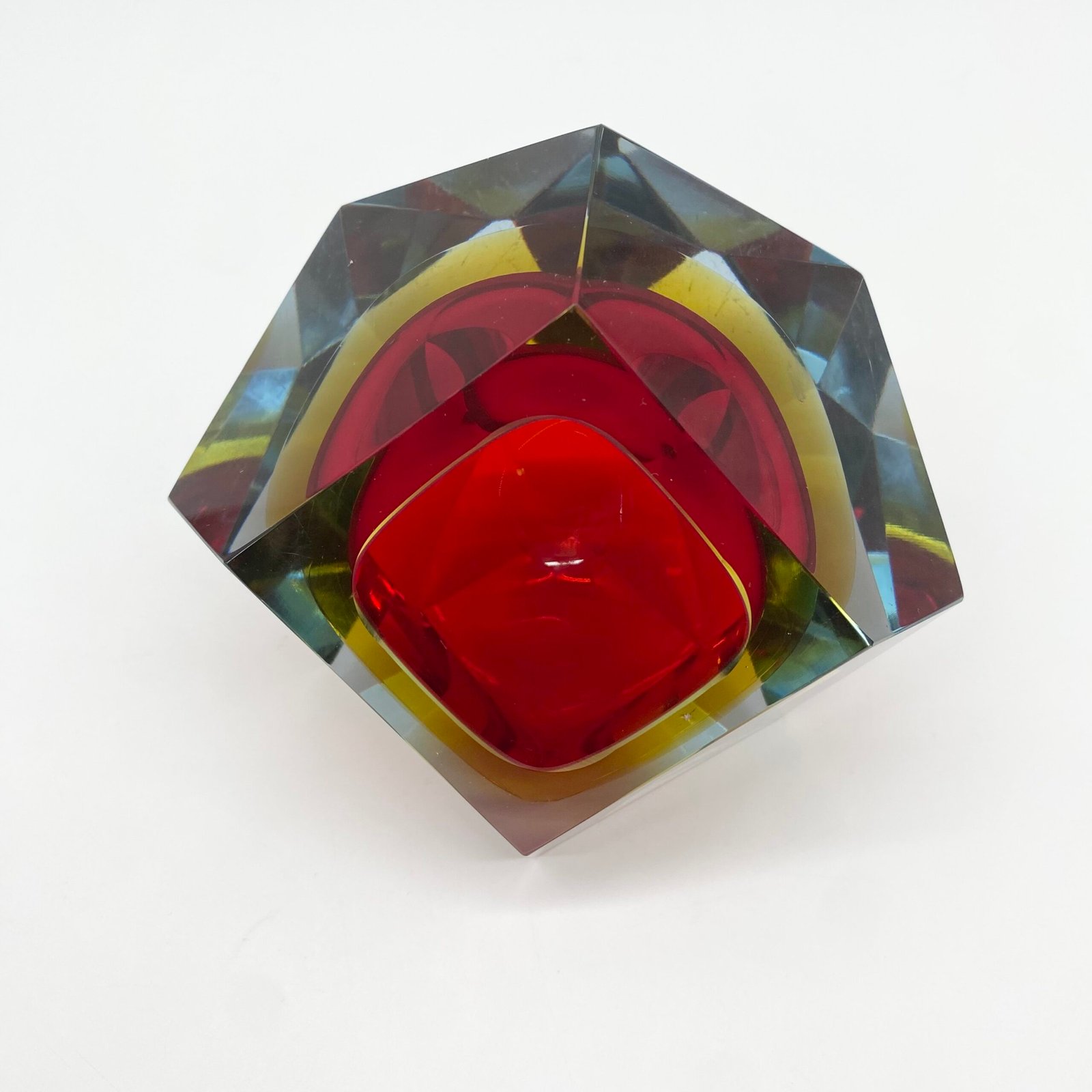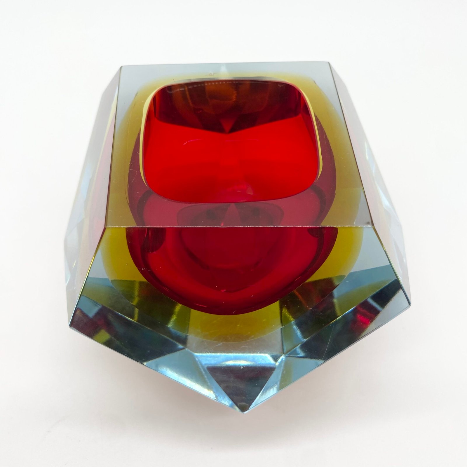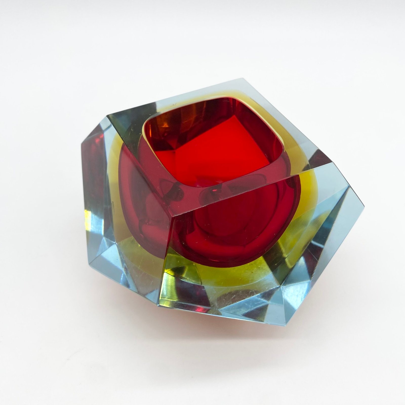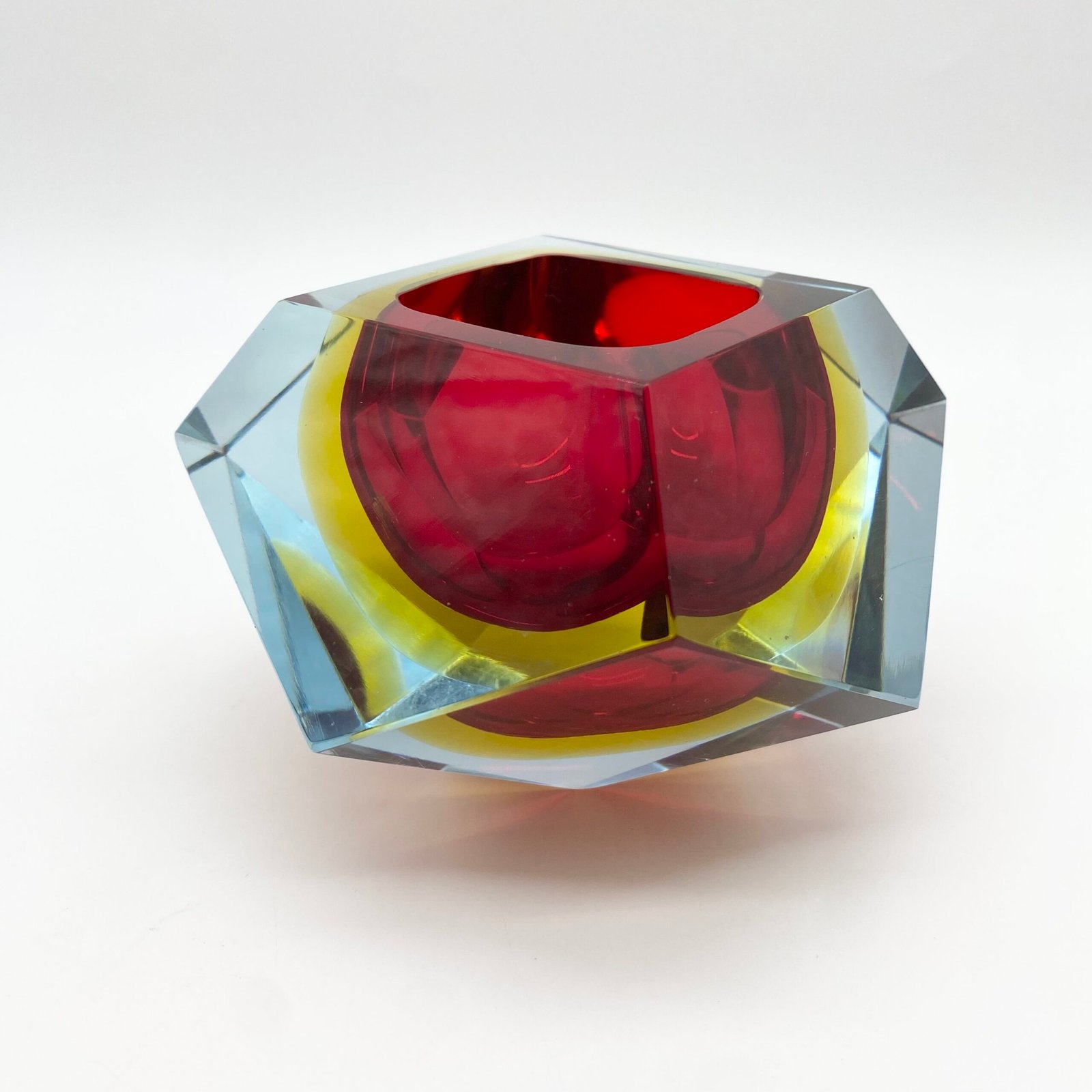 Ce modèle présente un cœur rouge intense, cerclé d’un jaune lumineux, le tout encapsulé dans une épaisse couche de verre bleu clair. Sa forme facettée, taillée à la main, accentue les jeux de lumière et donne à l’objet une dimension sculpturale.