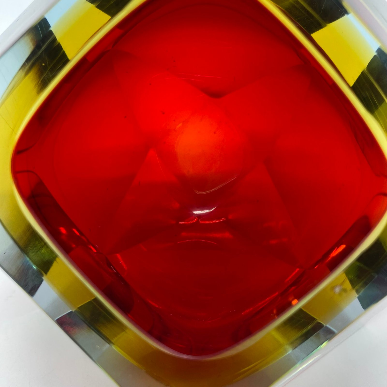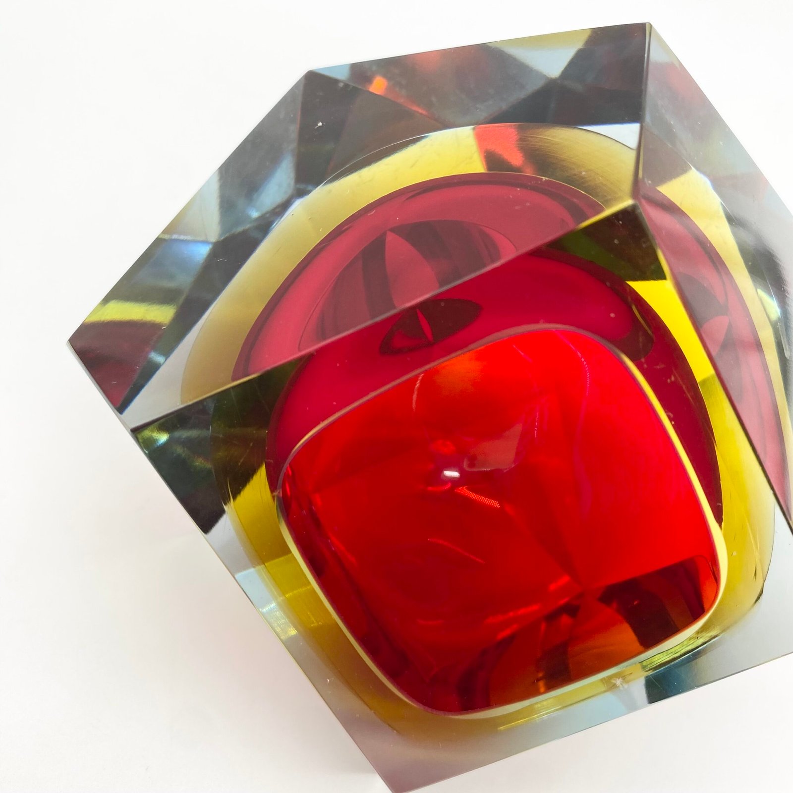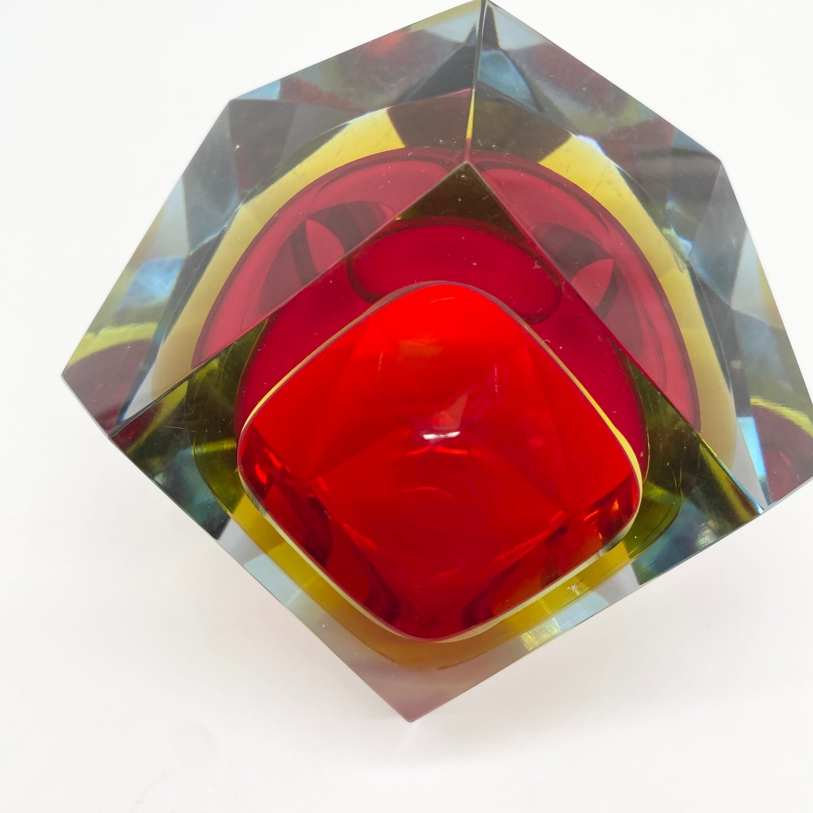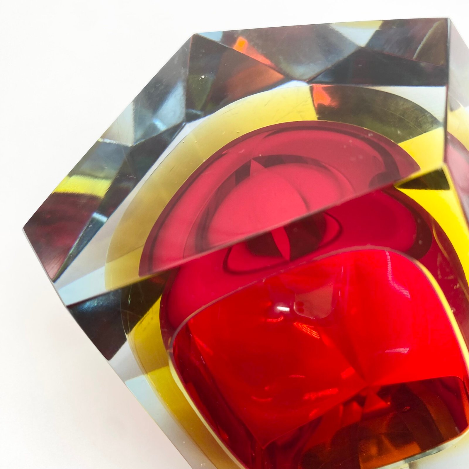 Ce modèle présente un cœur rouge intense, cerclé d’un jaune lumineux, le tout encapsulé dans une épaisse couche de verre bleu clair. Sa forme facettée, taillée à la main, accentue les jeux de lumière et donne à l’objet une dimension sculpturale.