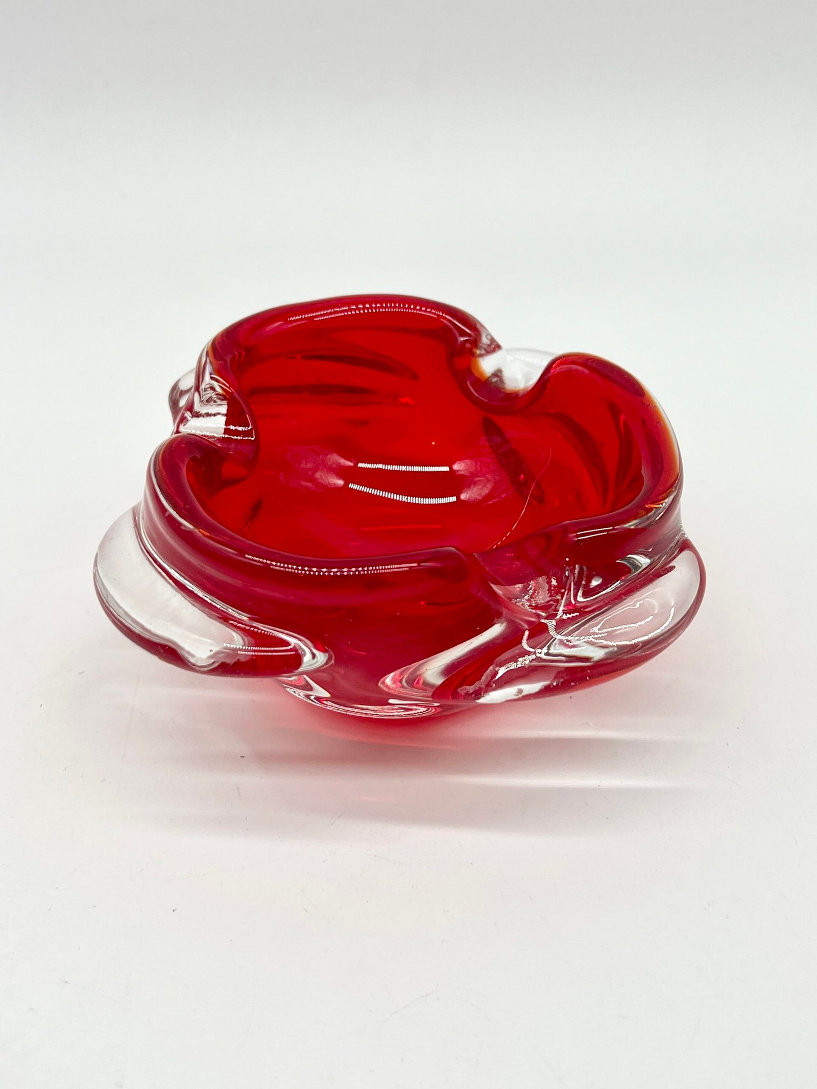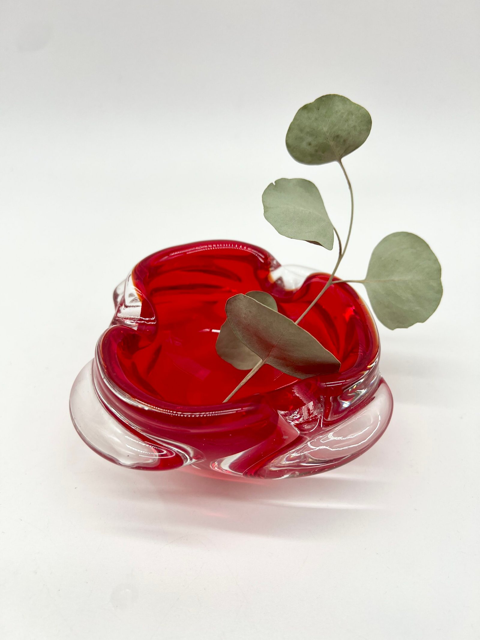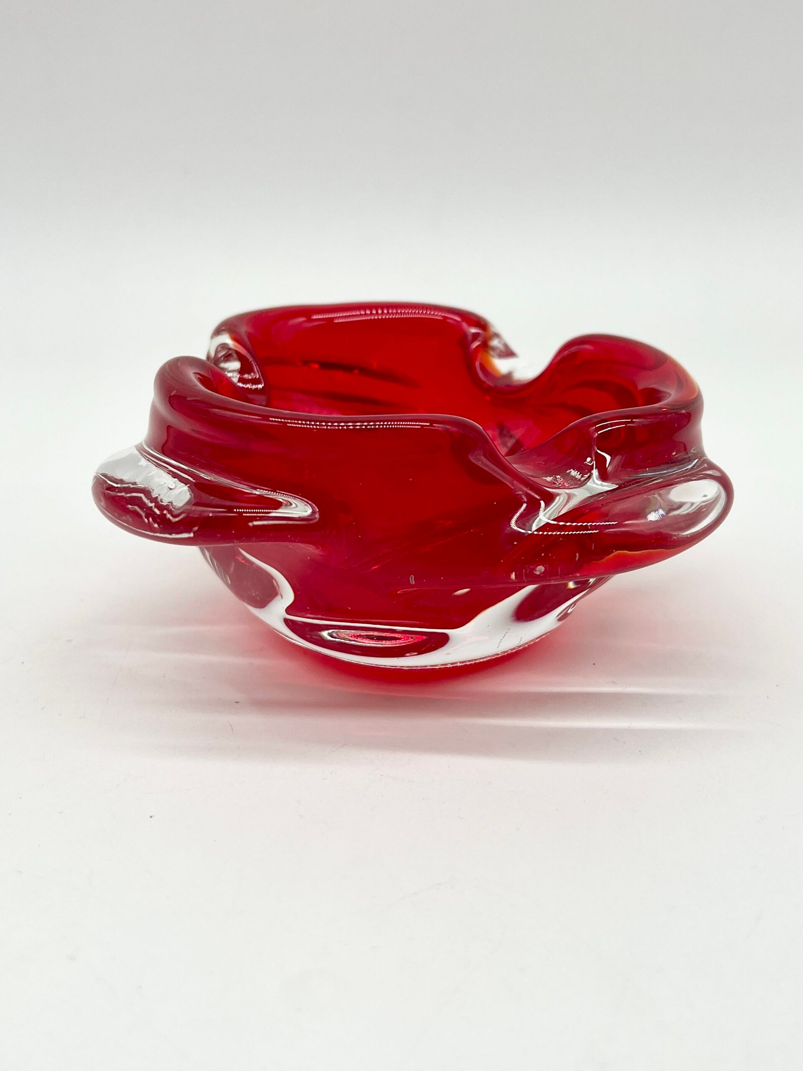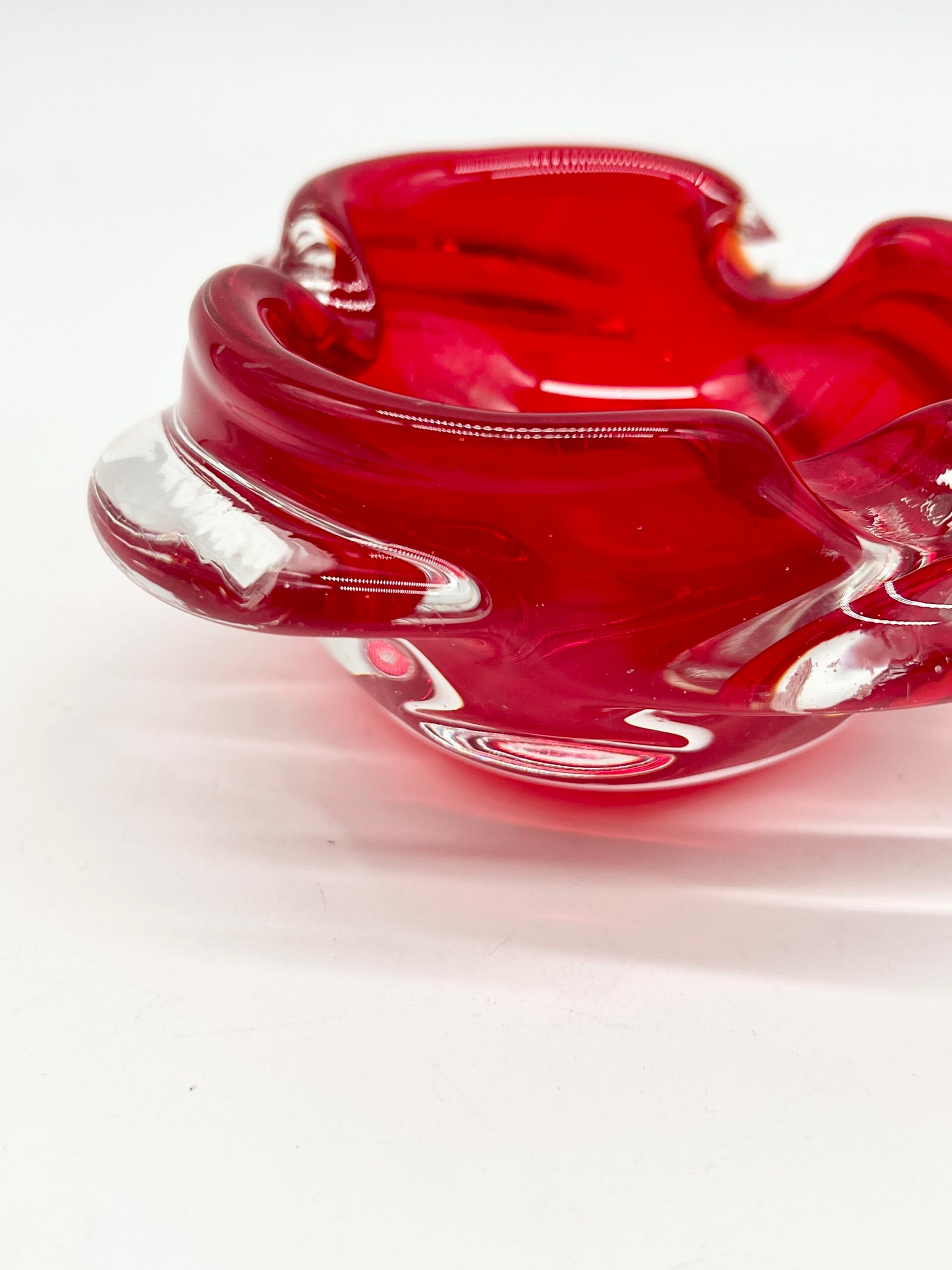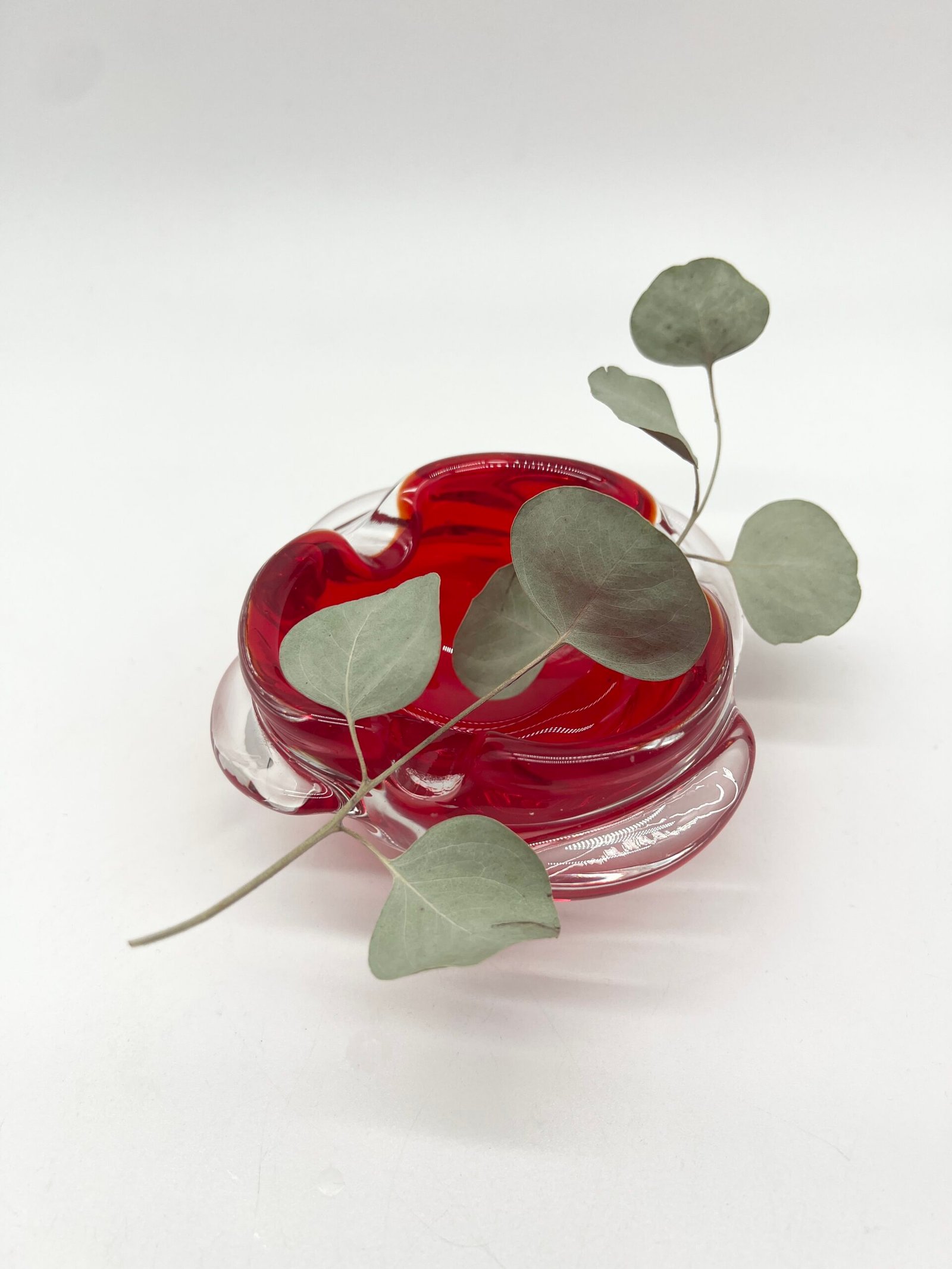 Cendrier en verre épais teinté rouge, au design organique et fluide. Sa forme libre, presque sculpturale, évoque le travail du verre soufflé avec des mouvements doux et irréguliers qui captent la lumière.