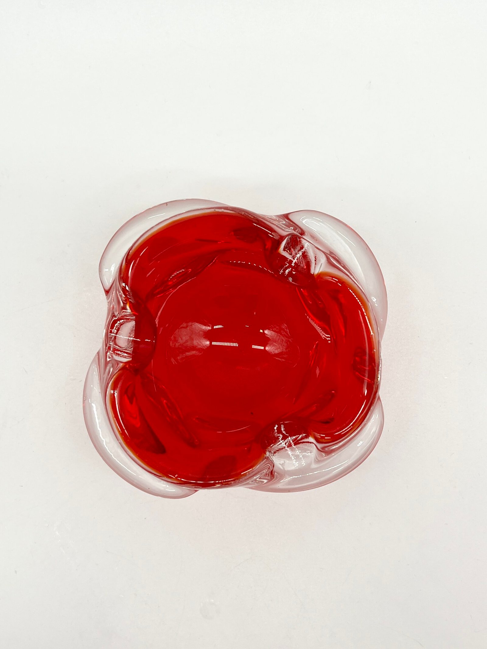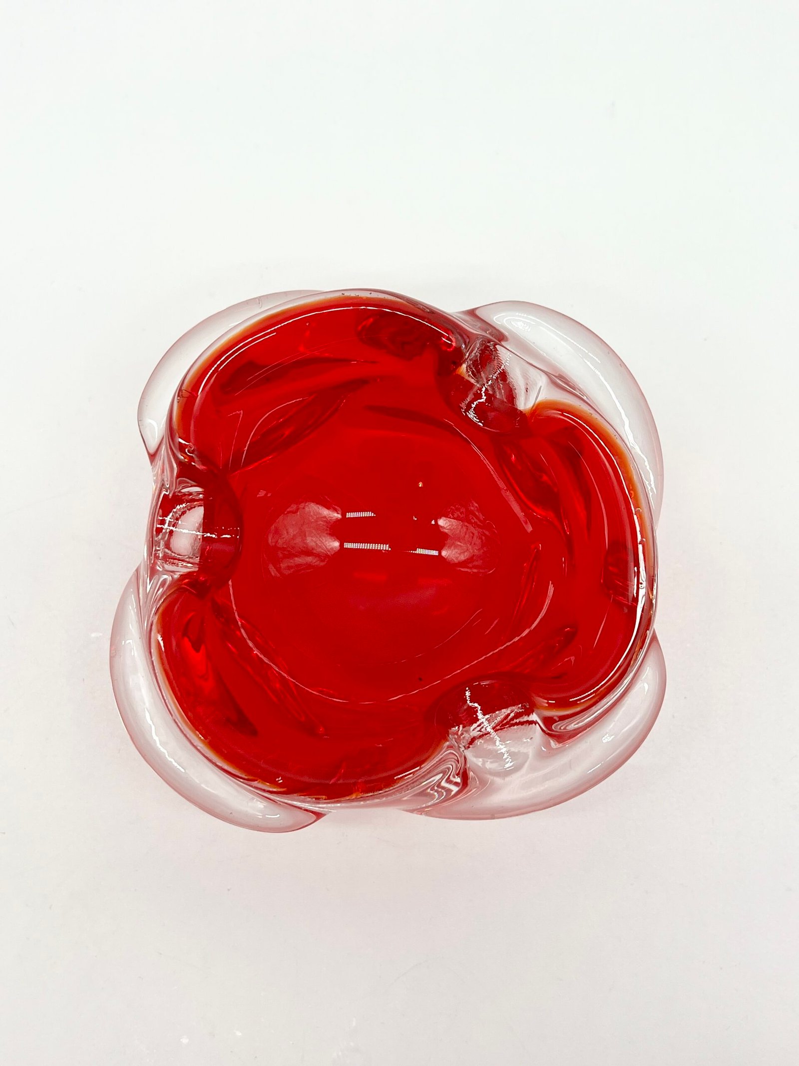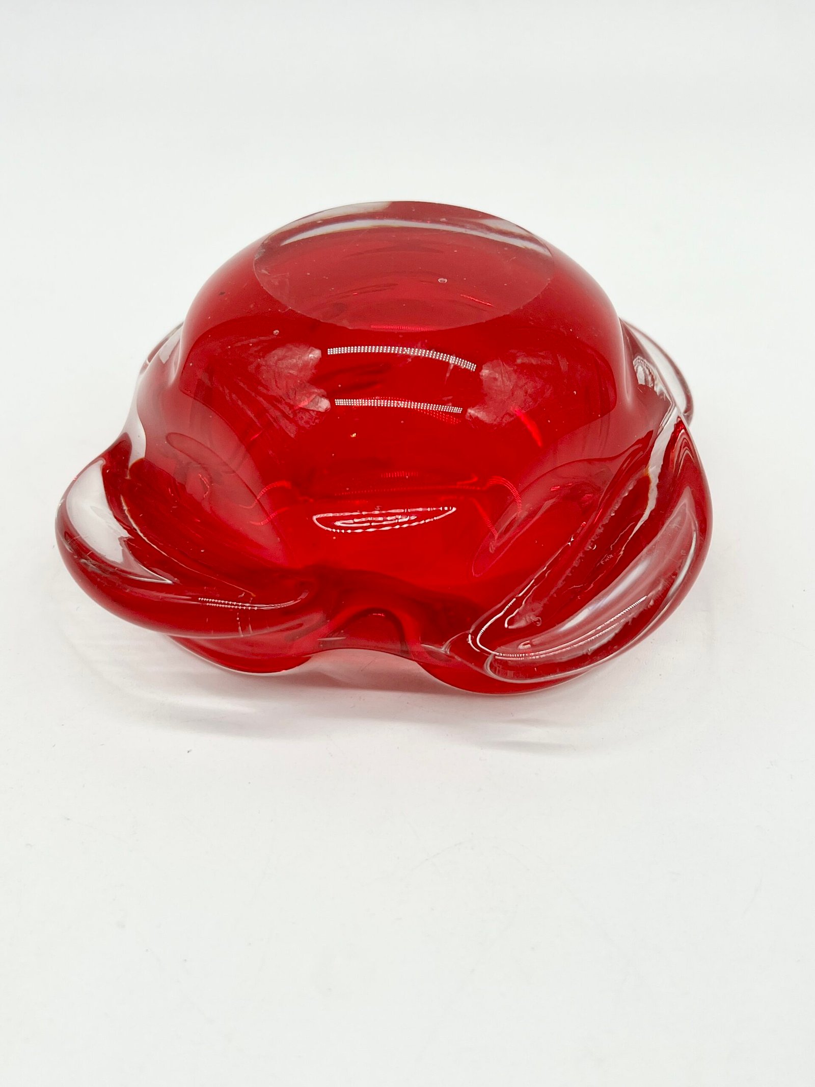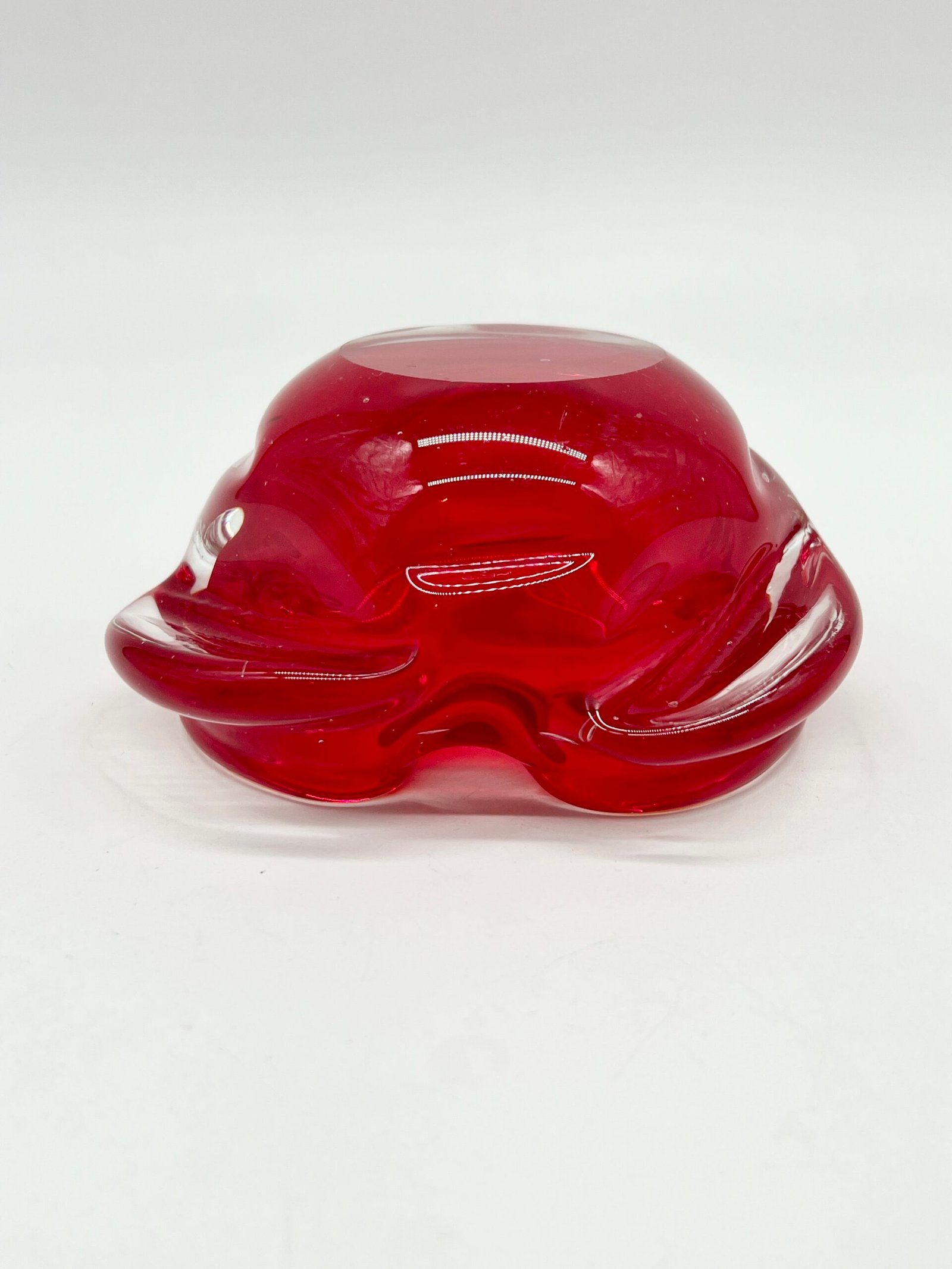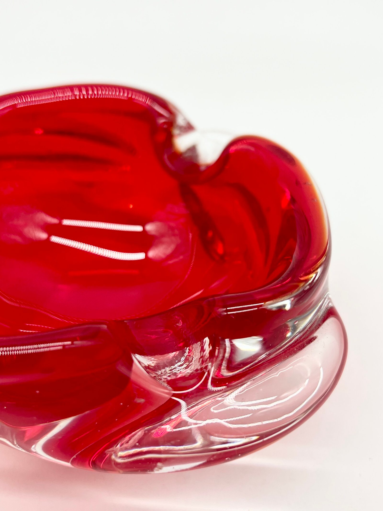 Cendrier en verre épais teinté rouge, au design organique et fluide. Sa forme libre, presque sculpturale, évoque le travail du verre soufflé avec des mouvements doux et irréguliers qui captent la lumière.