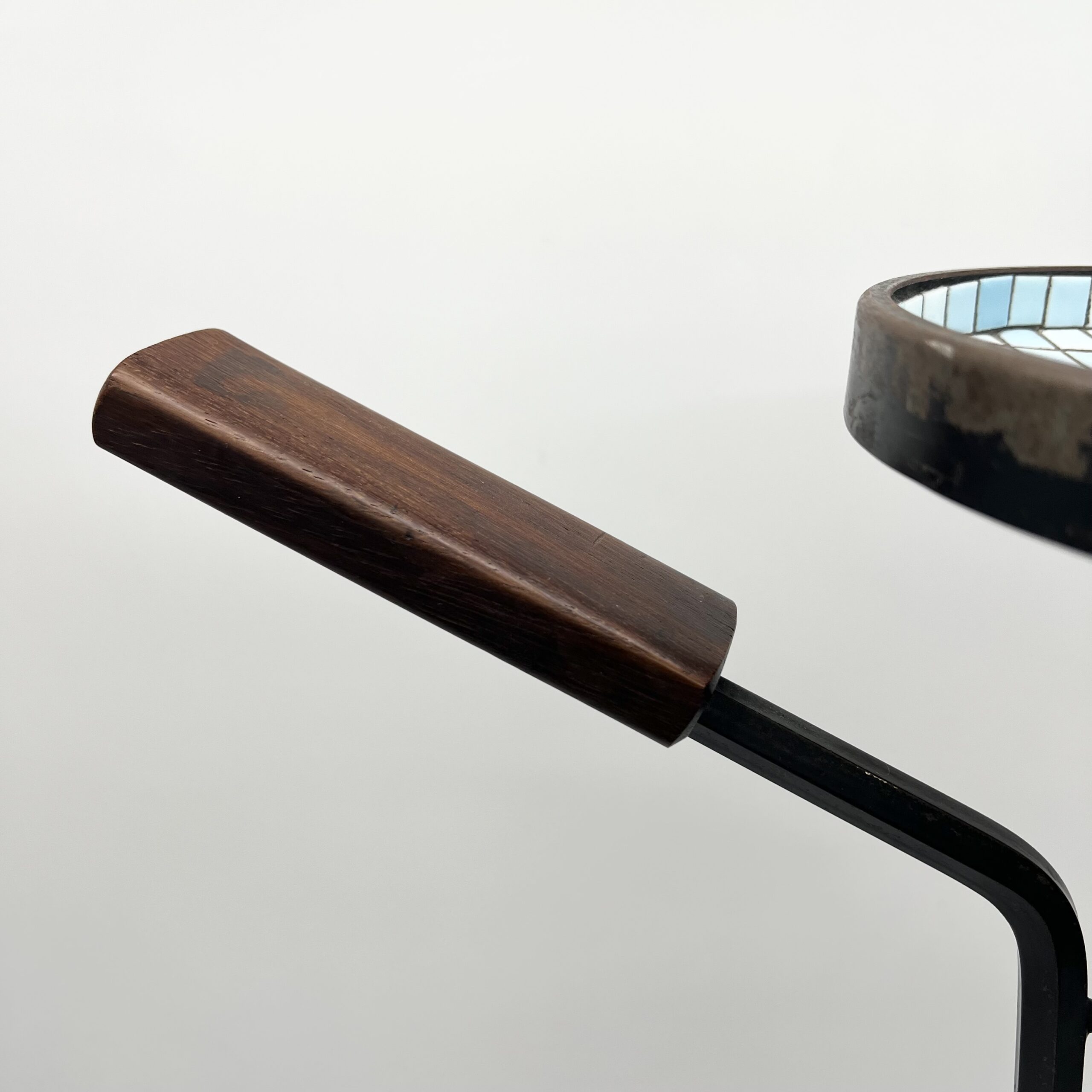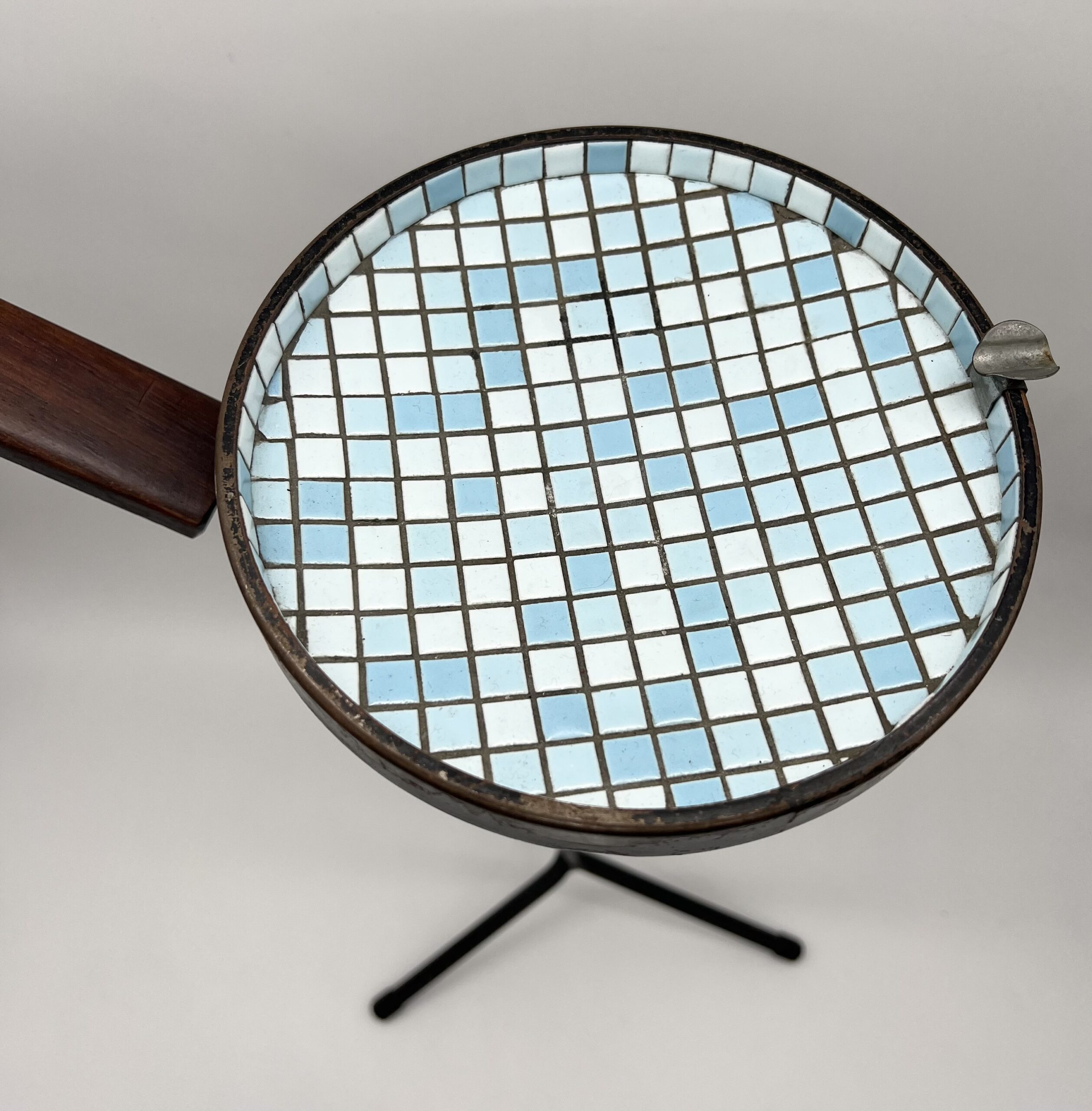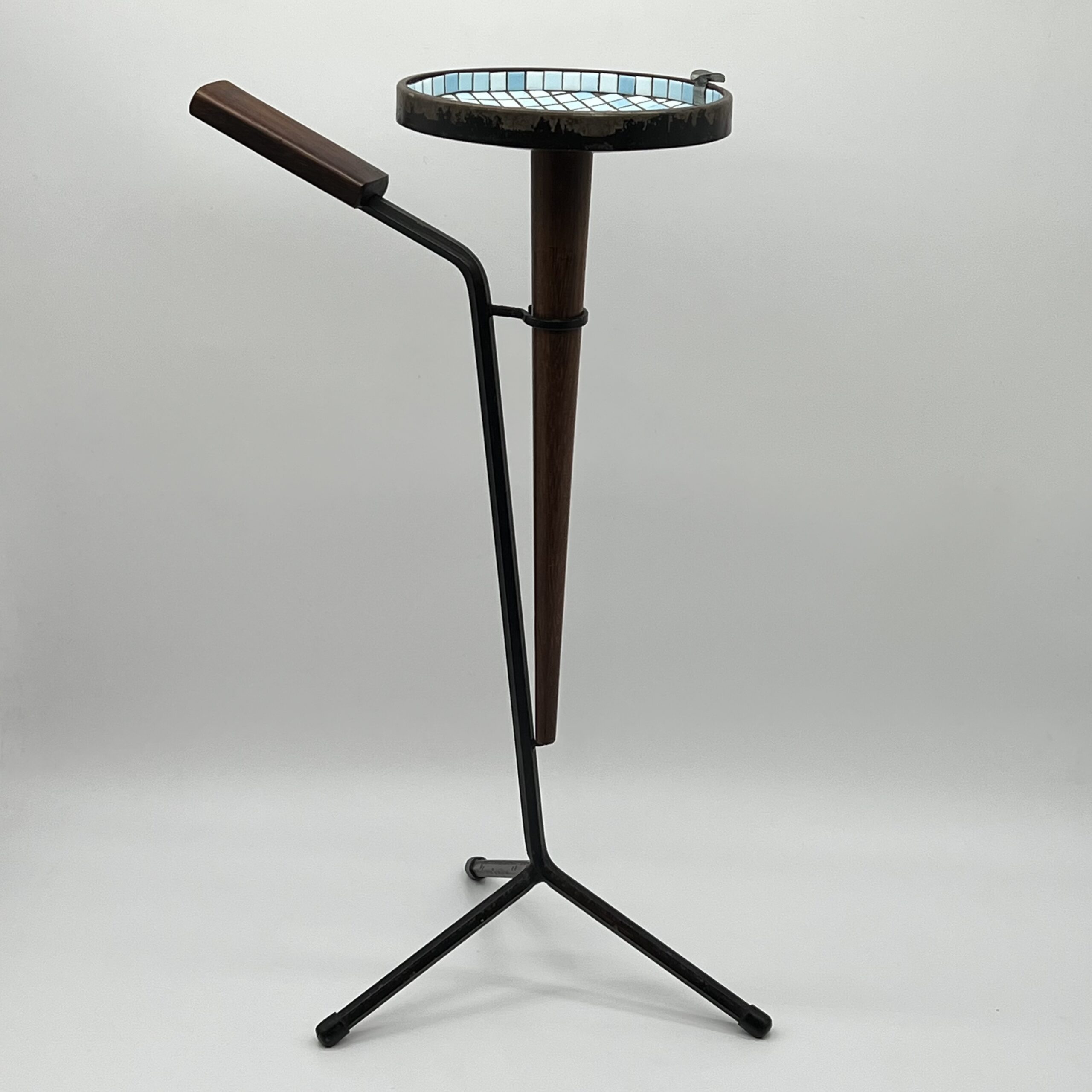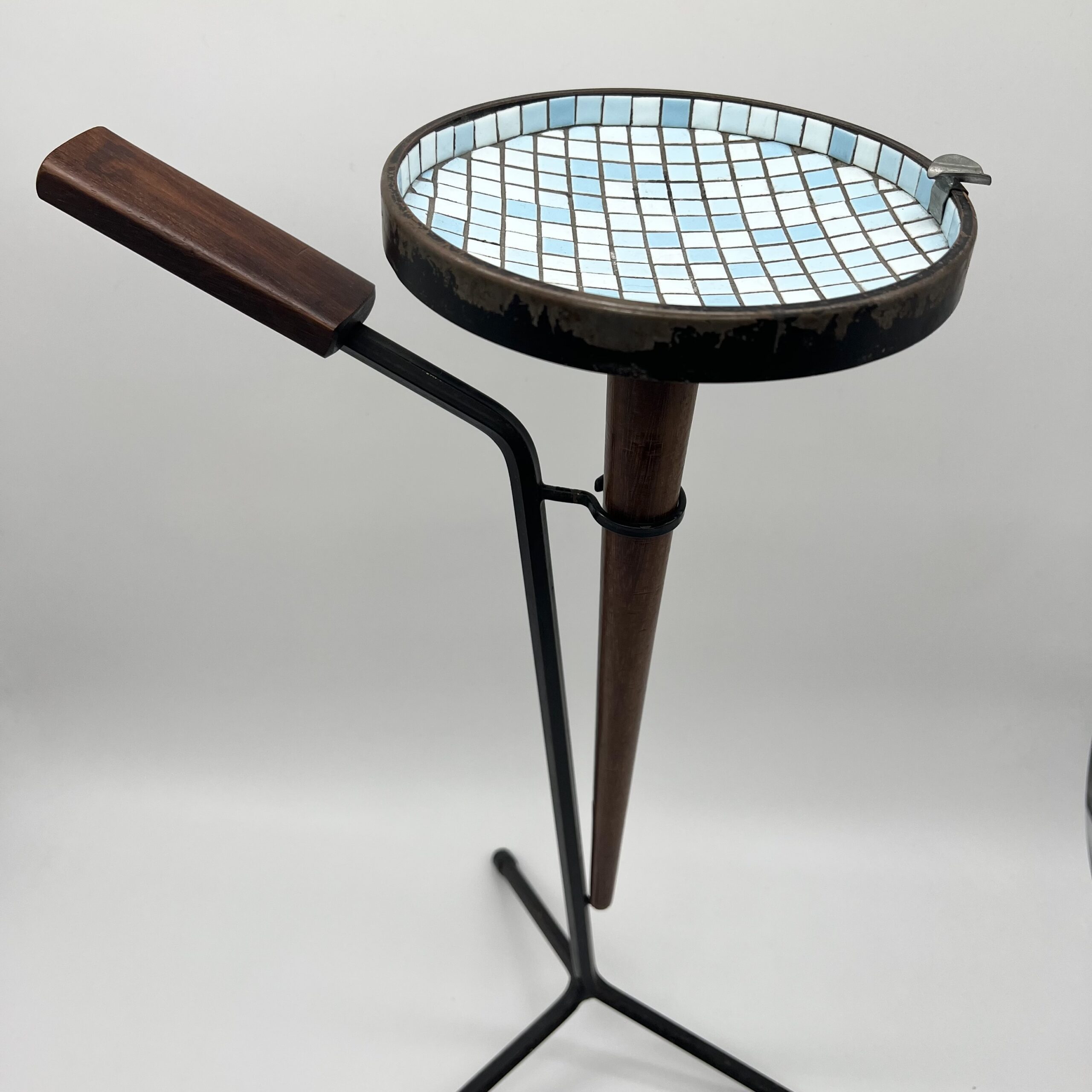 Cendrier sur pied des années 1950, combinant une structure en métal noir, un fût en bois tourné et un plateau circulaire orné d’une mosaïque géométrique bleu et blanc.