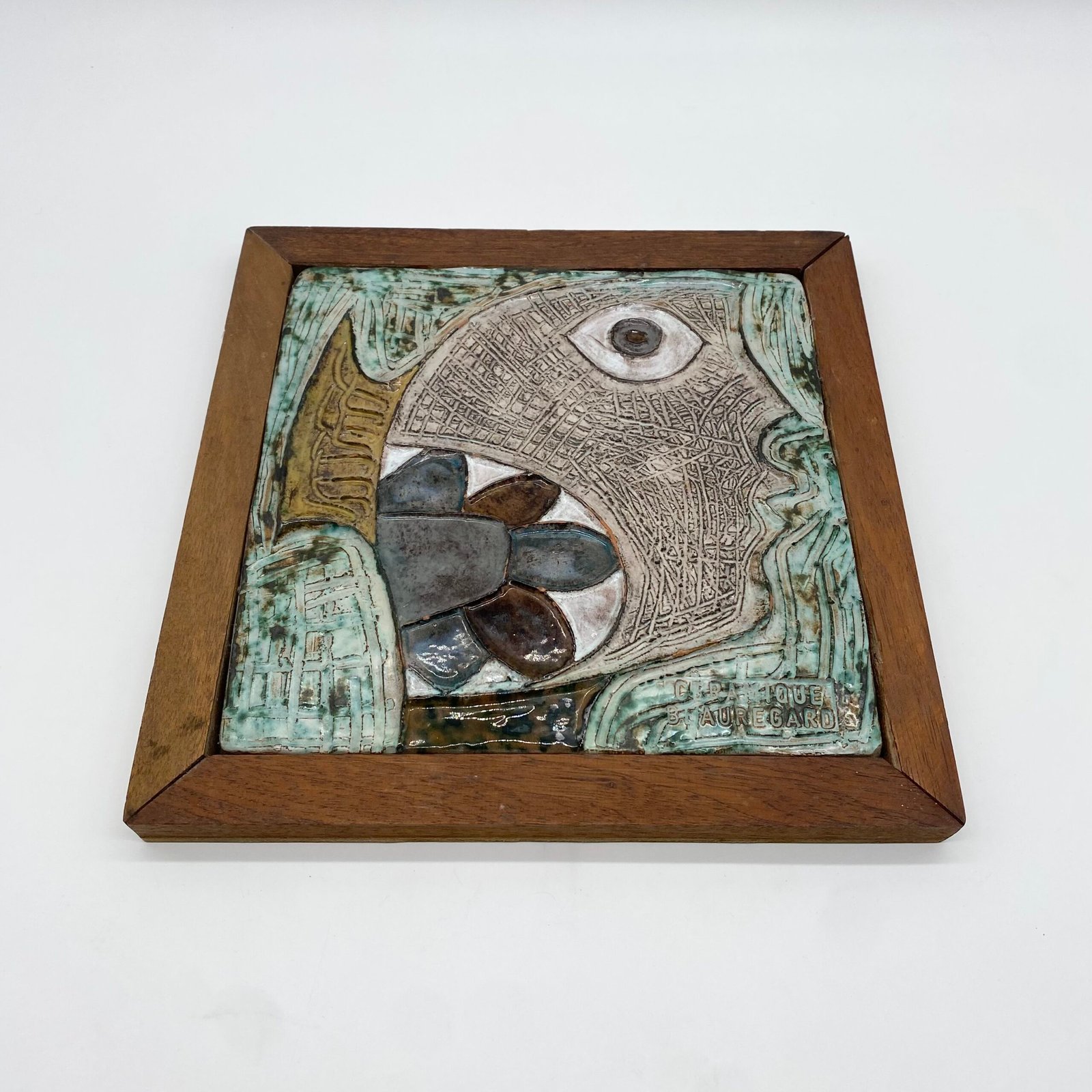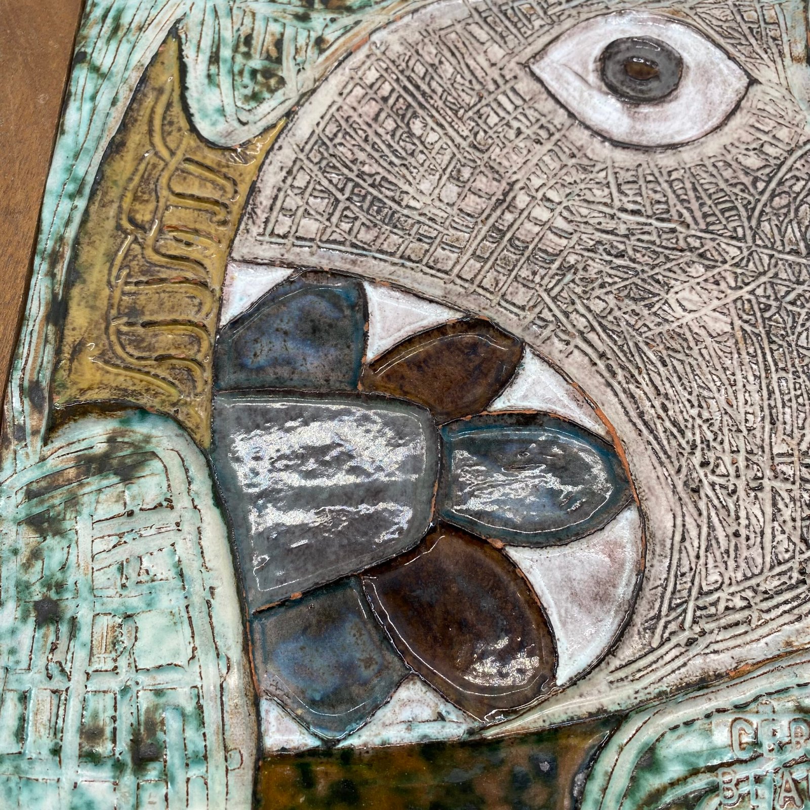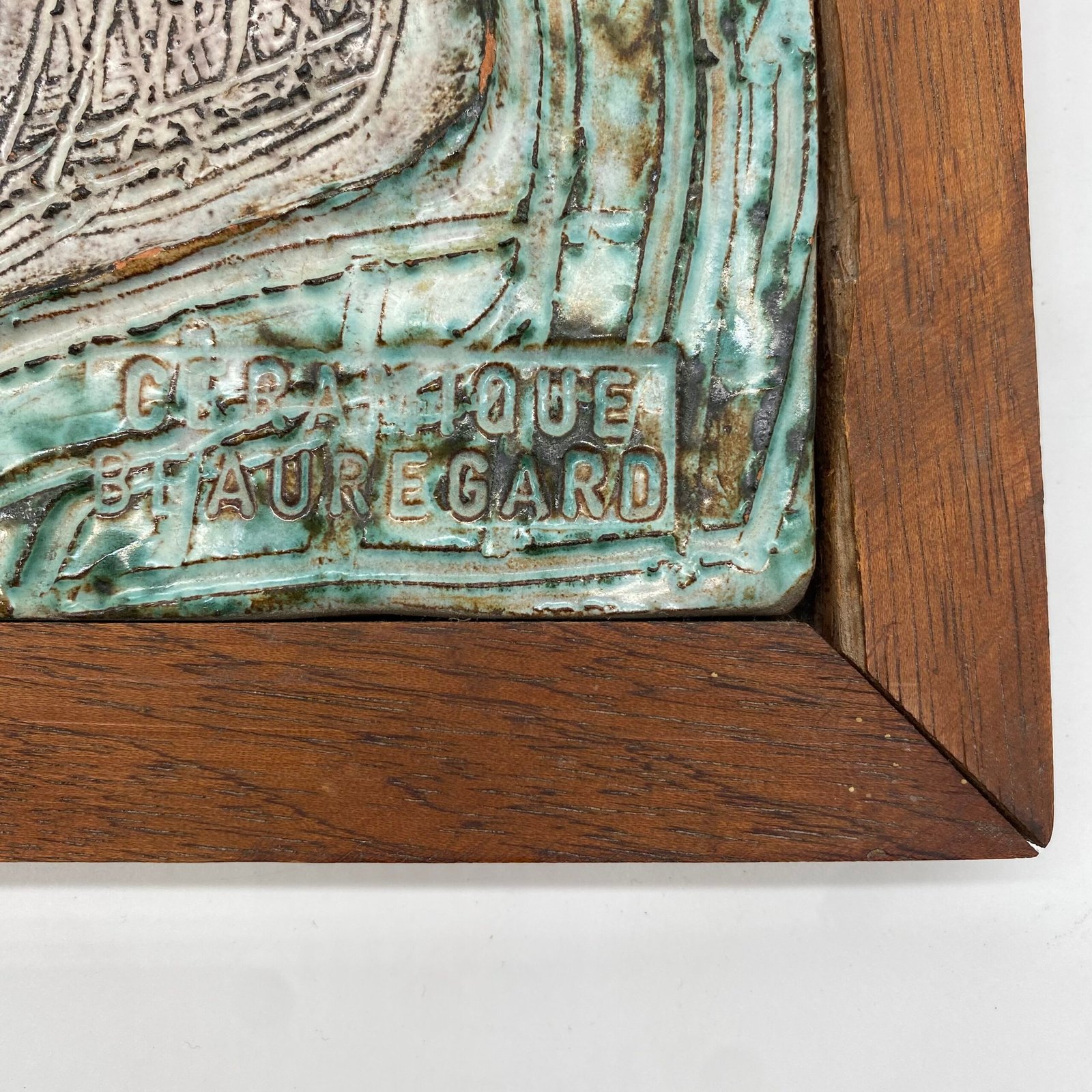 Plaque murale en céramique émaillée à décor abstrait anthropomorphe, typique du travail des ateliers Beauregard dans les années 1960.