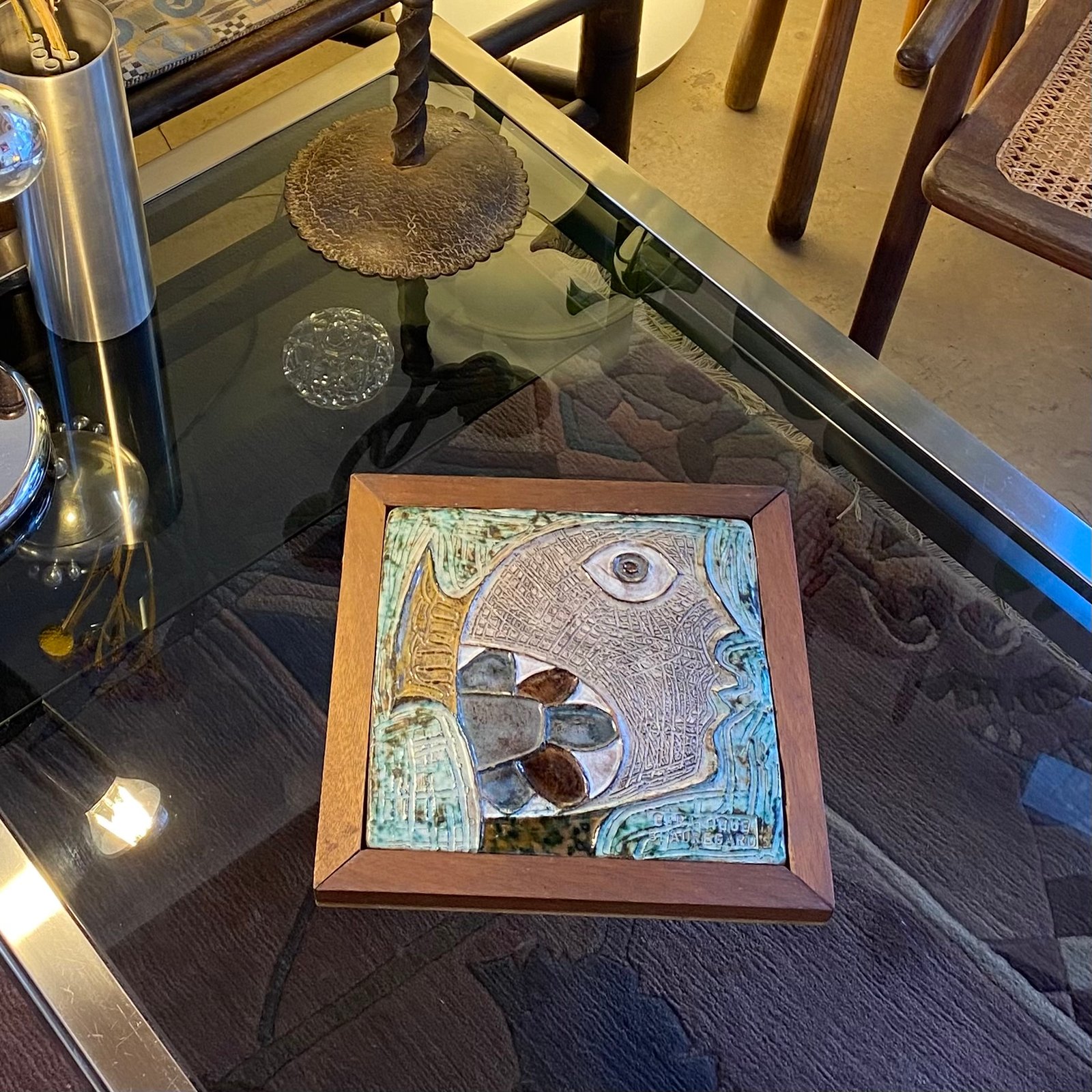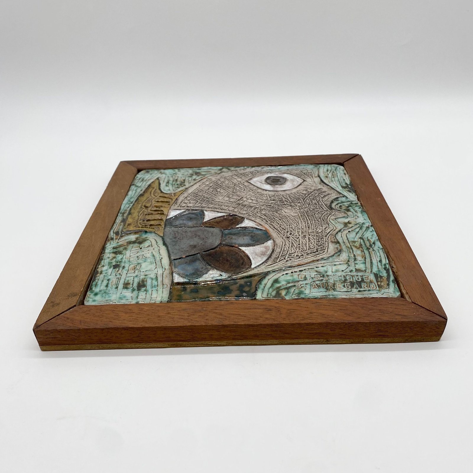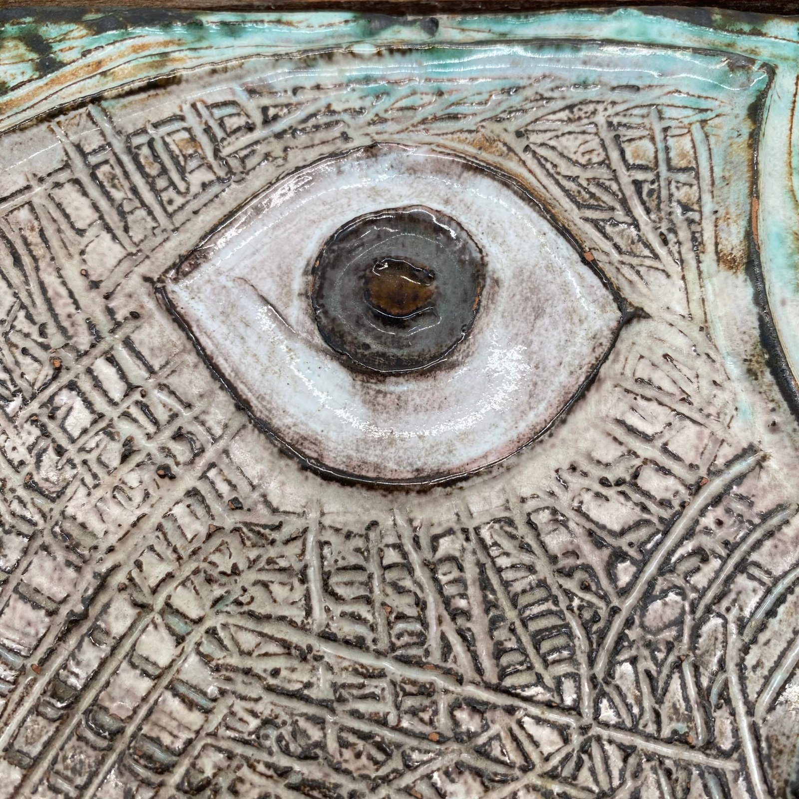 Plaque murale en céramique émaillée à décor abstrait anthropomorphe, typique du travail des ateliers Beauregard dans les années 1960.