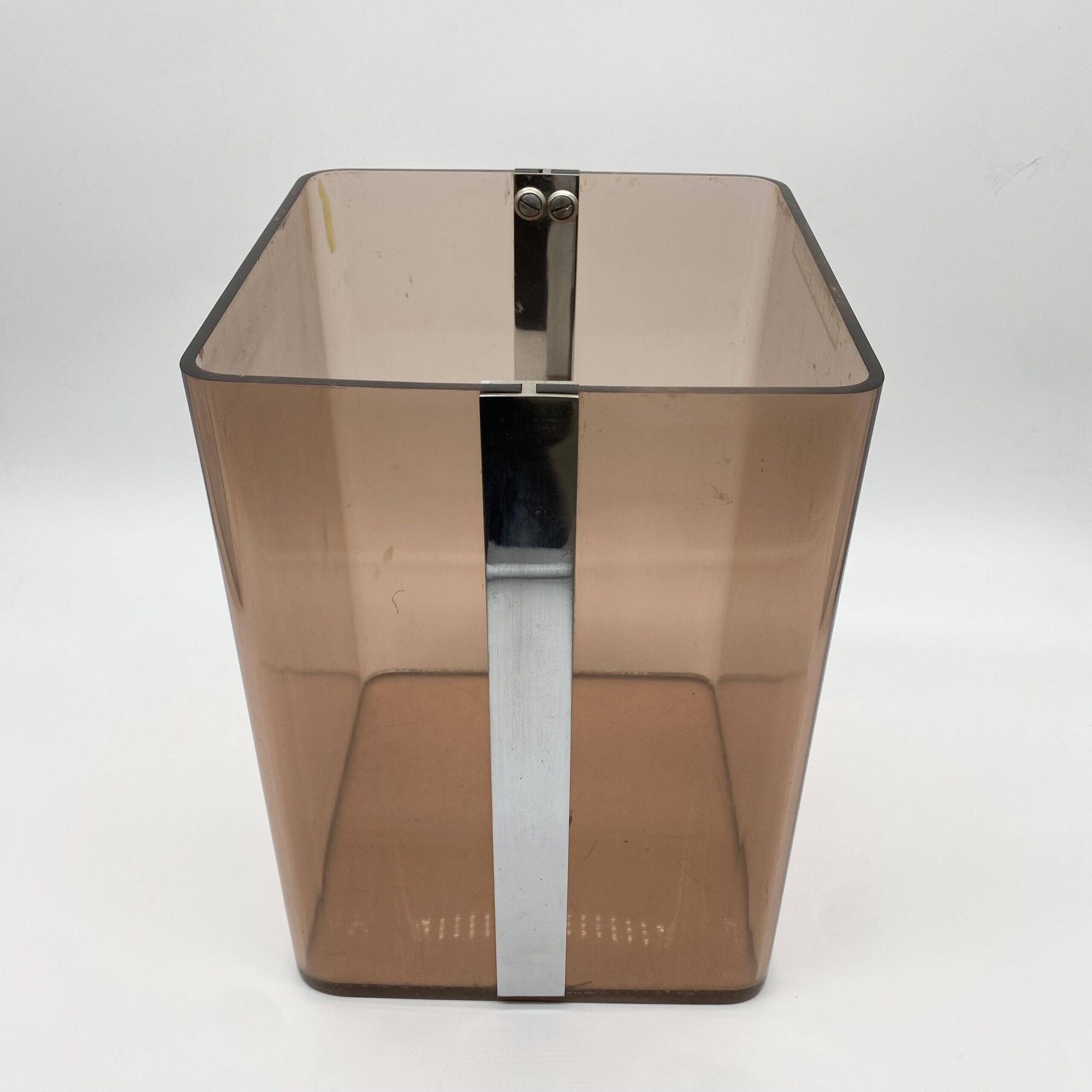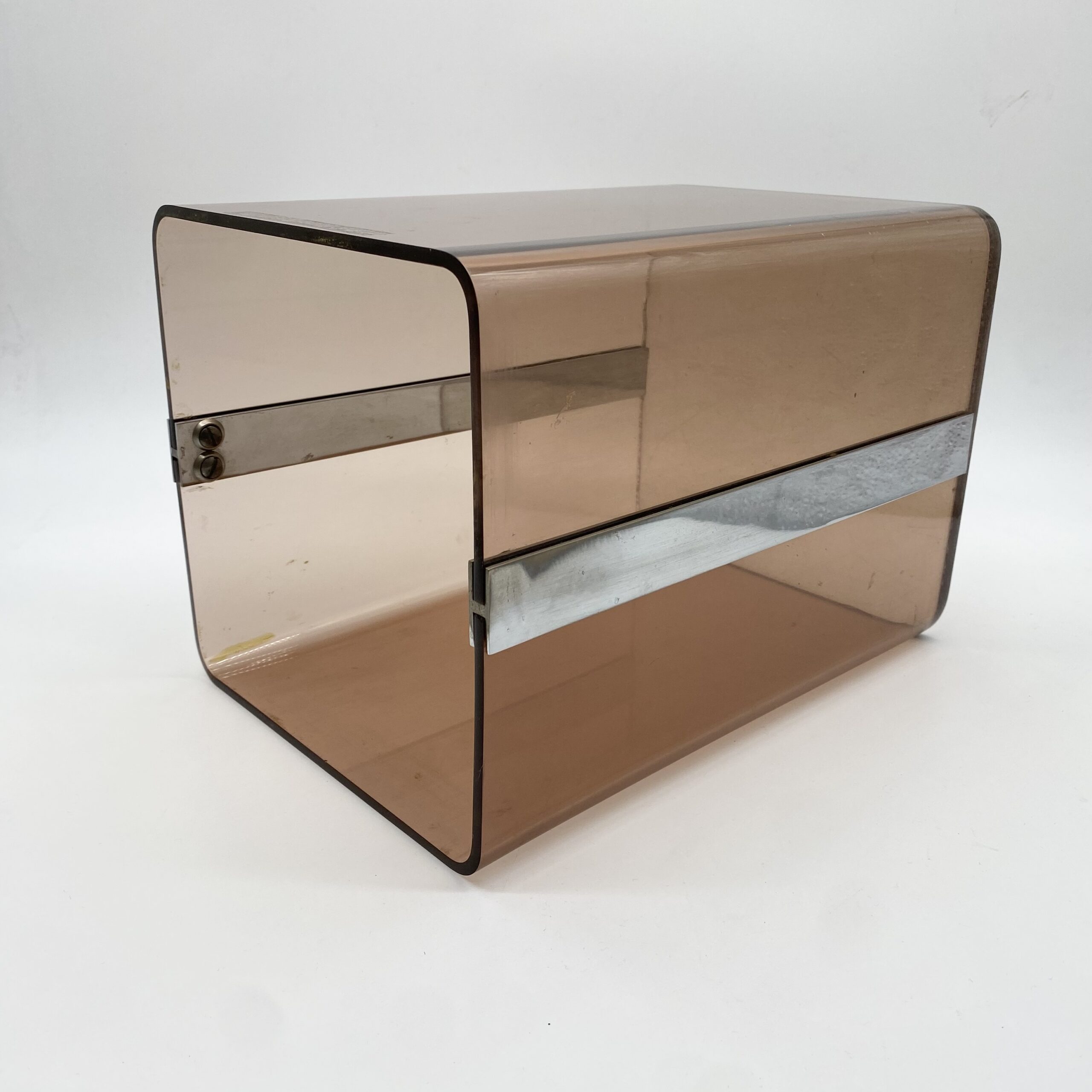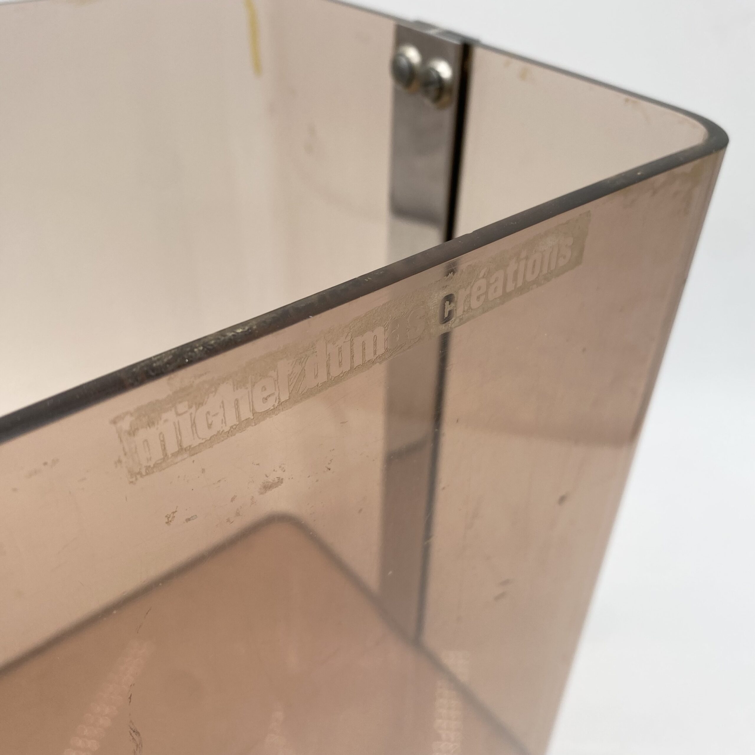 Structure en plexiglas fumé brun rehaussée d’un bandeau central en métal chromé, typique du design français de l’époque alliant transparence et lignes rigoureuses.