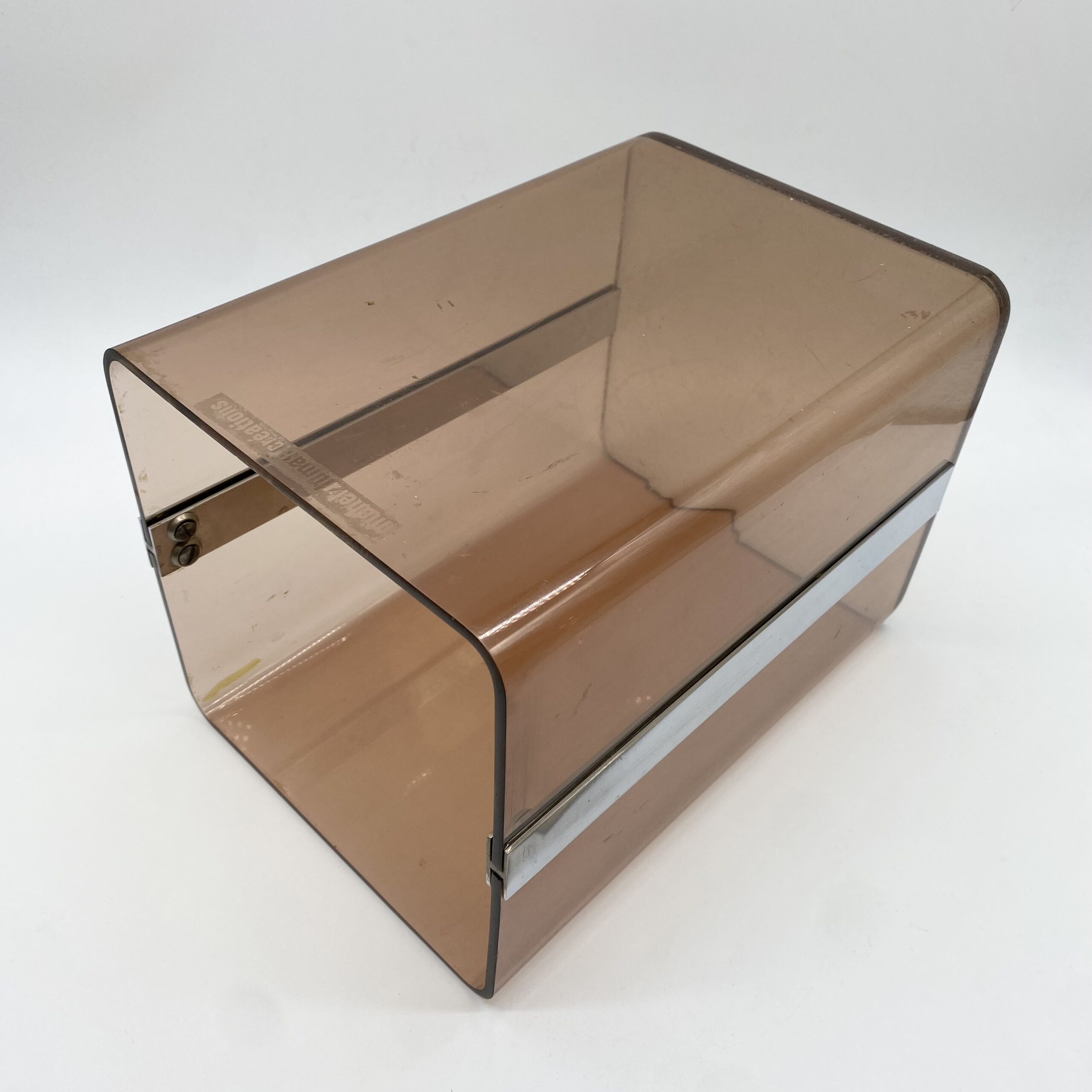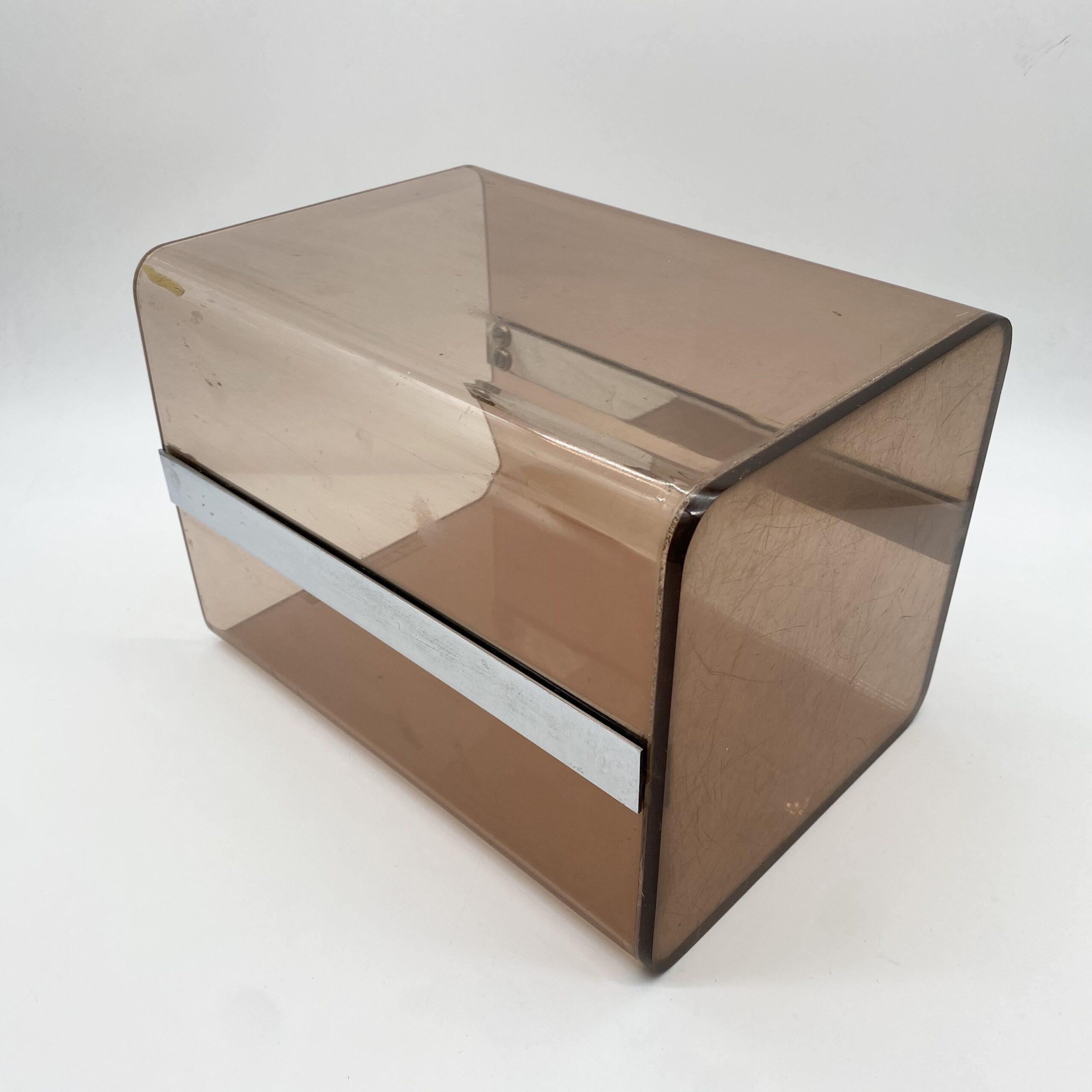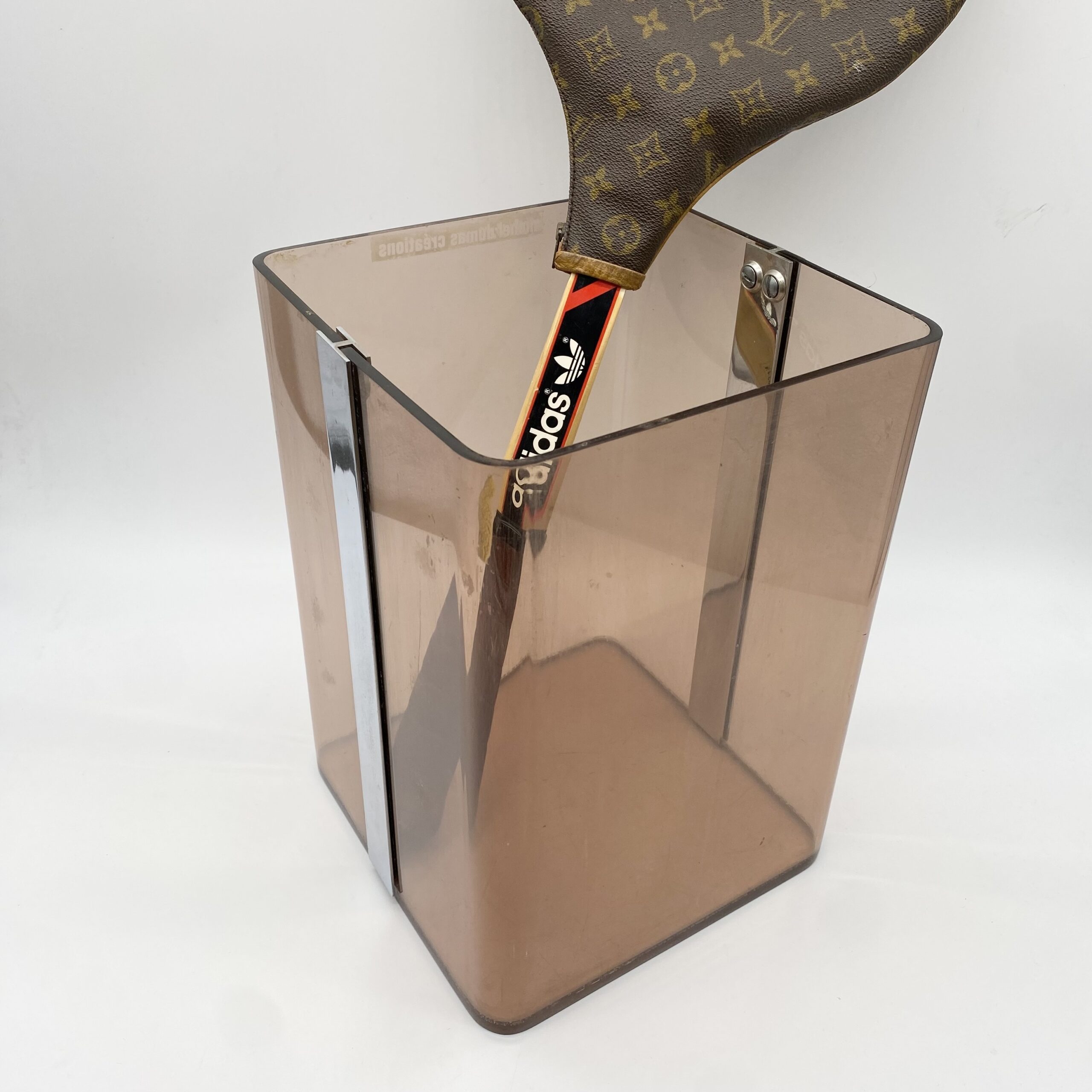 Structure en plexiglas fumé brun rehaussée d’un bandeau central en métal chromé, typique du design français de l’époque alliant transparence et lignes rigoureuses.