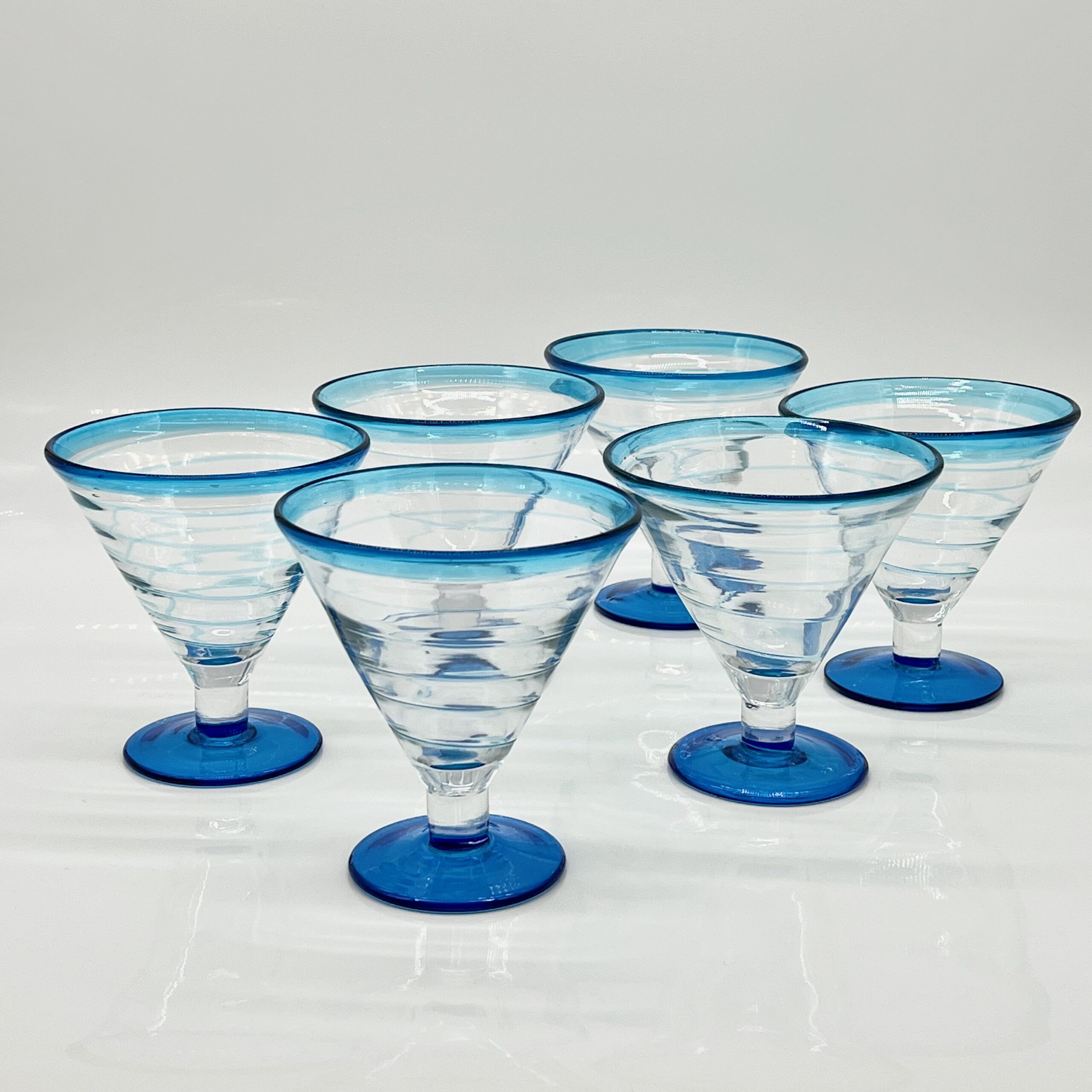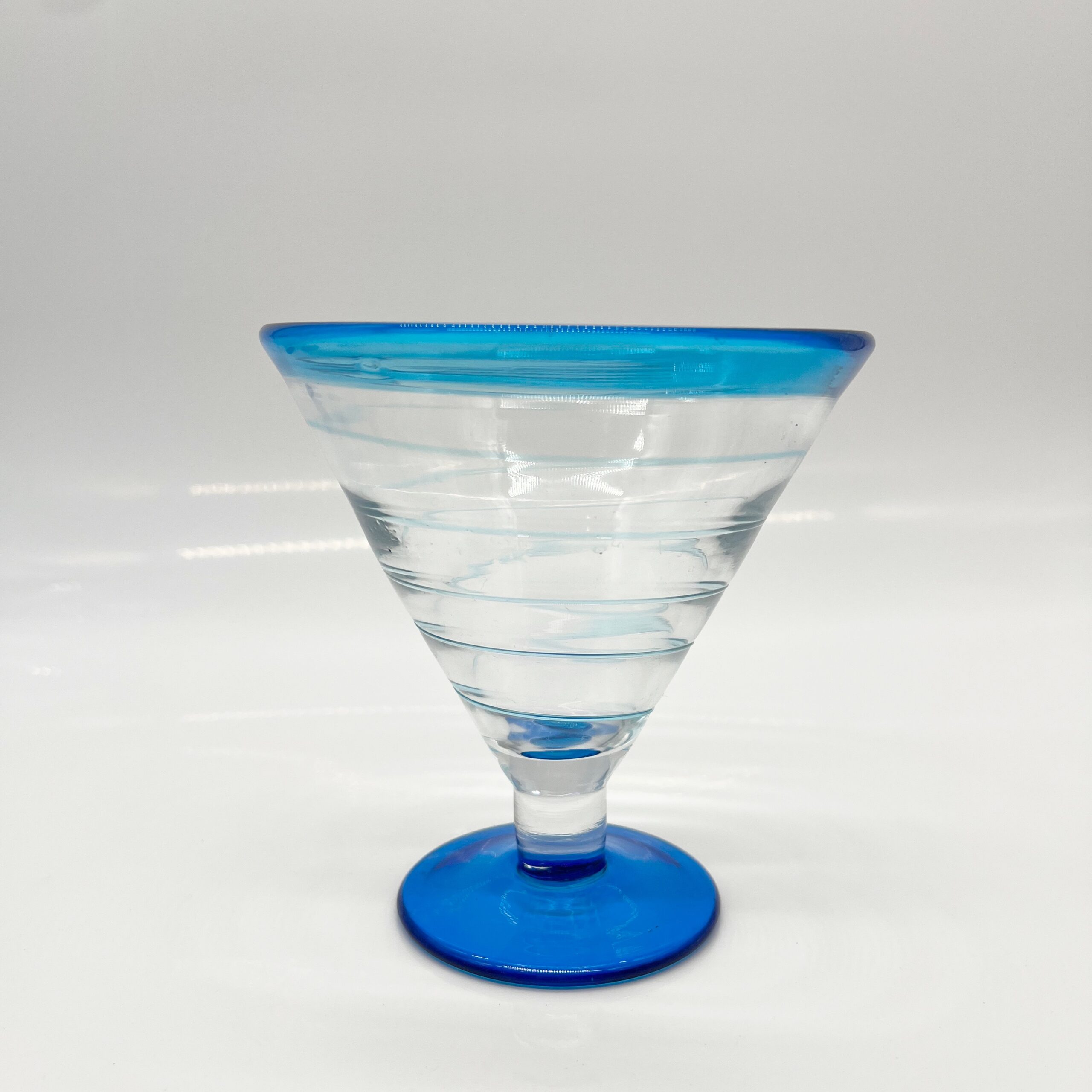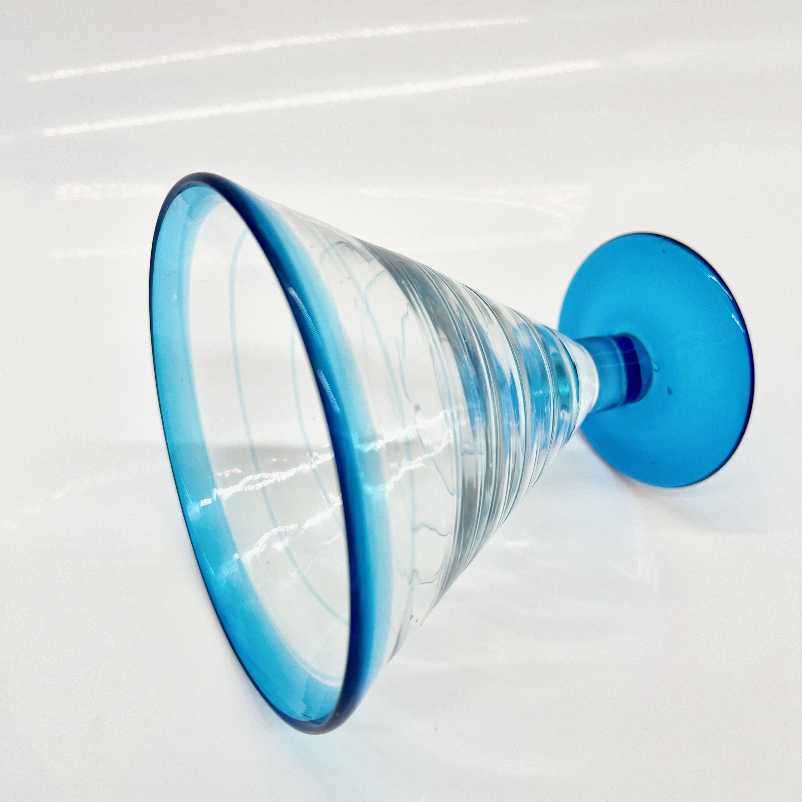 Ensemble de six coupes à glaces vintage en verre soufflé, ornées de délicats tourbillons internes qui créent un effet optique subtil et mettent en valeur la transparence du verre. Le liseré bleu vif et le pied assorti apportent une note graphique et colorée.