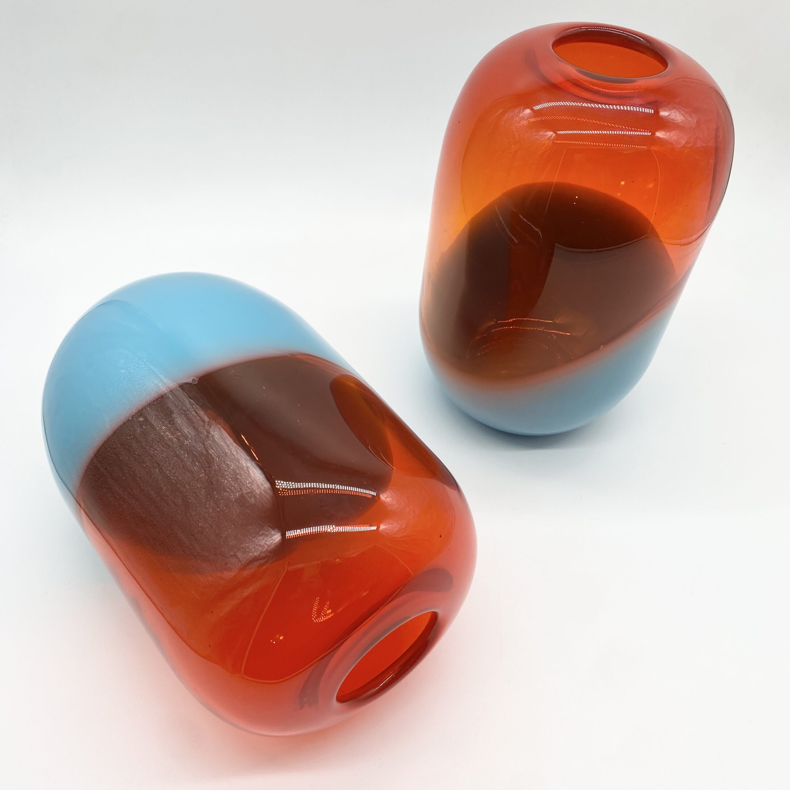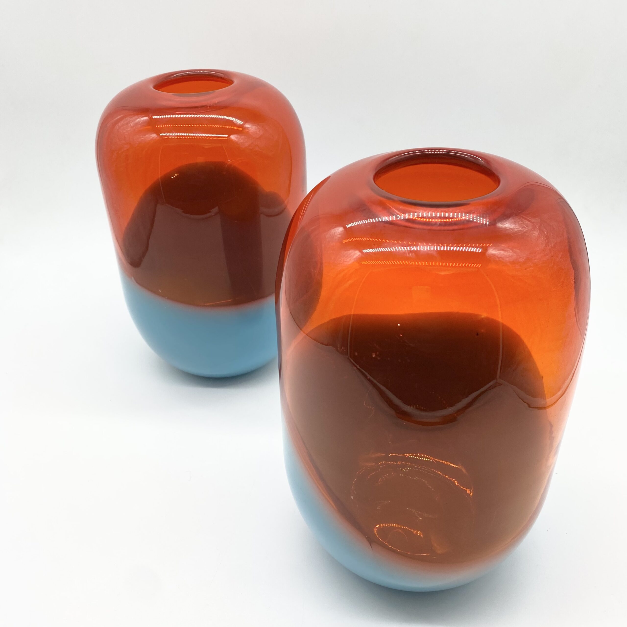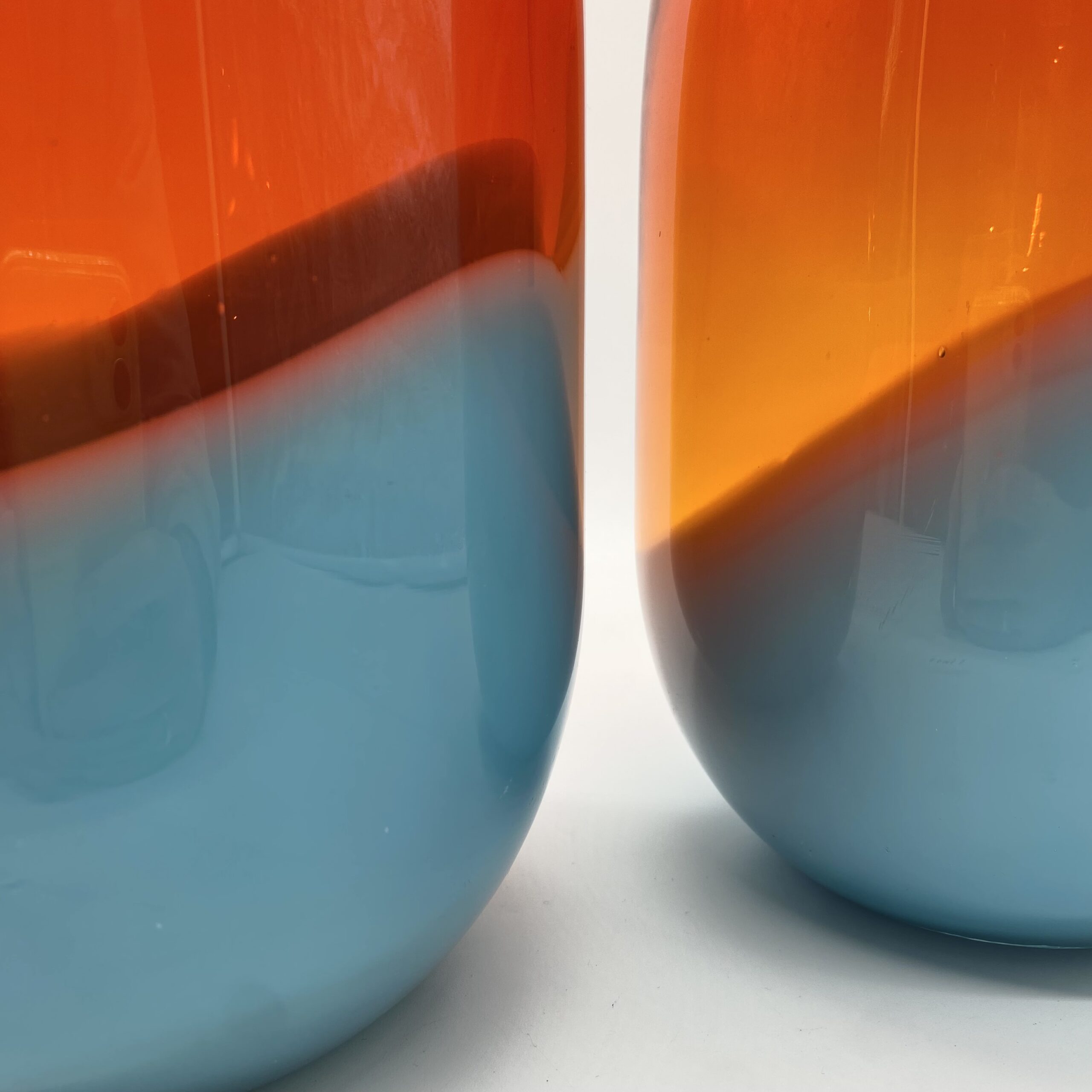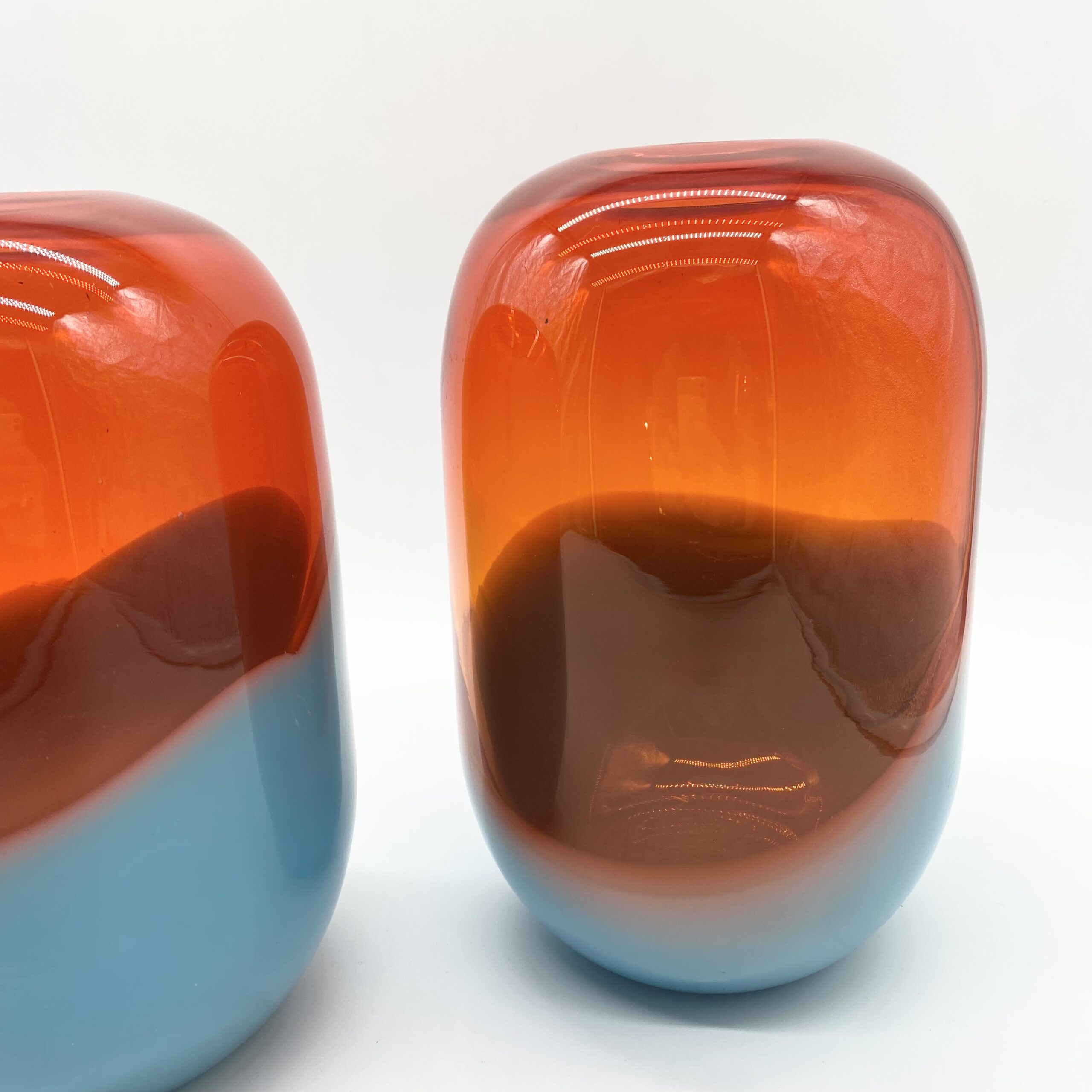 Leur esthétique joue sur une composition bicolore spectaculaire : une base en verre bleu lagon, surmontée d’un volume généreux en orange ambré translucide, où les deux teintes se rencontrent dans une ligne ondulée et organique.