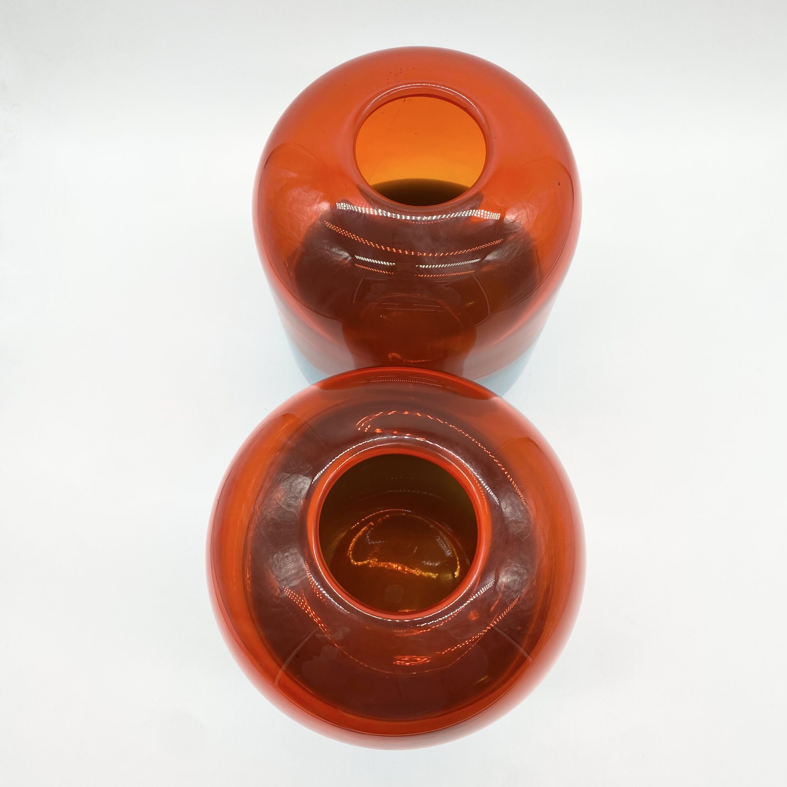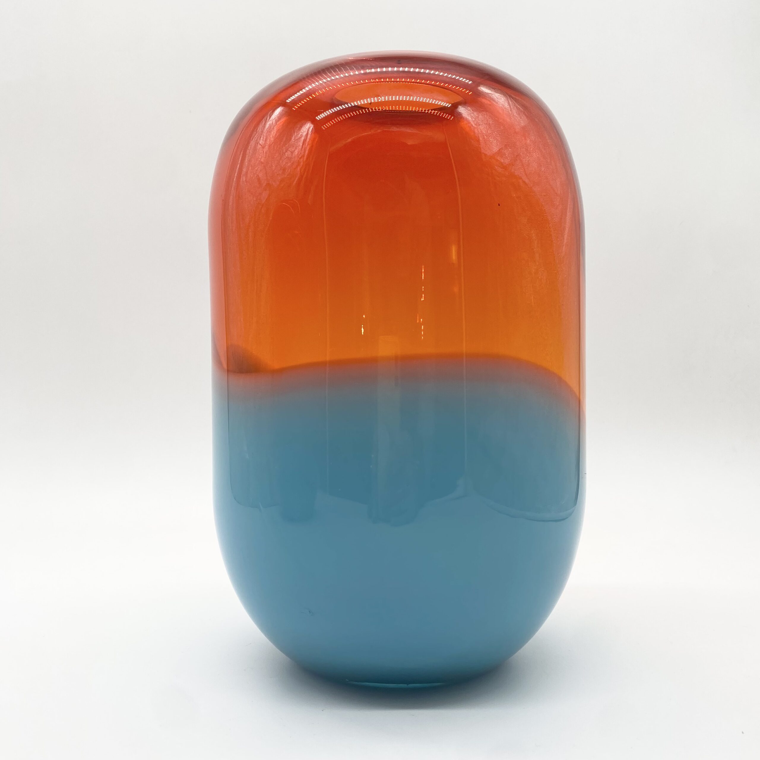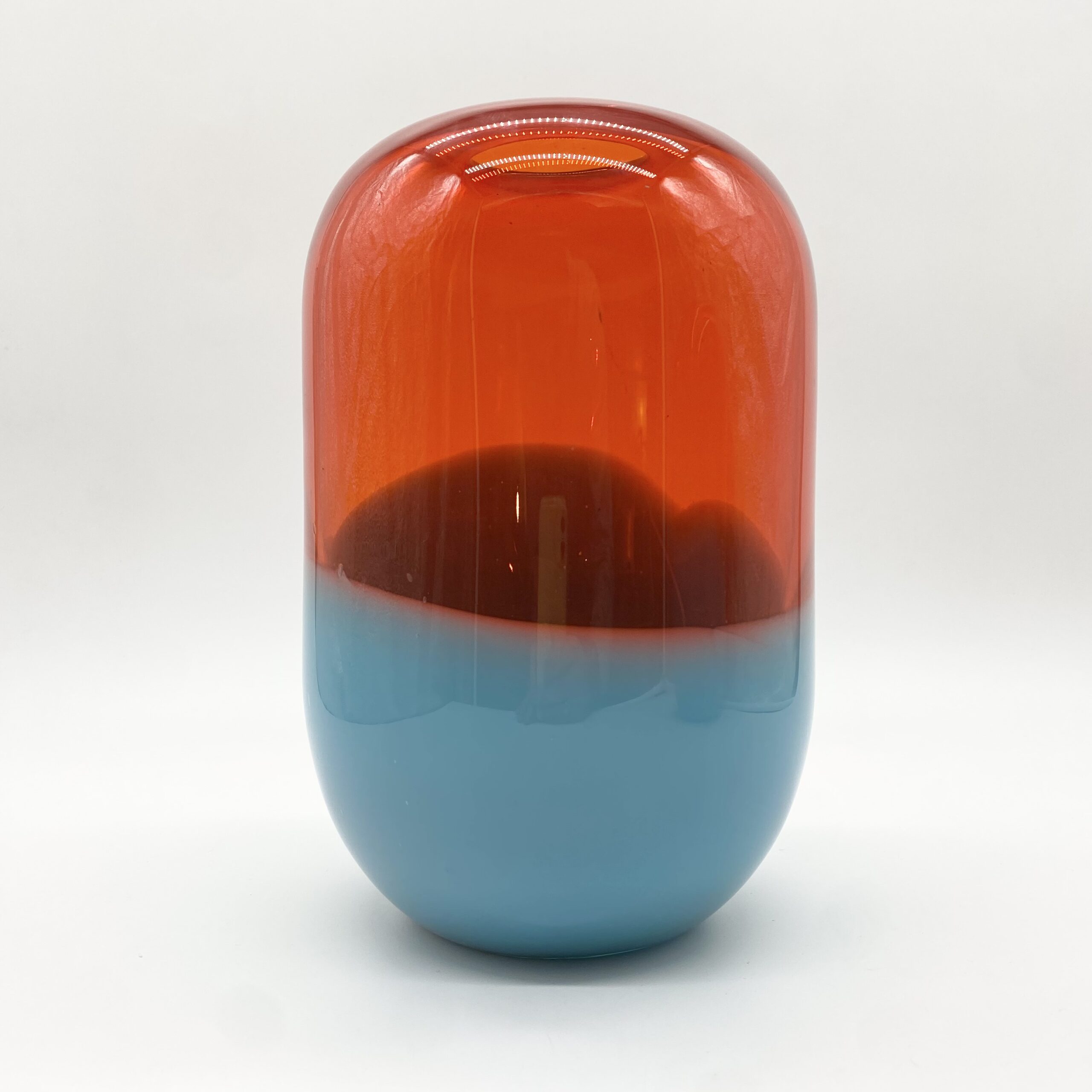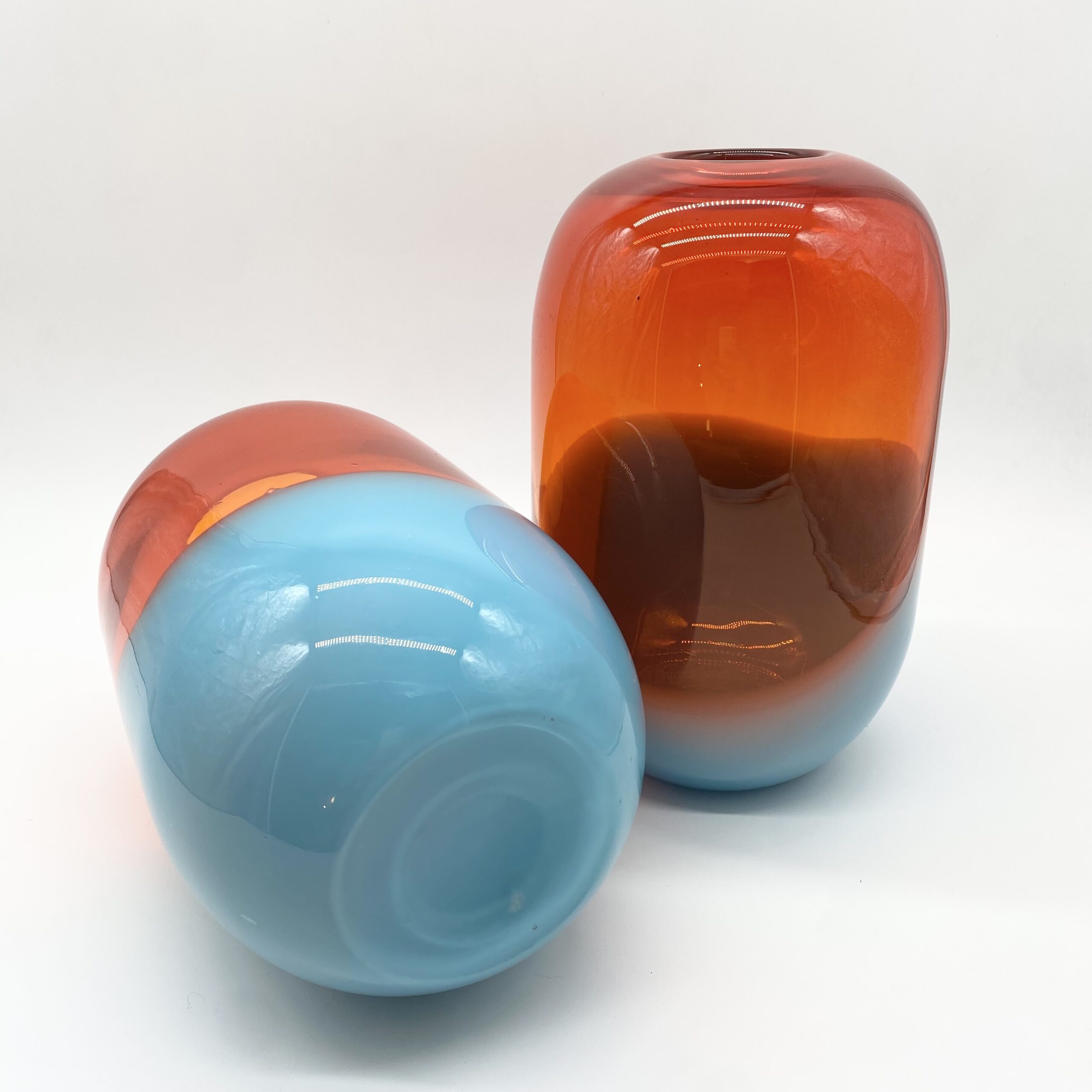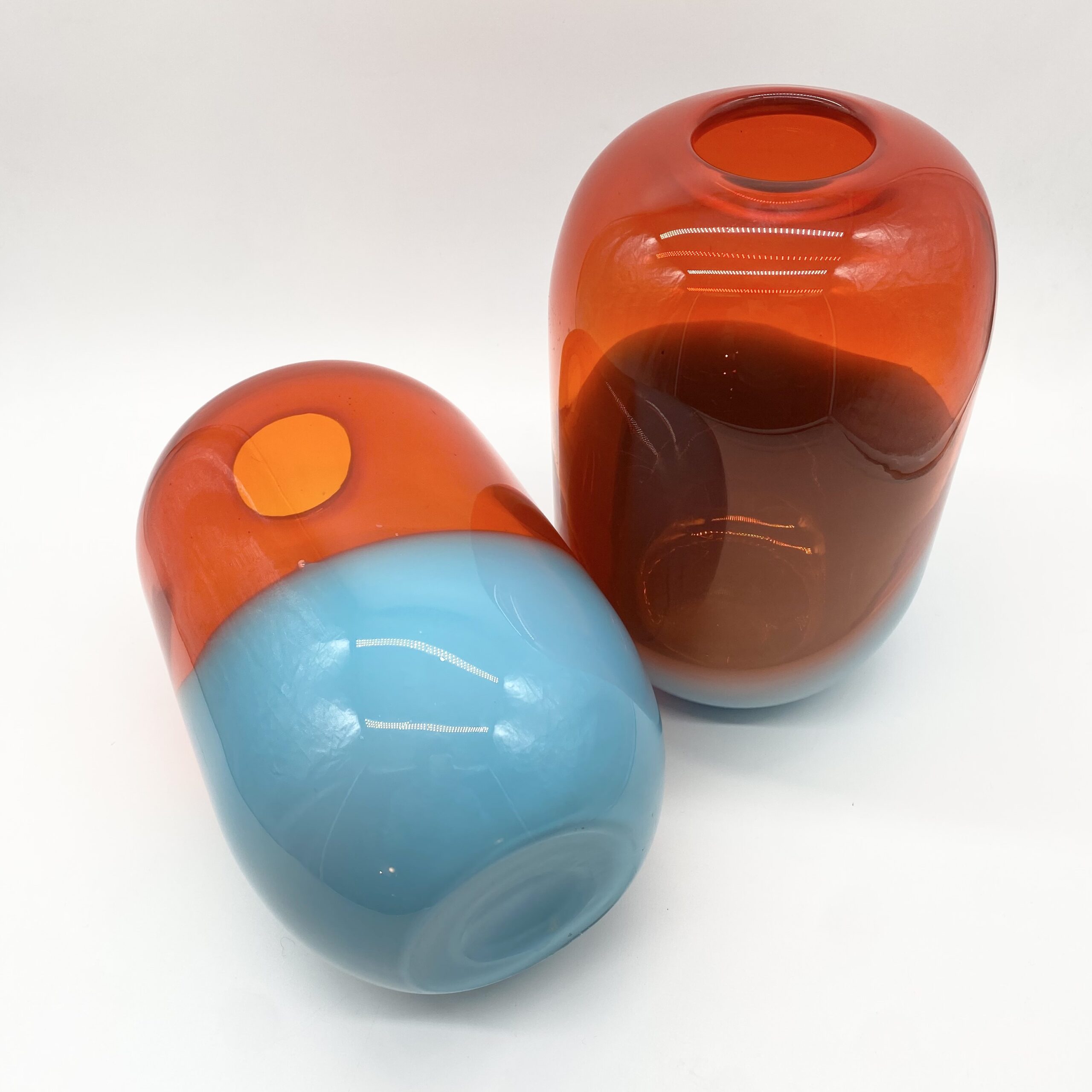Leur esthétique joue sur une composition bicolore spectaculaire : une base en verre bleu lagon, surmontée d’un volume généreux en orange ambré translucide, où les deux teintes se rencontrent dans une ligne ondulée et organique.