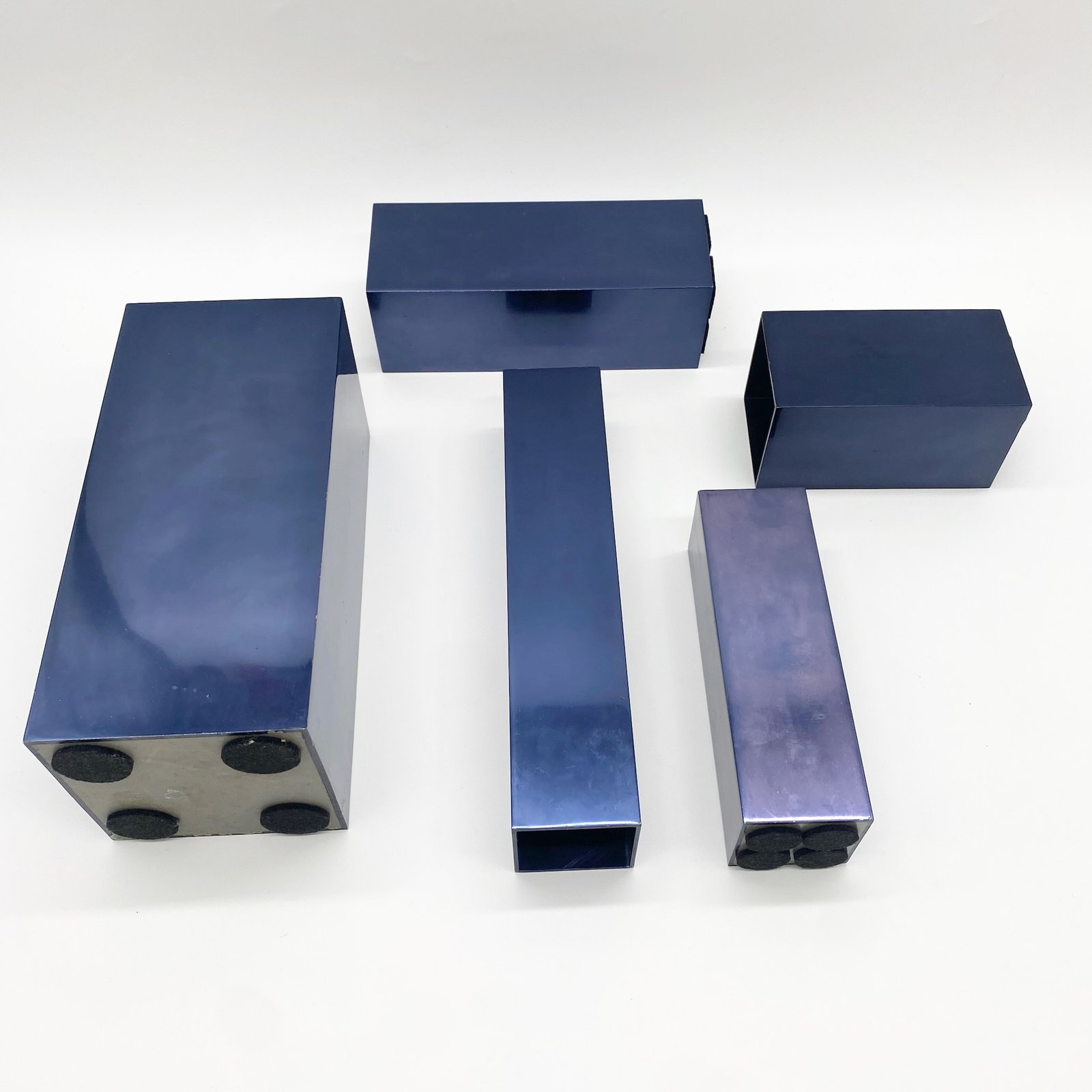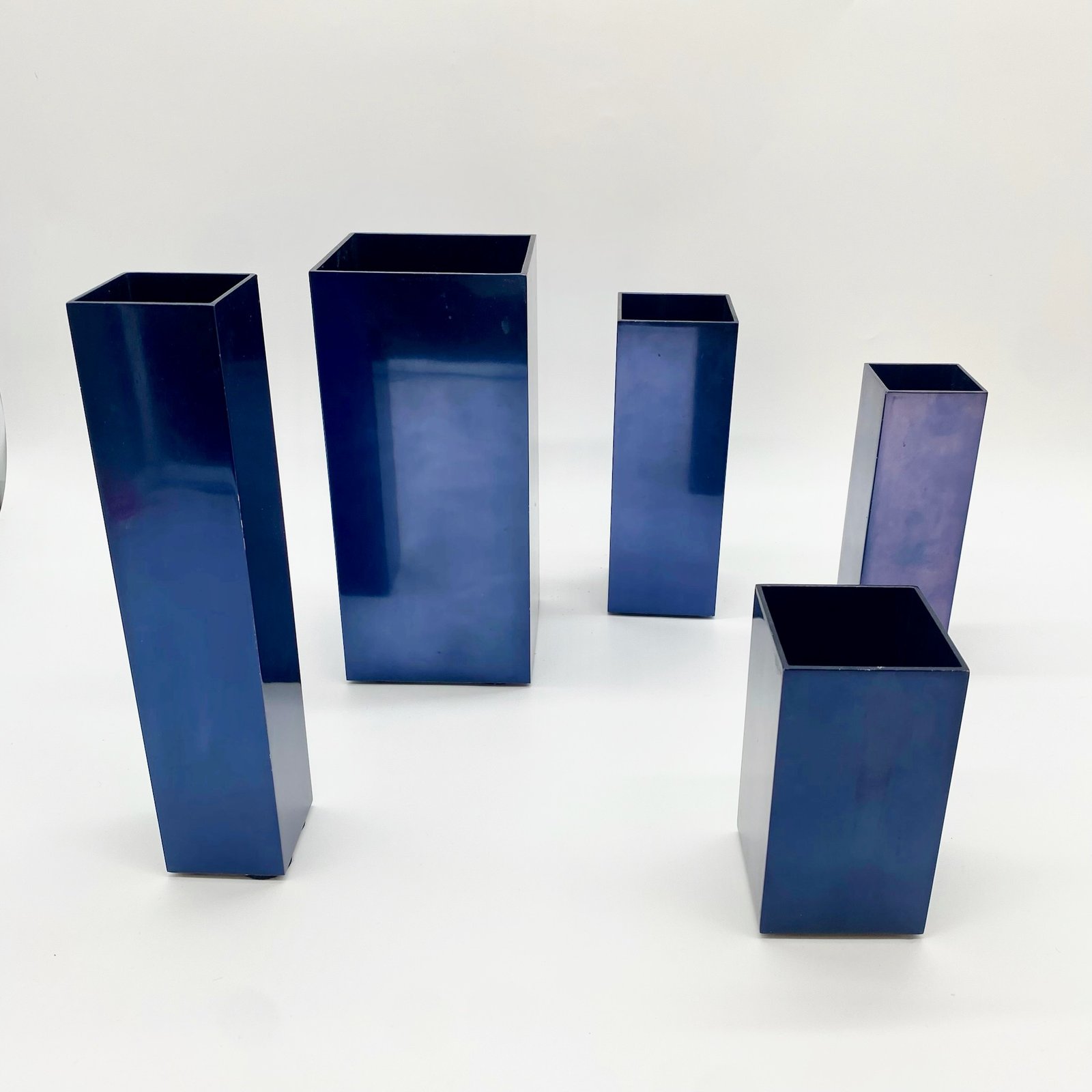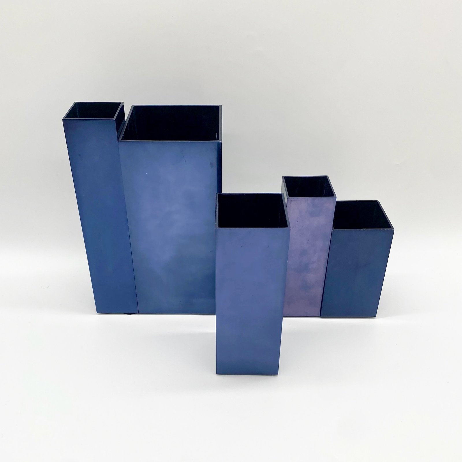 Ensemble de cinq vases modulaires en métal, finition bleu pétrole brillant.