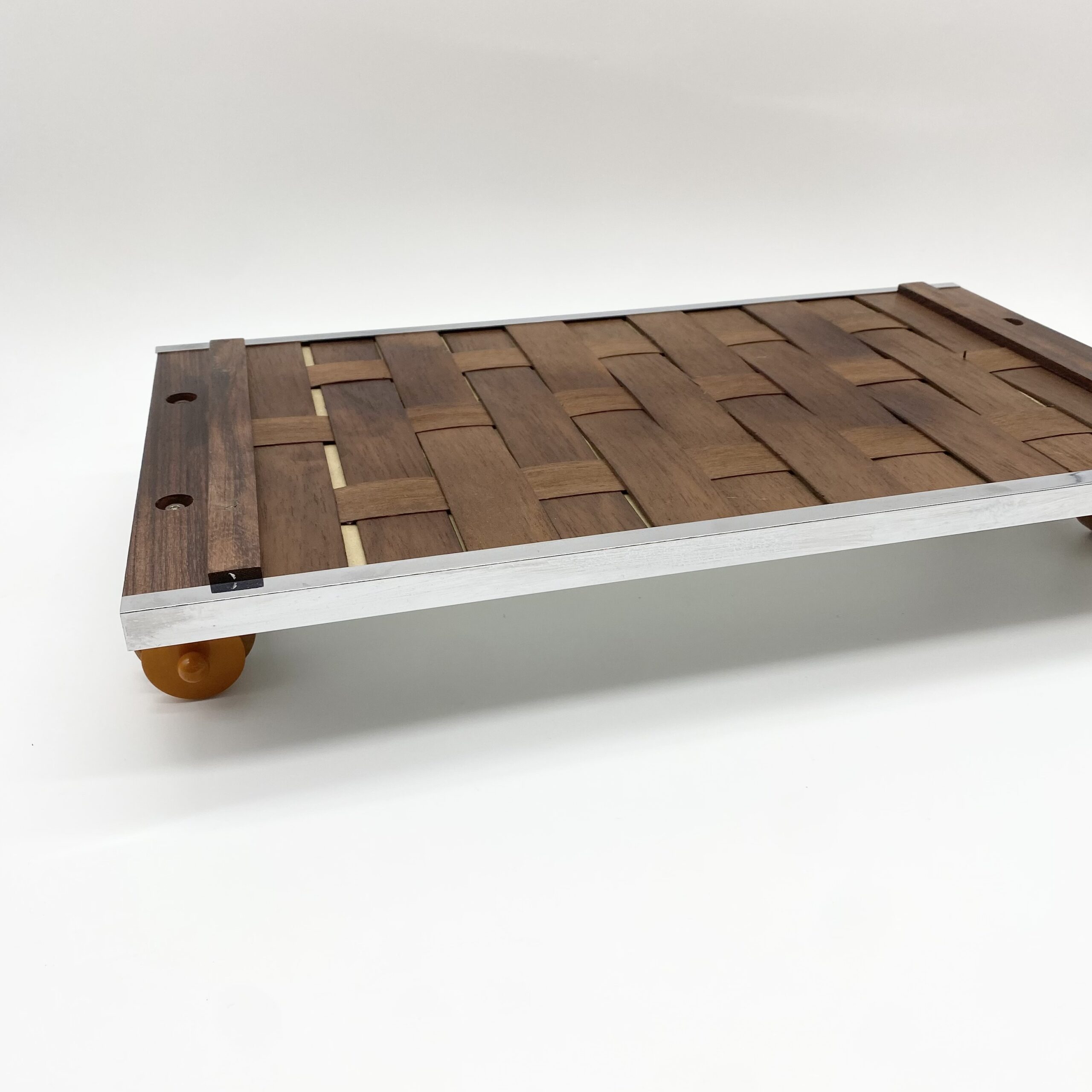 Le dos du plateau révèle un tressage en bois, à la fois décoratif et fonctionnel, qui souligne son travail minutieux et sa fabrication soignée.