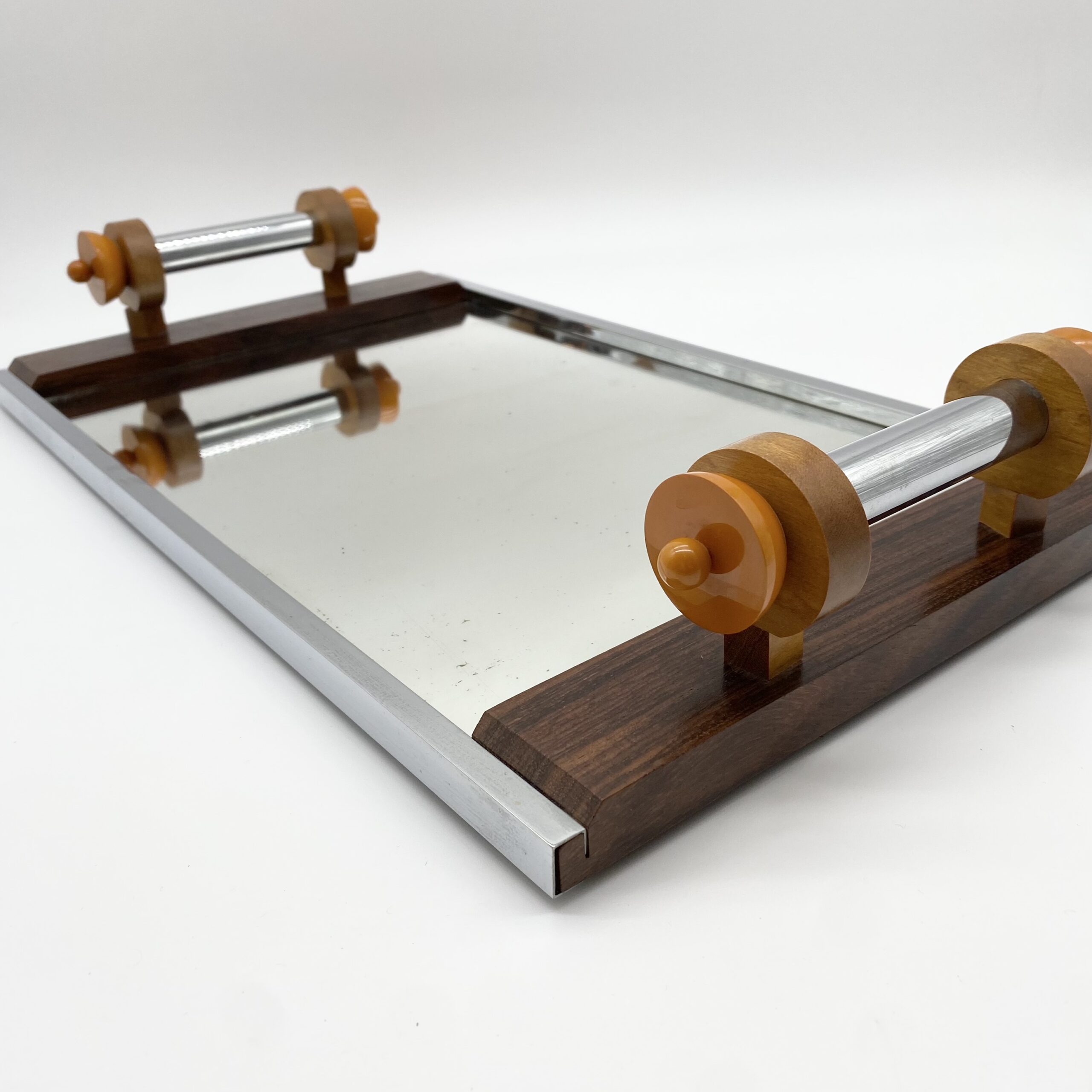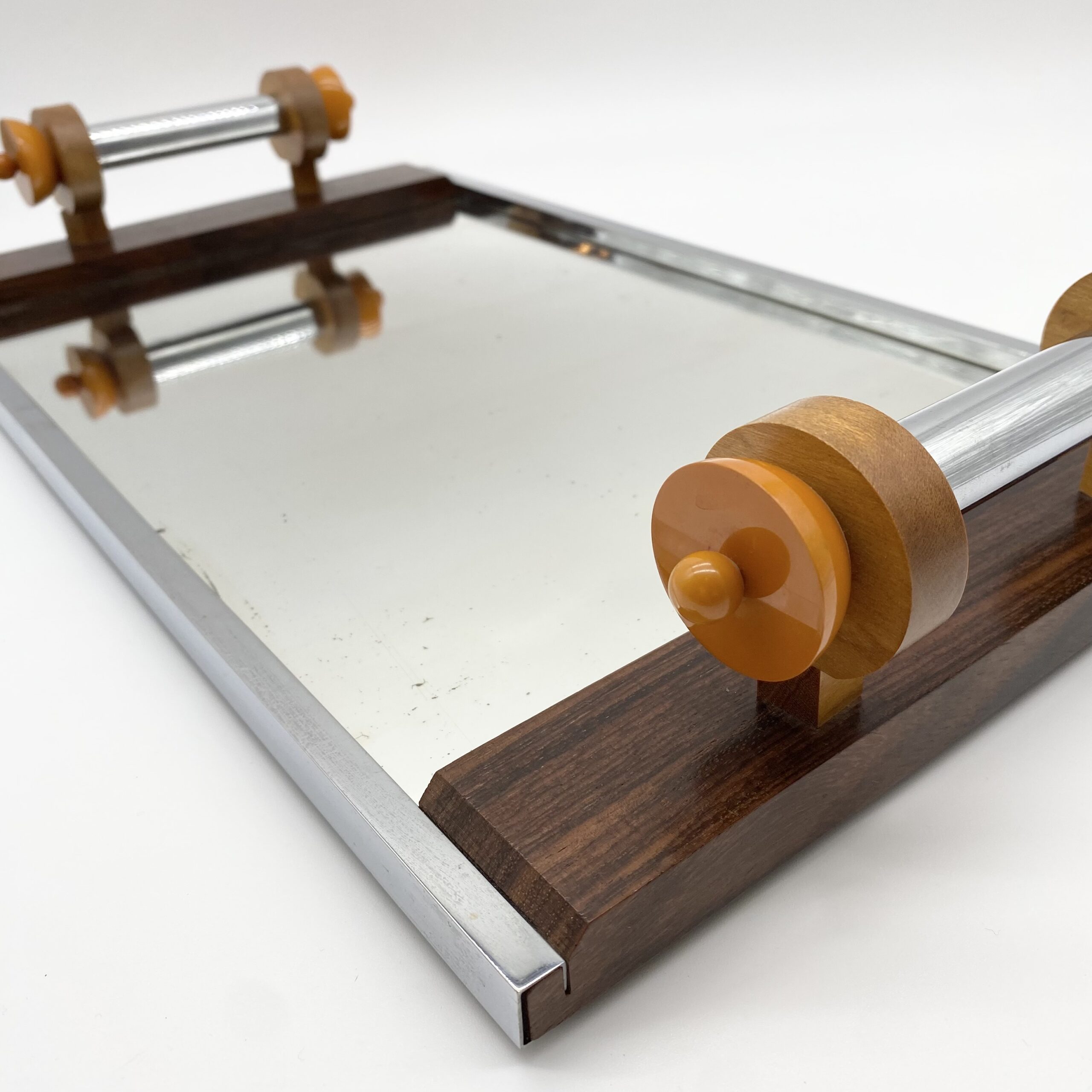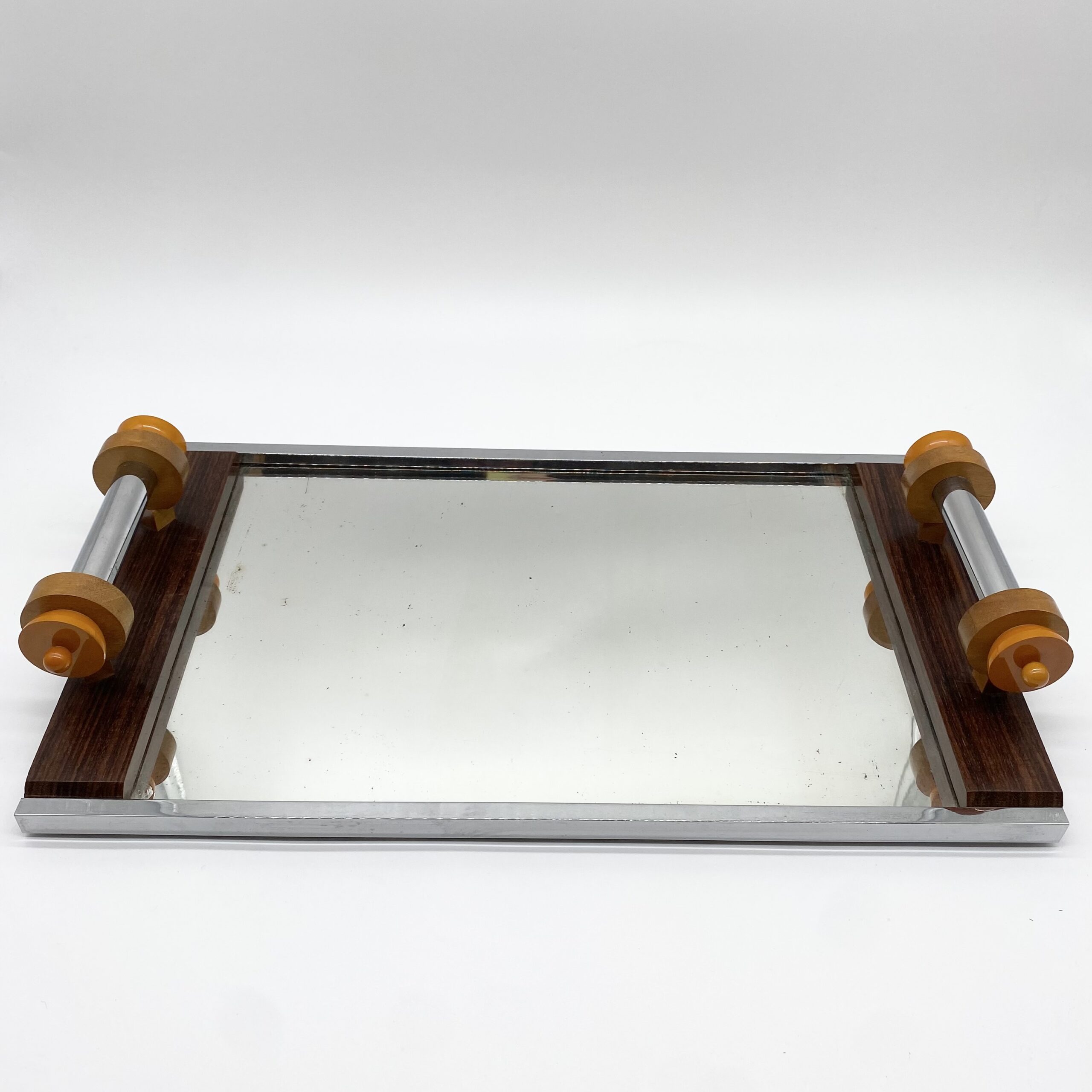 Le dessus est constitué d’une surface en miroir encadrée de bois teinté foncé, apportant un jeu de reflets élégant et une présence décorative marquée. Les poignées latérales, en tube métallique chromé et éléments circulaires en plastique couleur ambre.