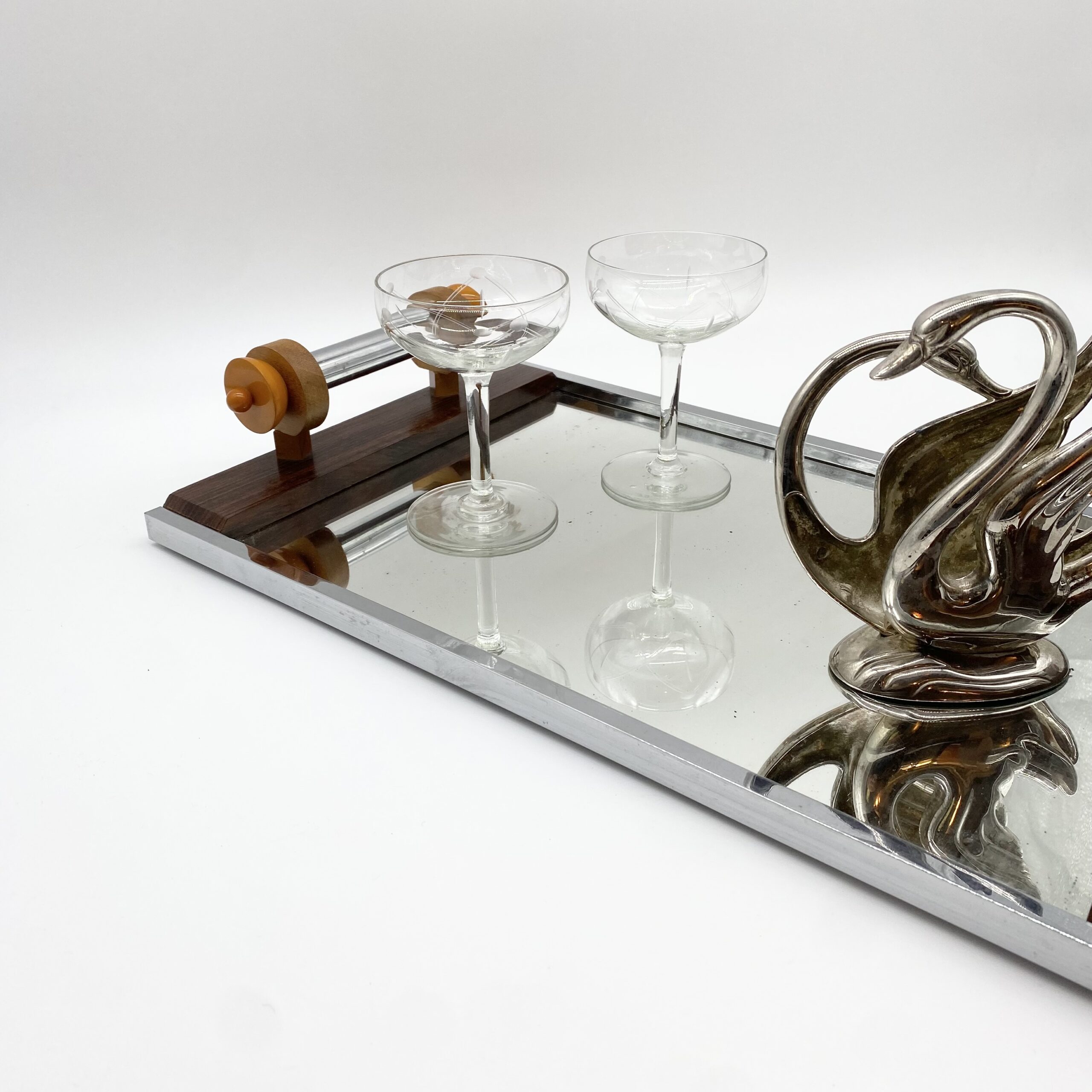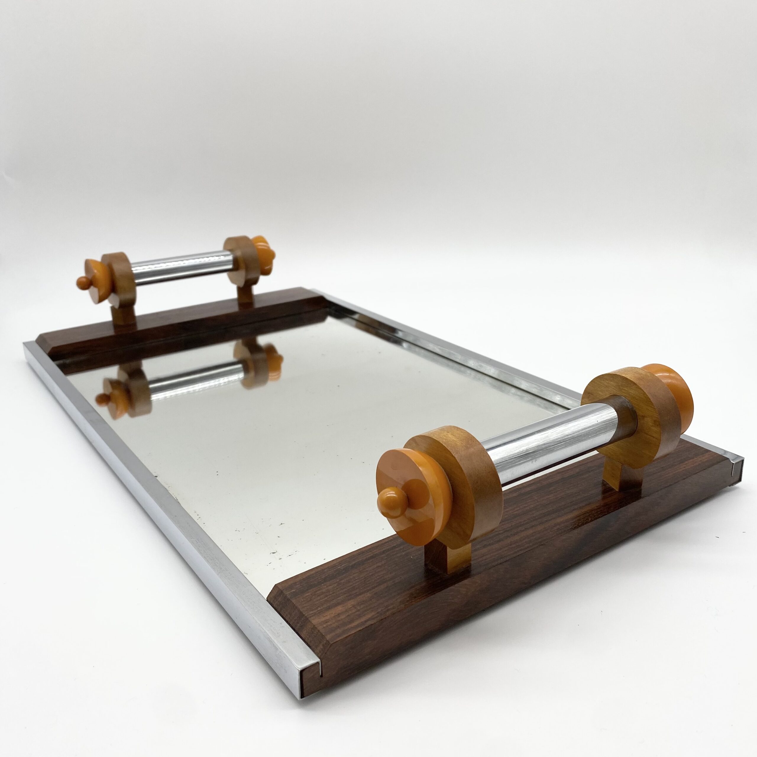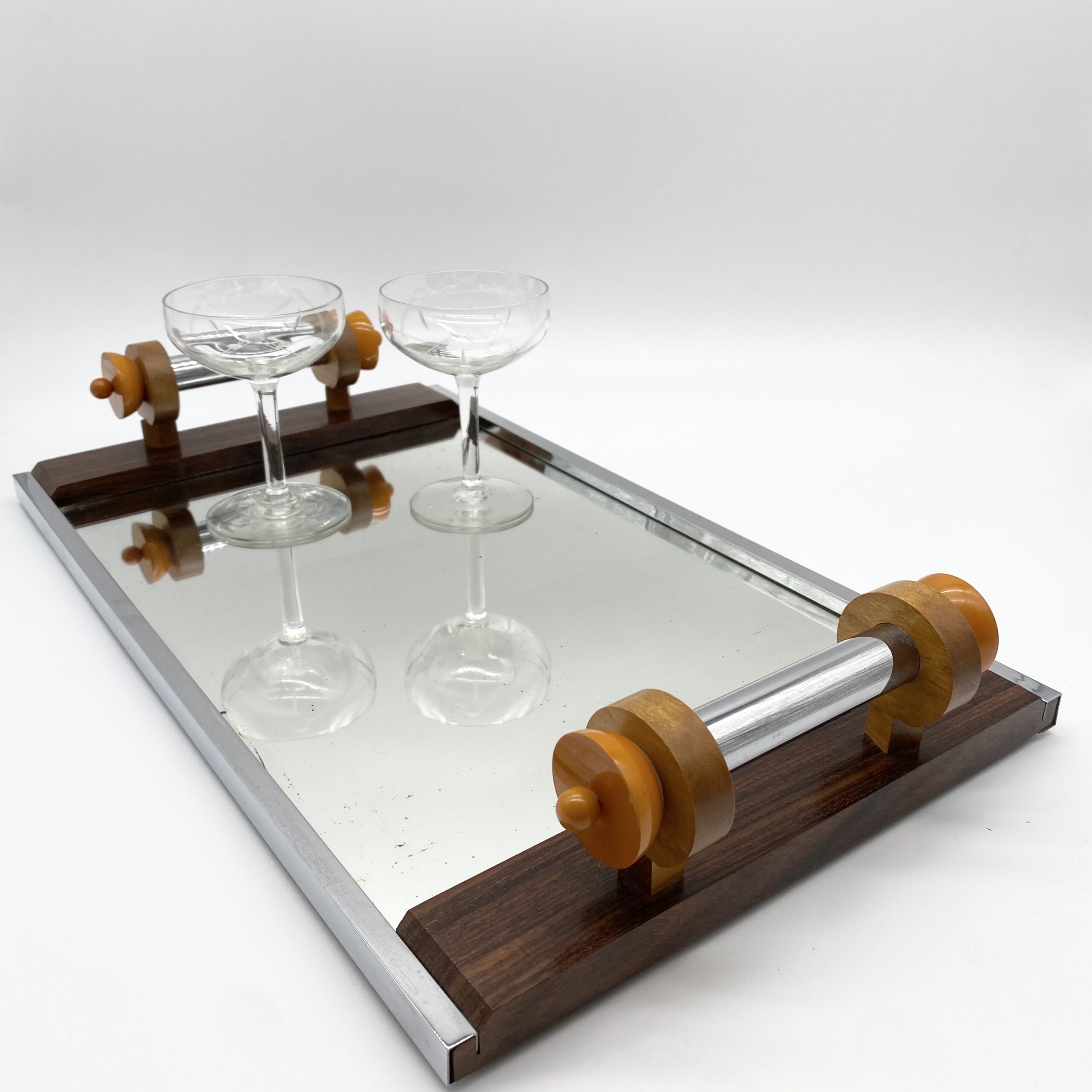 Le dessus est constitué d’une surface en miroir encadrée de bois teinté foncé, apportant un jeu de reflets élégant et une présence décorative marquée. Les poignées latérales, en tube métallique chromé et éléments circulaires en plastique couleur ambre.