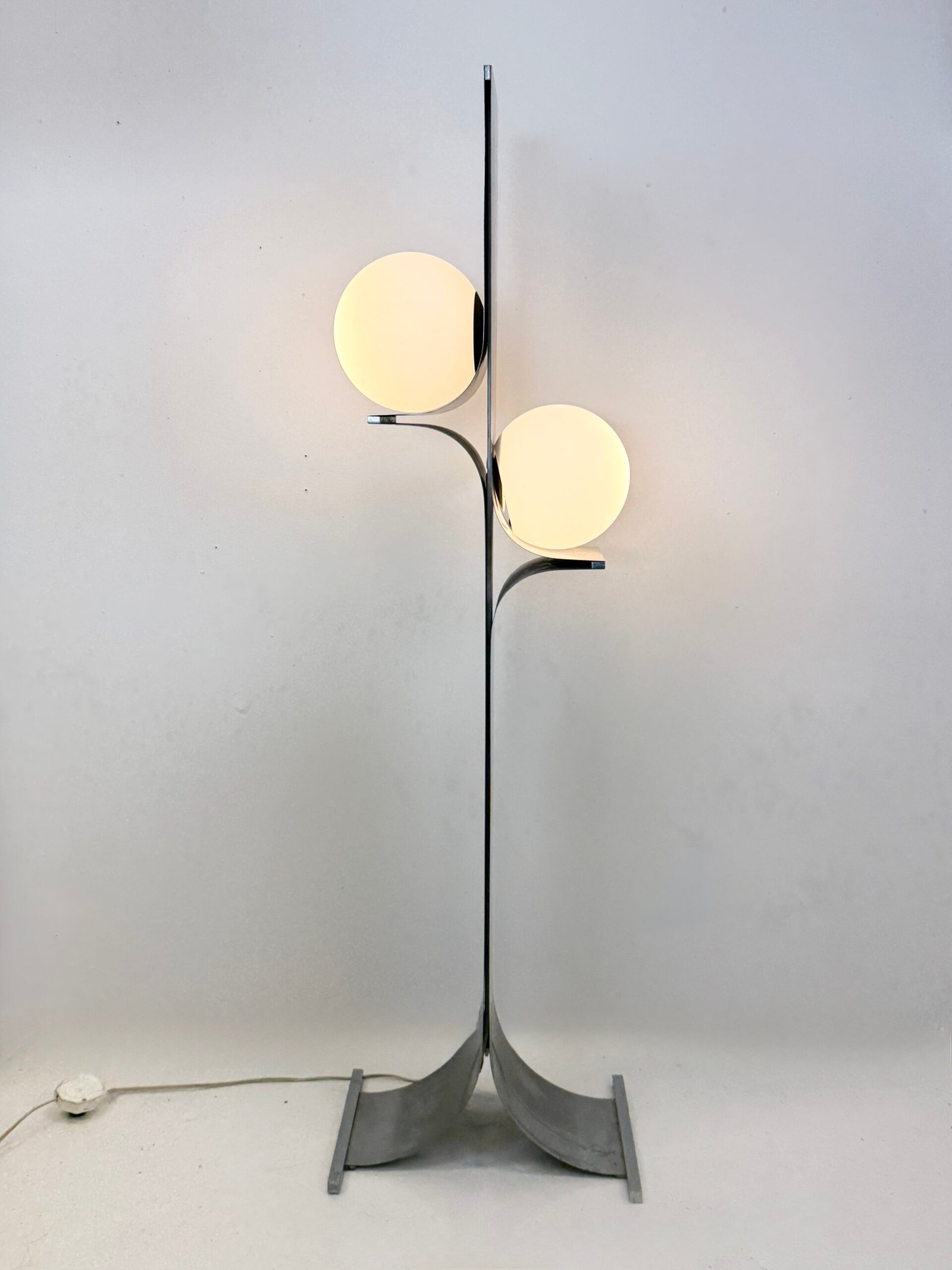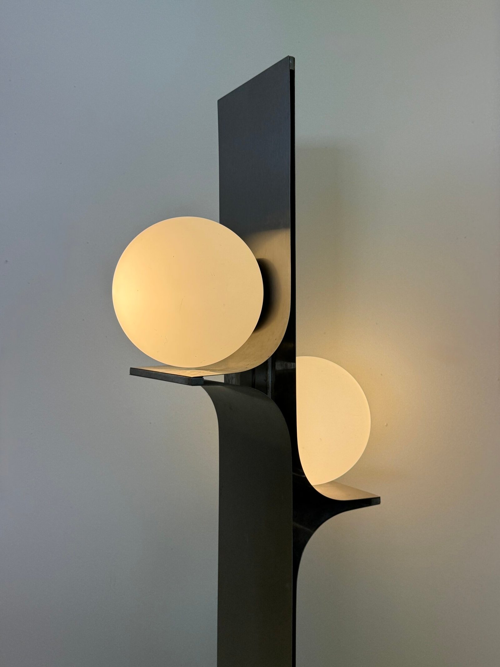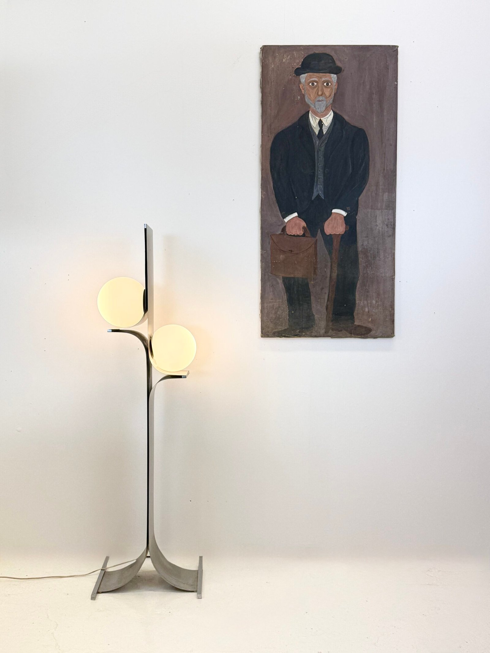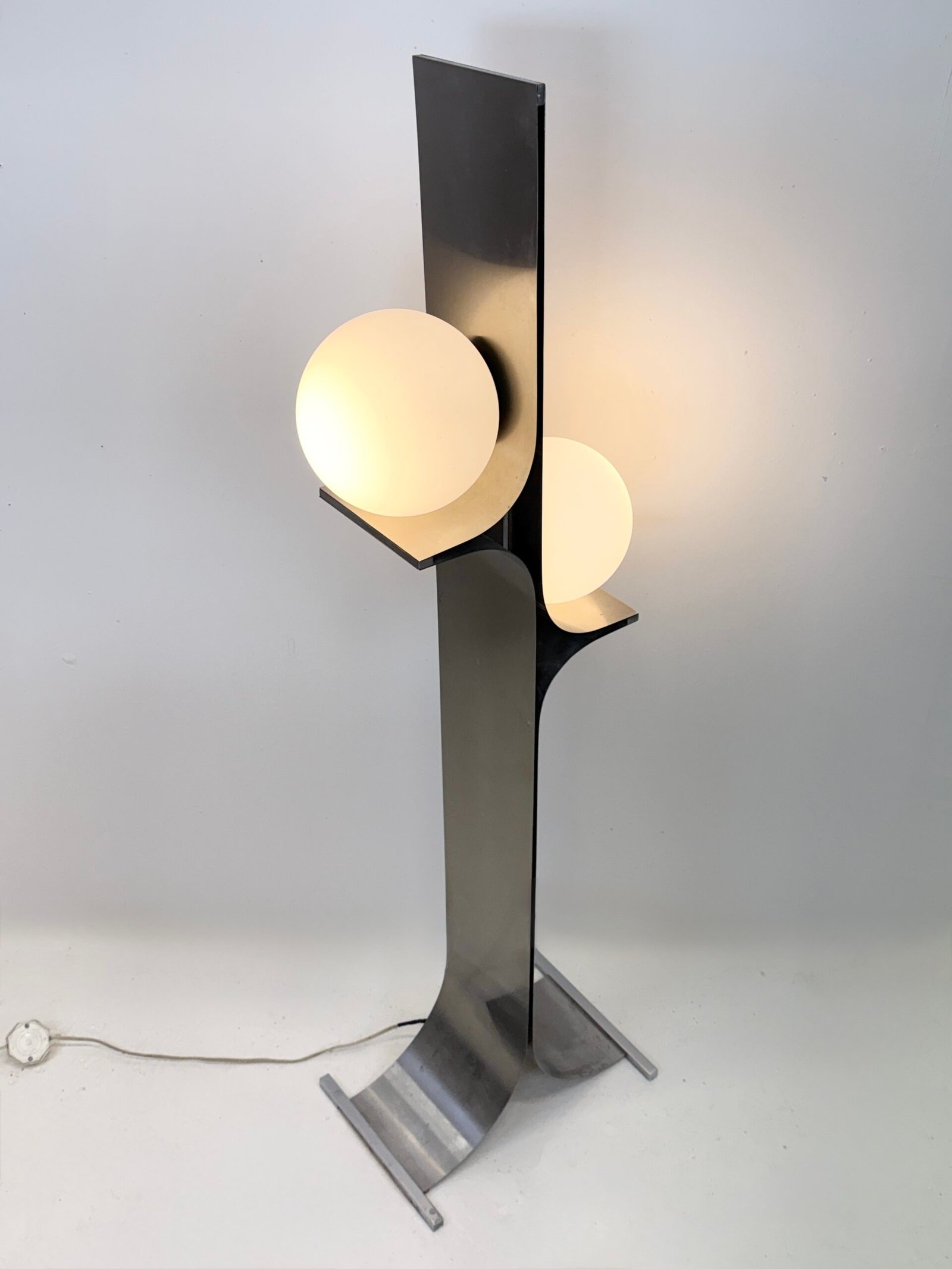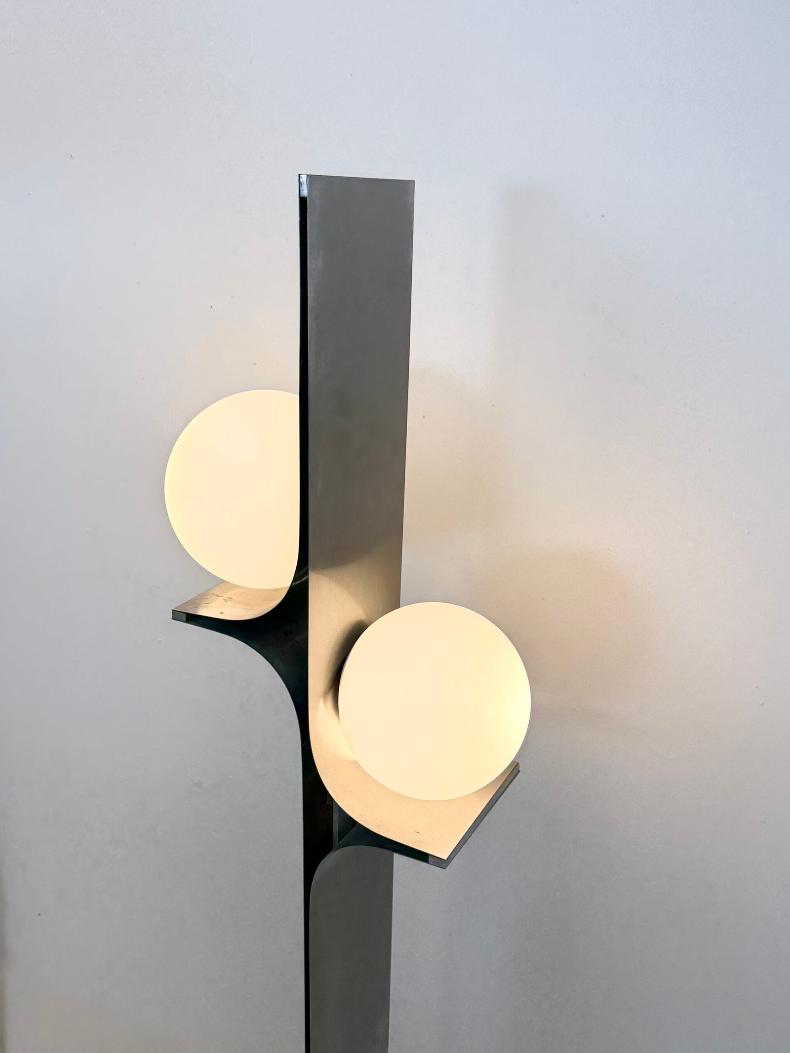 Sculptural lampadaire dessiné par François Monnet, emblématique du design Space Age des années 1970. Cette pièce se distingue par sa structure en acier brossé aux lignes fluides et architecturales, formant une silhouette verticale élégante et équilibrée.
