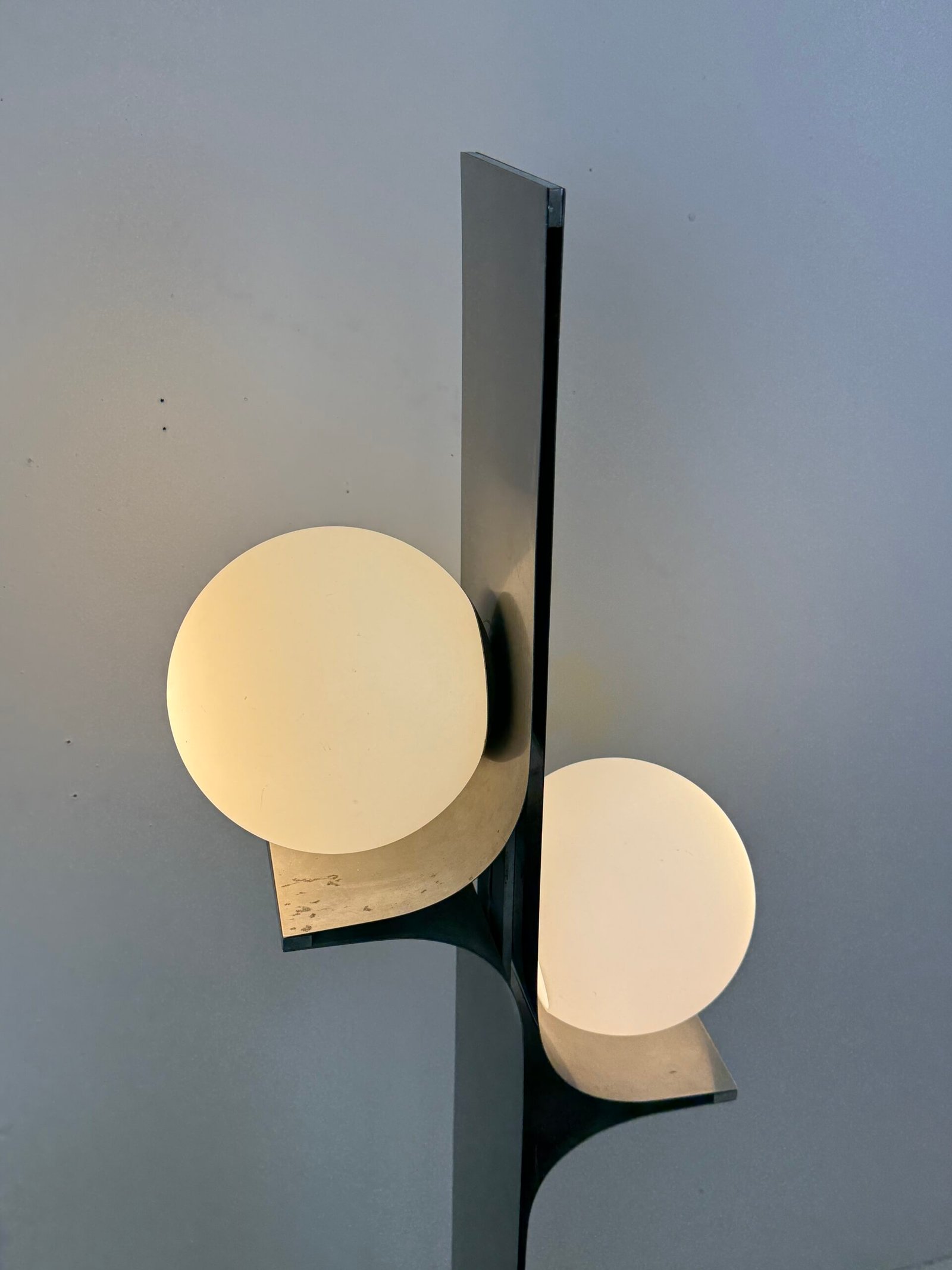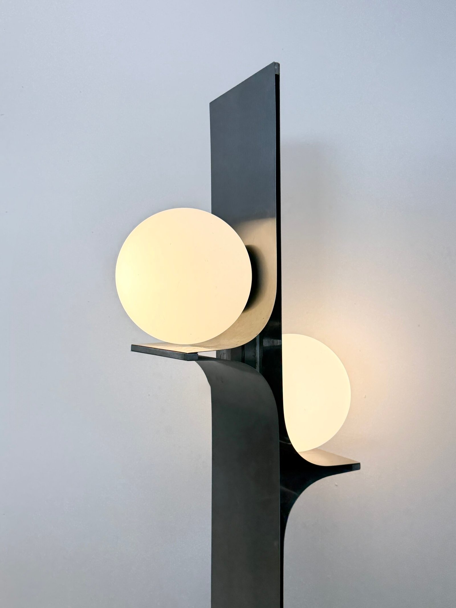 Le piètement en courbe douce soutient une composition asymétrique de deux plateaux, chacun accueillant un globe lumineux en verre opalin. Le contraste entre la rigueur métallique et la douceur des sphères diffusantes crée un jeu de lumière subtil et chaleureux.