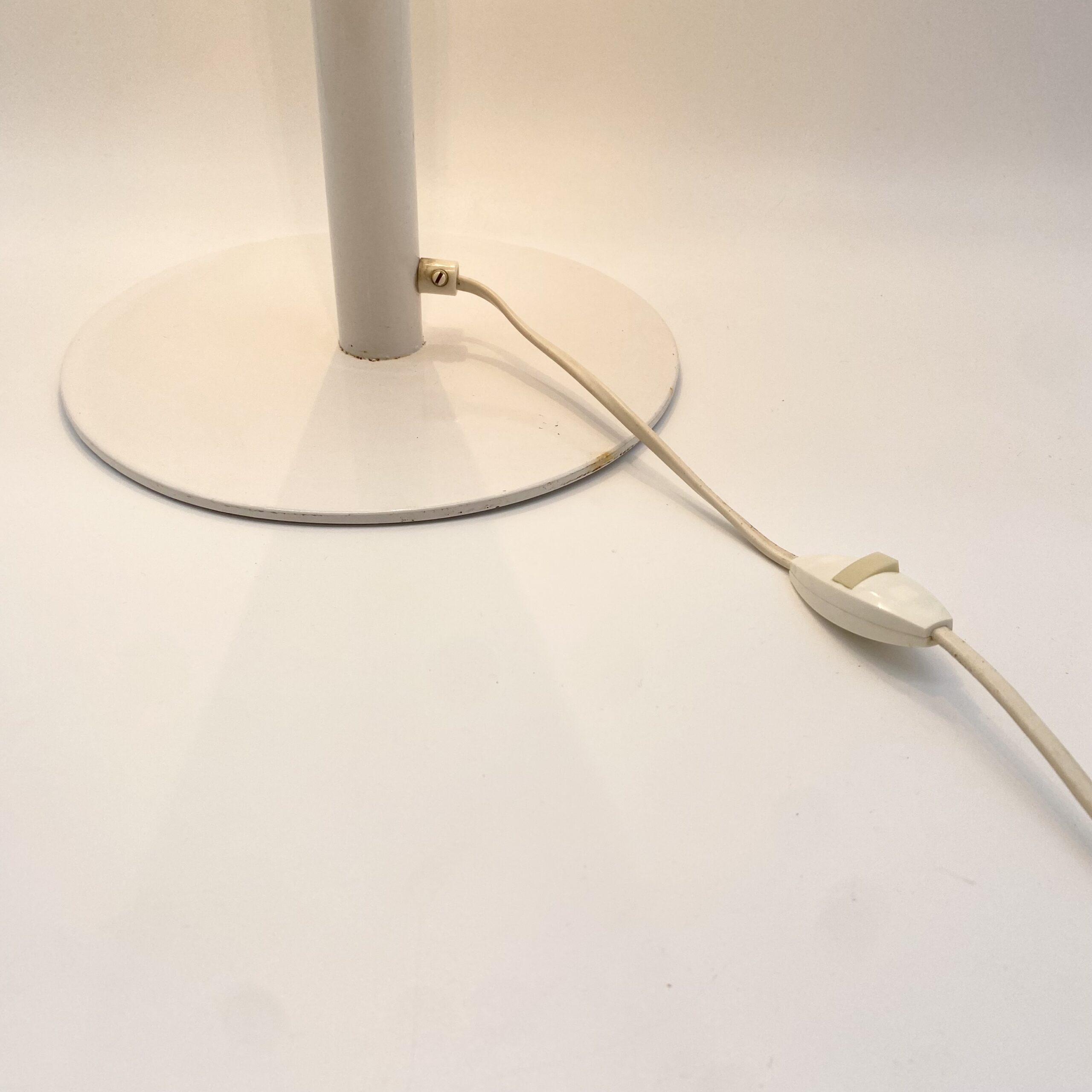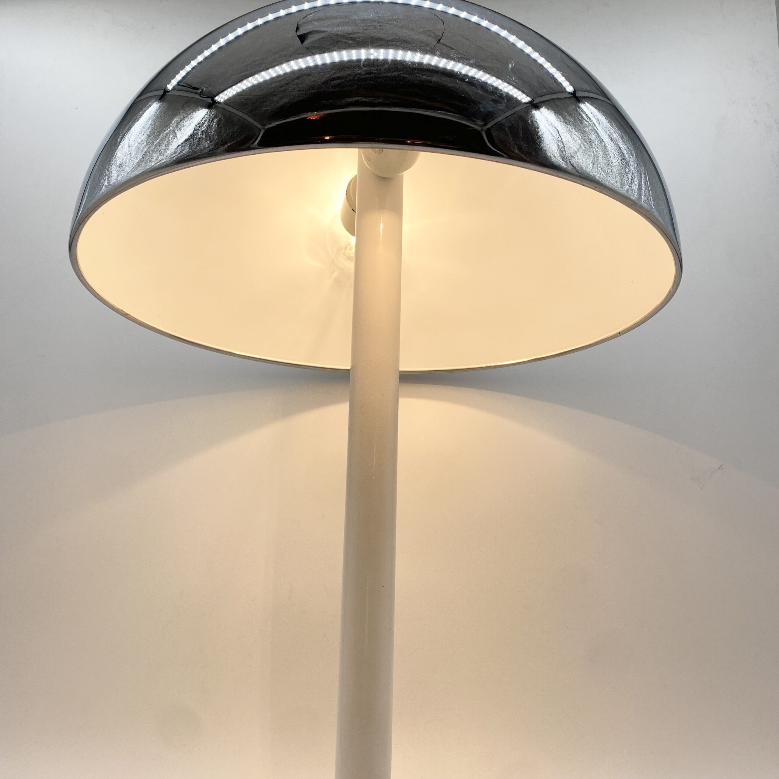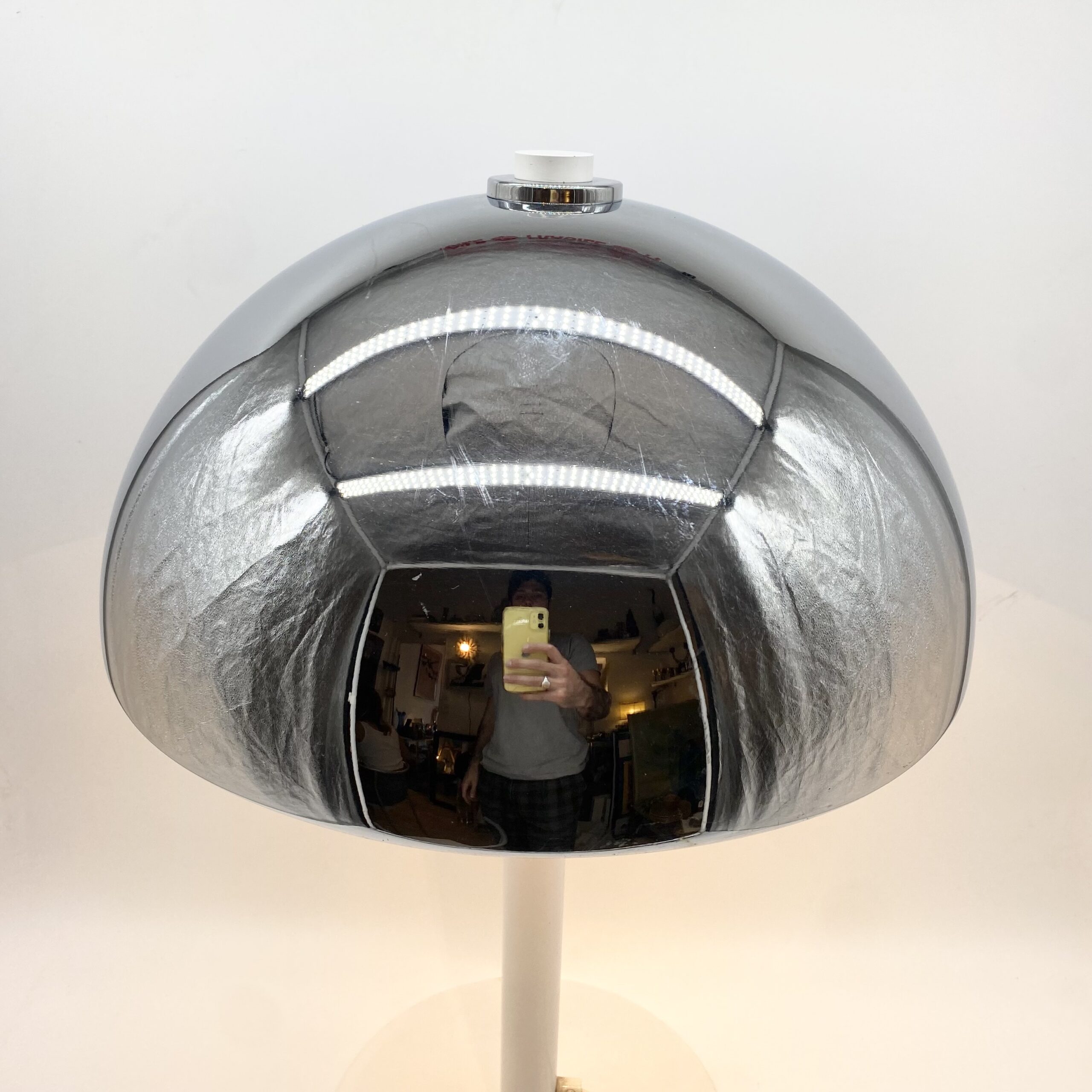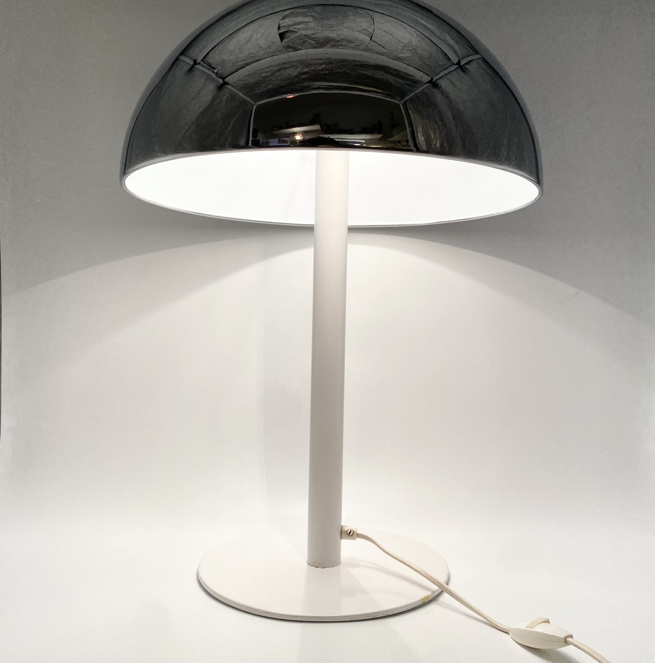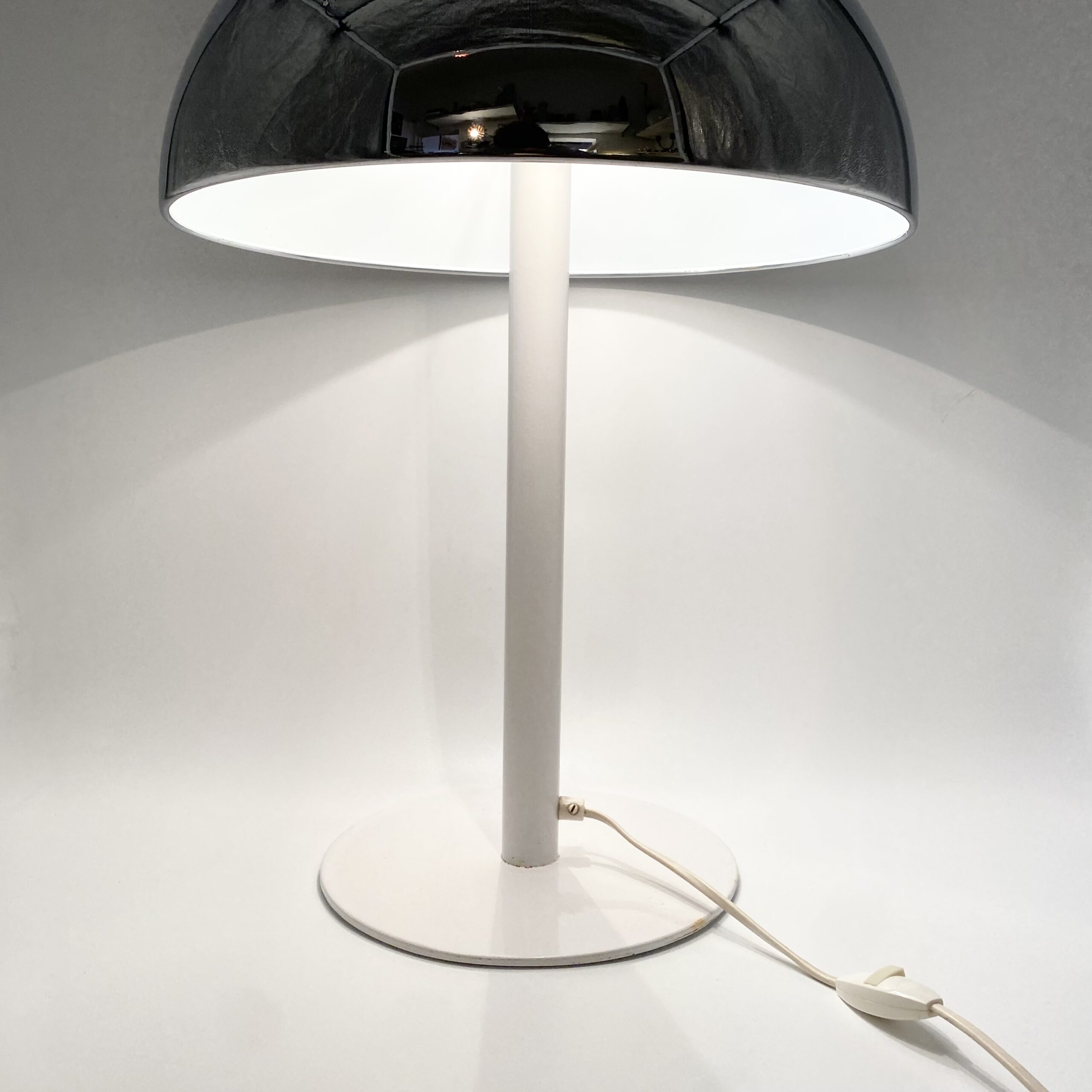 Élégante lampe de table au design typique des années 1970, composée d’un large abat-jour hémisphérique en métal chromé et d’un pied cylindrique laqué blanc.