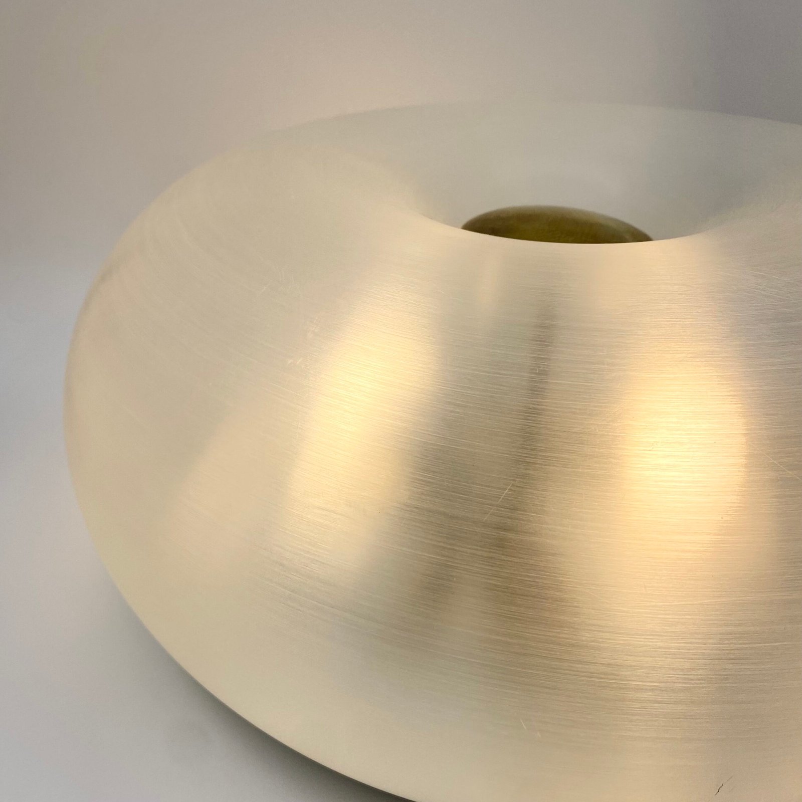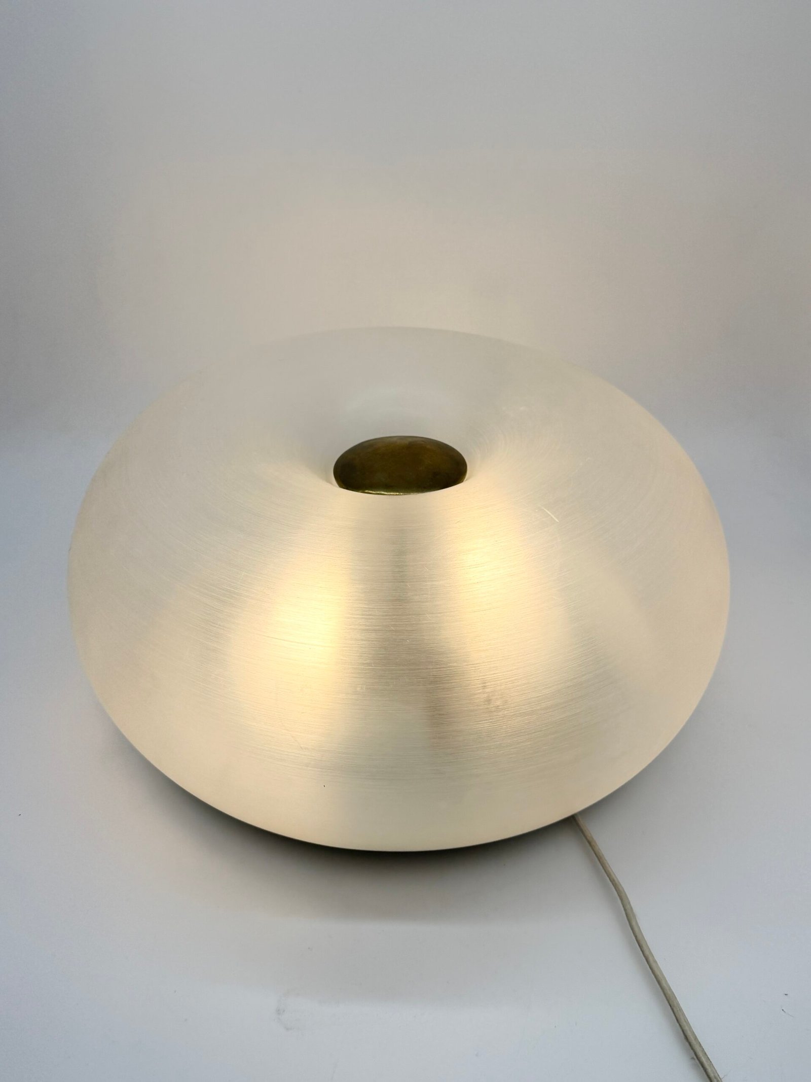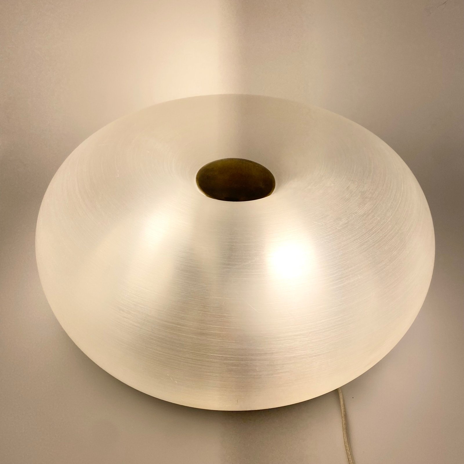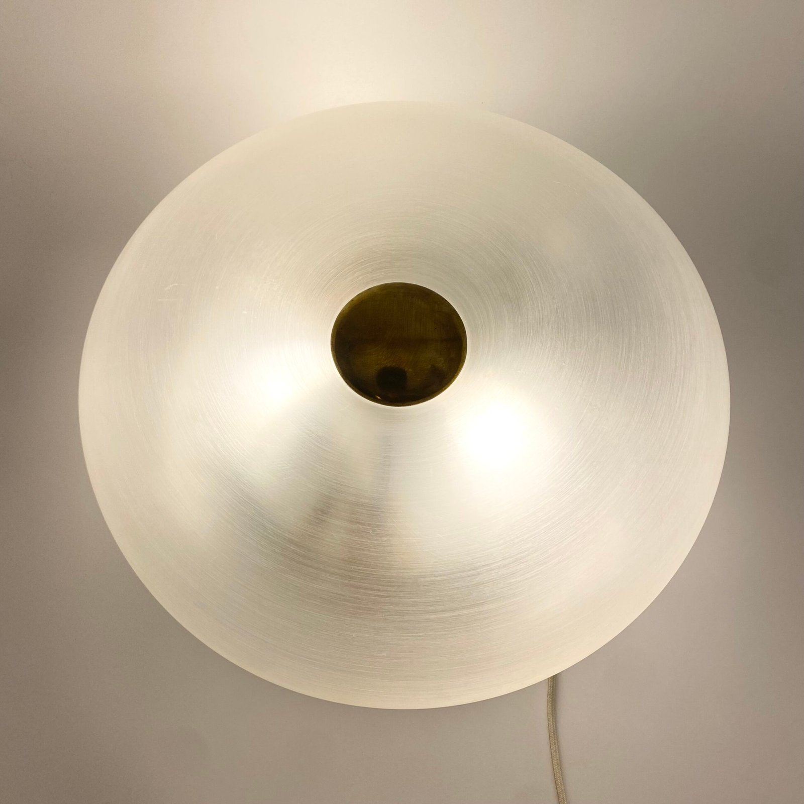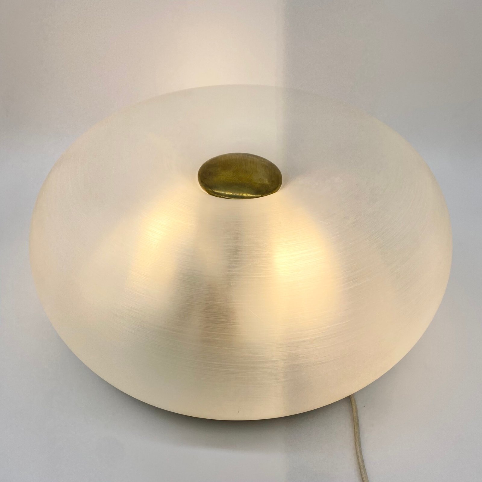 Cette pièce iconique se distingue par son diffuseur en méthacrylate dépoli, d’une transparence subtile qui diffuse une lumière douce et homogène. Le centre est souligné par un disque en laiton doré, apportant une touche de chaleur et de raffinement.