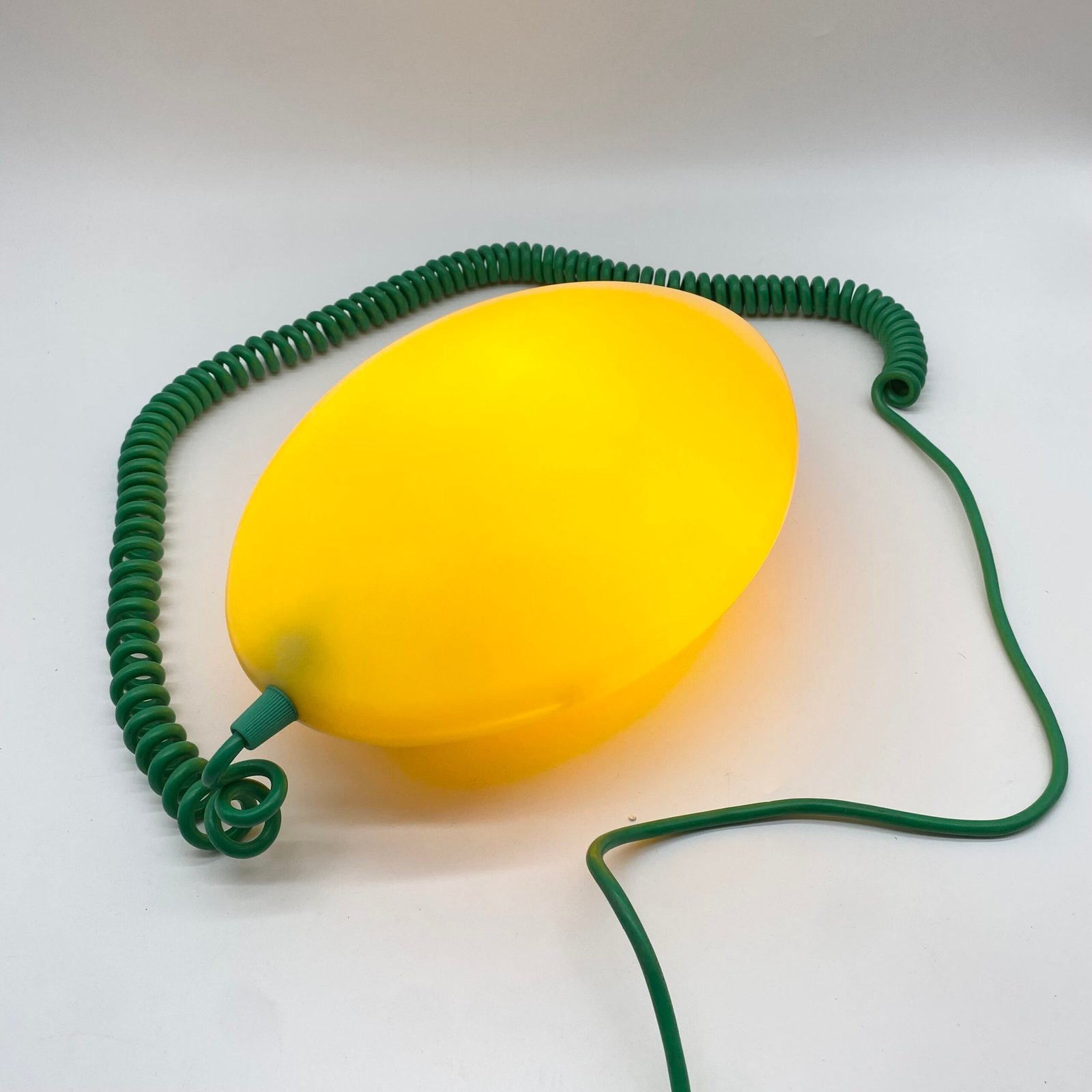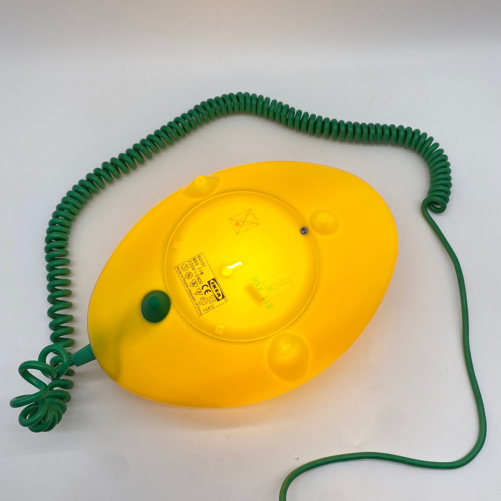 Rare lampe Löv B0101 éditée par IKEA dans les années 1990, conçue par le duo de designers Knut et Marianne Hagberg. Avec sa forme organique en ovale jaune lumineux associée à un câble spiralé vert, elle incarne parfaitement l’esthétique postmoderne et ère spatiale de cette décennie.