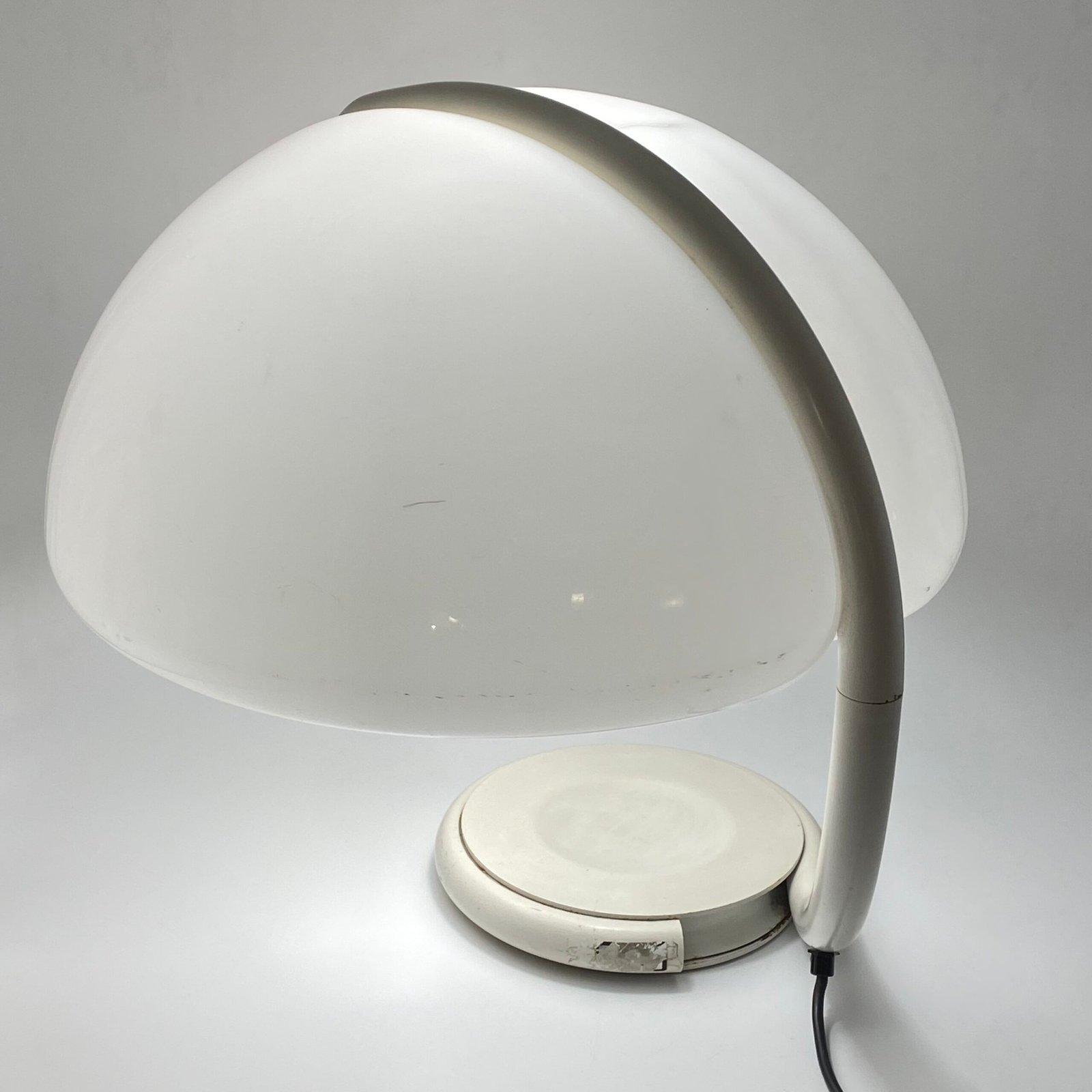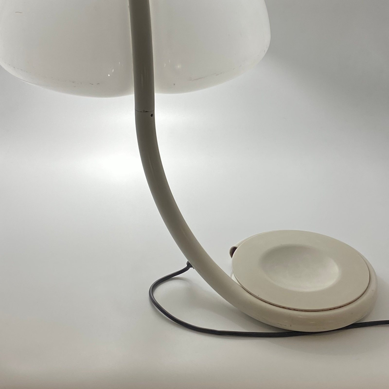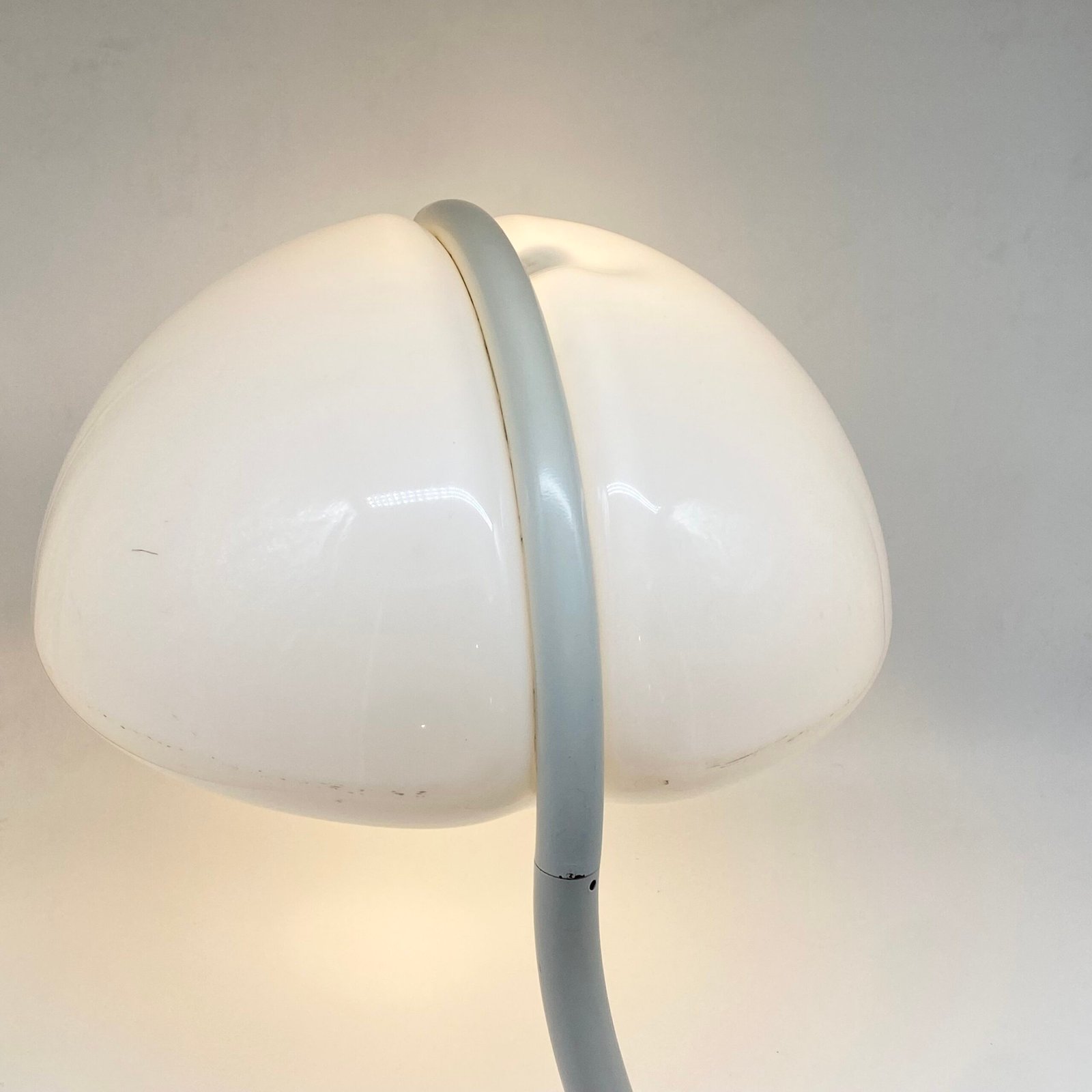 Sa silhouette organique, formée par un bras tubulaire courbé soutenant un large abat-jour en méthacrylate blanc opalin, diffuse une lumière douce et homogène tout en offrant une présence sculpturale immédiatement reconnaissable.