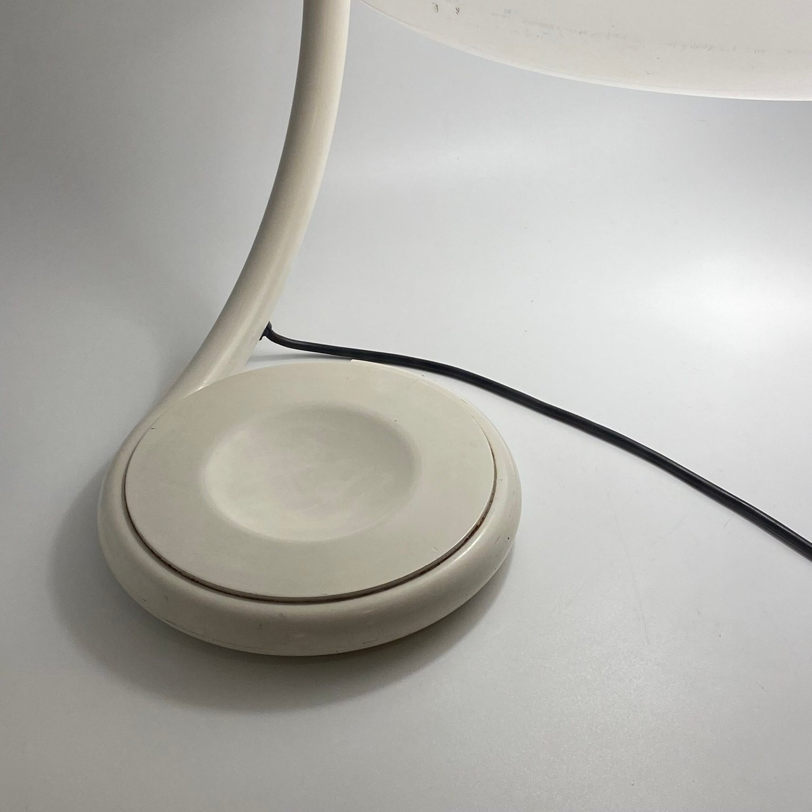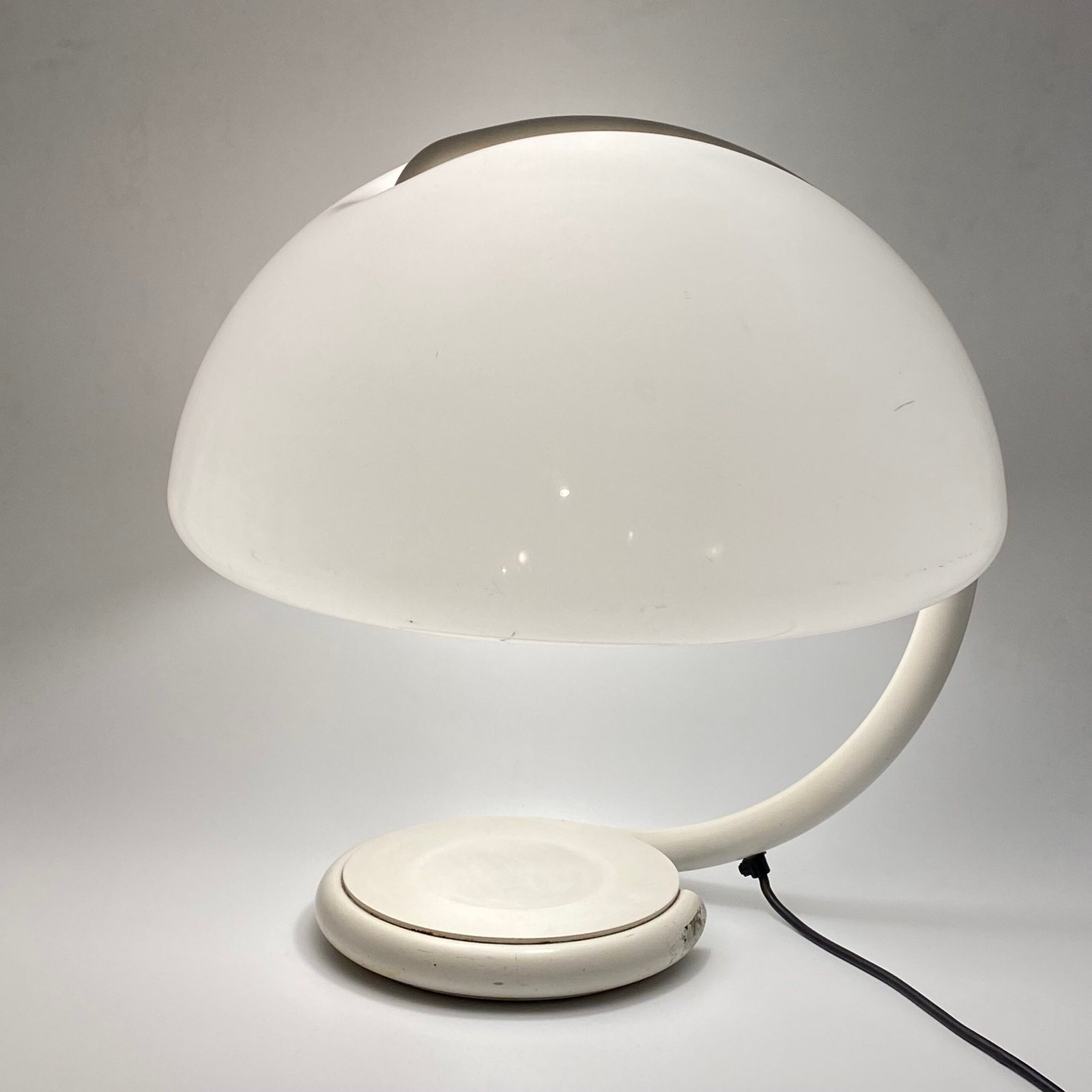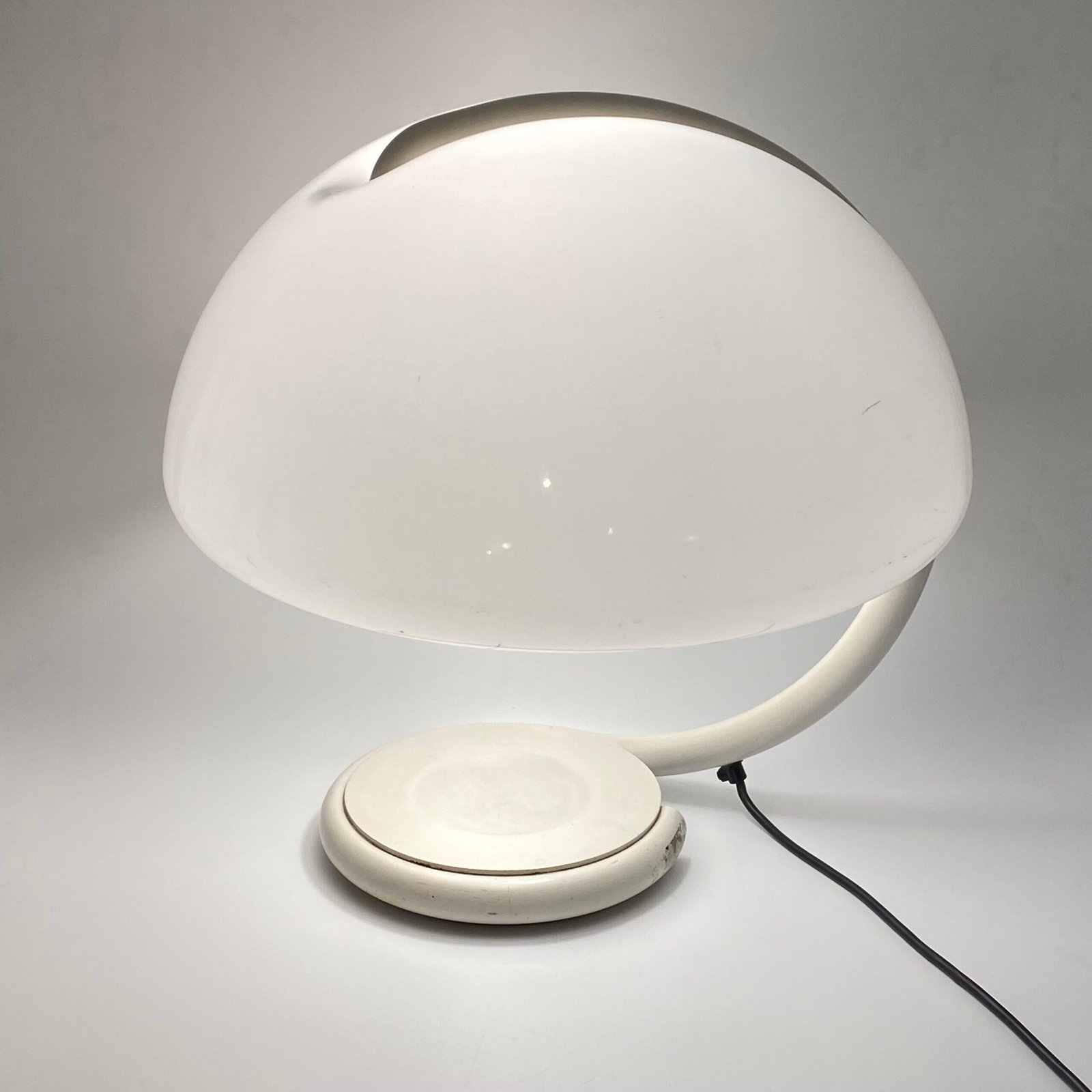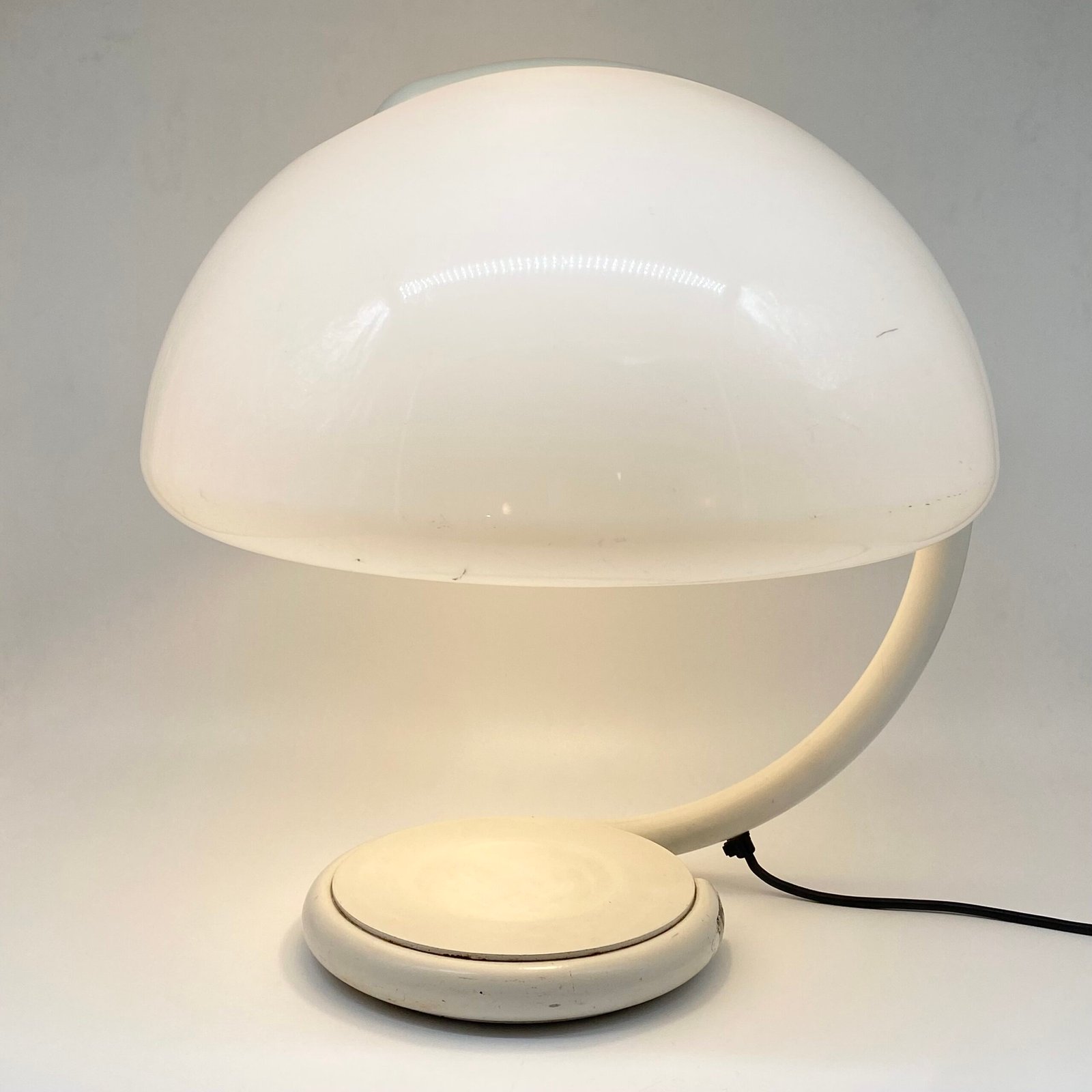 Sa silhouette organique, formée par un bras tubulaire courbé soutenant un large abat-jour en méthacrylate blanc opalin, diffuse une lumière douce et homogène tout en offrant une présence sculpturale immédiatement reconnaissable.