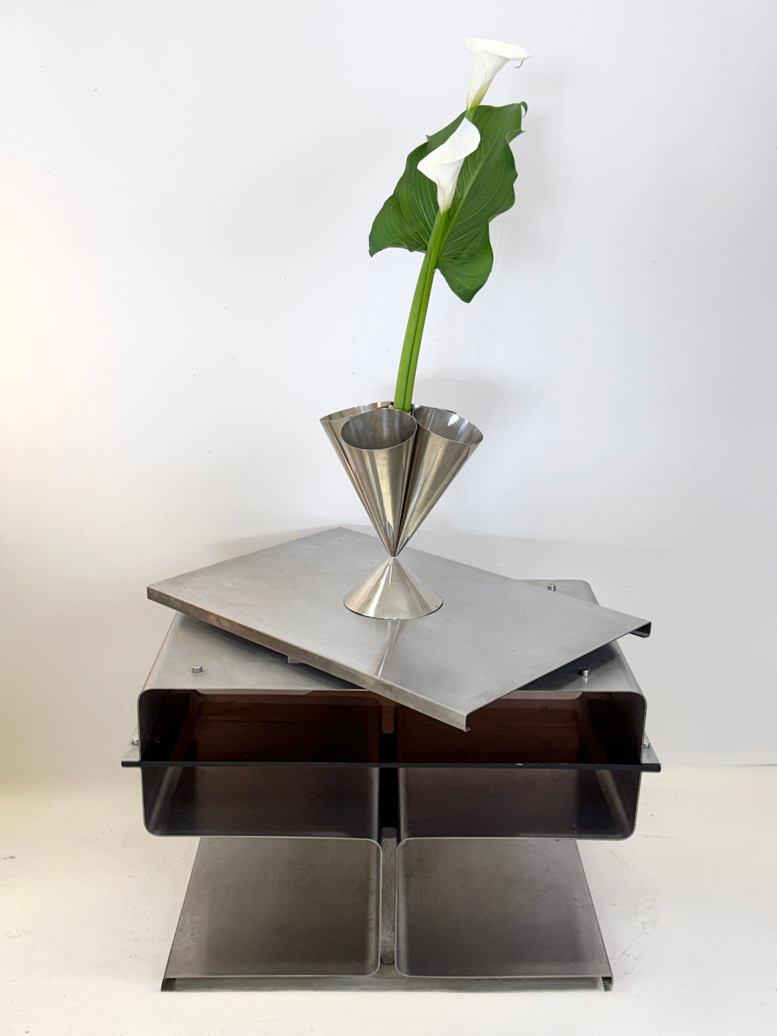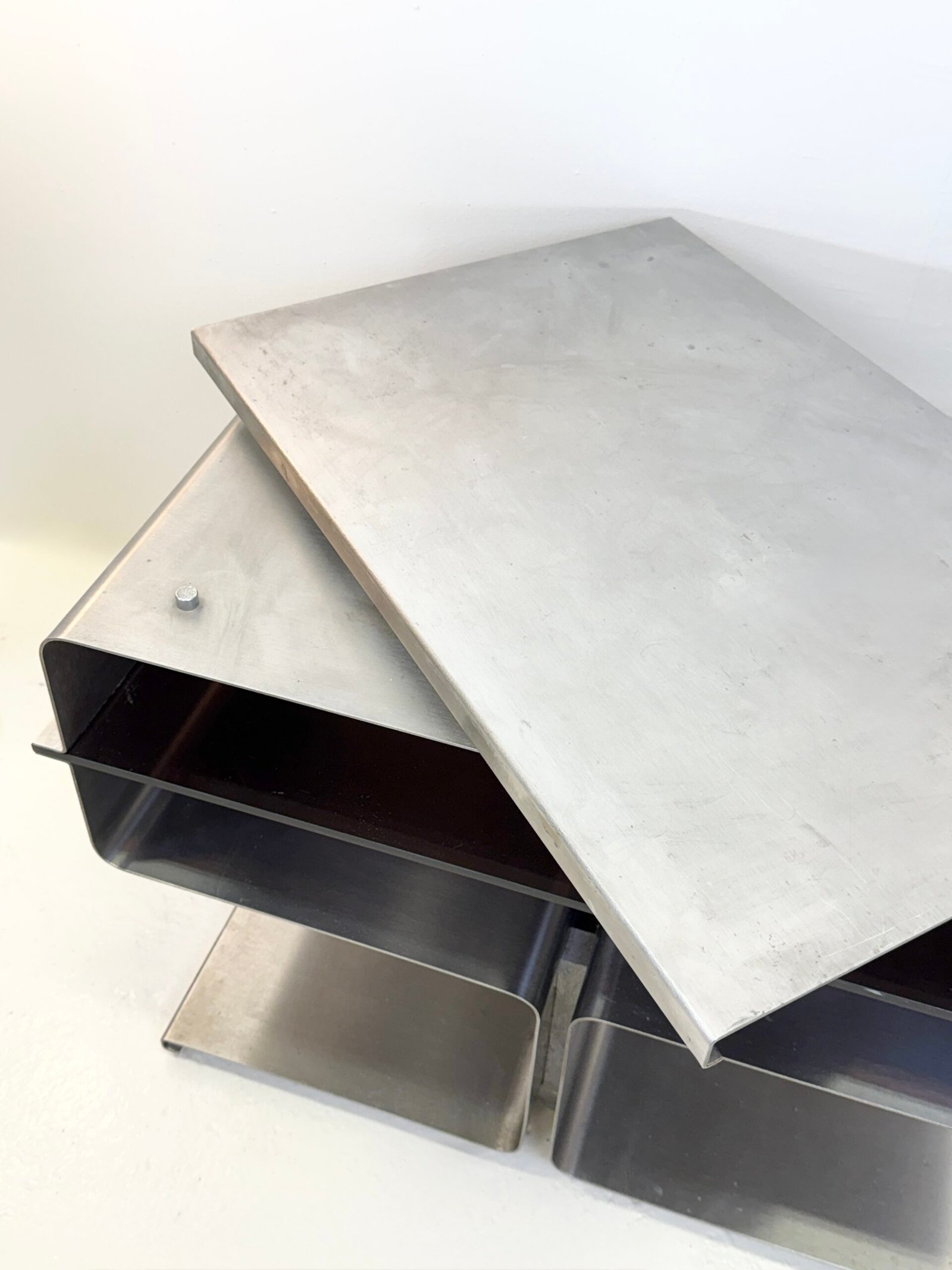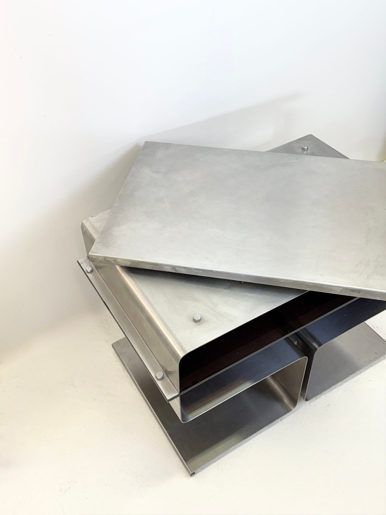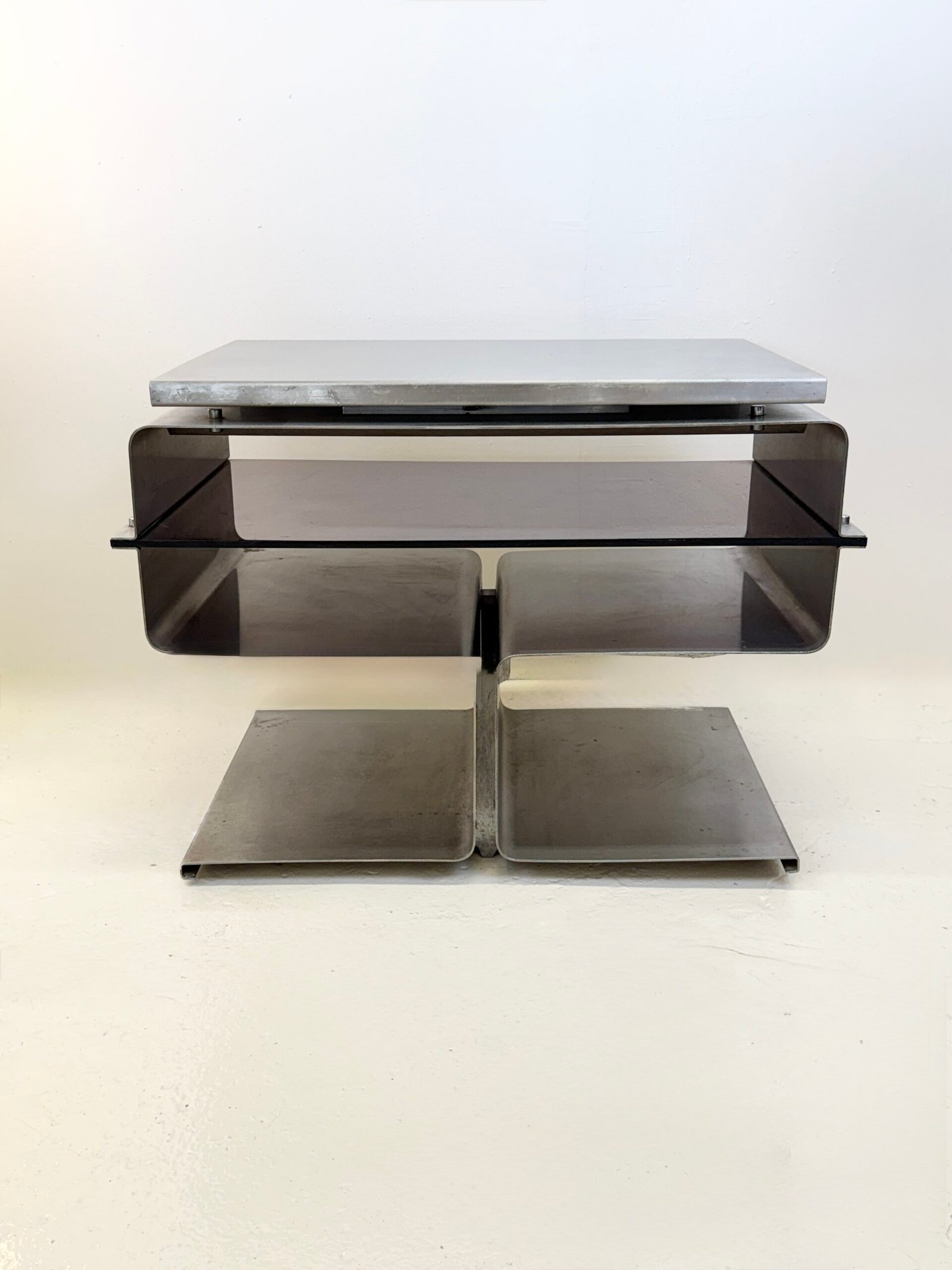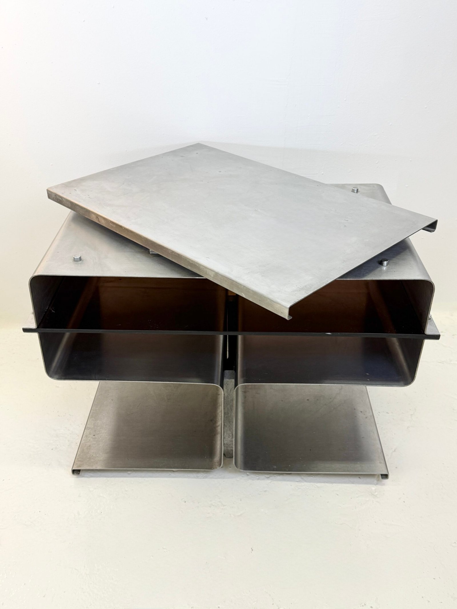 Le travail de pliage du métal, signature de François Monnet, confère à l’objet une esthétique industrielle radicale, proche des recherches du design moderniste français de l’époque.