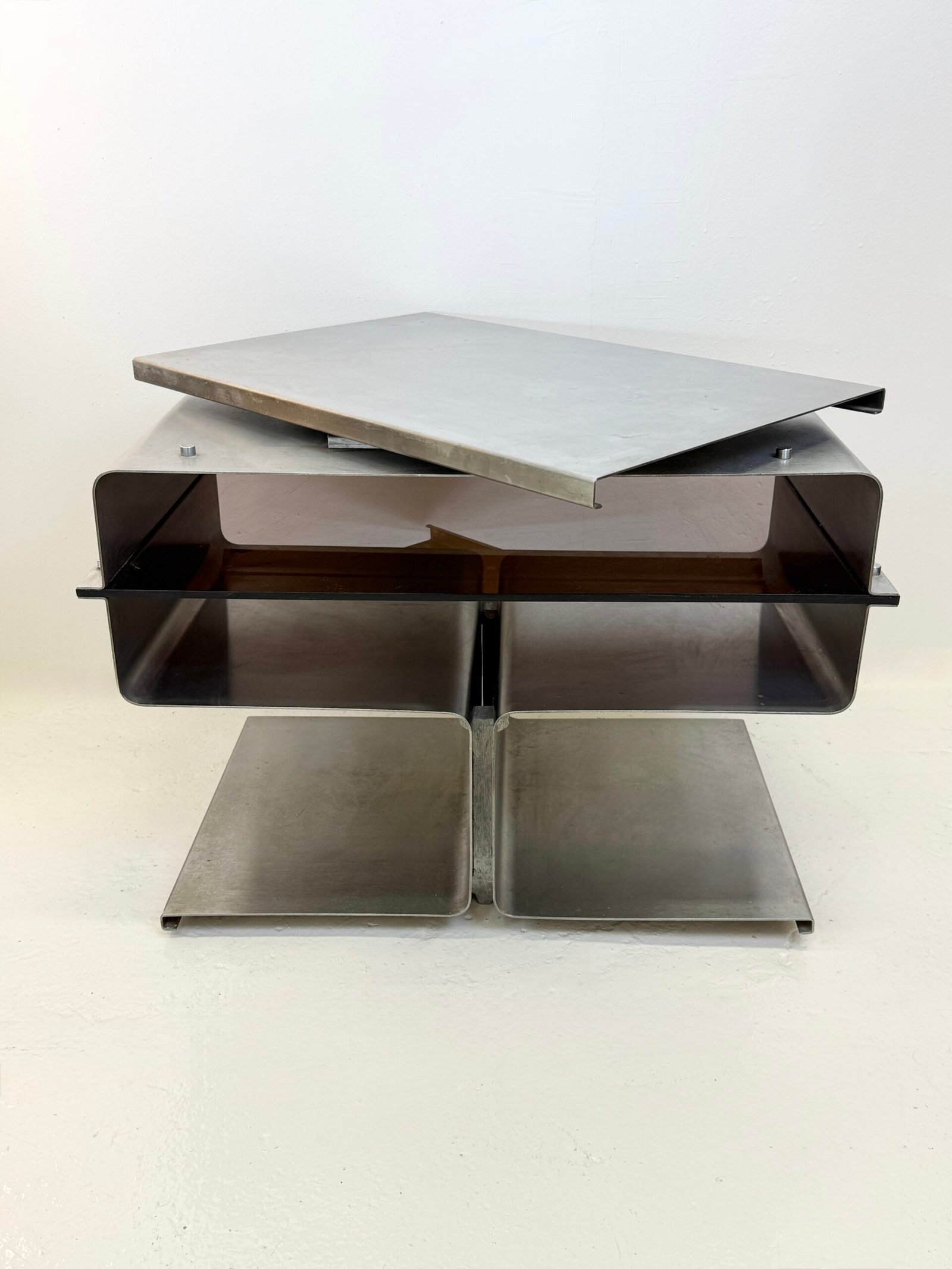 Meuble hi-fi emblématique dessiné par François Monnet pour Kappa dans les années 1970, entièrement réalisé en acier plié.