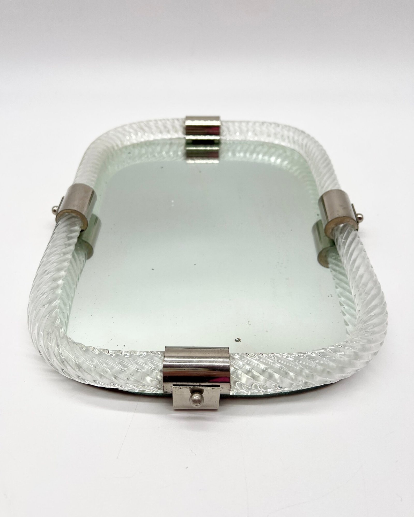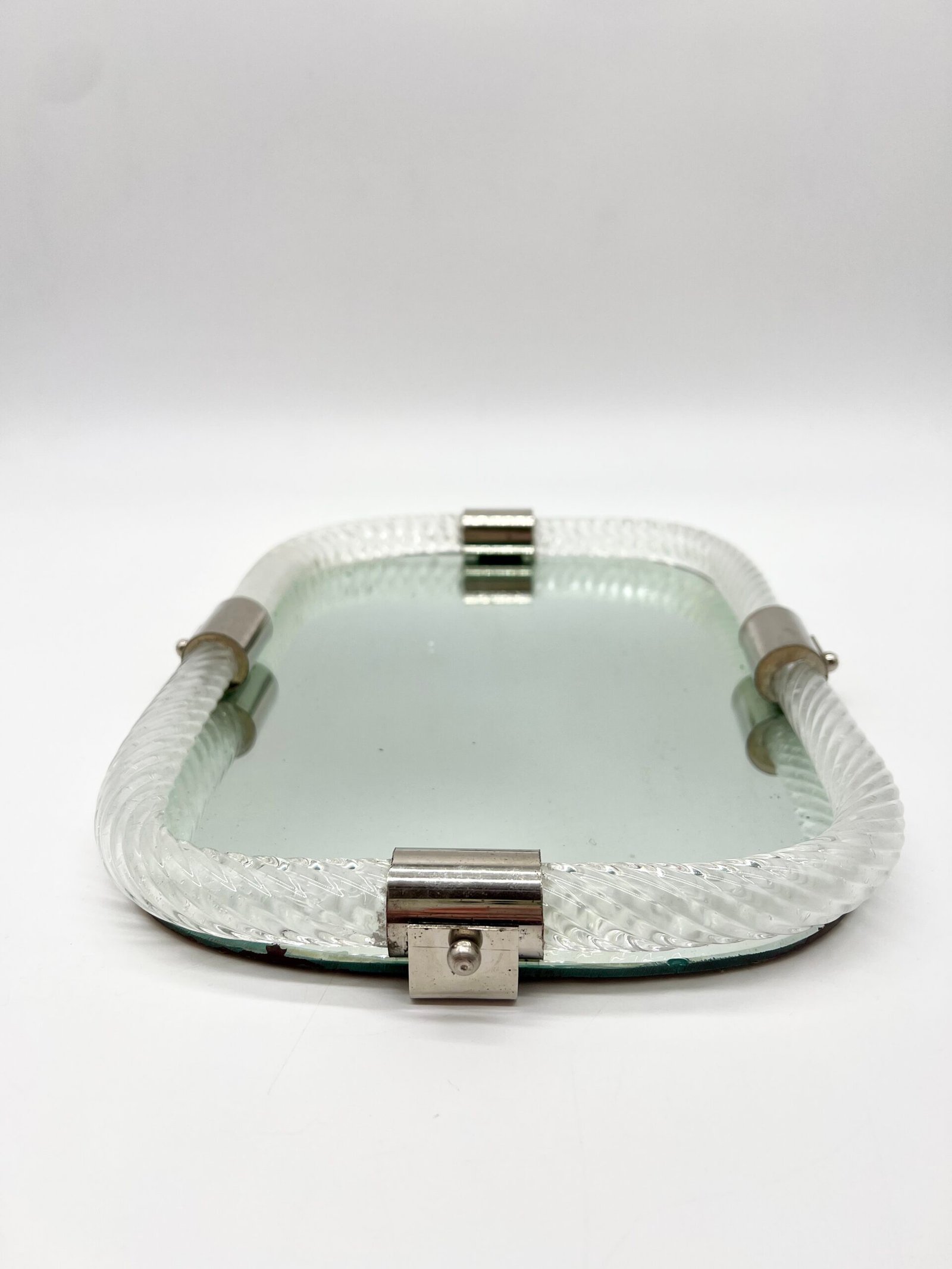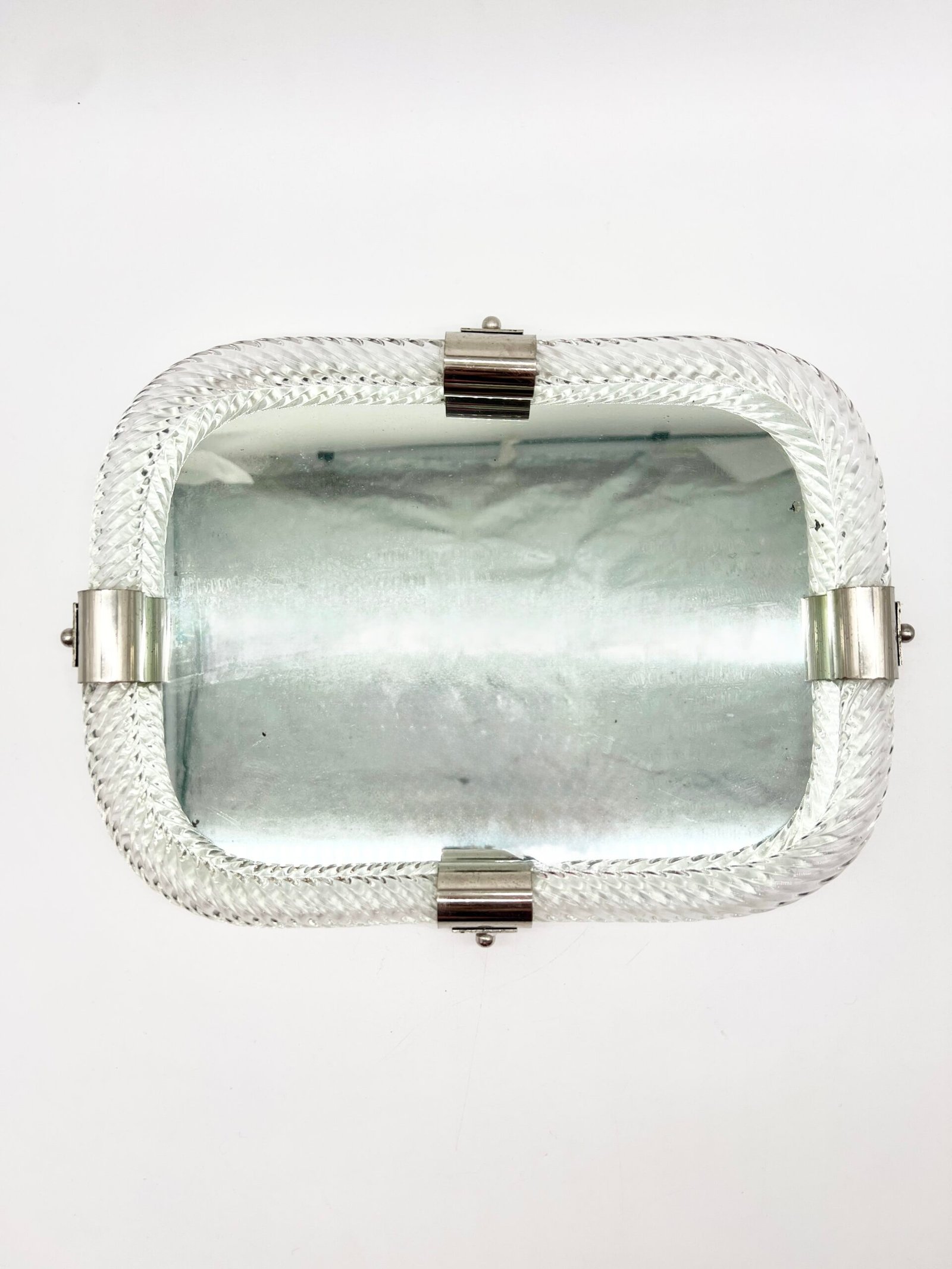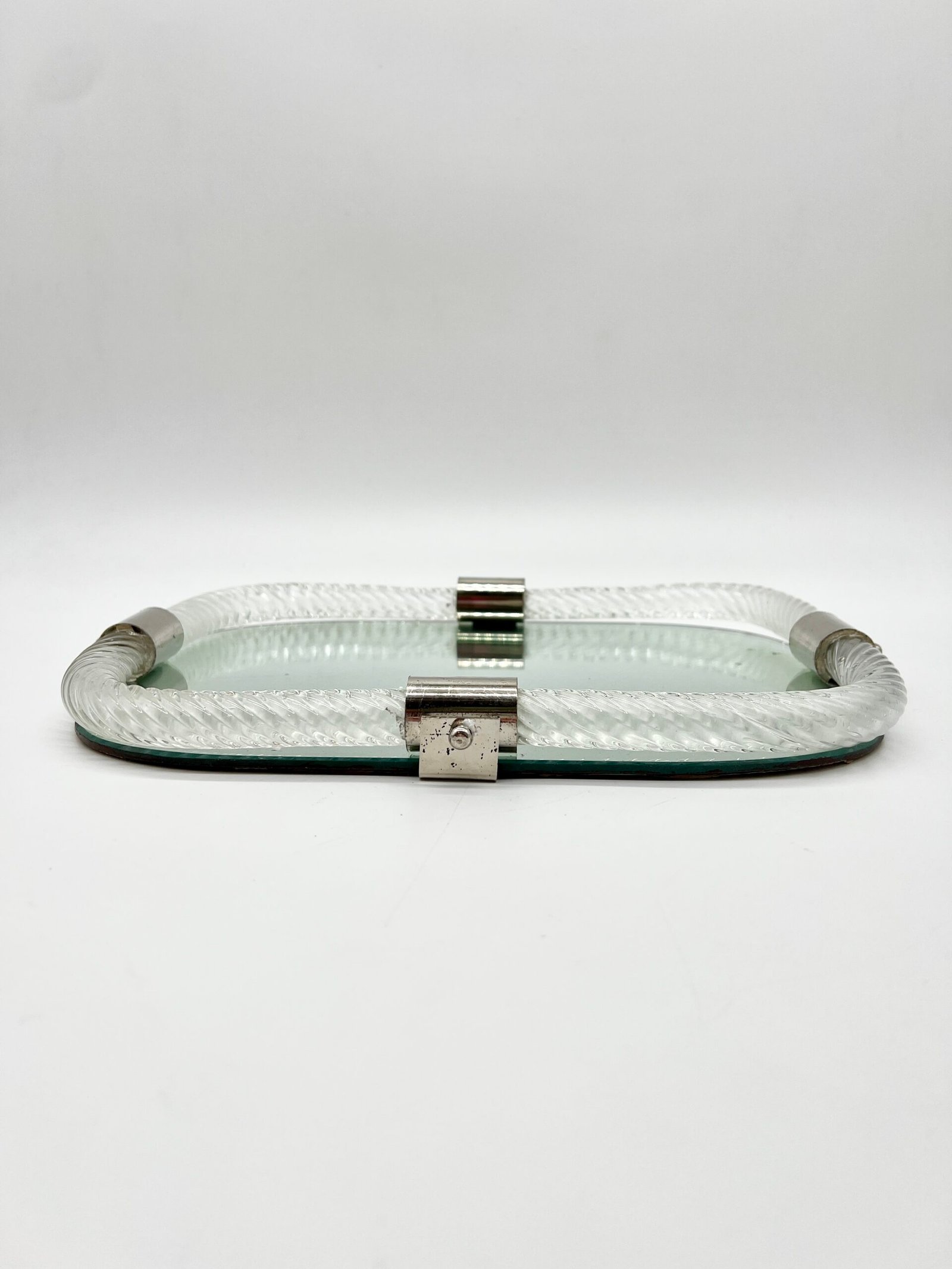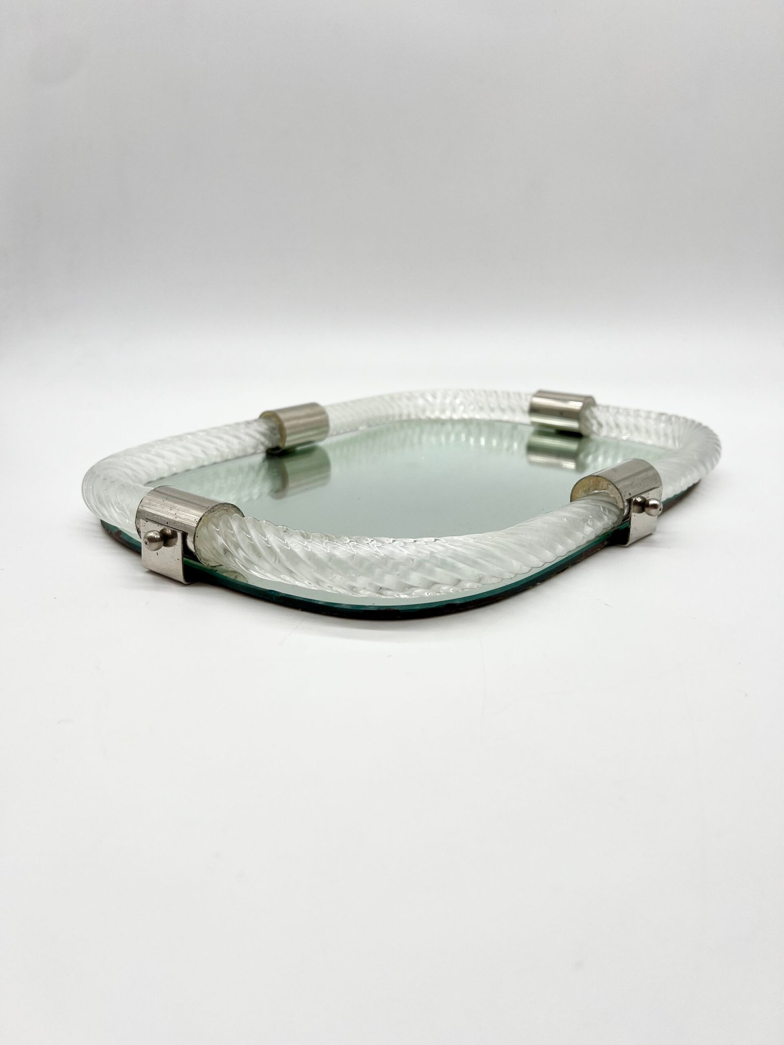 Miroir en verre de Murano, encadré d’un élégant cordon de verre torsadé dit “torchon”. La forme rectangulaire aux angles adoucis lui confère une silhouette douce et équilibrée, typique du design italien des années 60–70.