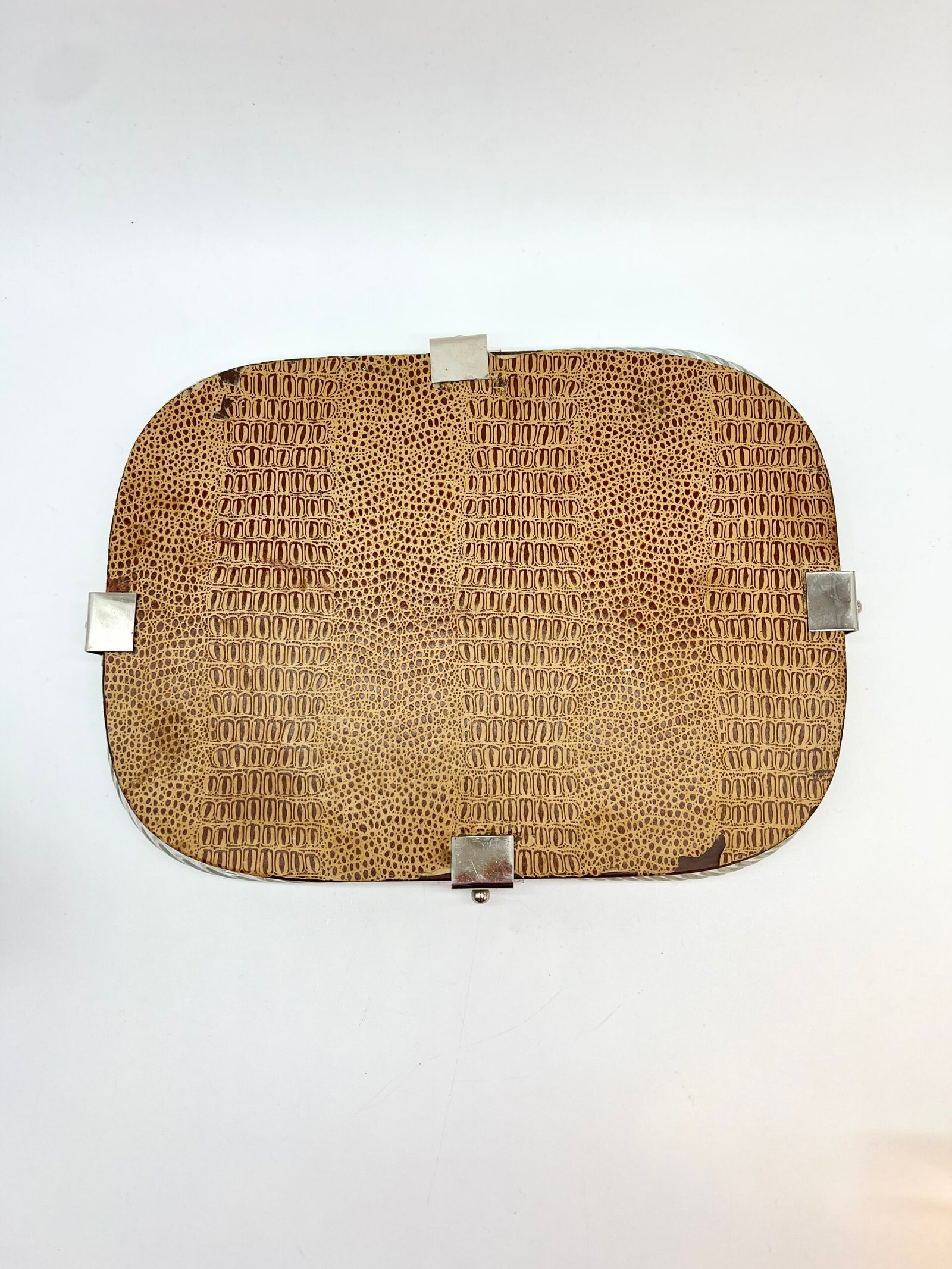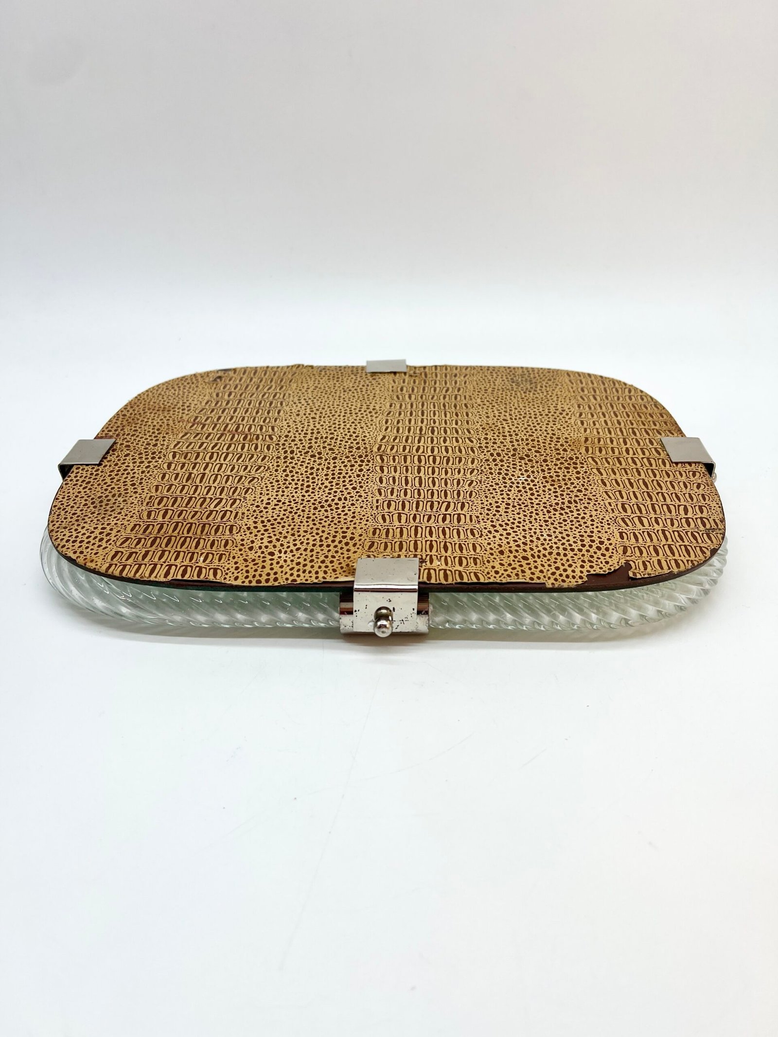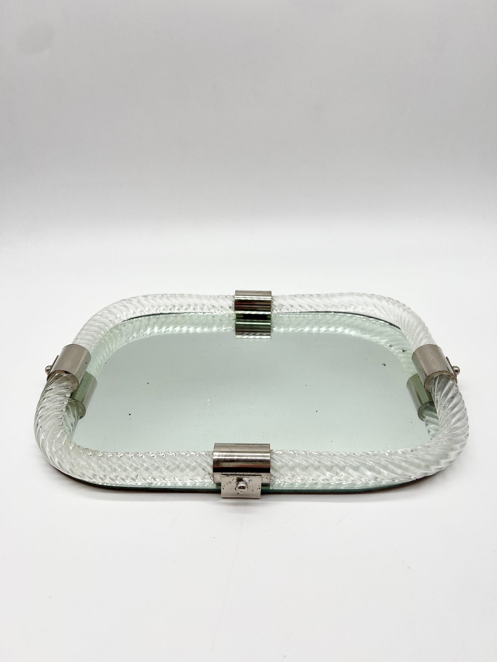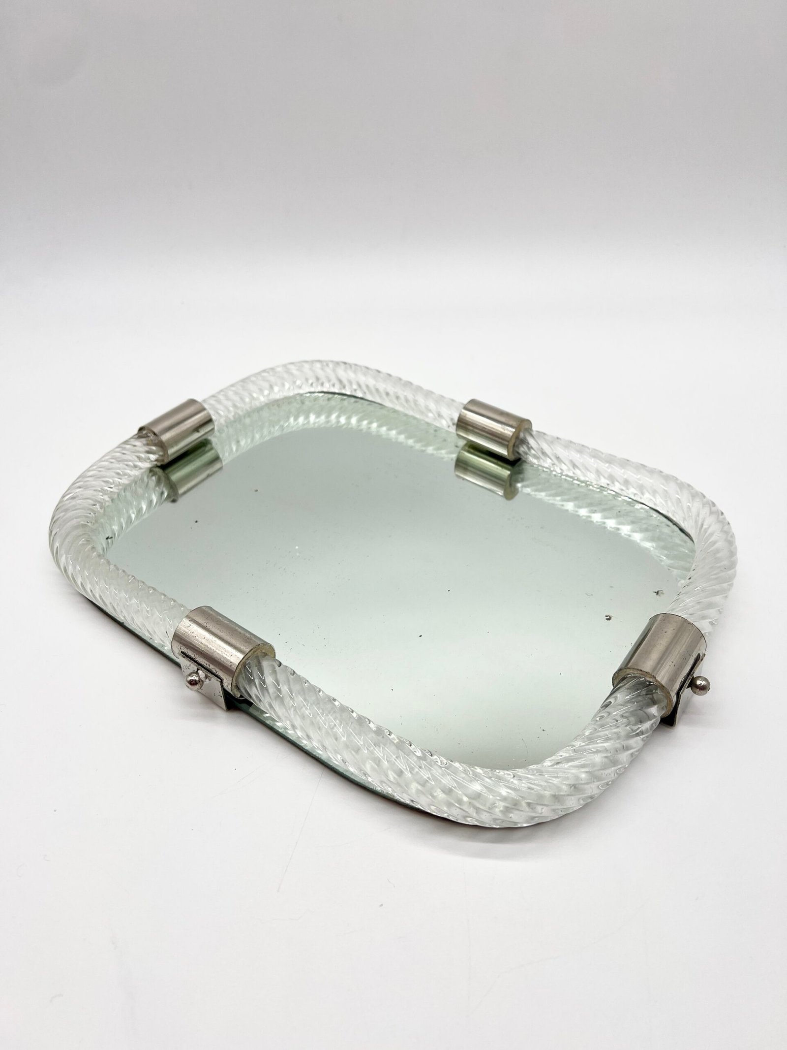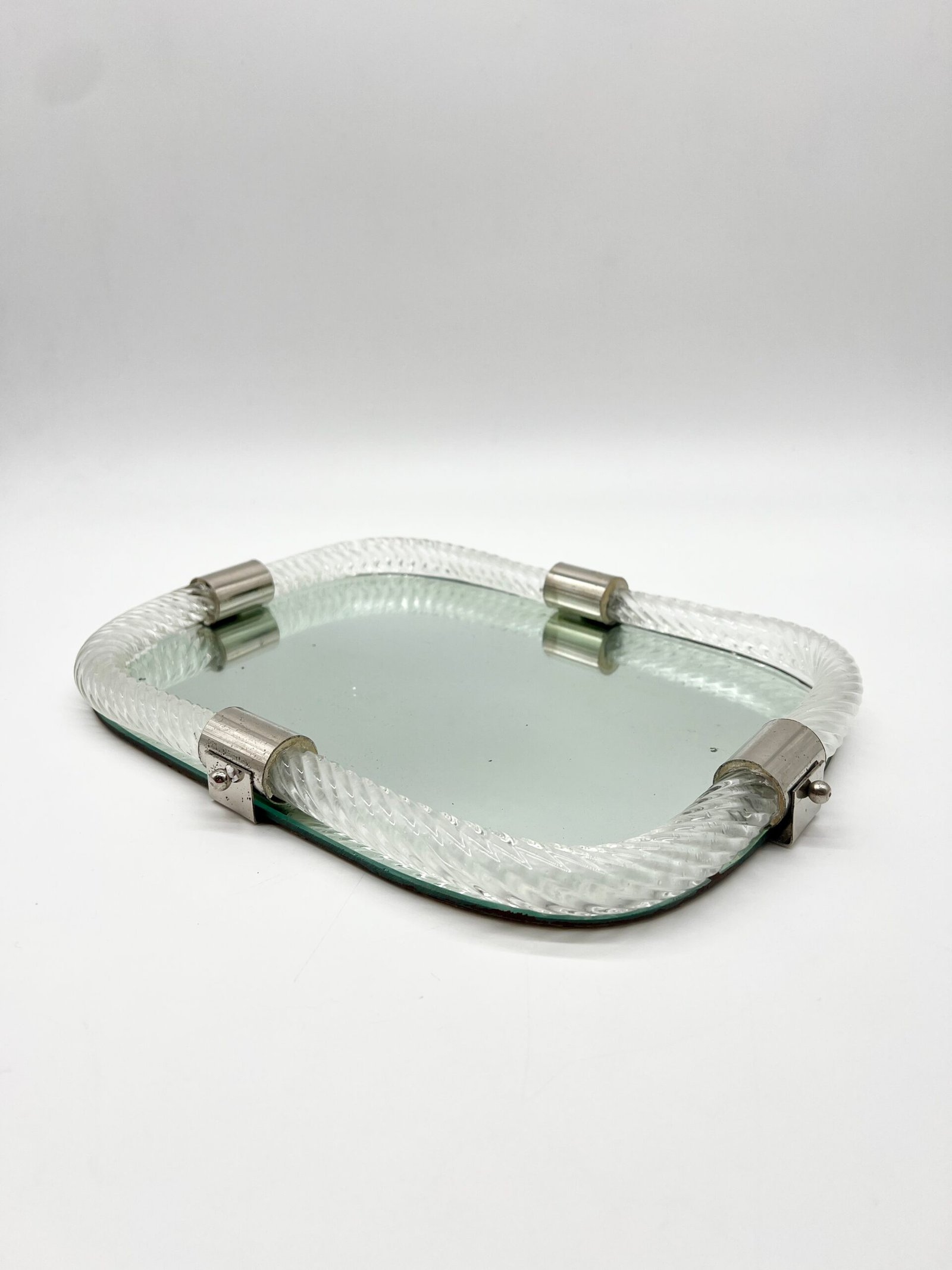 Miroir en verre de Murano, encadré d’un élégant cordon de verre torsadé dit “torchon”. La forme rectangulaire aux angles adoucis lui confère une silhouette douce et équilibrée, typique du design italien des années 60–70.