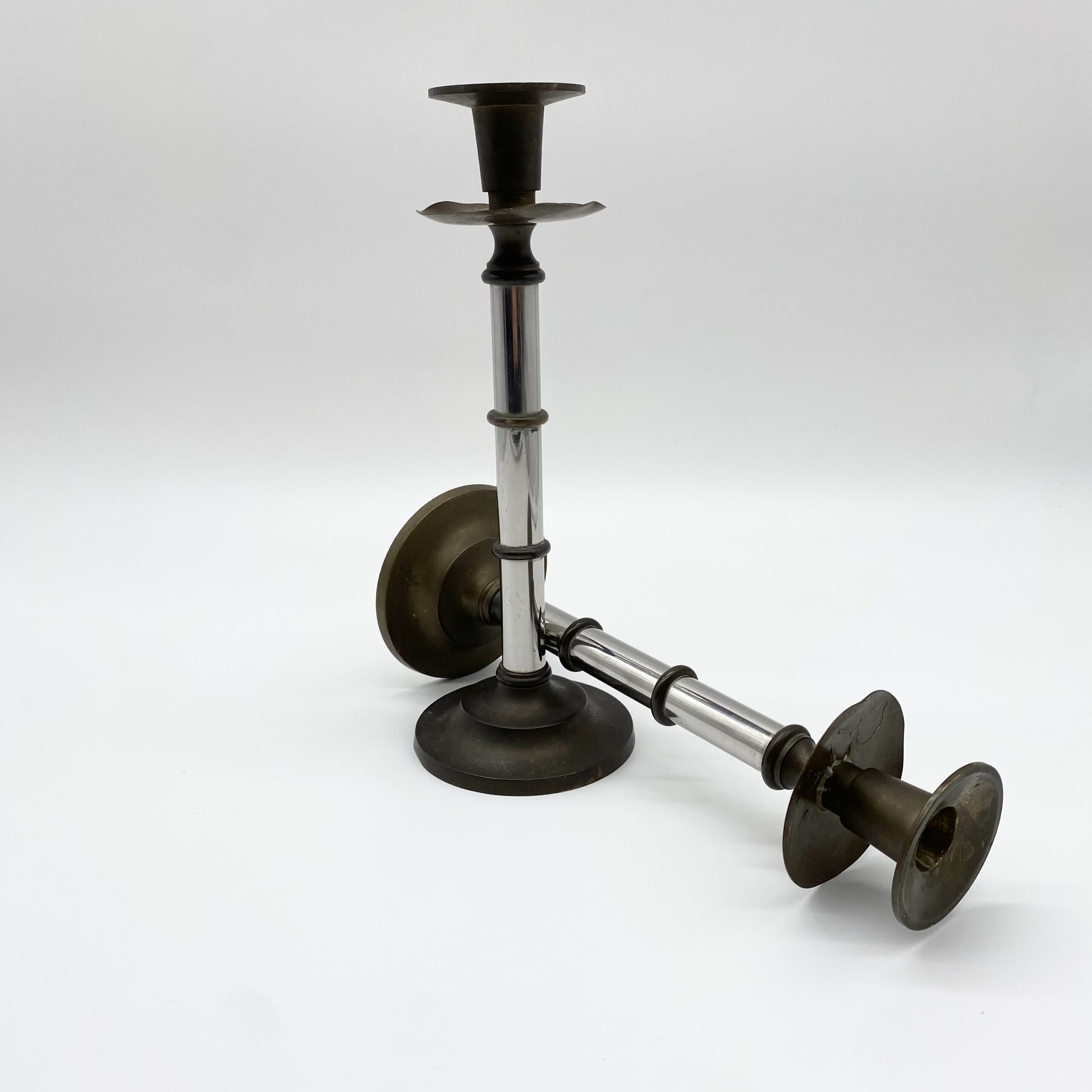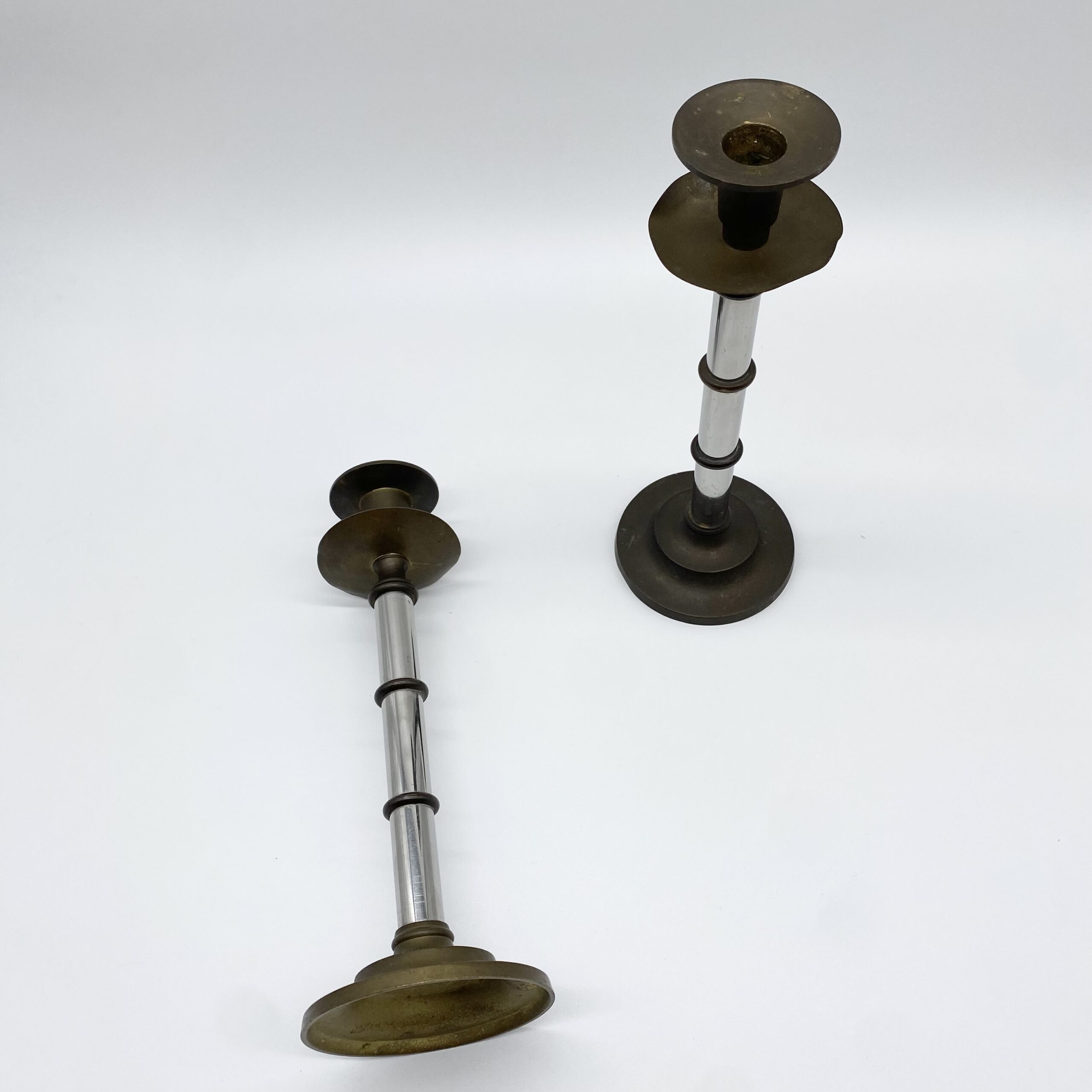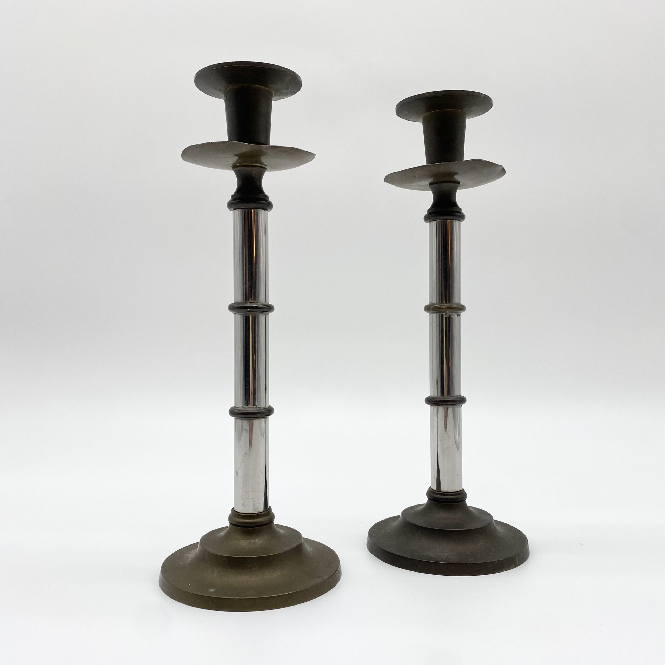 Paire de bougeoirs vintage en métal mêlant laiton patiné et éléments chromés.