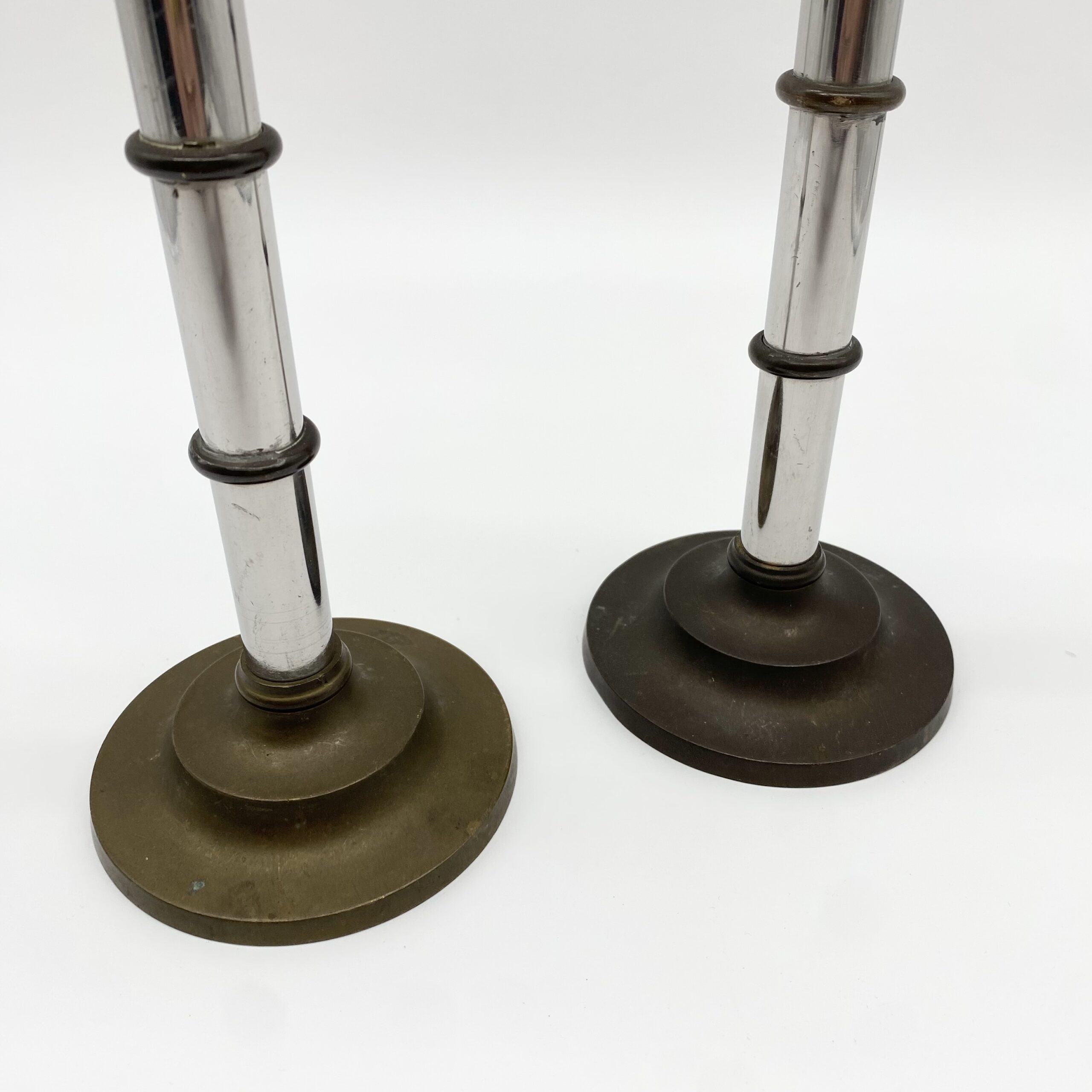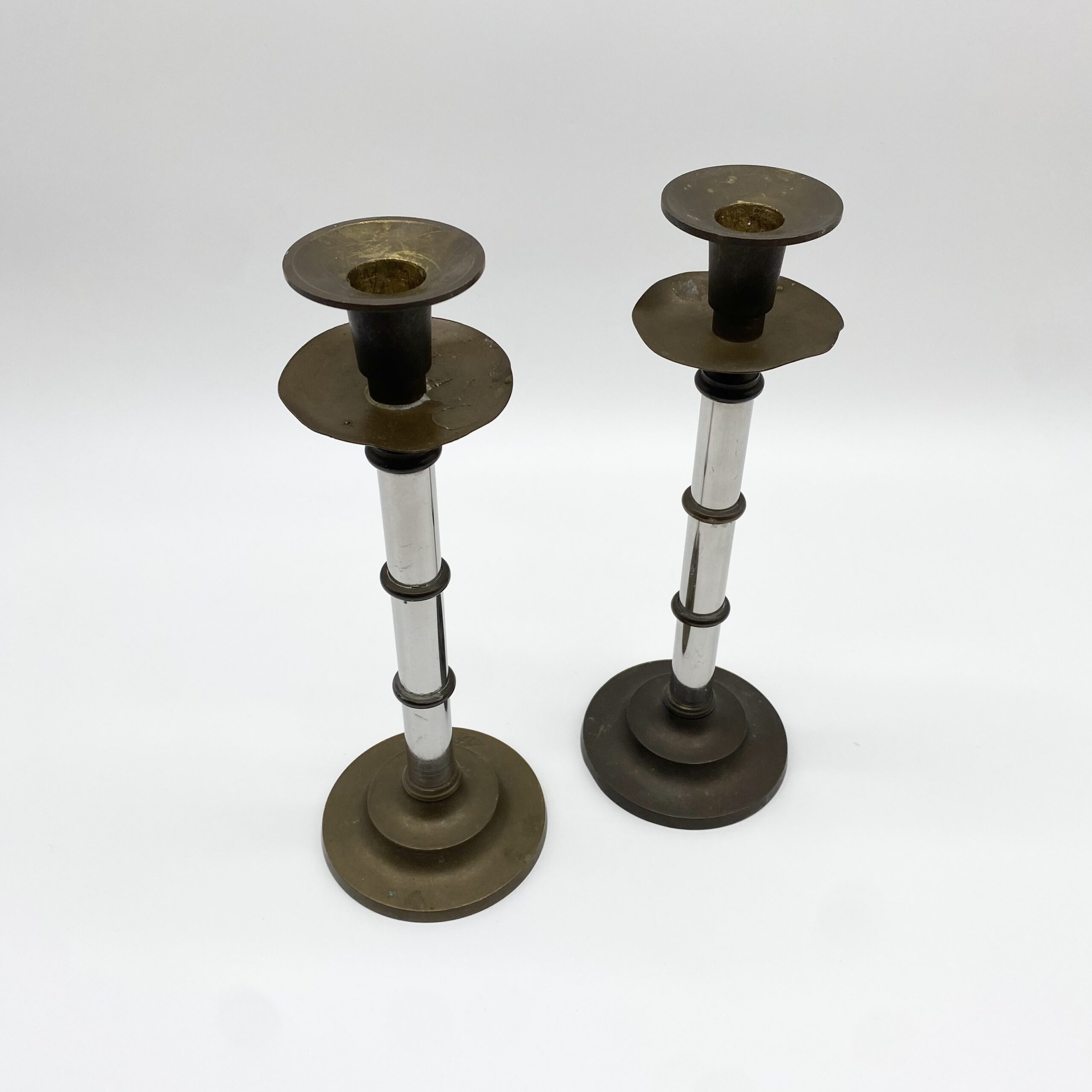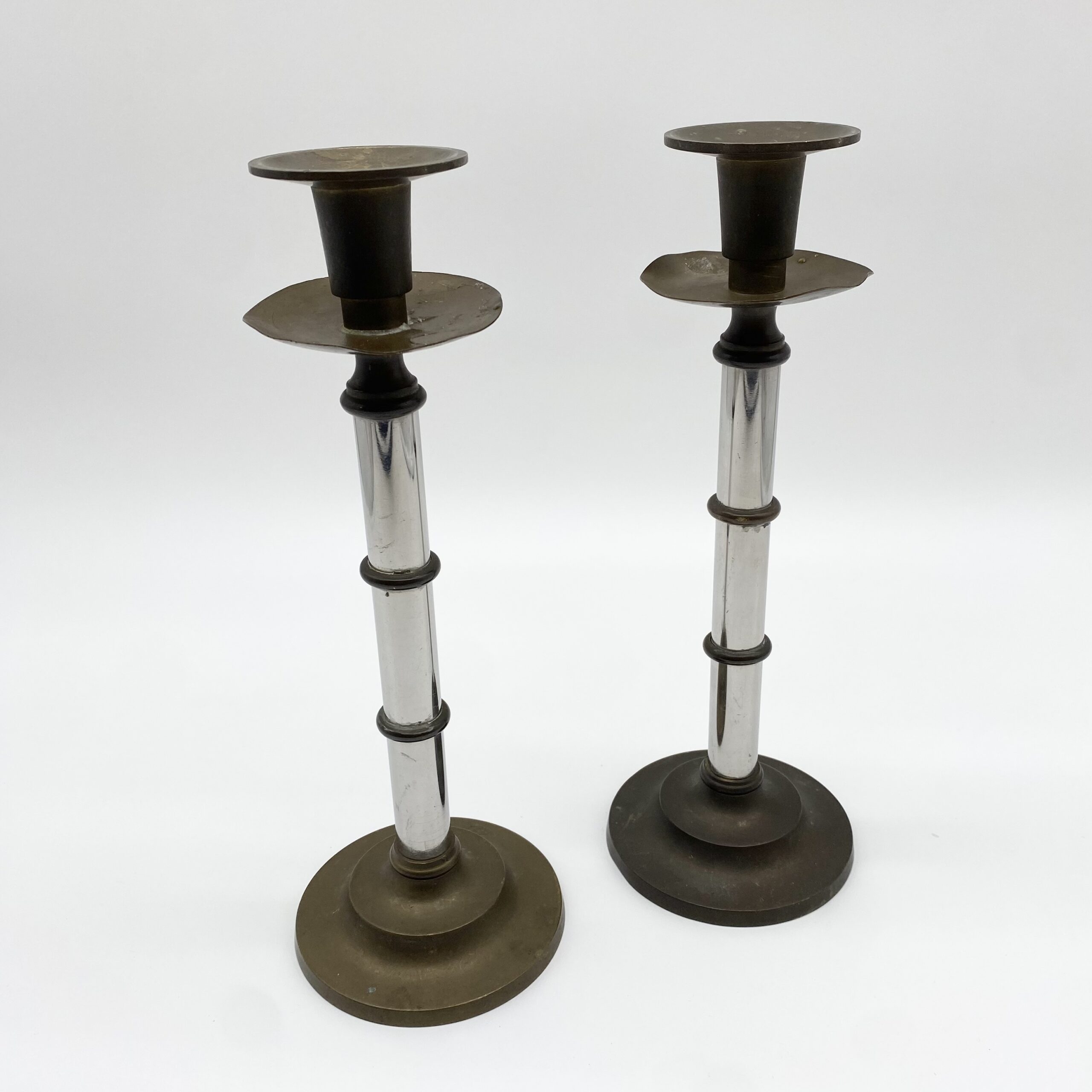 Paire de bougeoirs vintage en métal mêlant laiton patiné et éléments chromés.