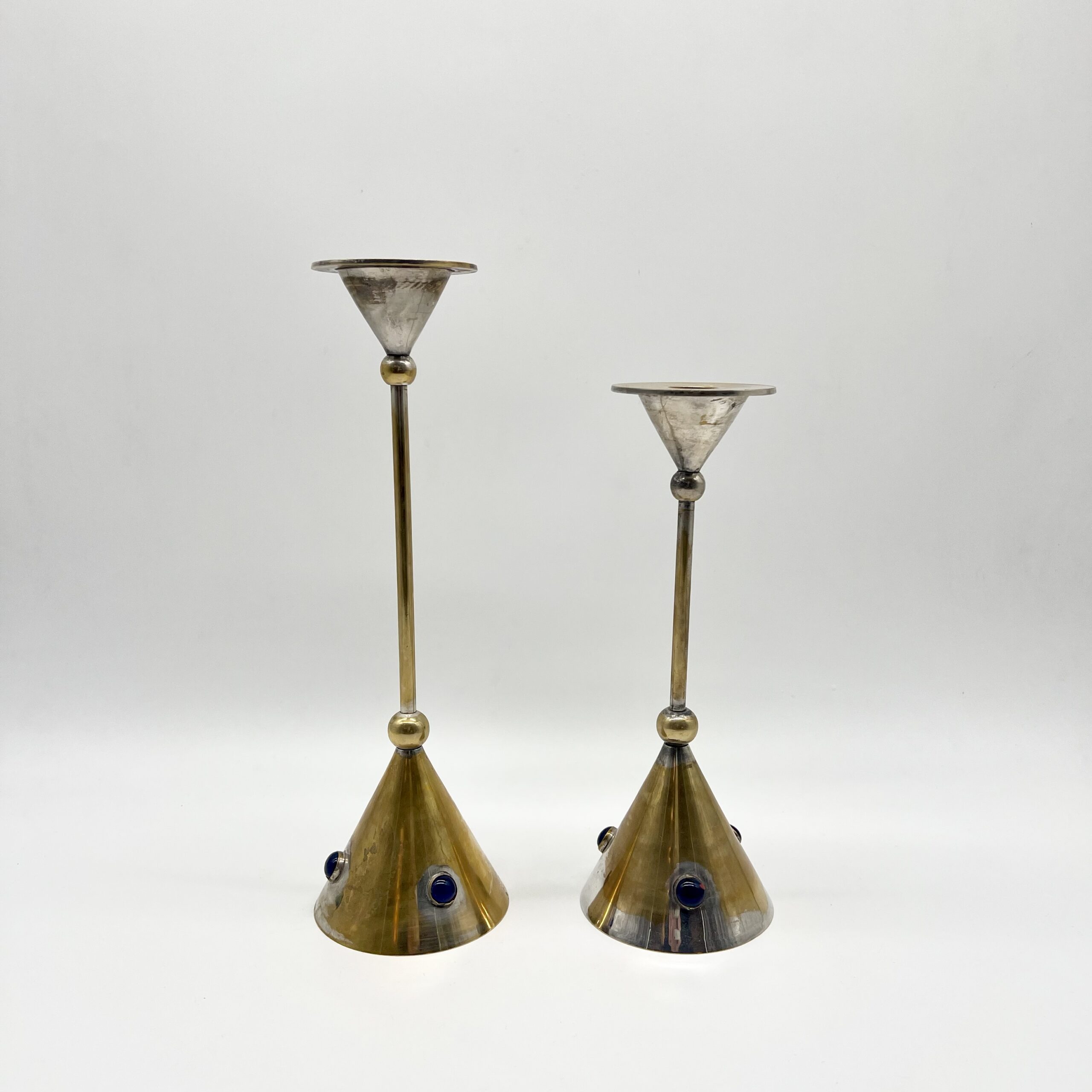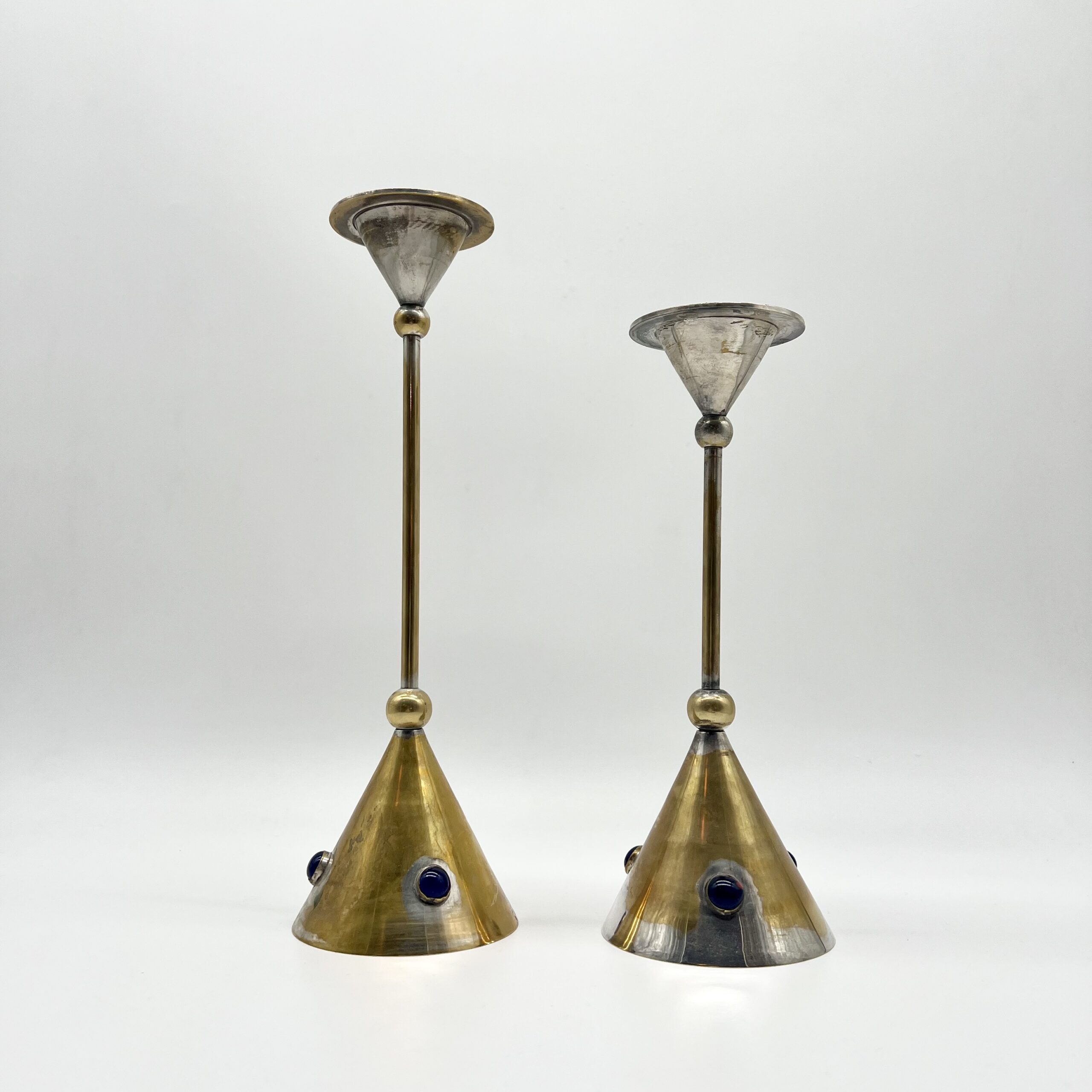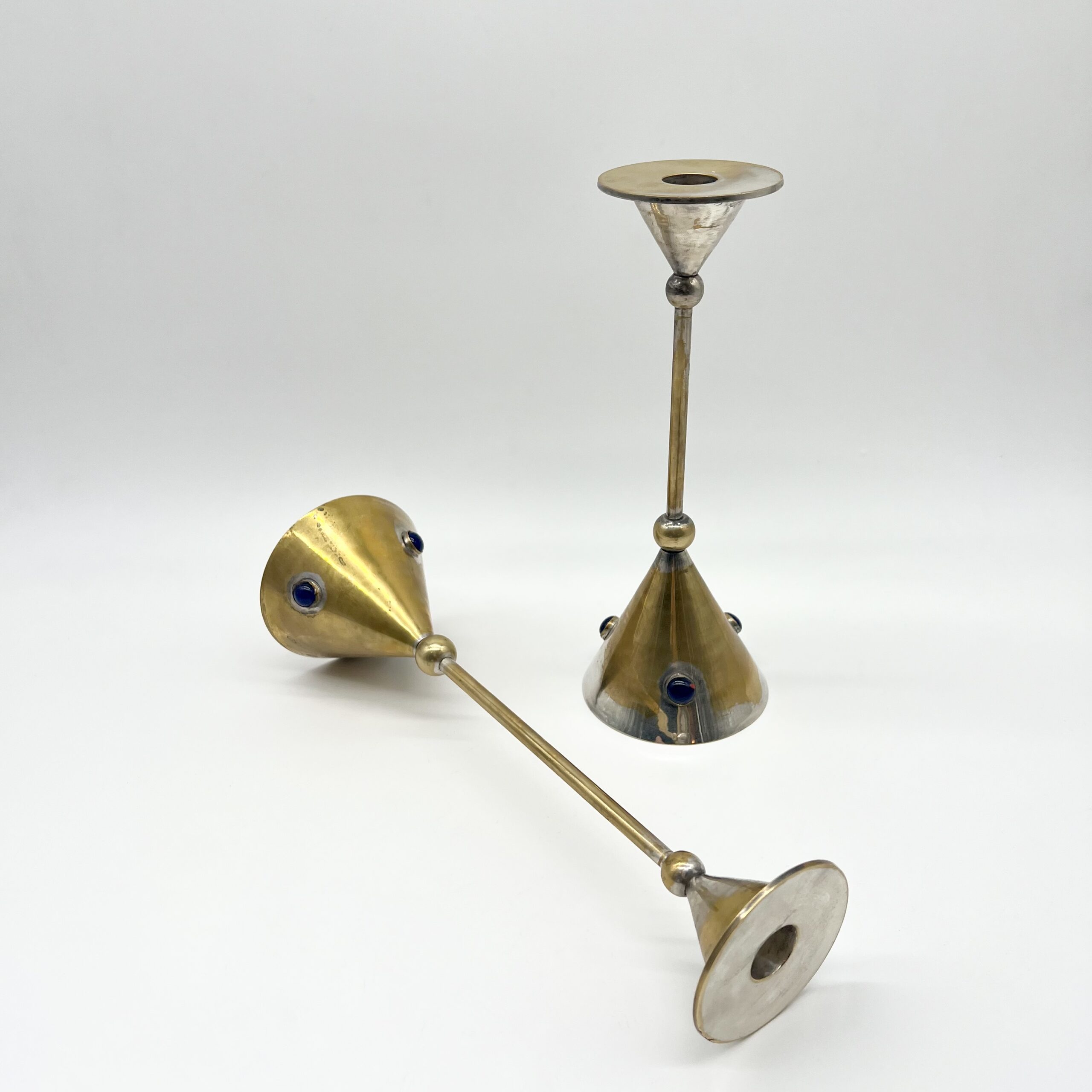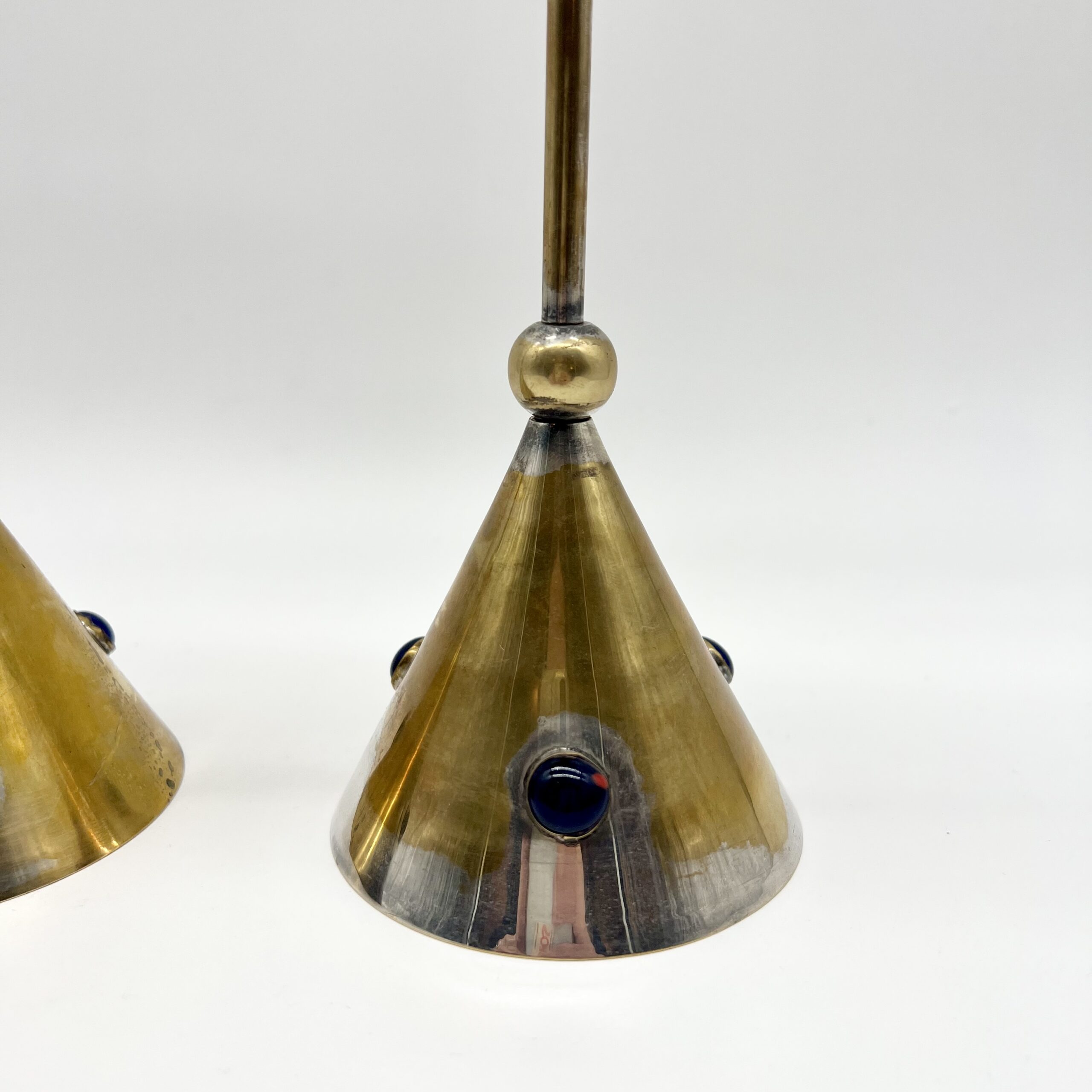 Chaque pièce se compose d’une base conique en laiton patiné, ponctuée de pierres bleus incrustés, apportant un contraste chromatique raffiné et une touche décorative distinctive.