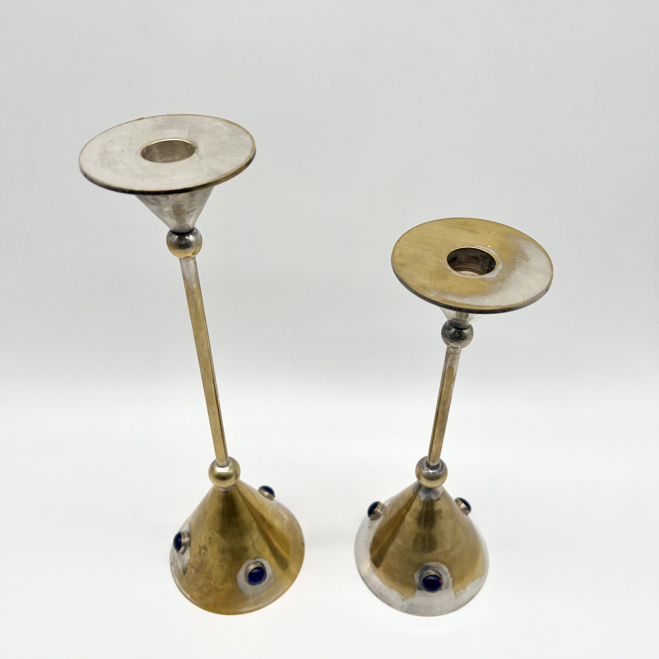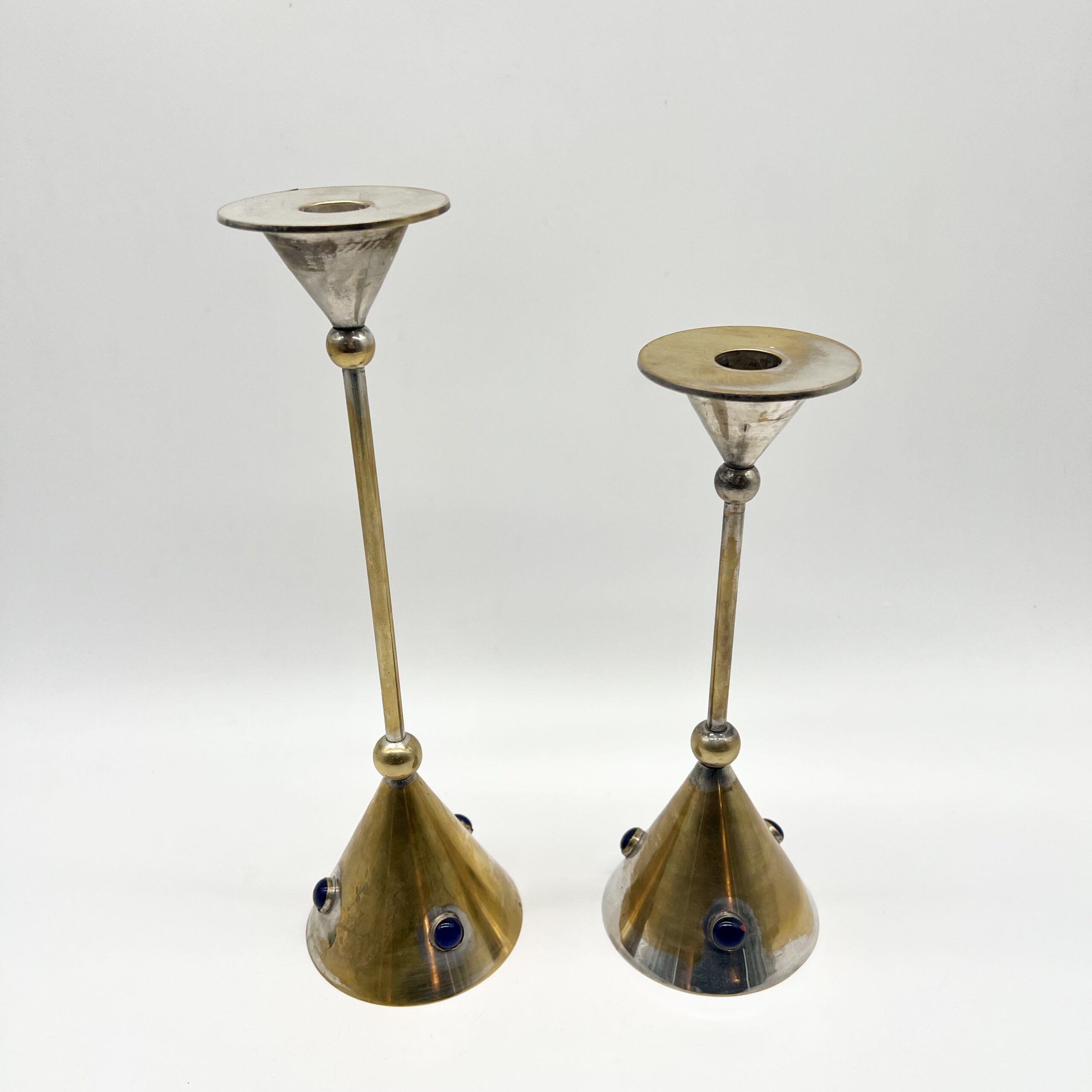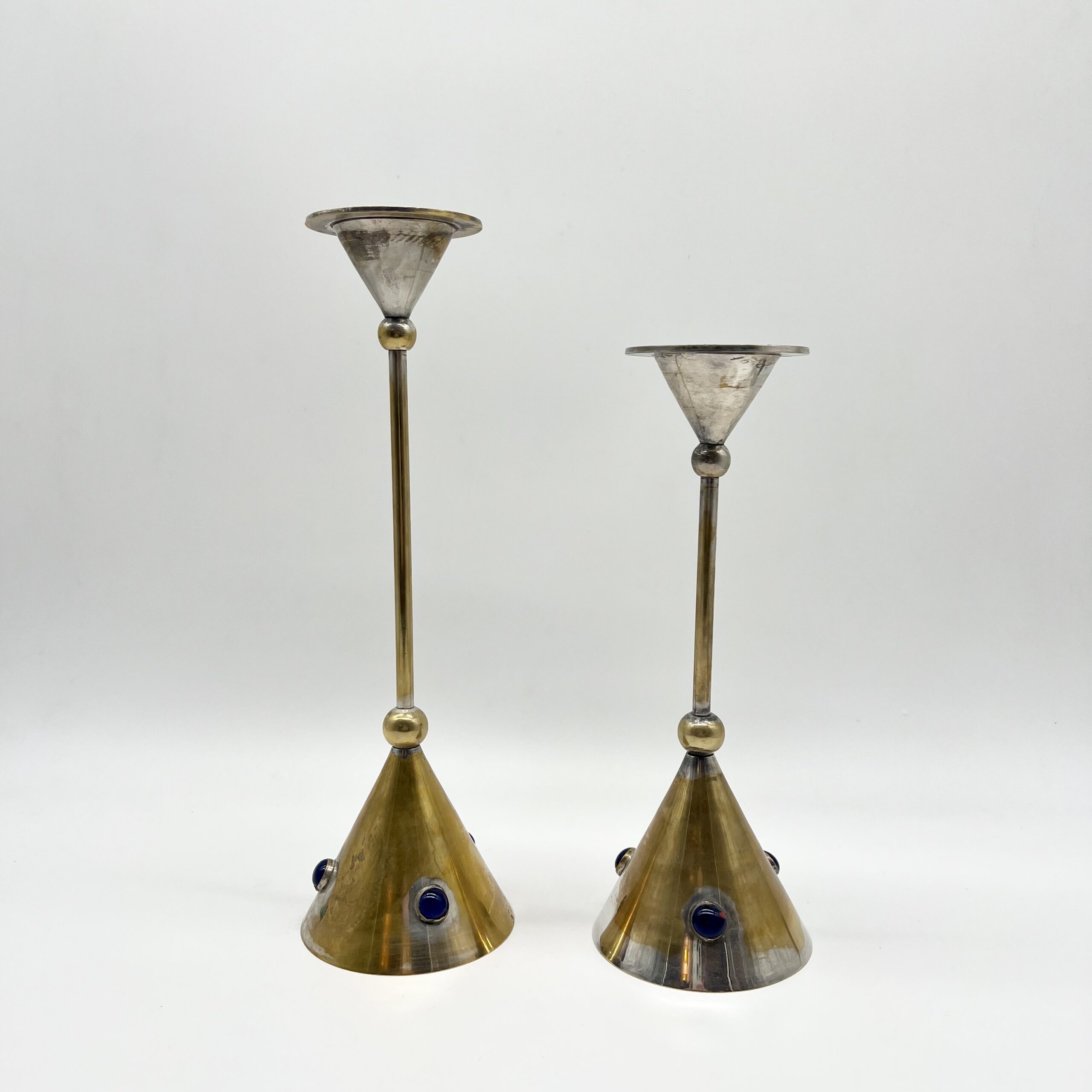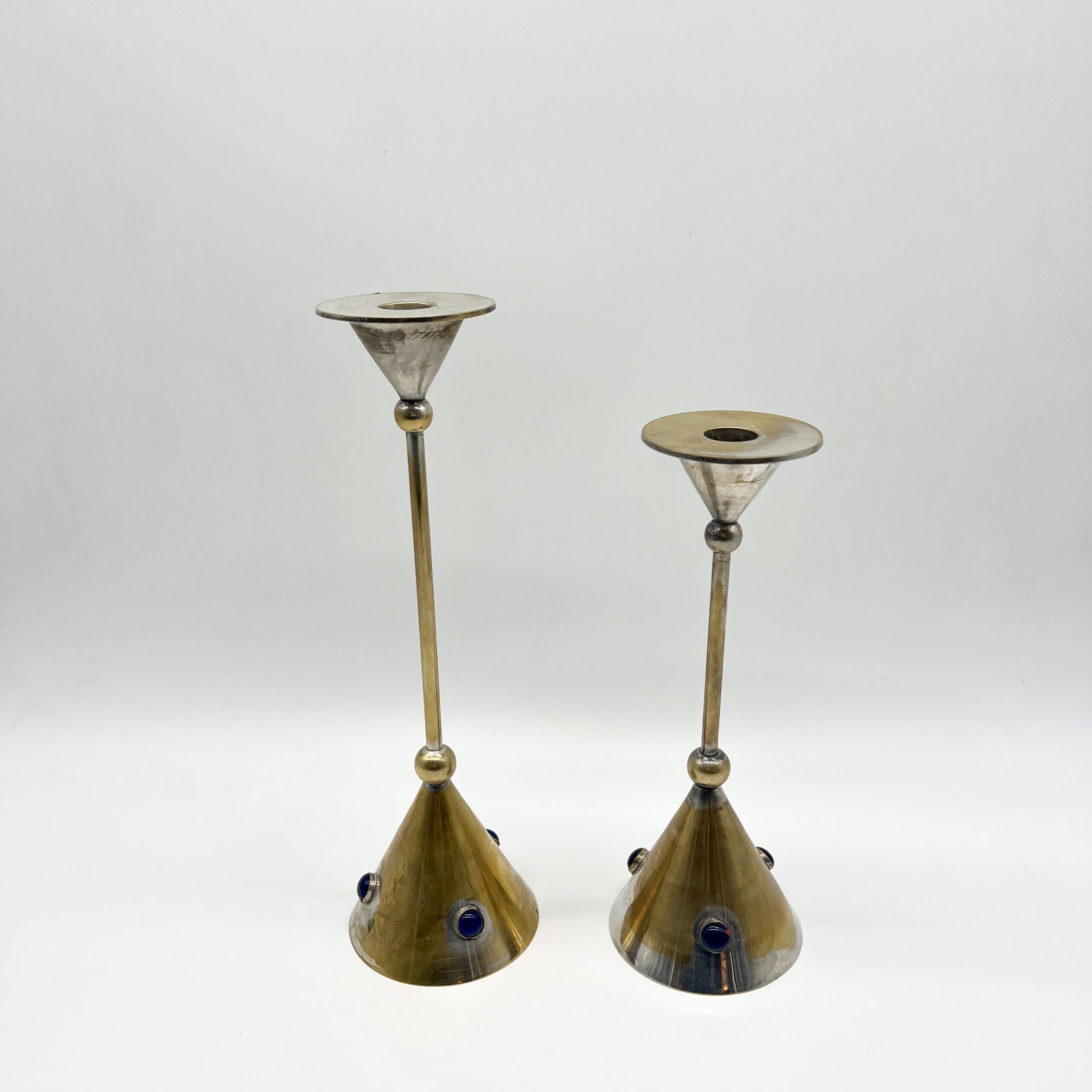 Chaque pièce se compose d’une base conique en laiton patiné, ponctuée de pierres bleus incrustés, apportant un contraste chromatique raffiné et une touche décorative distinctive.