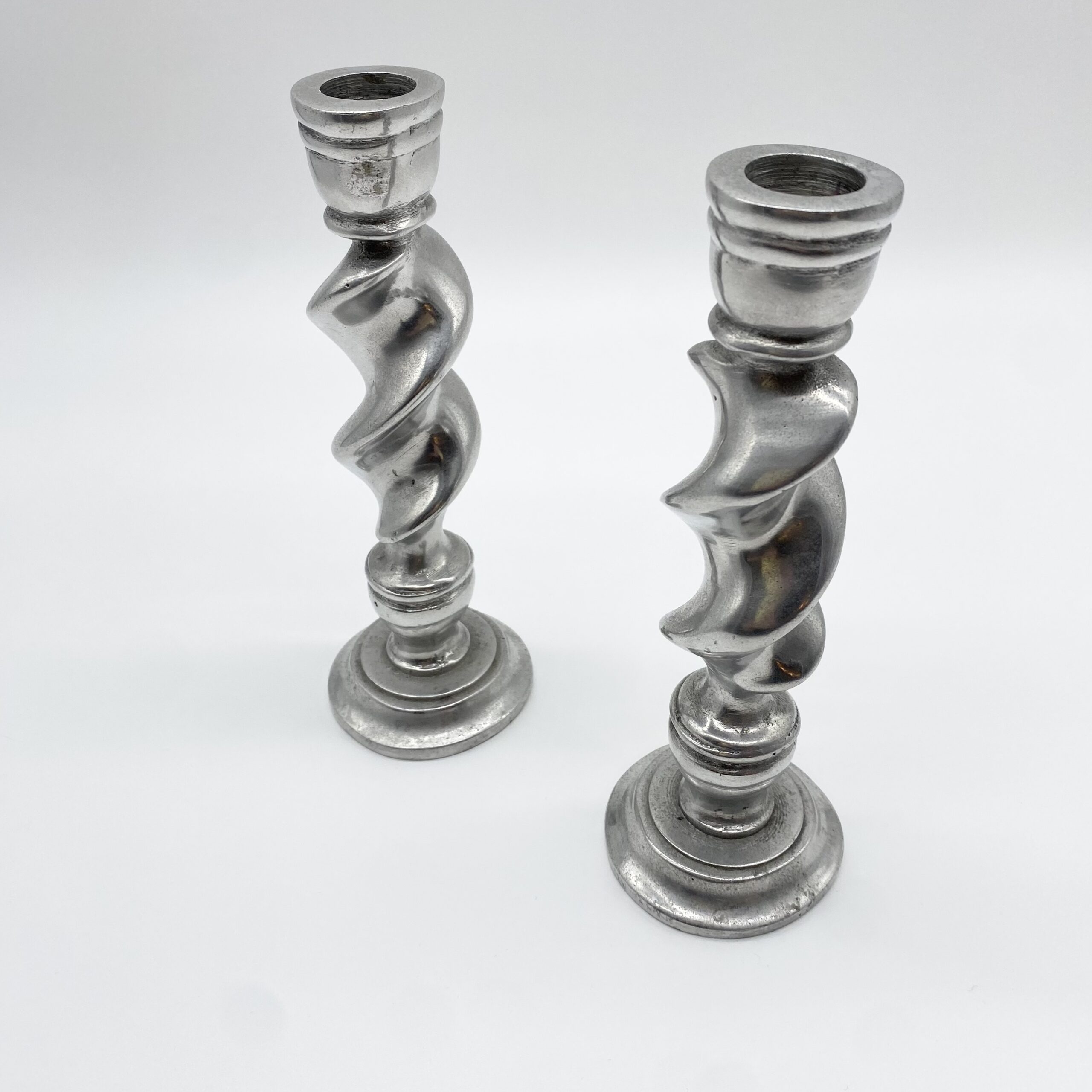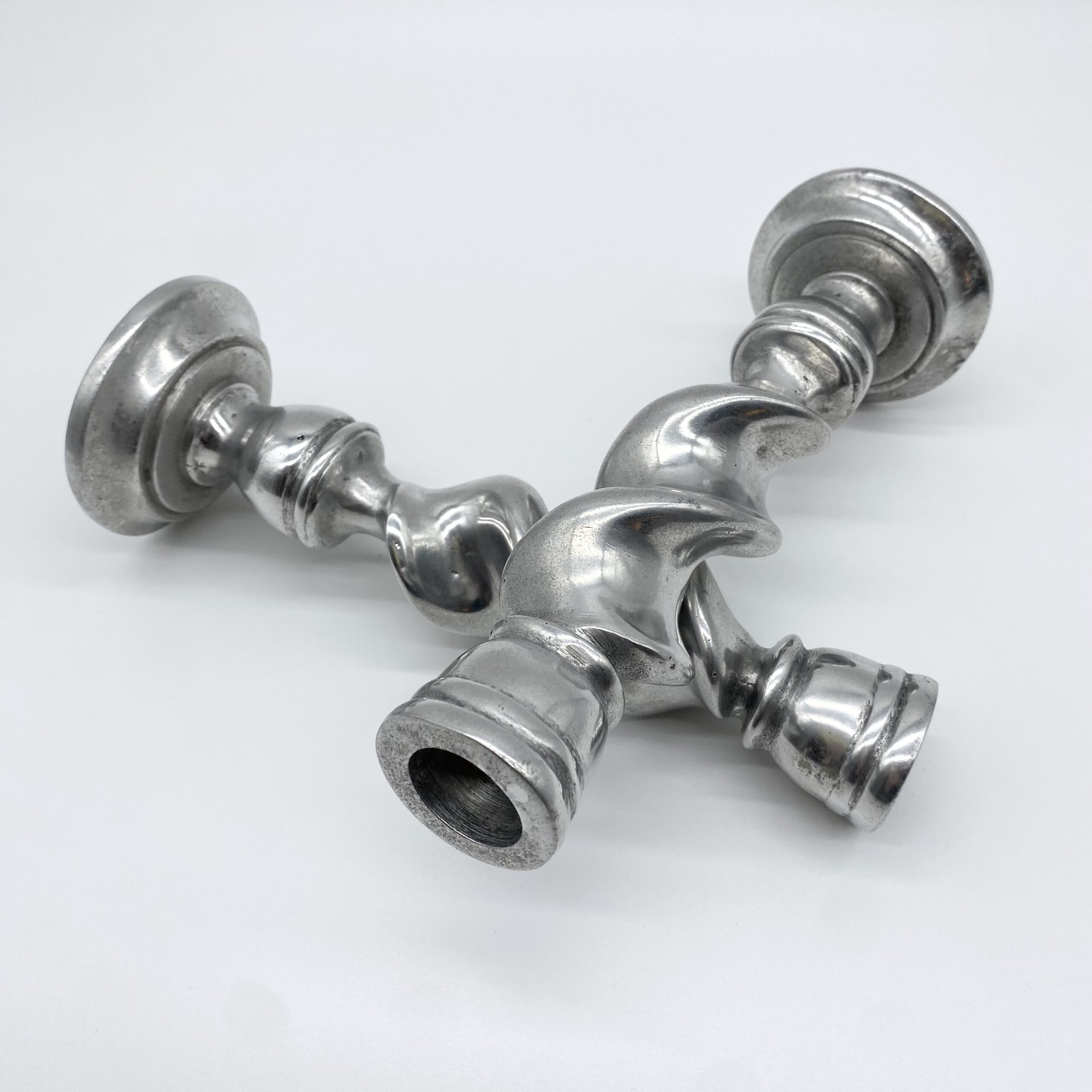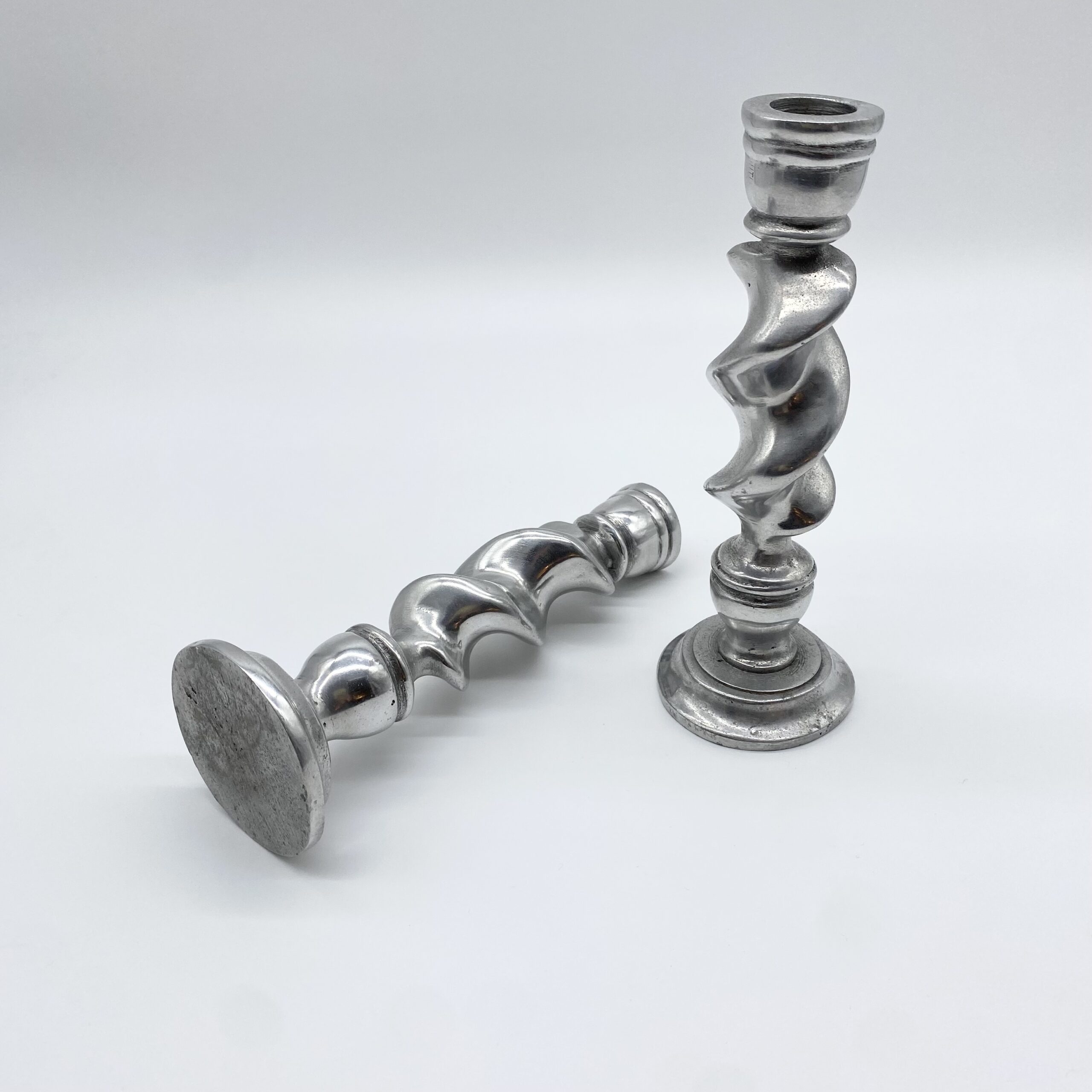 Paire de bougeoirs en fonte d’aluminium au design torsadé, offrant une silhouette dynamique et graphique.