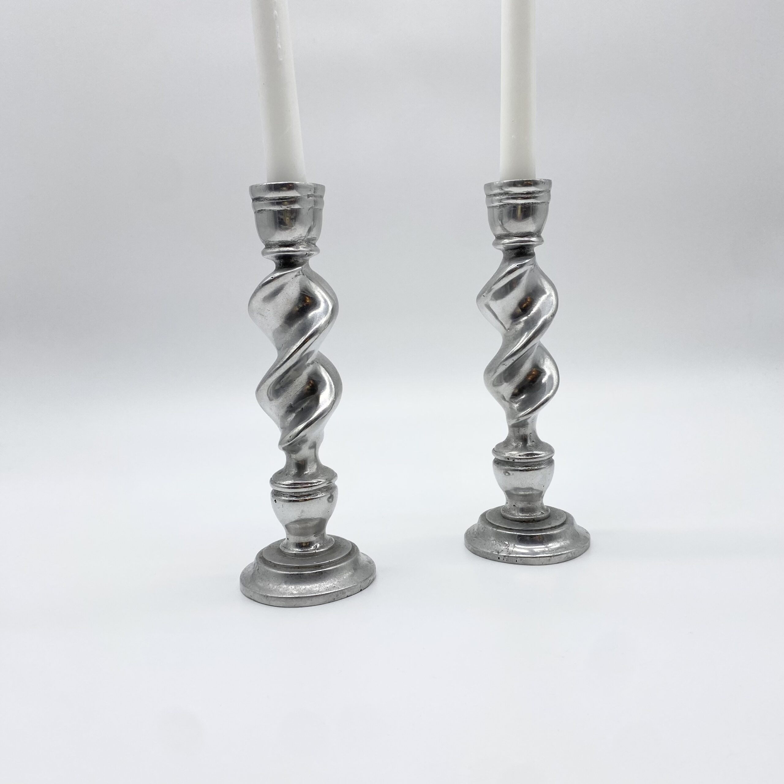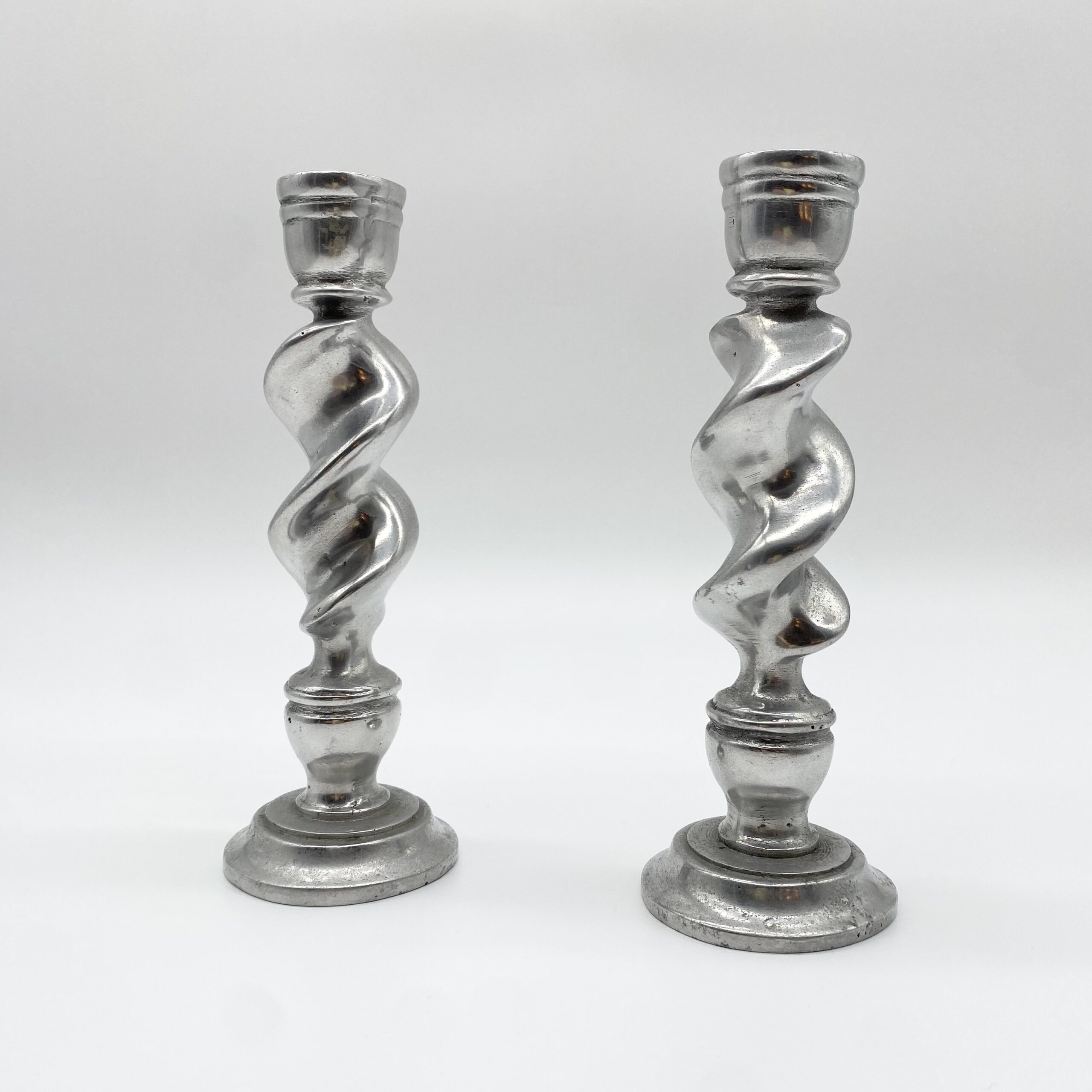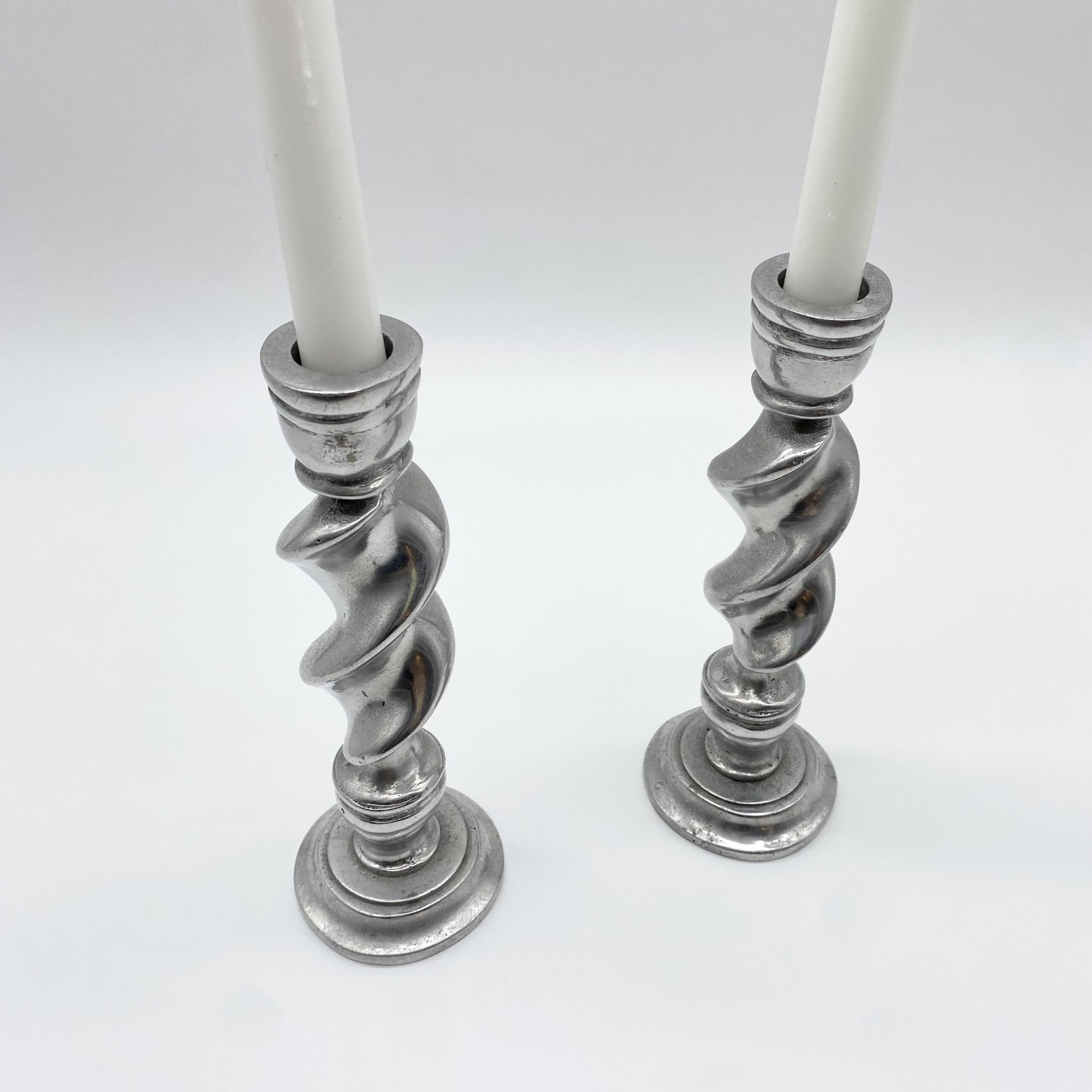 Paire de bougeoirs en fonte d’aluminium au design torsadé, offrant une silhouette dynamique et graphique.